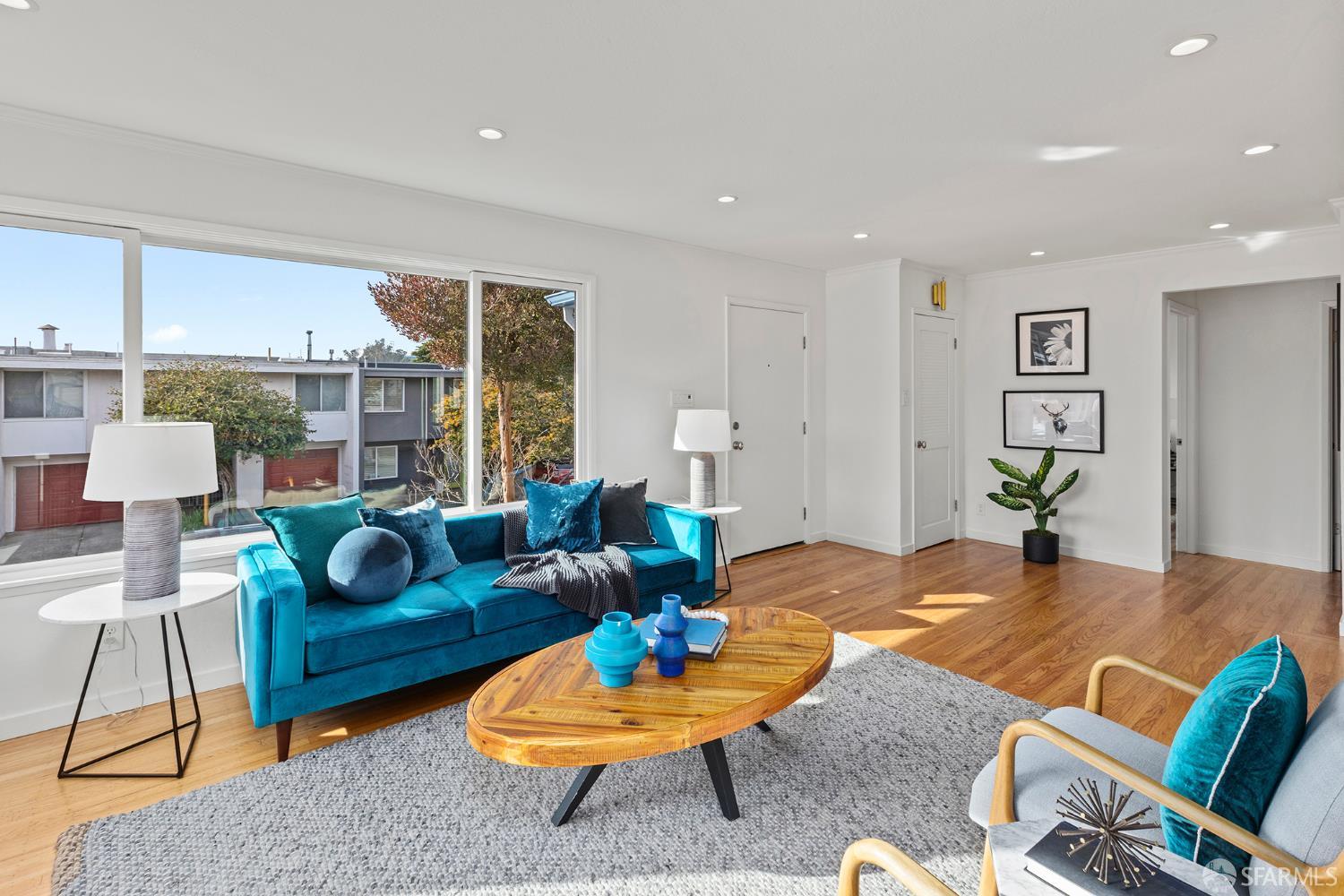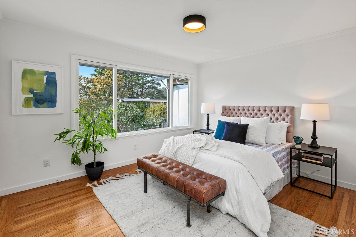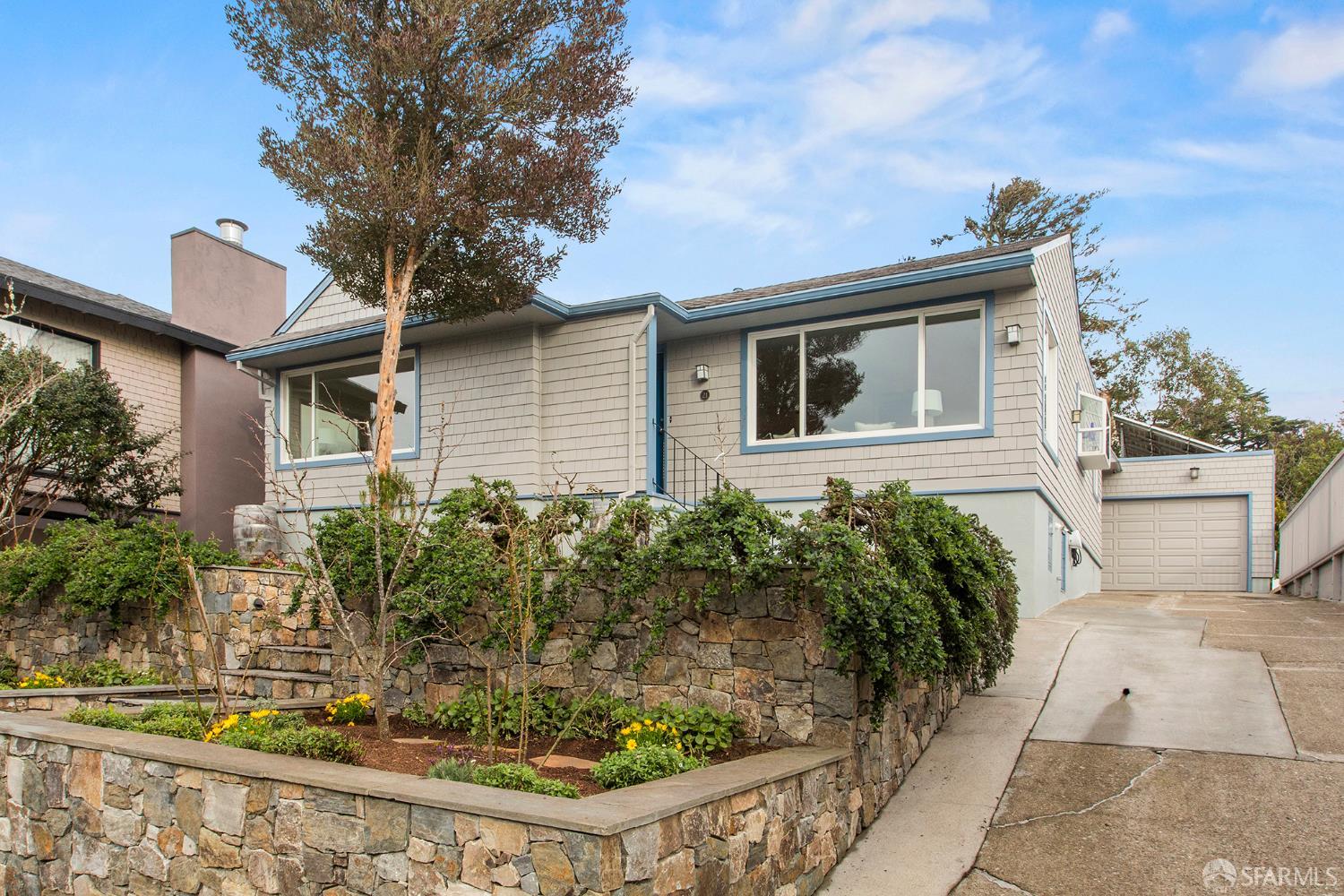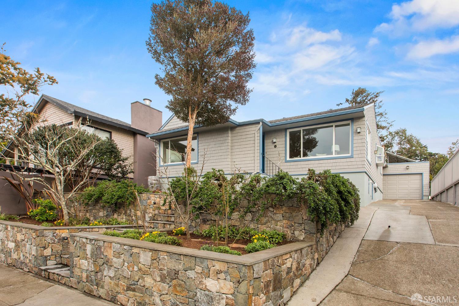 Peaceful and light-filled, 21 Cameo Way is a beautiful detached home on a quiet street offering ideal indoor/outdoor living – all on a single level. The bright living room features grand corner windows, hardwood floors, built-ins and neighborhood outlooks, flows seamlessly into the kitchen and dining area. The open living spaces lead directly to the expansive new deck and yard, creating an inviting extension of the main space. Landscaped front and back gardens, including a lawn and refreshed patio, make for a private, zen oasis. The large kitchen has a new gas range, granite counter tops, abundant storage and counter space with two sink areas. The bedroom wing is set apart from the main living area and includes two generously-sized bedrooms and a full bath. The spacious primary suite boasts vaulted ceilings, abundant natural light, direct access to the deck, custom closet systems and an en-suite bath with a grand soaking tub. Additional features include solar, an EV charger, refinished wood floors, new washer/dryer, a detached garage and a long driveway with parking for 3-4 additional vehicles. Tucked moments from the Diamond Heights shopping center, neighborhood conveniences, Glen Canyon Park trails and easy access to Glen Park BART and highways, the home offers a tranquil setting with excellent access to the surrounding neighborhoods.