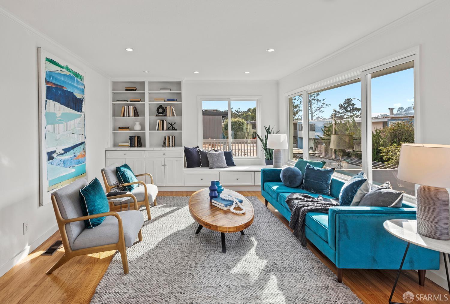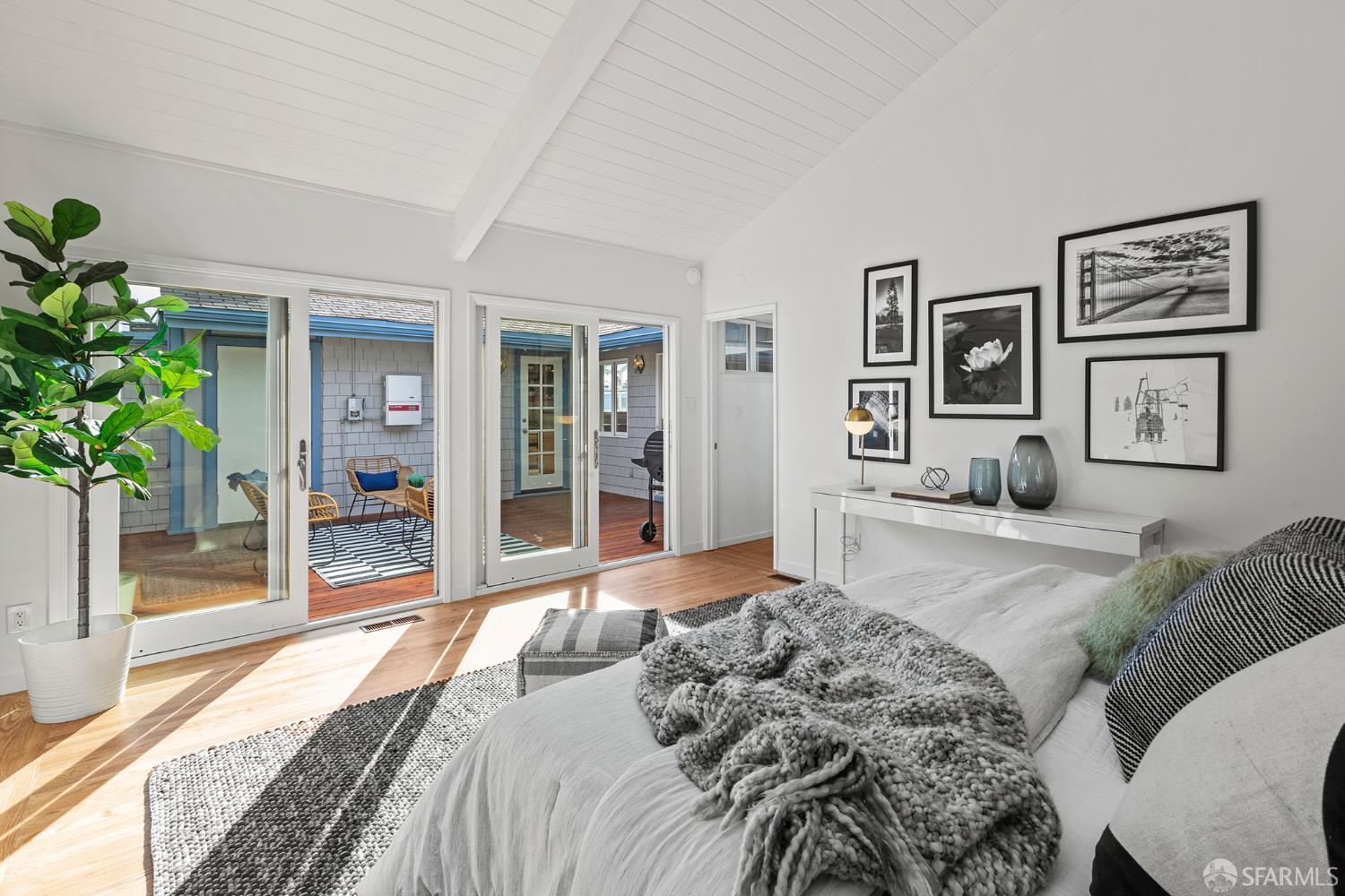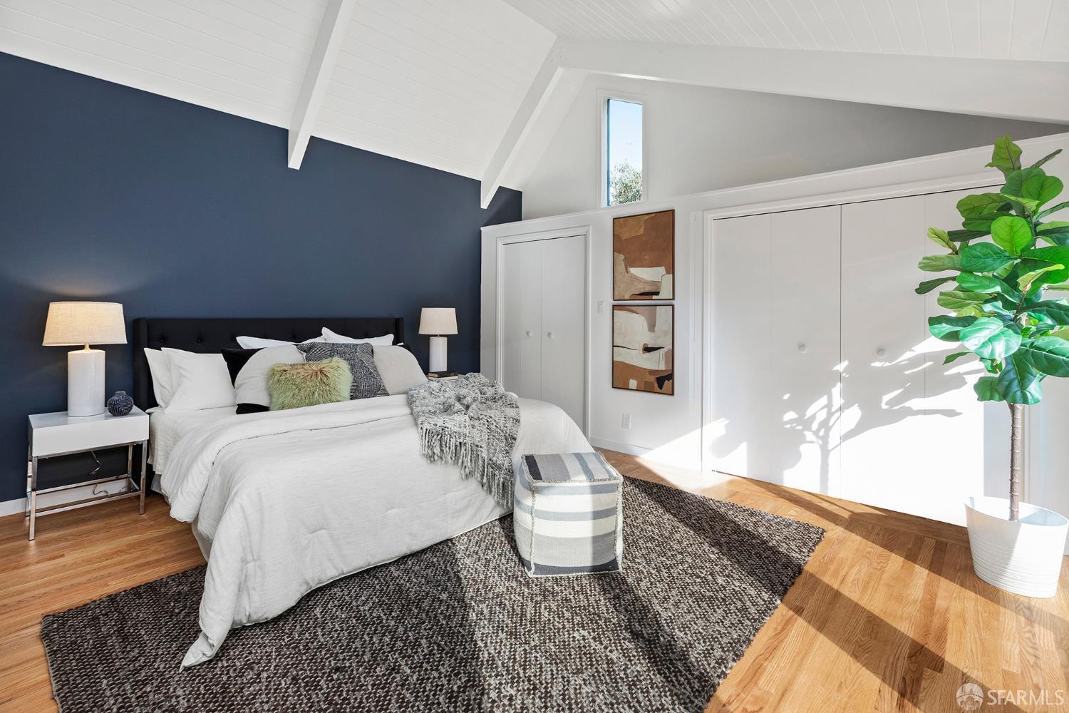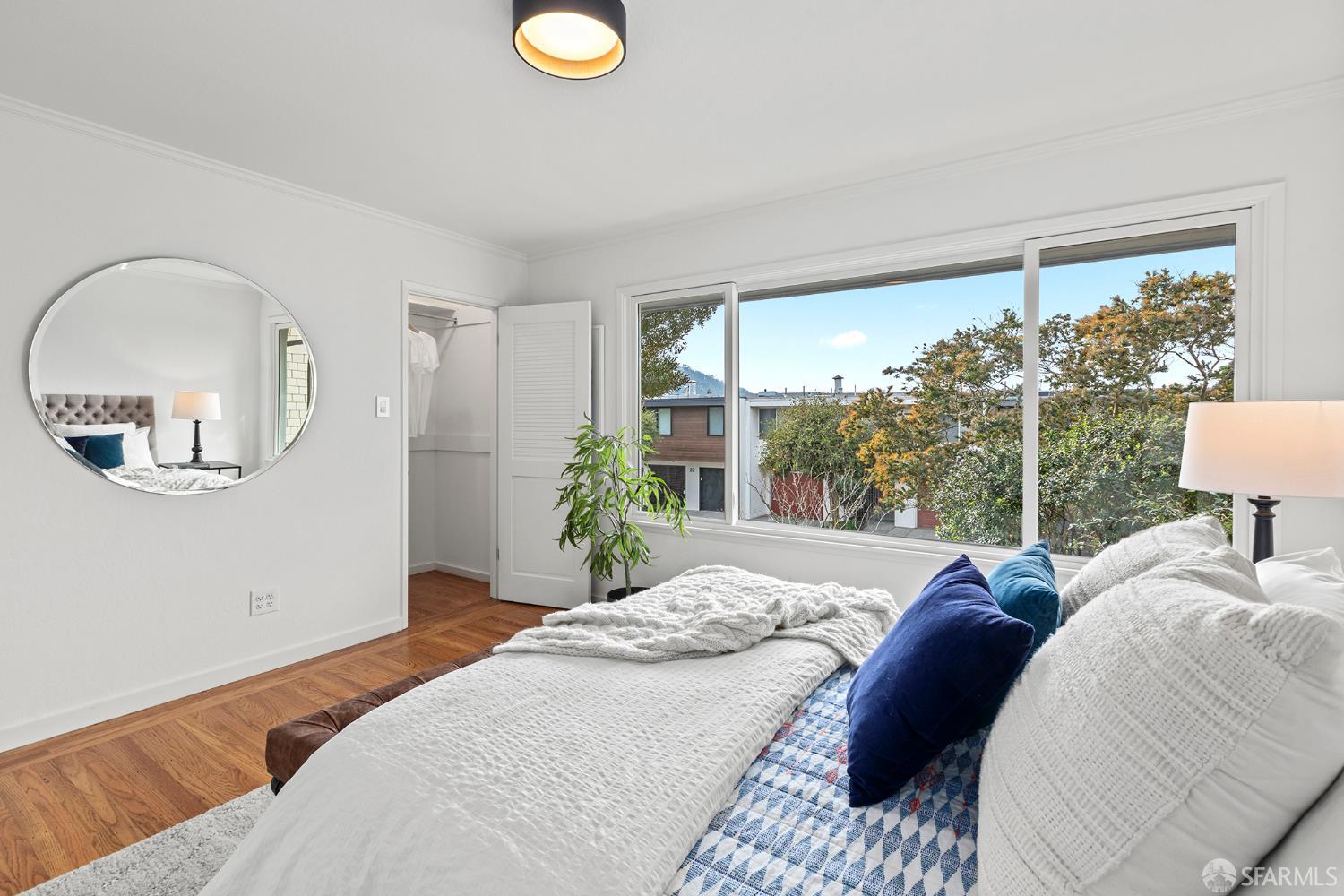 Peaceful and light-filled, 21 Cameo Way is a beautiful detached home on a quiet street offering ideal indoor/outdoor living – all on a single level. The bright living room features grand corner windows, hardwood floors, built-ins and neighborhood outlooks, flows seamlessly into the kitchen and dining area. The open living spaces lead directly to the expansive new deck and yard, creating an inviting extension of the main space. Landscaped front and back gardens, including a lawn and refreshed patio, make for a private, zen oasis. The large kitchen has a new gas range, granite counter tops, abundant storage and counter space with two sink areas. The bedroom wing is set apart from the main living area and includes two generously-sized bedrooms and a full bath. The spacious primary suite boasts vaulted ceilings, abundant natural light, direct access to the deck, custom closet systems and an en-suite bath with a grand soaking tub. Additional features include solar, an EV charger, refinished wood floors, new washer/dryer, a detached garage and a long driveway with parking for 3-4 additional vehicles. Tucked moments from the Diamond Heights shopping center, neighborhood conveniences, Glen Canyon Park trails and easy access to Glen Park BART and highways, the home offers a tranquil setting with excellent access to the surrounding neighborhoods.