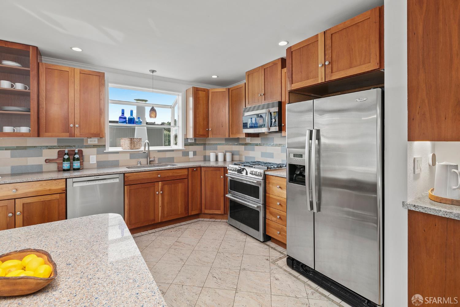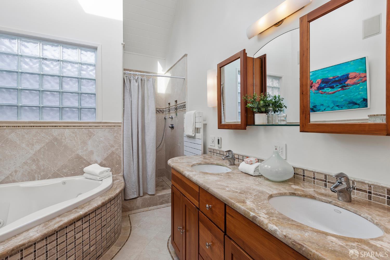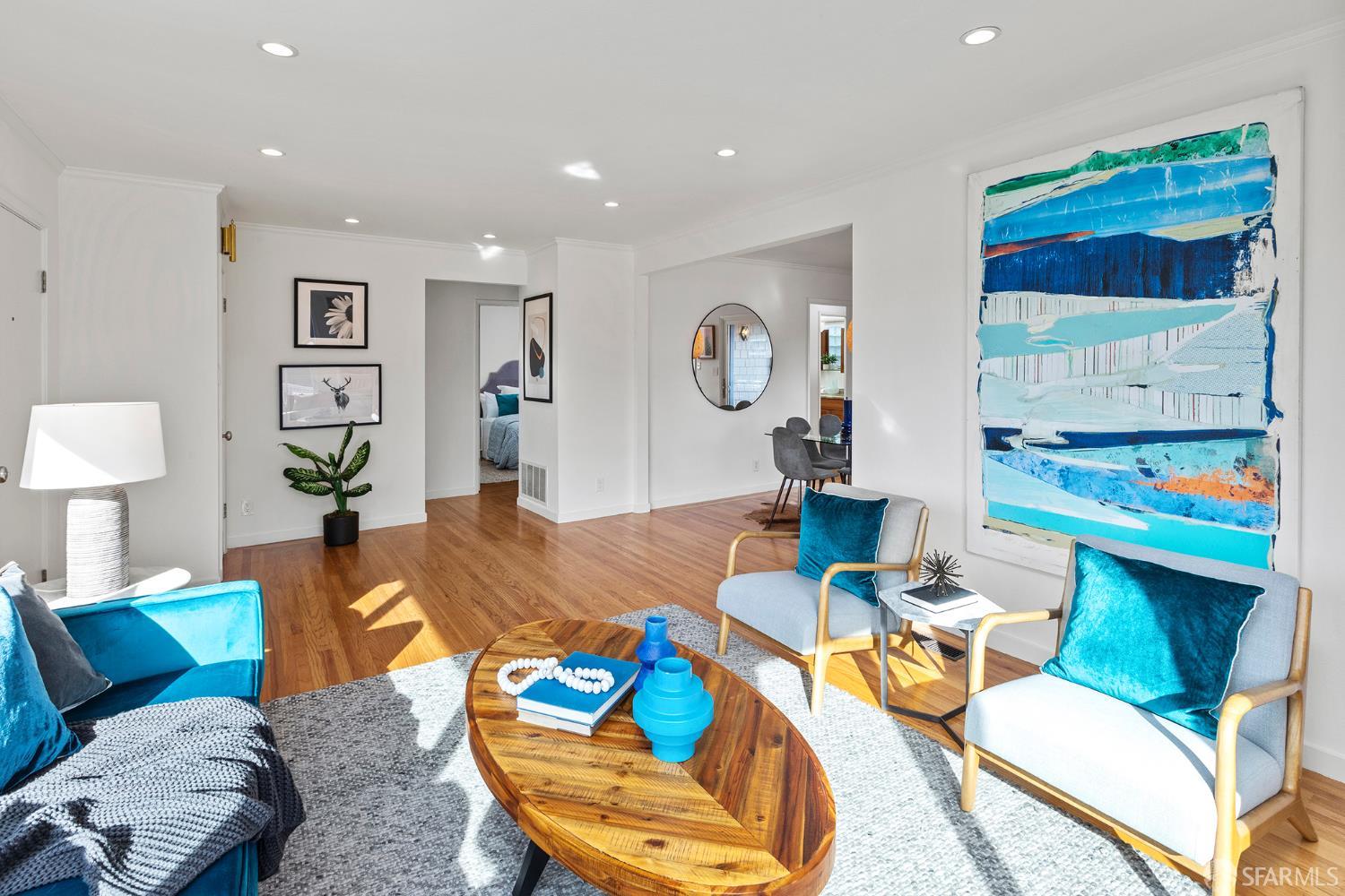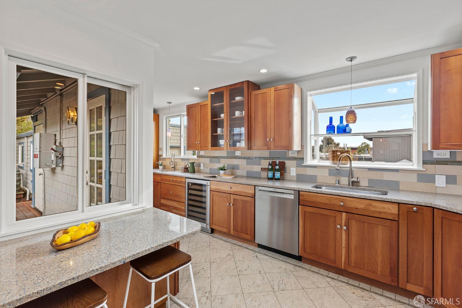 Peaceful and light-filled, 21 Cameo Way is a beautiful detached home on a quiet street offering ideal indoor/outdoor living – all on a single level. The bright living room features grand corner windows, hardwood floors, built-ins and neighborhood outlooks, flows seamlessly into the kitchen and dining area. The open living spaces lead directly to the expansive new deck and yard, creating an inviting extension of the main space. Landscaped front and back gardens, including a lawn and refreshed patio, make for a private, zen oasis. The large kitchen has a new gas range, granite counter tops, abundant storage and counter space with two sink areas. The bedroom wing is set apart from the main living area and includes two generously-sized bedrooms and a full bath. The spacious primary suite boasts vaulted ceilings, abundant natural light, direct access to the deck, custom closet systems and an en-suite bath with a grand soaking tub. Additional features include solar, an EV charger, refinished wood floors, new washer/dryer, a detached garage and a long driveway with parking for 3-4 additional vehicles. Tucked moments from the Diamond Heights shopping center, neighborhood conveniences, Glen Canyon Park trails and easy access to Glen Park BART and highways, the home offers a tranquil setting with excellent access to the surrounding neighborhoods.