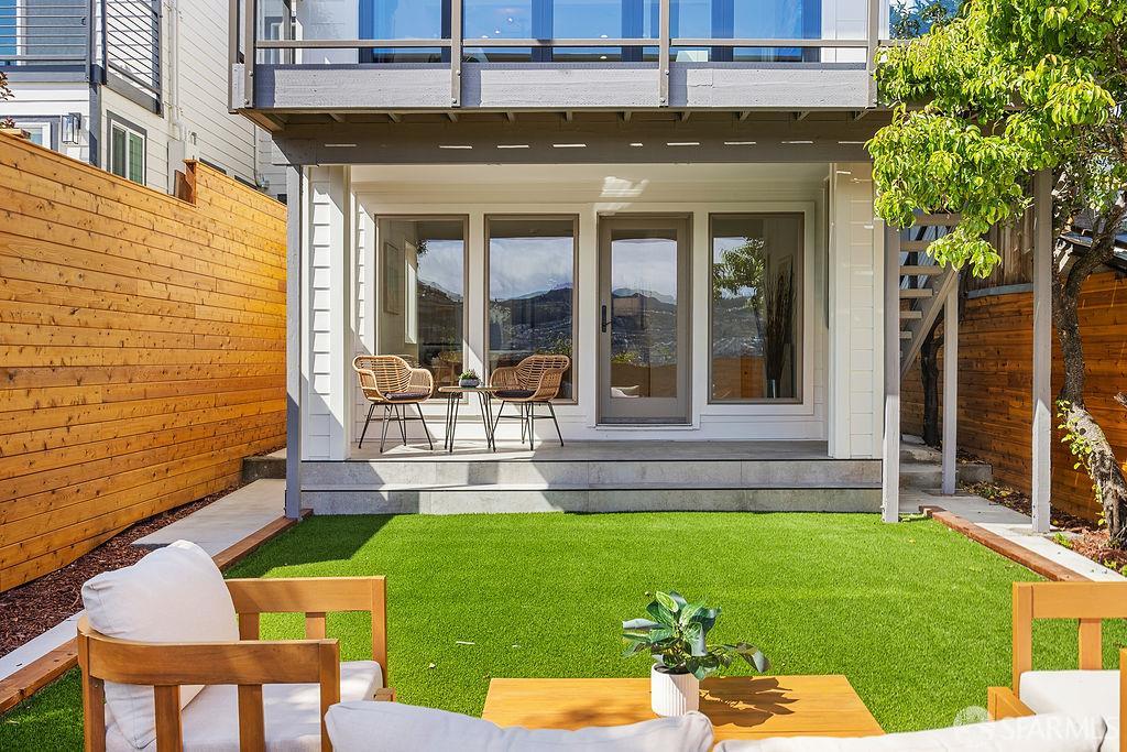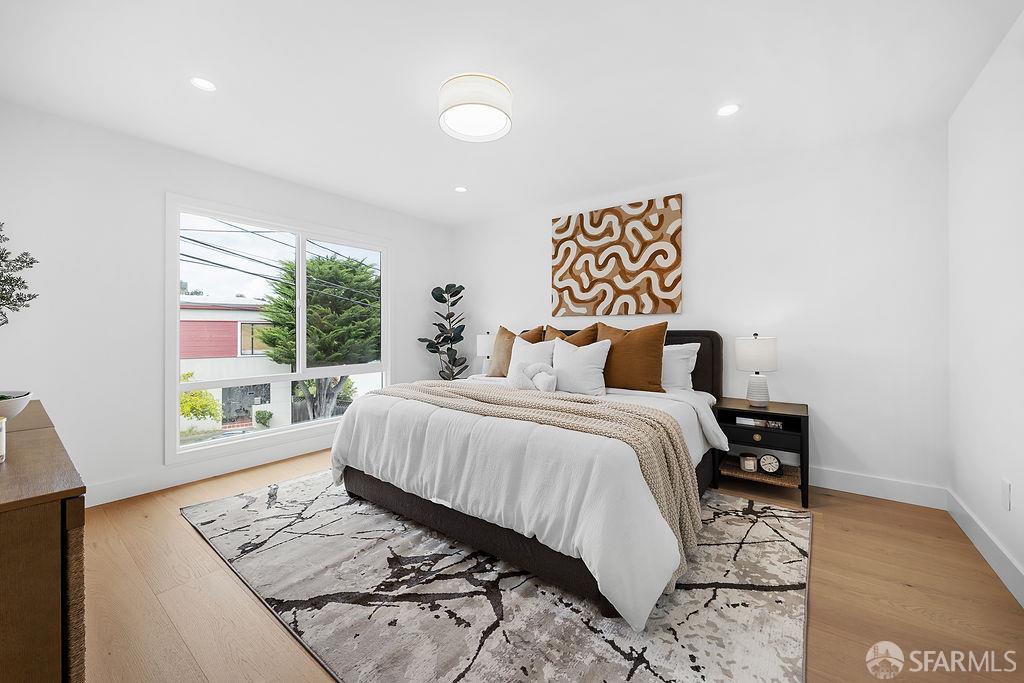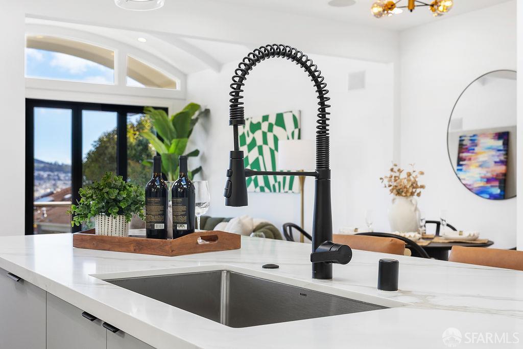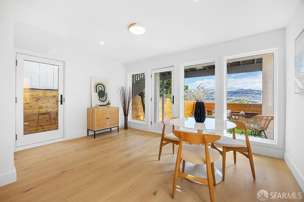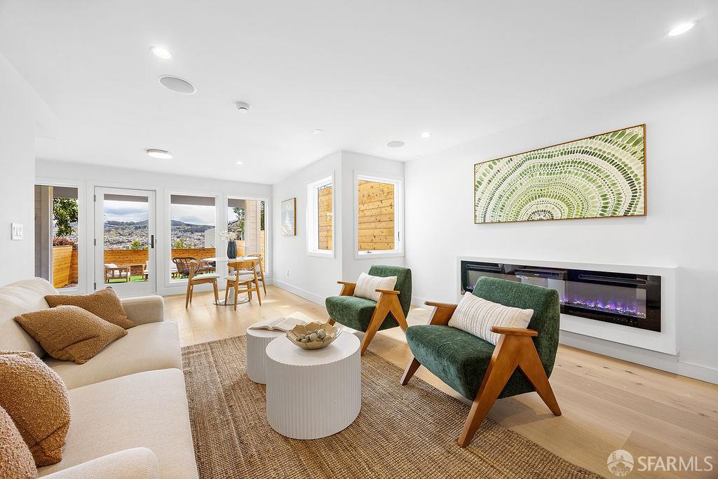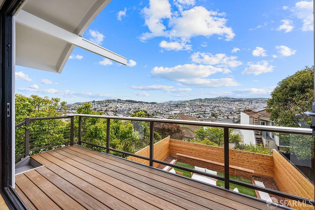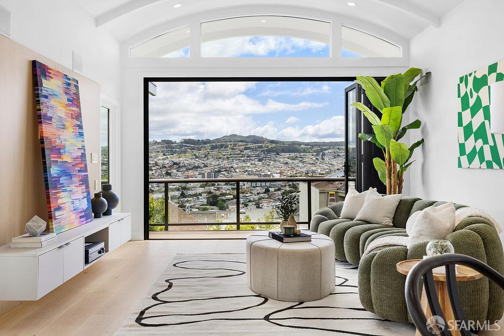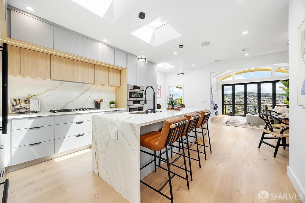 Newly reimagined with a full-scale renovation, this exceptional 4-bedroom, 4-bath home offers a seamless blend of modern design, functional living, and breathtaking panoramic city views. Thoughtfully redesigned with an open, light-filled layout, the home showcases wide-plank oak flooring, clean architectural lines, and curated high-end finishes throughout. The main living level is anchored by an expansive living and dining area with dramatic floor-to-ceiling folding glass doors that open to sweeping views of the city hills and skyline, creating a true indoor-outdoor experience. The chef’s kitchen is a true centerpiece, featuring high-end appliances including a Bosch gas cooktop, double ovens, dishwasher, and built-in refrigerator. A striking waterfall island, quartz countertops with full-height backsplash, and a two-tier cabinetry system provide both elevated design and abundant storage, ideal for everyday living and entertaining alike. This level includes well-appointed bedrooms, highlighted by a spacious primary suite designed as a private retreat. Enjoy a walk-in closet and a spa-inspired bathroom featuring a modern wet-room design complete with a soaking tub and oversized shower. Additional bedrooms offer flexibility for family, guests, or a home office. The lower level provides exceptional versatility with a large family or recreation room, perfect for media, entertaining, or extended living. With direct access to the backyard, this space creates a seamless indoor-outdoor flow. An additional bedroom and full bath, along with a dedicated laundry area and interior garage access, make this level ideal for guests or multi-generational living. The newly landscaped backyard features clean-lined fencing, low-maintenance turf, and a covered patio, perfect for relaxing, entertaining, or enjoying the home’s elevated setting and surrounding views. A rare opportunity to own a fully renovated home that combines modern luxury, flexible living space, and iconic San Francisco views.