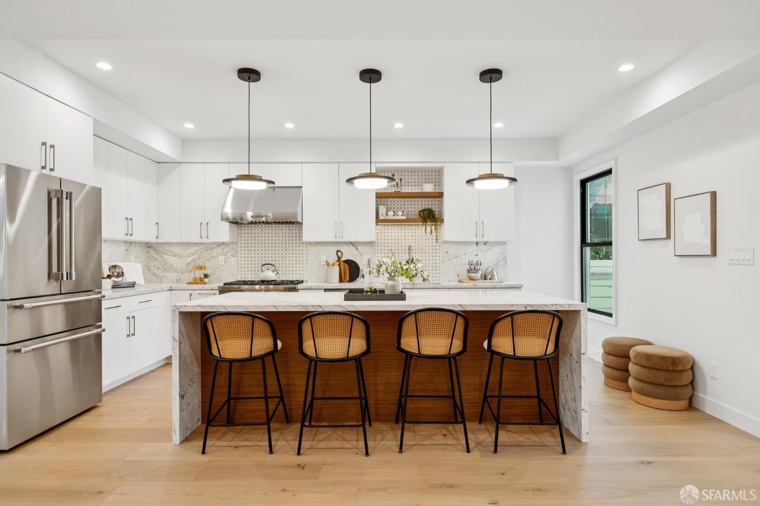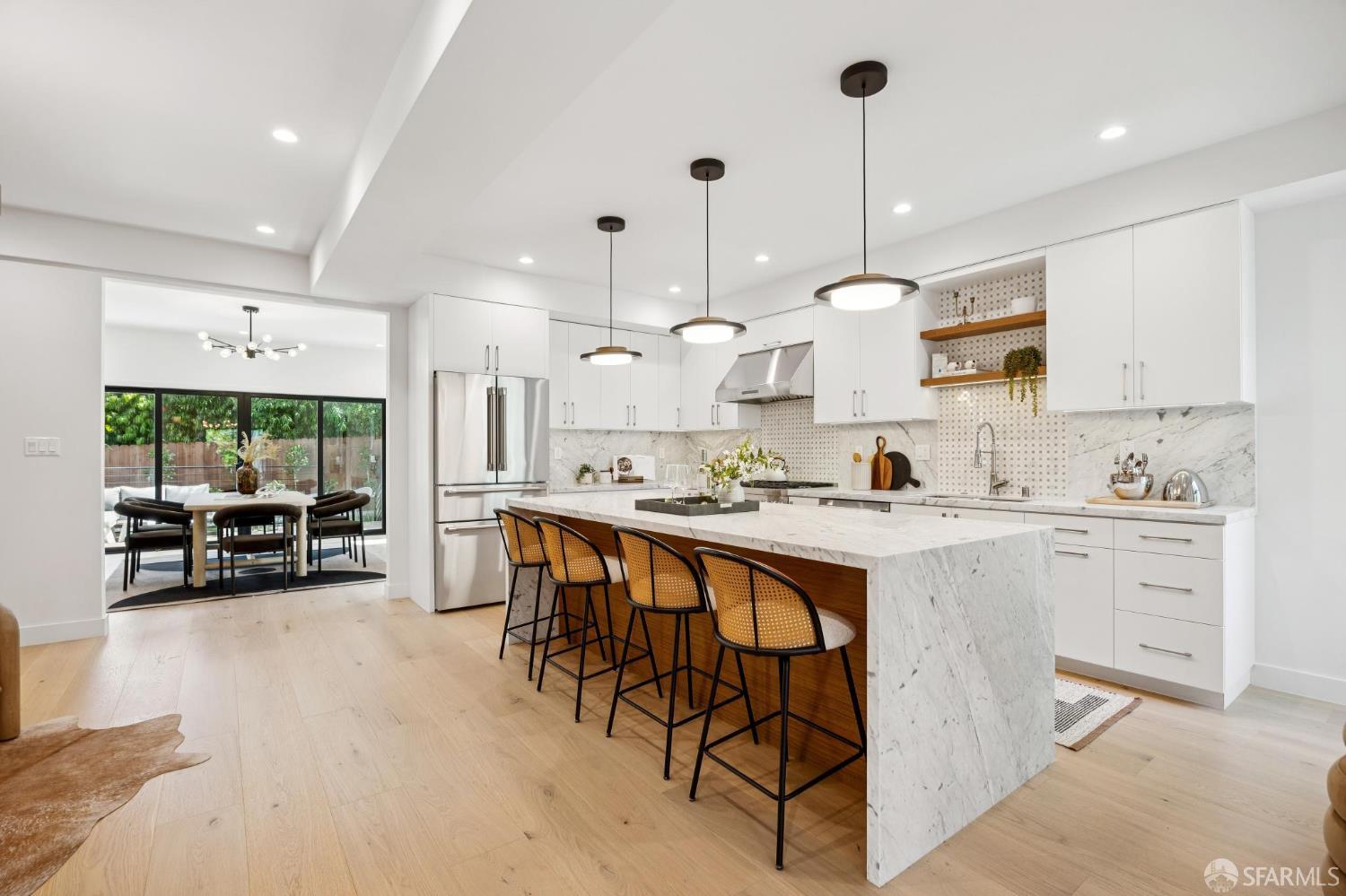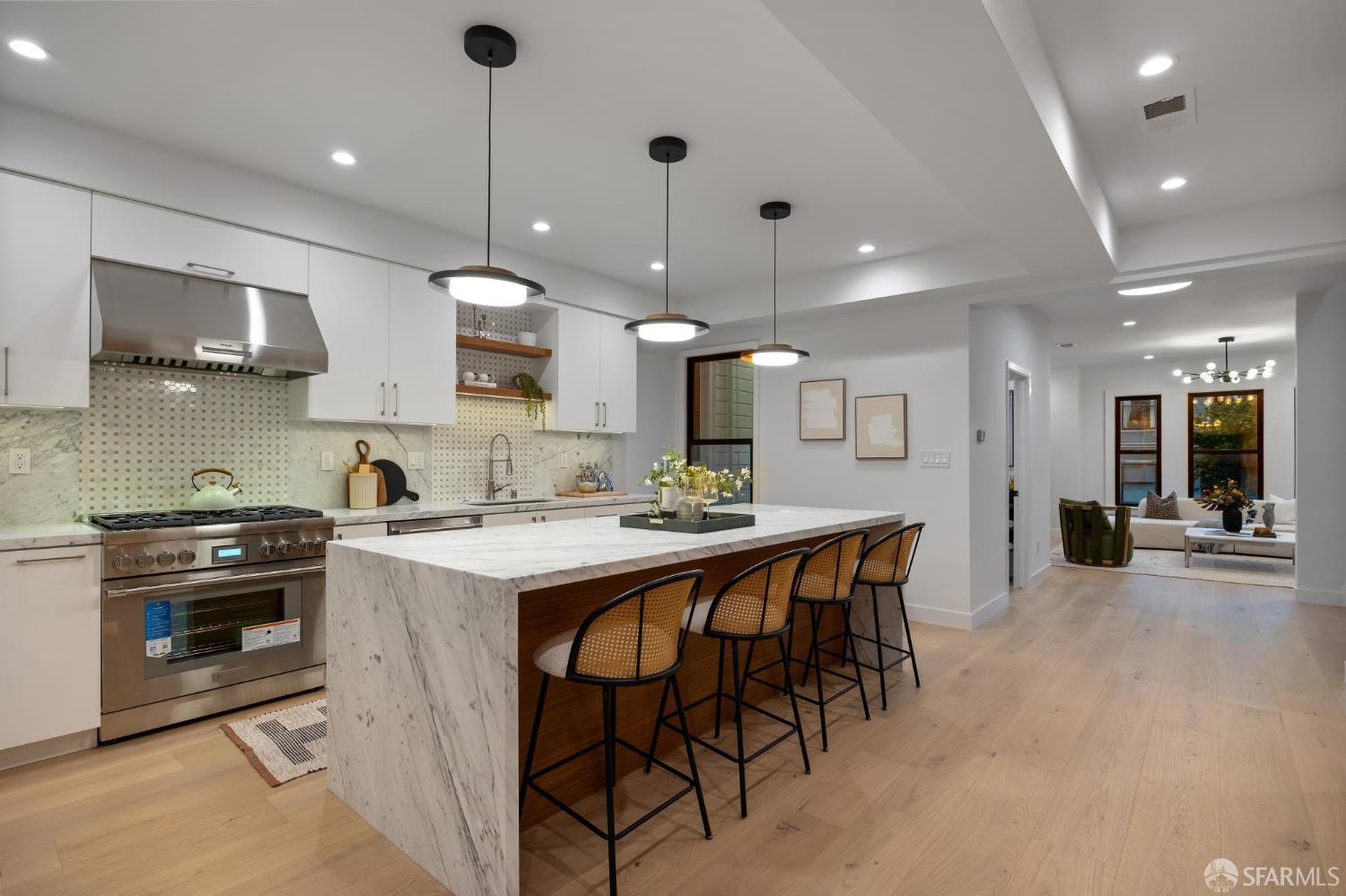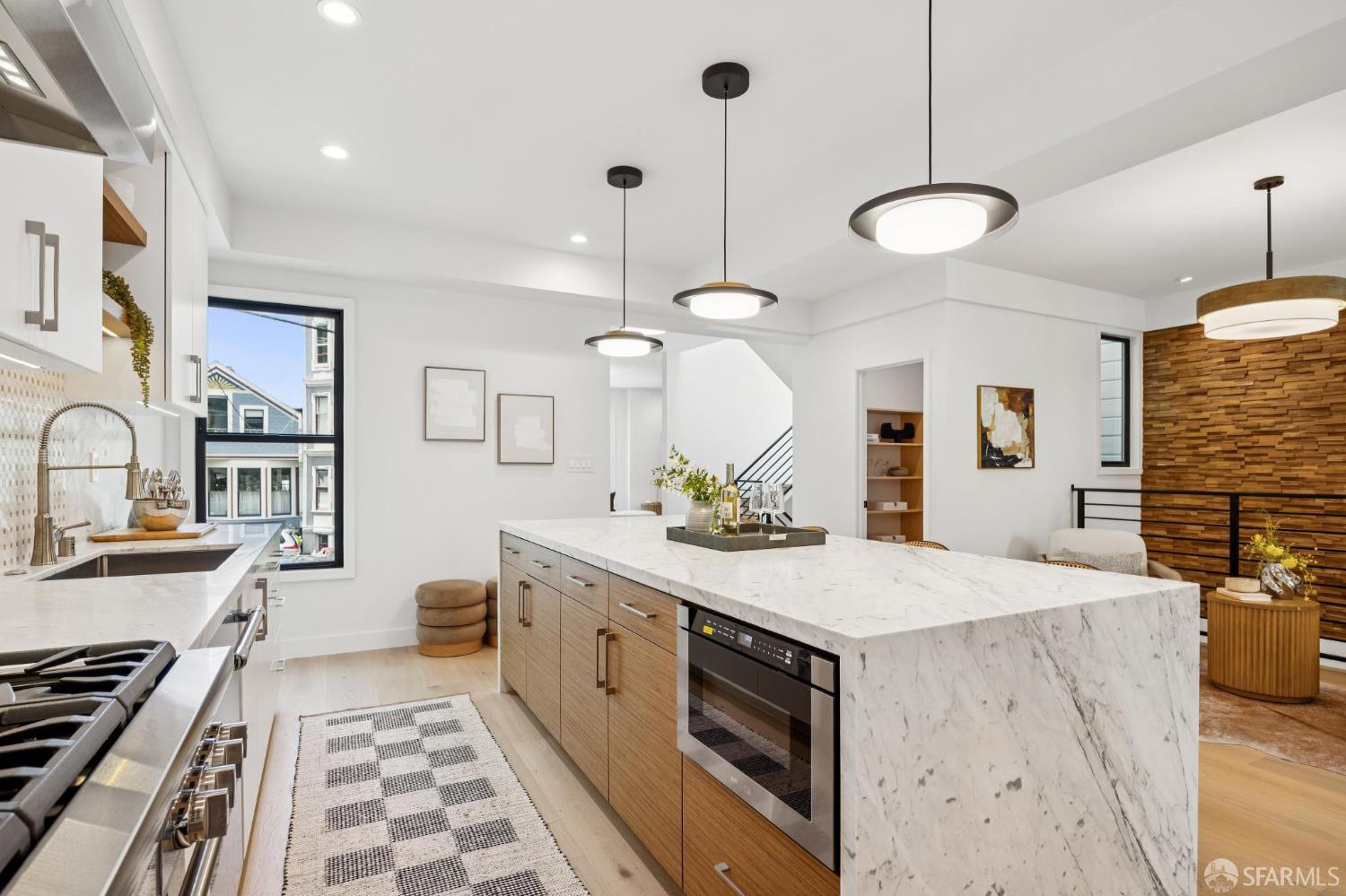 Recently remodeled and expanded 4 bedroom, 3.5 bath single-family residence in the highly desirable Lone Mountain neighborhood. Thoughtfully redesigned with impressive scale and refined finishes, this exceptional home offers both elegance and comfort across a well-conceived floor plan. The main level showcases an expansive living area with high ceilings, formal living and dining rooms, and a stunning open kitchen centered around an oversized island with natural Statuario marble waterfall counters. Designed for both everyday living and entertaining, the kitchen also features custom cabinetry, open shelving, under-cabinet lighting, a pantry closet, a casual sitting area, and premium Thermador appliances. Two large fireplaces enhance the warmth and character of the home. Large sliding doors off the dining room open to a beautiful deck and yard, creating seamless indoor-outdoor living. The upper level is illuminated by a bright skylight and offers the coveted layout of three bedrooms and two baths on one level, along with a convenient laundry closet. The spacious primary suite includes a walk-in closet, dual vanity, soaking tub, and separate shower with rain shower head. The lower level features an additional generous ensuite bedroom or flexible living space with a large walk-in closet, ideal for guests, extended family, office, or media use. Newer systems, windows, and roof complete this turnkey offering. Ideally situated near the University of San Francisco, Rossi Playground, Golden Gate Park, the de Young Museum, California Academy of Sciences, Conservatory of Flowers, and the vibrant Clement Street corridor with its popular dining, shopping, and neighborhood amenities, this is a rare opportunity to own a beautifully upgraded home in one of San Francisco’s most established residential enclaves.