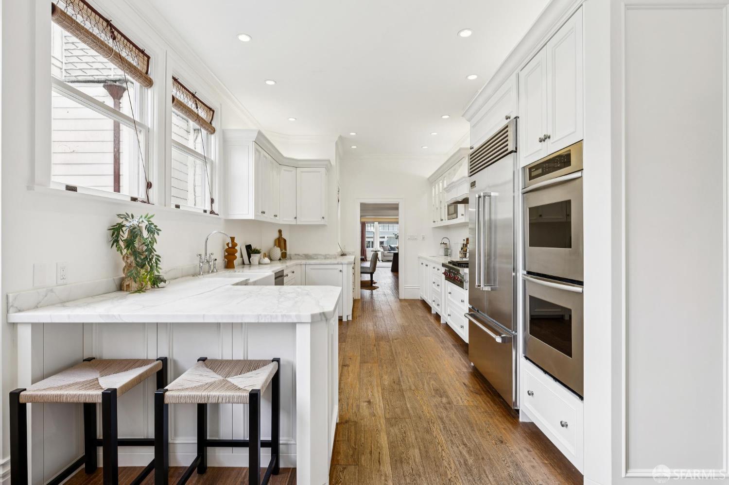 A timeless expression of Presidio Heights elegance, this expansive full-floor Edwardian-style condominium offers 3 bedrooms plus an office/4th bedroom, and 2.5 bathrooms in a gracious, house-like layout. Rich hardwood floors, high ceilings, and beautifully preserved detailing and moldings create a warm yet refined atmosphere throughout. Designed for both everyday living and entertaining, the living room flows seamlessly into a formal dining room and a spacious, updated, and bright eat-in chef’s kitchen, blending classic charm with modern functionality. The generously sized primary suite serves as a private retreat, featuring a walk-in closet and a thoughtfully renovated bathroom with a soaking tub and a separate shower. At the rear of the home, an additional bedroom or office opens directly to an exclusive-use backyard, an inviting outdoor sanctuary with a garden patio and deck, ideal for indoor-outdoor living. This home also includes in-unit laundry, one-car garage parking, and ample storage. Ideally located in prestigious Presidio Heights close to the Presidio, Presidio Wall Playground, and Presidio Golf Course, this residence is also just moments from the vibrant shops and dining of Sacramento Street and Laurel Village.