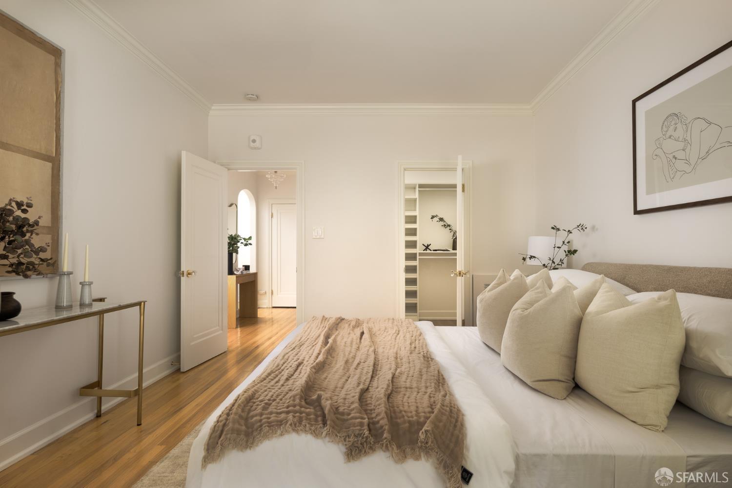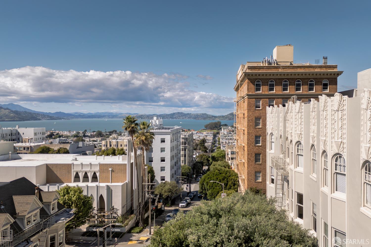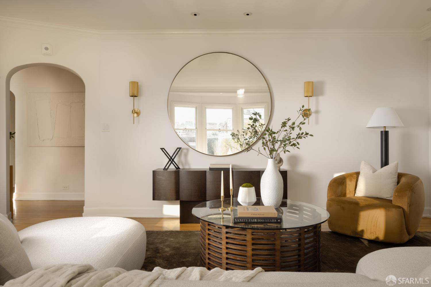 A rare offering set within one of Pacific Heights’ distinguished Art Deco buildings, this reimagined one bedroom residence pairs timeless architecture with elevated modern living. From the opulent lobby with ornately carved ceiling to the veneered birdcage elevator, preserved period details evoke the sophistication of old New York. Perched on the corner of an upper floor, light pours in through an excess of west-facing windows, with outlooks of the bay, high-reaching palms, a peek of the Golden Gate Bridge, and a front row view of jewel-toned evening sunsets. Graceful archways and open-concept living, dining, and kitchen spaces lend an airy elegance to every room. The meticulous remodel was deliberately designed to maximize aesthetic, storage, and little luxuries throughout, with custom cabinetry, Kelly Wearstler lighting, and a separate walk-in closet that was converted into a laundry/mud room. The primary bedroom is generously scaled and complimented by a walk-in closet customized by California Closets, offering rare storage and seamless organization. The spacious bath is equally refined, appointed with a double vanity and high-end finishes that create a sense of indulgence. Additional amenities include an in-unit Miele washer and dryer, private storage, and one-car parking with dedicated EV charging. Residents also enjoy access to a spectacular common roof deck with sweeping views that capture the city’s most iconic vistas. This ideal residence embodies the very best of Pacific Heights living: timeless, polished, and quietly exceptional.