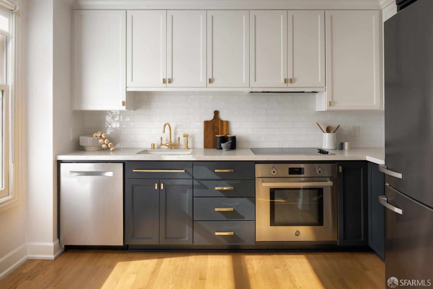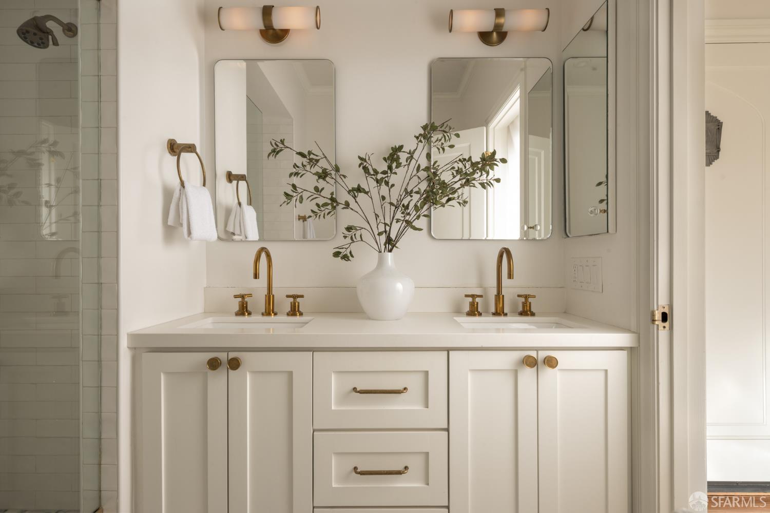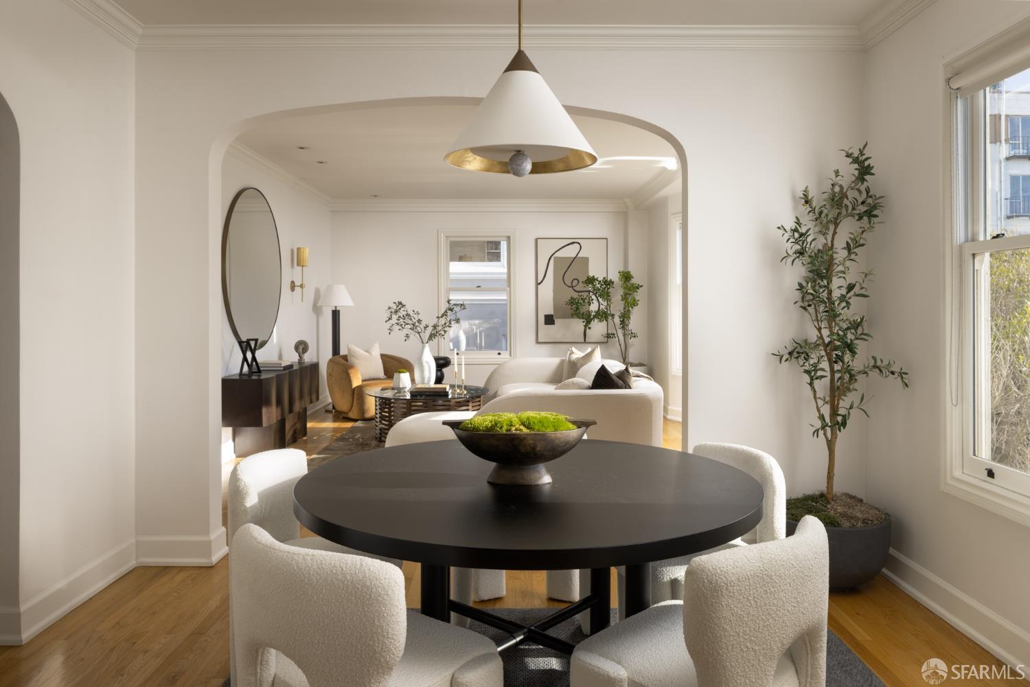 A rare offering set within one of Pacific Heights’ distinguished Art Deco buildings, this reimagined one bedroom residence pairs timeless architecture with elevated modern living. From the opulent lobby with ornately carved ceiling to the veneered birdcage elevator, preserved period details evoke the sophistication of old New York. Perched on the corner of an upper floor, light pours in through an excess of west-facing windows, with outlooks of the bay, high-reaching palms, a peek of the Golden Gate Bridge, and a front row view of jewel-toned evening sunsets. Graceful archways and open-concept living, dining, and kitchen spaces lend an airy elegance to every room. The meticulous remodel was deliberately designed to maximize aesthetic, storage, and little luxuries throughout, with custom cabinetry, Kelly Wearstler lighting, and a separate walk-in closet that was converted into a laundry/mud room. The primary bedroom is generously scaled and complimented by a walk-in closet customized by California Closets, offering rare storage and seamless organization. The spacious bath is equally refined, appointed with a double vanity and high-end finishes that create a sense of indulgence. Additional amenities include an in-unit Miele washer and dryer, private storage, and one-car parking with dedicated EV charging. Residents also enjoy access to a spectacular common roof deck with sweeping views that capture the city’s most iconic vistas. This ideal residence embodies the very best of Pacific Heights living: timeless, polished, and quietly exceptional.