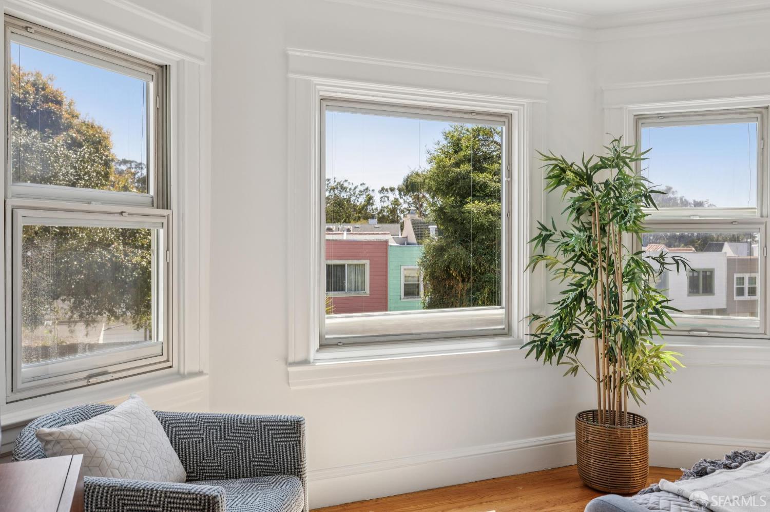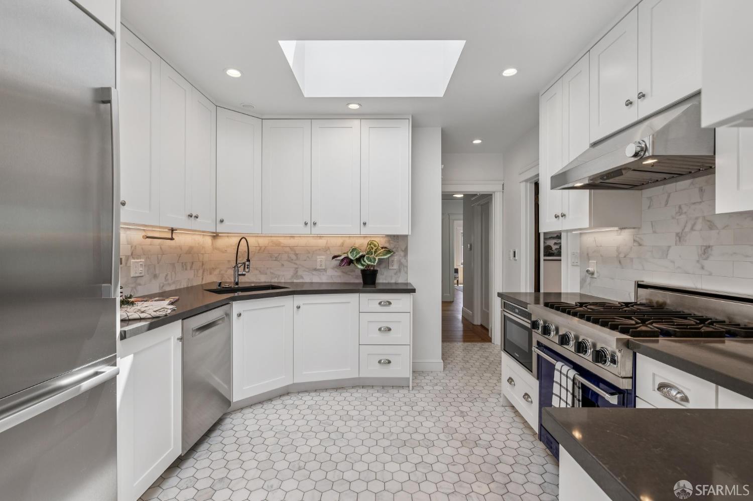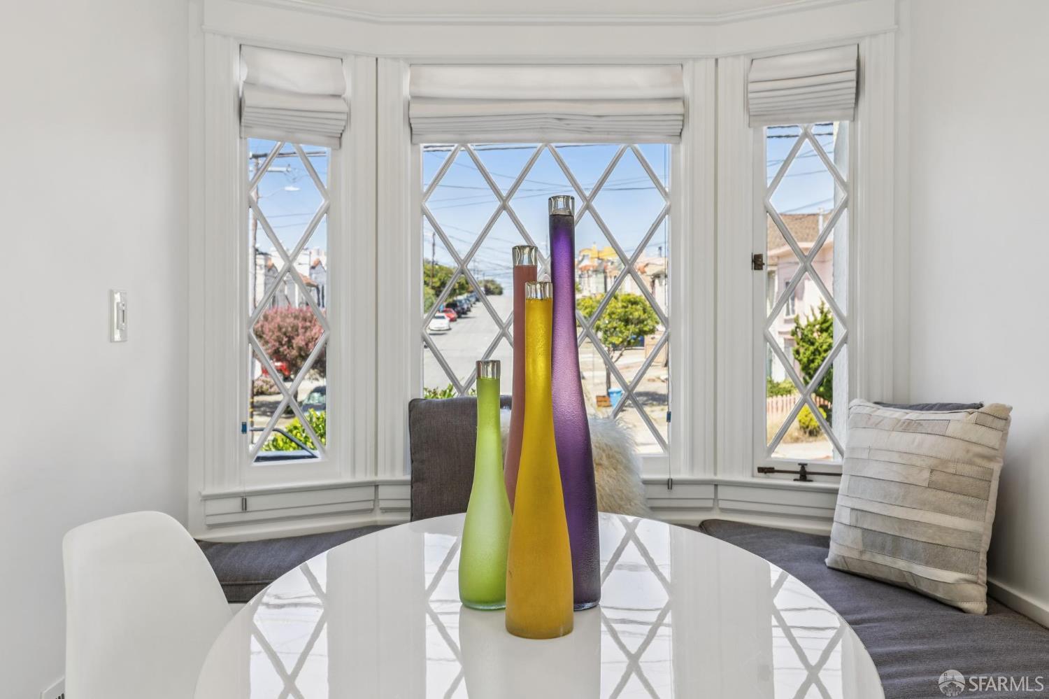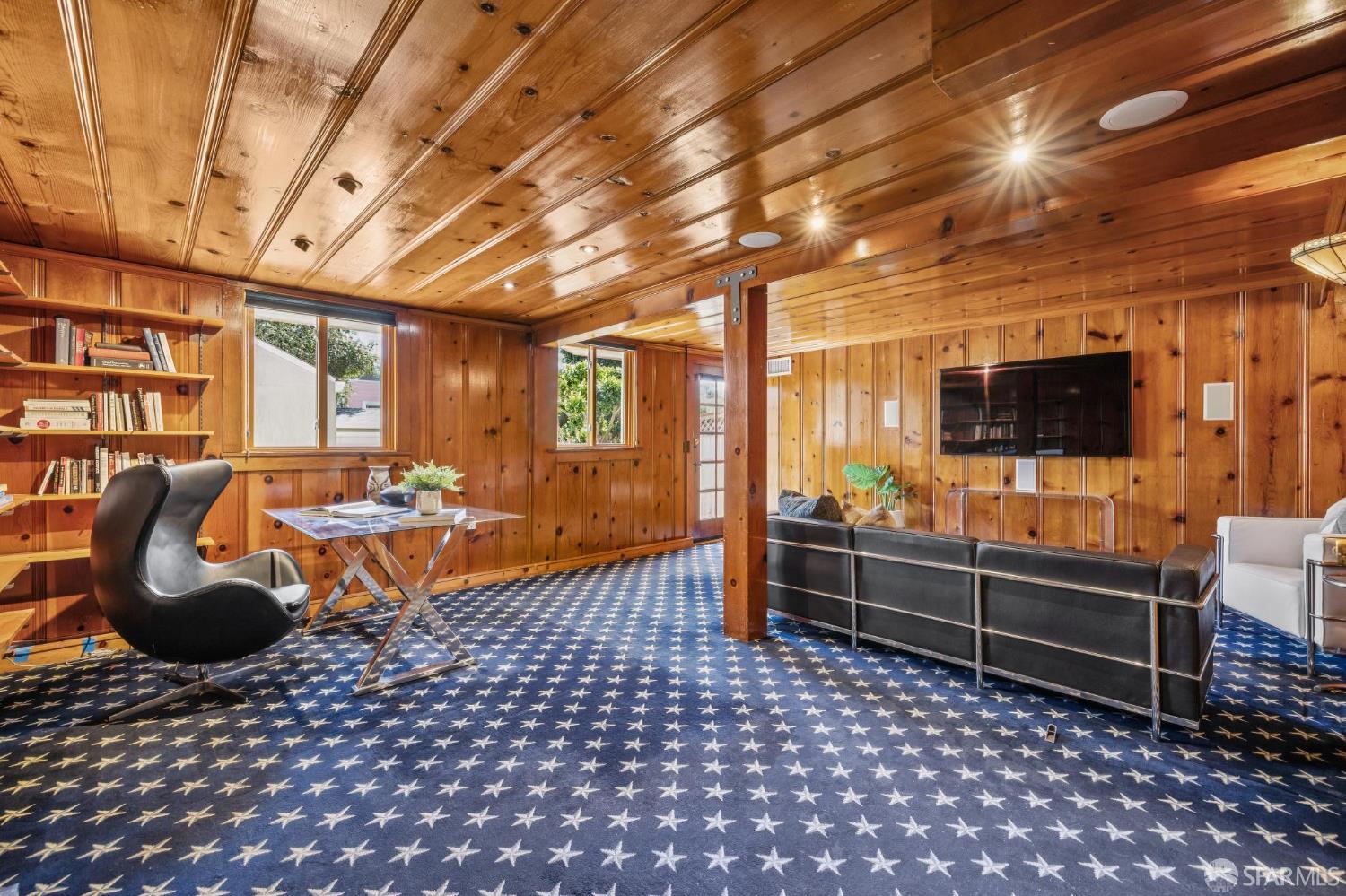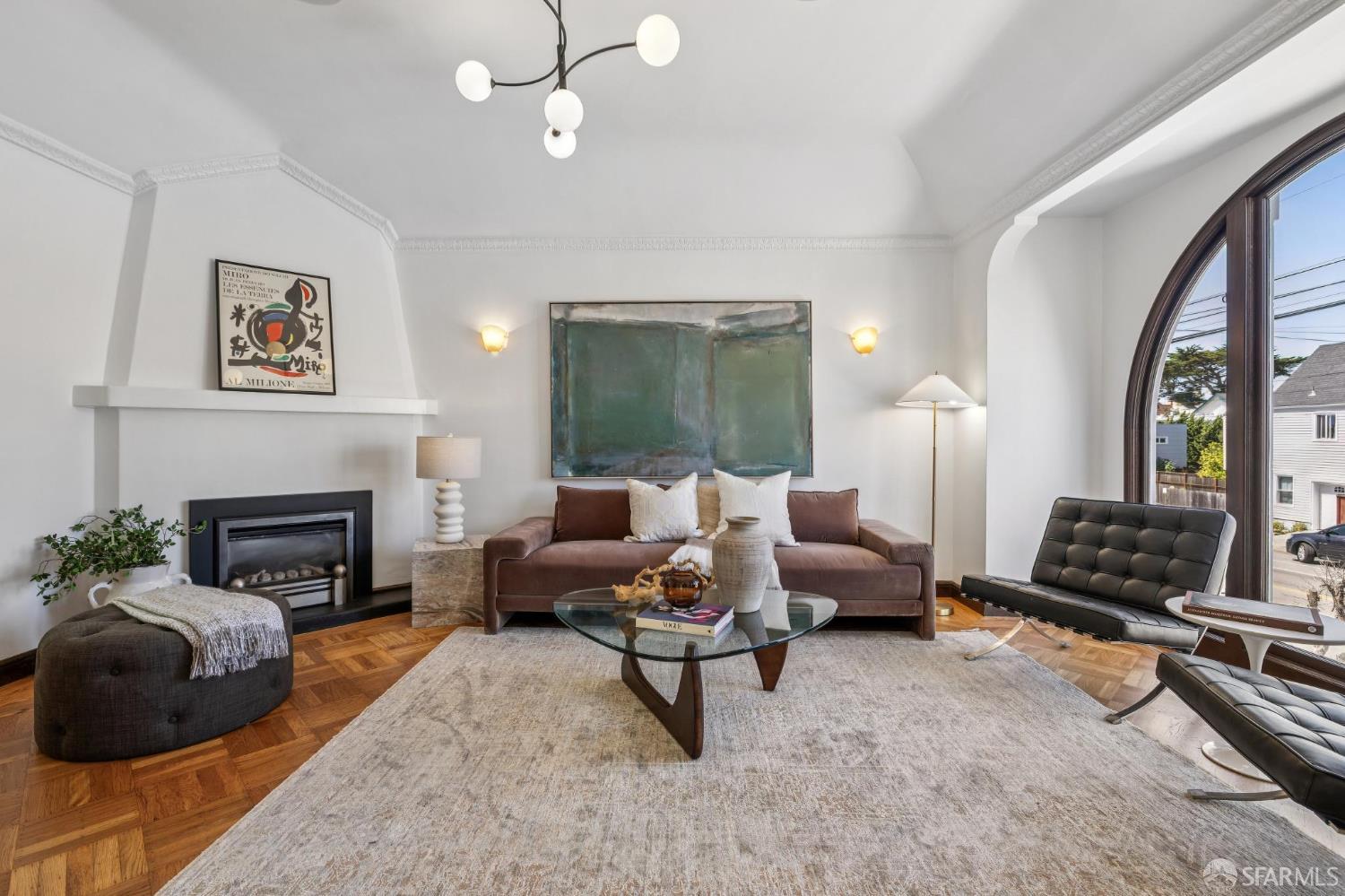 Classic 1930’s Parkside home blending timeless charm with modern upgrades. Filled with natural light, this residence features parquet hardwood floors in the entry and formal rooms. The living room offers coved ceilings, a gas fireplace, and an elegant arched front window. The dining room opens to a patio, ideal for indoor-outdoor entertaining. The remodeled kitchen includes a built-in refrigerator, Viking gas range, quartz counters, and a breakfast area with custom bench. The remodeled main bath has a soaking tub and walk-in shower with floor-to-ceiling tile. Two bedrooms overlook the garden. The lower level features a rich knotty pine family room which is en-suite to a bathroom with designer tile, walk-in shower and modern finishes. Additionally, there is a bonus guest room. The rear yard includes a brick and concrete patio and two custom sheds. A one-car garage with storage completes this exceptional home. Ideally located near Pine Lake Park, Taraval shops, Ocean Beach, and transit.