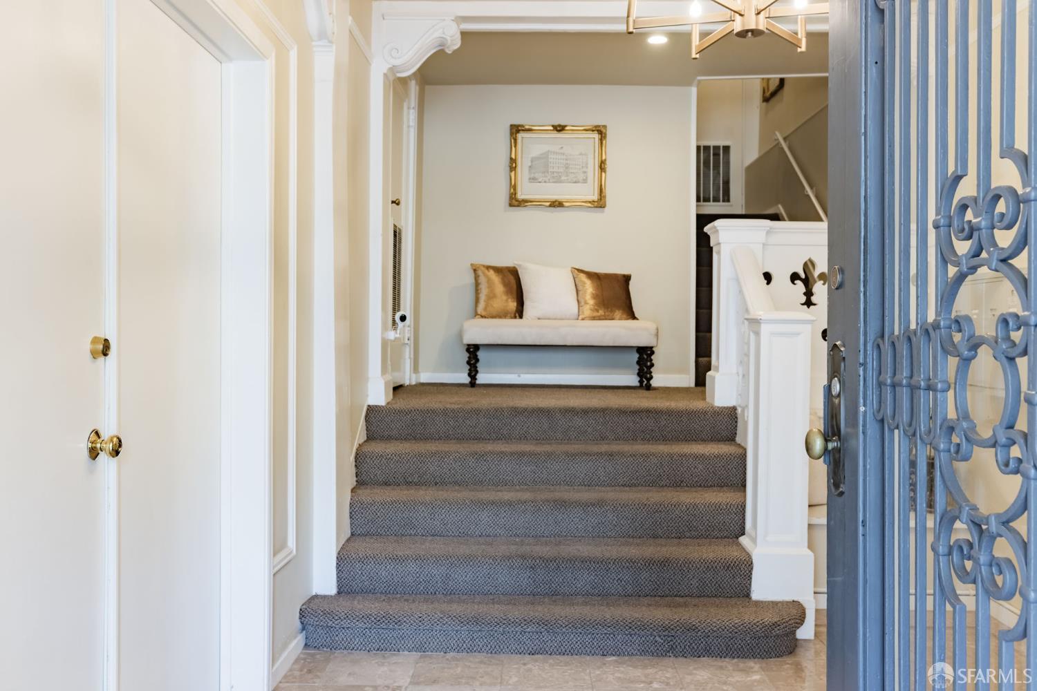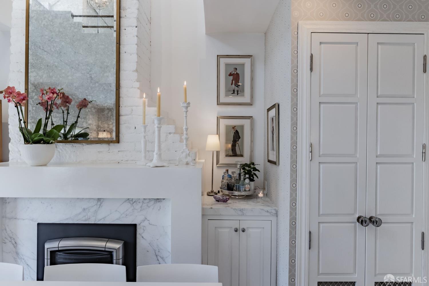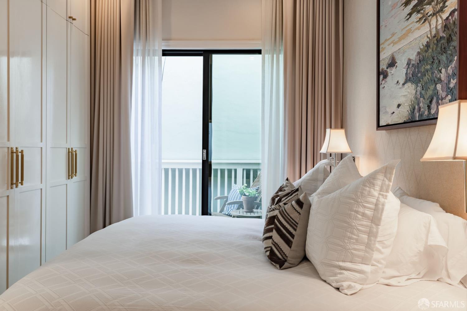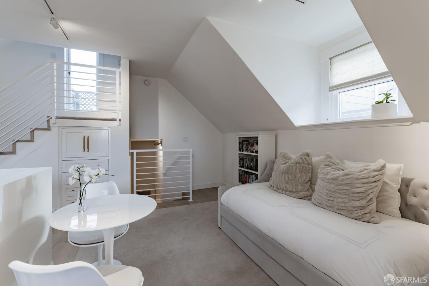 This stunning, pent level condo in prime Pacific Heights is truly one of a kind. Flooded with both natural light and old San Francisco charm, this home benefitted from an elegant, down-to-the-studs 2017 remodel and now boasts wide plank white oak floors, all new cabinets, countertops and appliances, and new windows throughout. The main level of this gorgeous home includes the primary bedroom with double closets and private patio (the first of two private outdoor spaces), remodeled bath with travertine walls and floors, living/dining room complete with fireplace and cathedral ceilings, and chef’s kitchen with Bertazzoni gas range, new faucet by Hansgrohe and imported English cabinet pulls, in unit washer and dryer. Upstairs is your light and bright lofted second bedroom with custom under-stair storage casework, an office nook, and access to your private roof deck, which includes a heater and a marble island. Separate storage and a third shared common patio complete this exquisite residence.