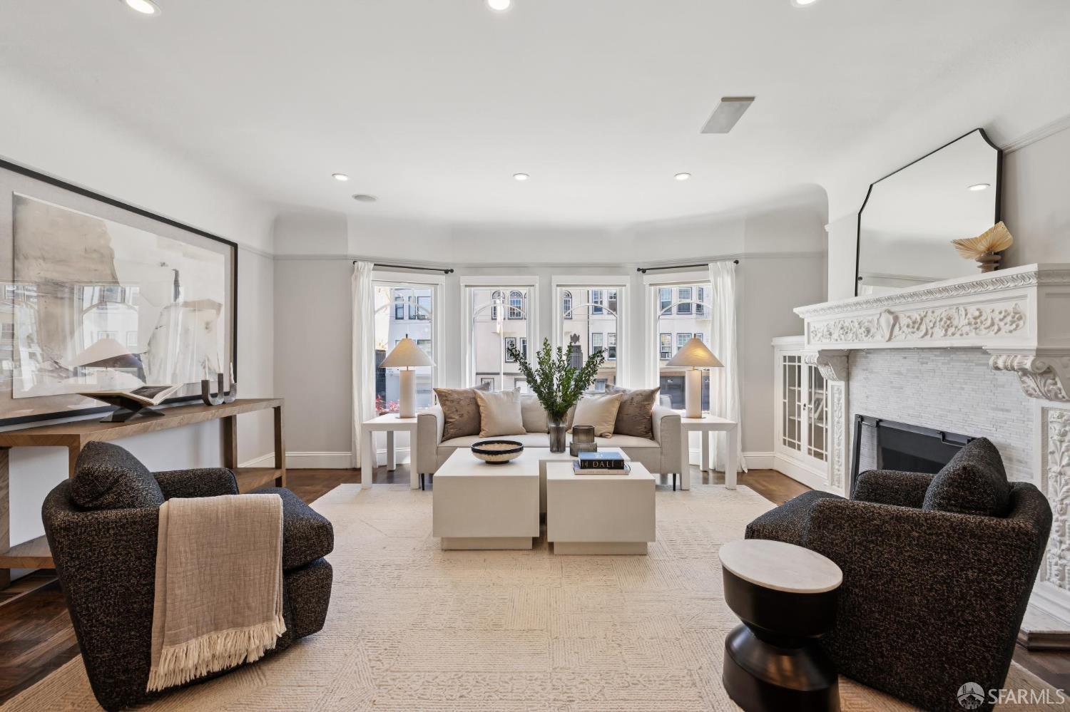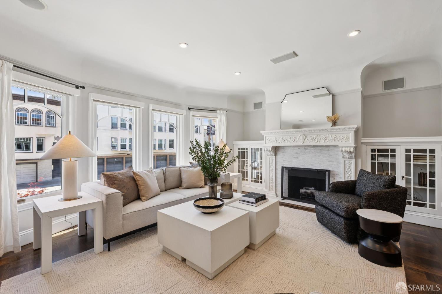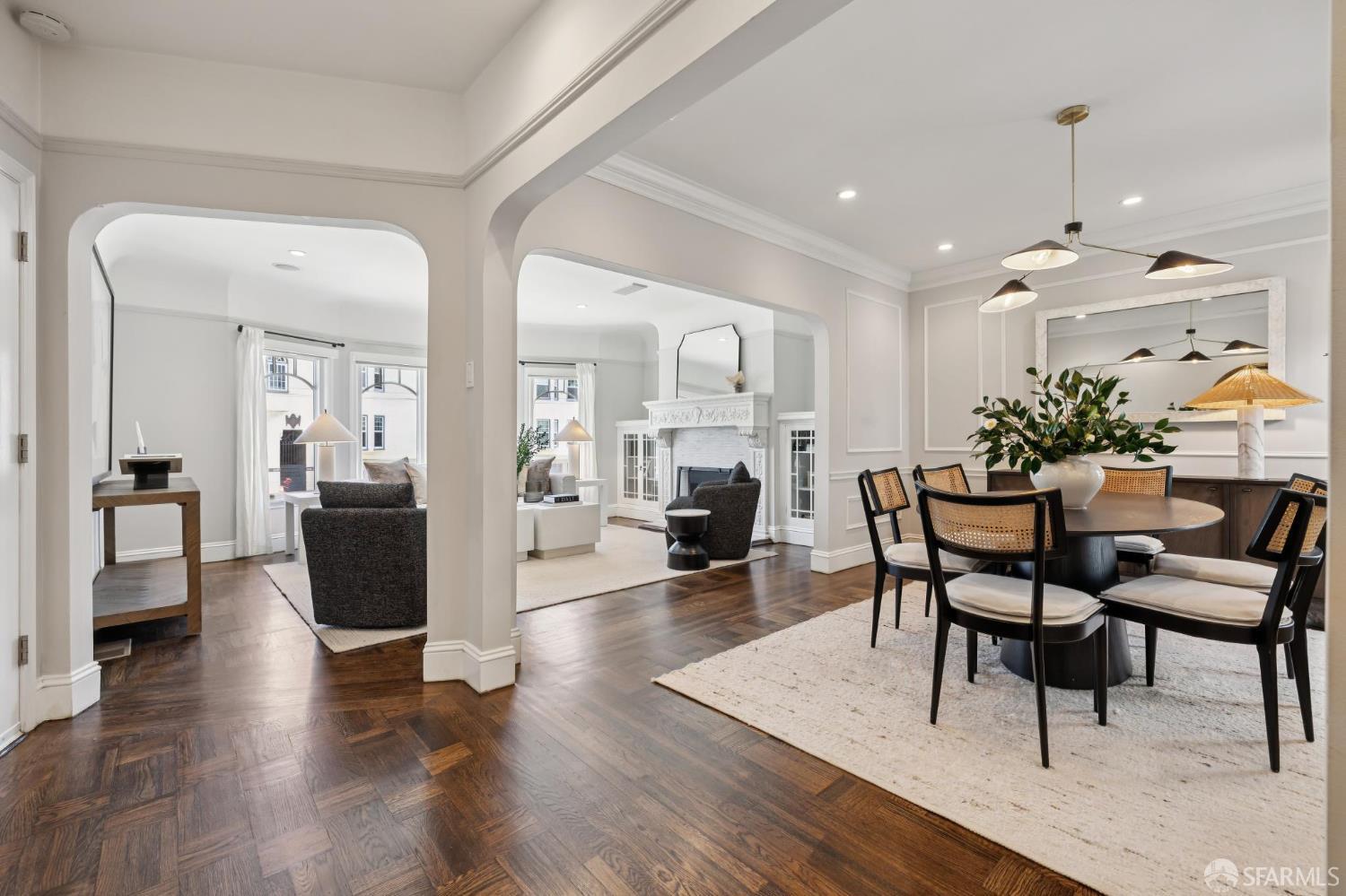 3319 Divisadero is a stunning, full-floor Marina flat that combines timeless charm with modern convenience. This pristine two-bedroom home boasts rich architectural details and thoughtful design. Step inside, and to your left, you’ll find the inviting living room, where a white marble tile fireplace with carved mantel takes center stage, flanked by elegant built-in cabinets. Coved ceilings, ornate windows and recently refinished oak parquet floors are period details which make this room special. The formal dining room, adorned with French ribbed windows, is bathed in natural light yet maintains a sense of privacyperfect for intimate dinners or lively gatherings. The modern kitchen is a chef’s dream, featuring Carrara marble counters, custom cabinets, stainless steel appliances, and a cozy built-in banquet. Just off the kitchen, a dedicated laundry room includes a stacked LG washer and dryer for added convenience. Retreat to the back of the unit, where two generously sized bedrooms overlook a shared serene garden, offering a peaceful escape from the vibrant city. A renovated full bath and a half bath complete the living space. There are two dedicated garage spaces with a universal EV charger. This home is close to popular restaurants and shops and a short walk to the Marina Green. It’s a walker and bicyclist paradise! Located in the heart of the Marina, 3319 Divisadero is more than just a home; it’s a haven of style, comfort, and functionality.