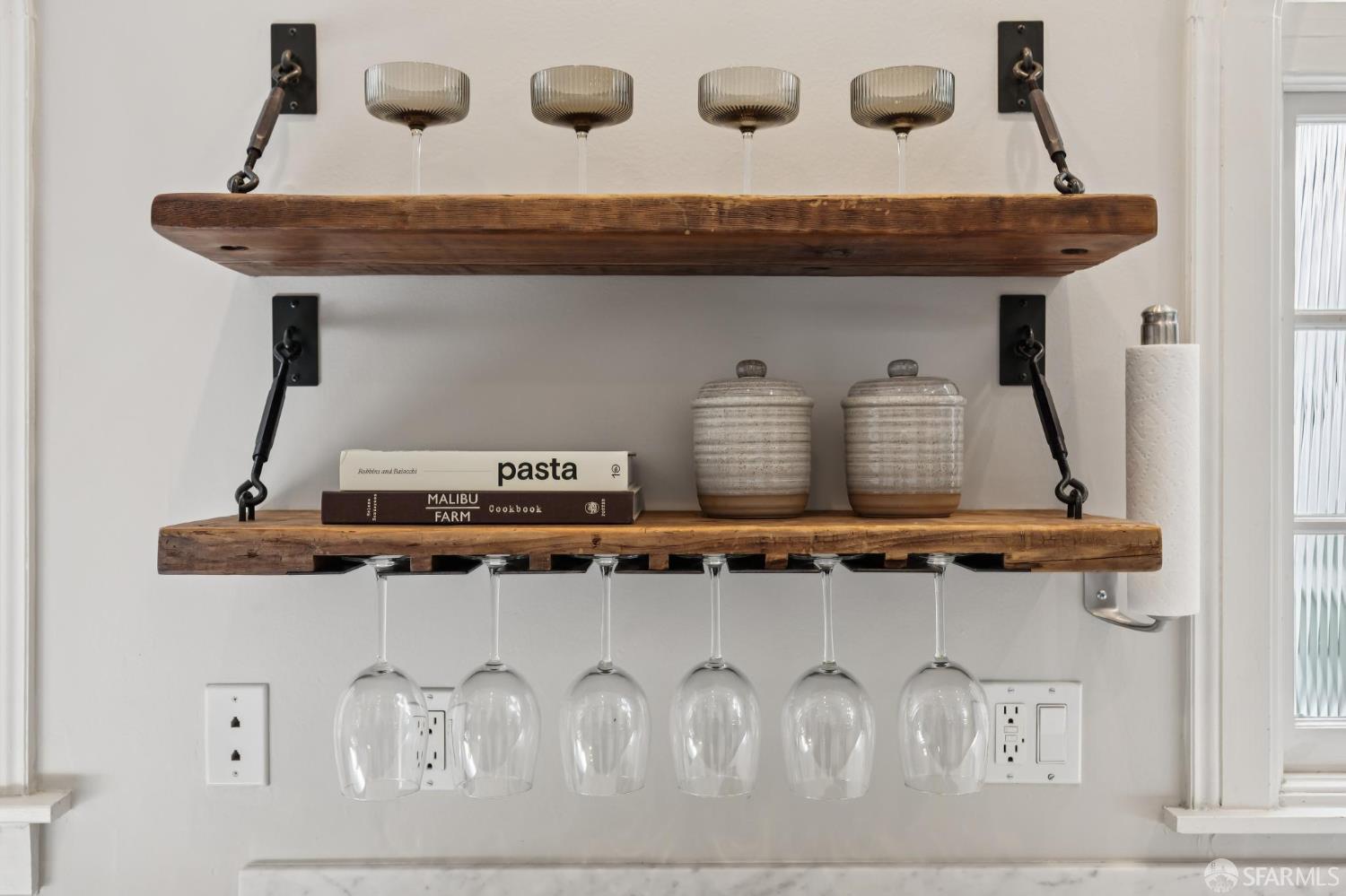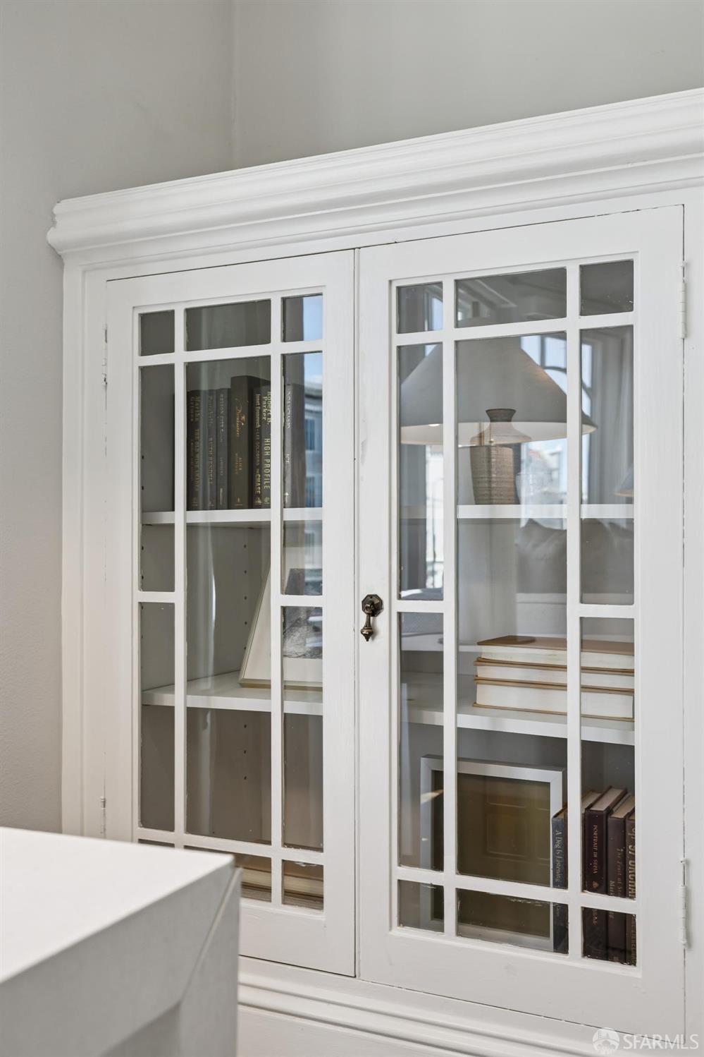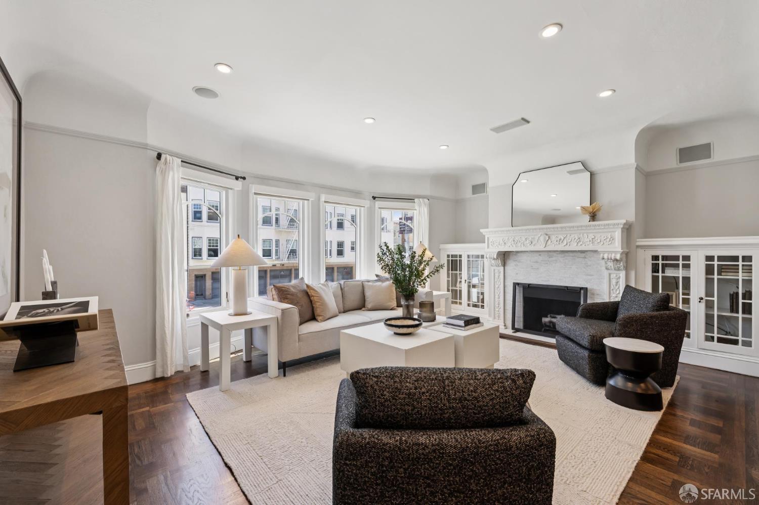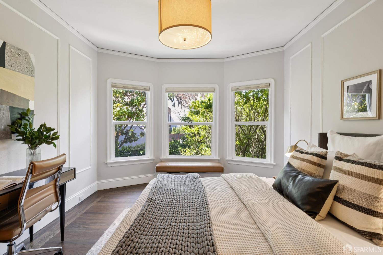 3319 Divisadero is a stunning, full-floor Marina flat that combines timeless charm with modern convenience. This pristine two-bedroom home boasts rich architectural details and thoughtful design. Step inside, and to your left, you’ll find the inviting living room, where a white marble tile fireplace with carved mantel takes center stage, flanked by elegant built-in cabinets. Coved ceilings, ornate windows and recently refinished oak parquet floors are period details which make this room special. The formal dining room, adorned with French ribbed windows, is bathed in natural light yet maintains a sense of privacyperfect for intimate dinners or lively gatherings. The modern kitchen is a chef’s dream, featuring Carrara marble counters, custom cabinets, stainless steel appliances, and a cozy built-in banquet. Just off the kitchen, a dedicated laundry room includes a stacked LG washer and dryer for added convenience. Retreat to the back of the unit, where two generously sized bedrooms overlook a shared serene garden, offering a peaceful escape from the vibrant city. A renovated full bath and a half bath complete the living space. There are two dedicated garage spaces with a universal EV charger. This home is close to popular restaurants and shops and a short walk to the Marina Green. It’s a walker and bicyclist paradise! Located in the heart of the Marina, 3319 Divisadero is more than just a home; it’s a haven of style, comfort, and functionality.