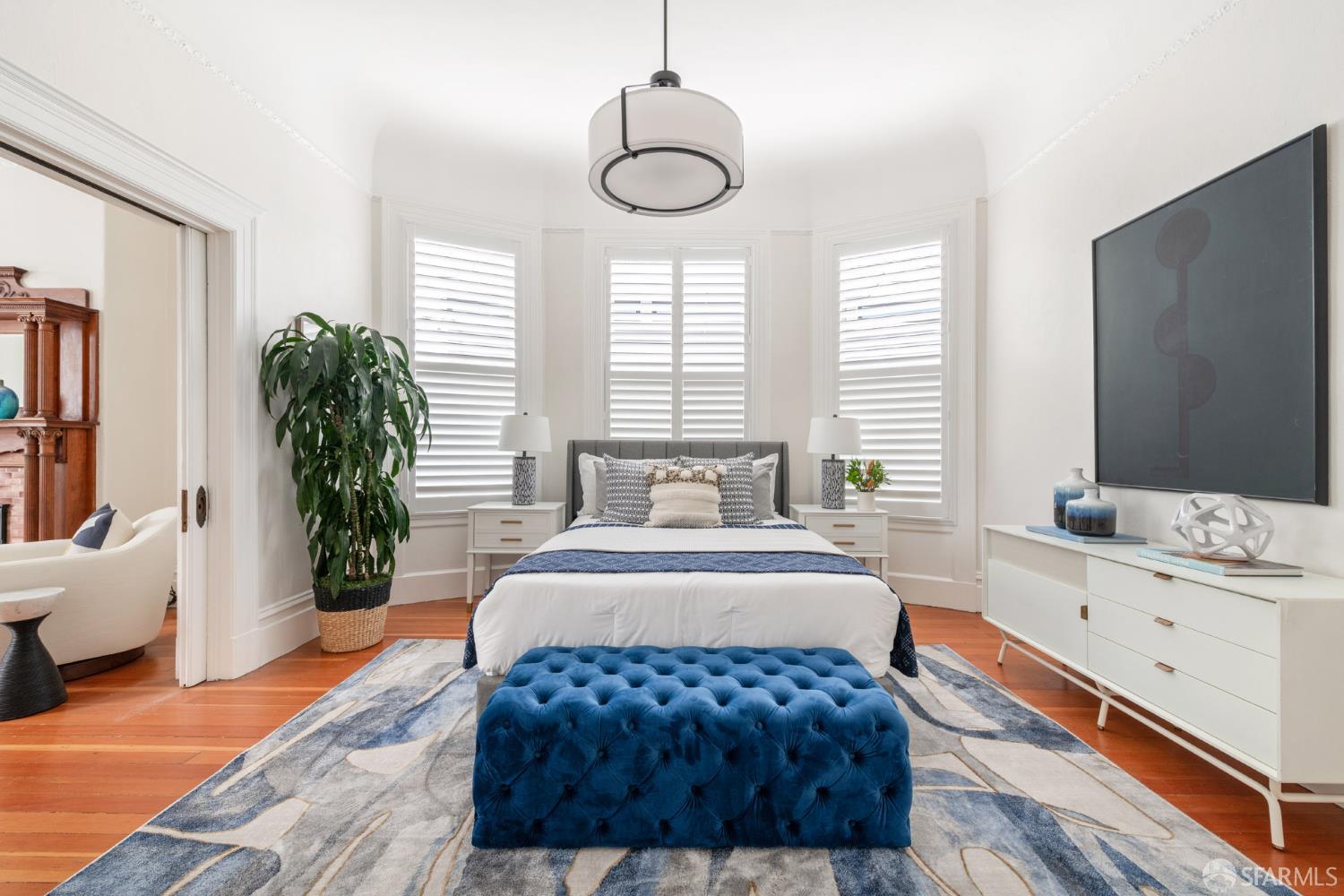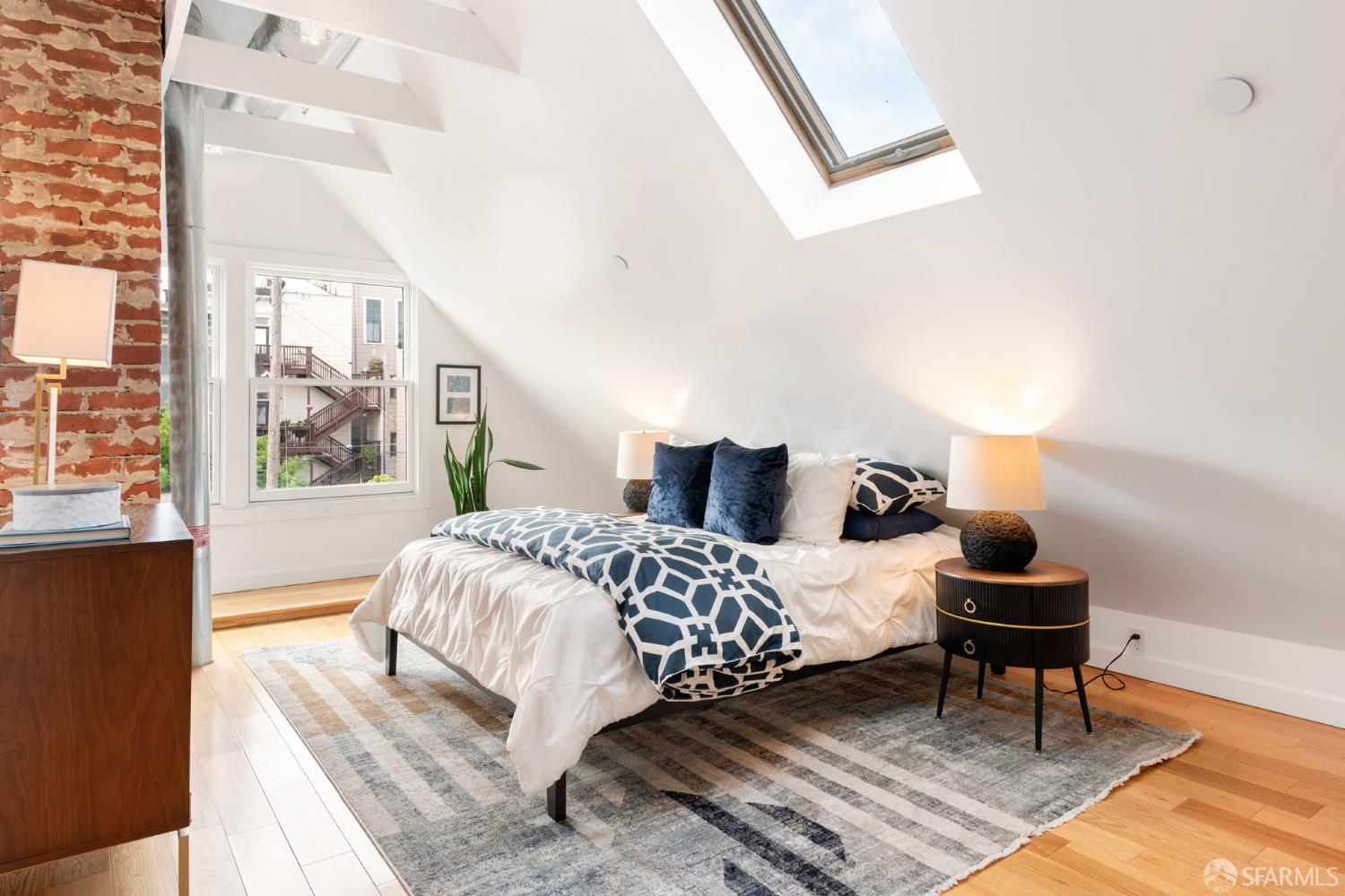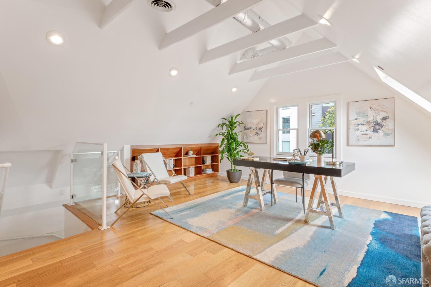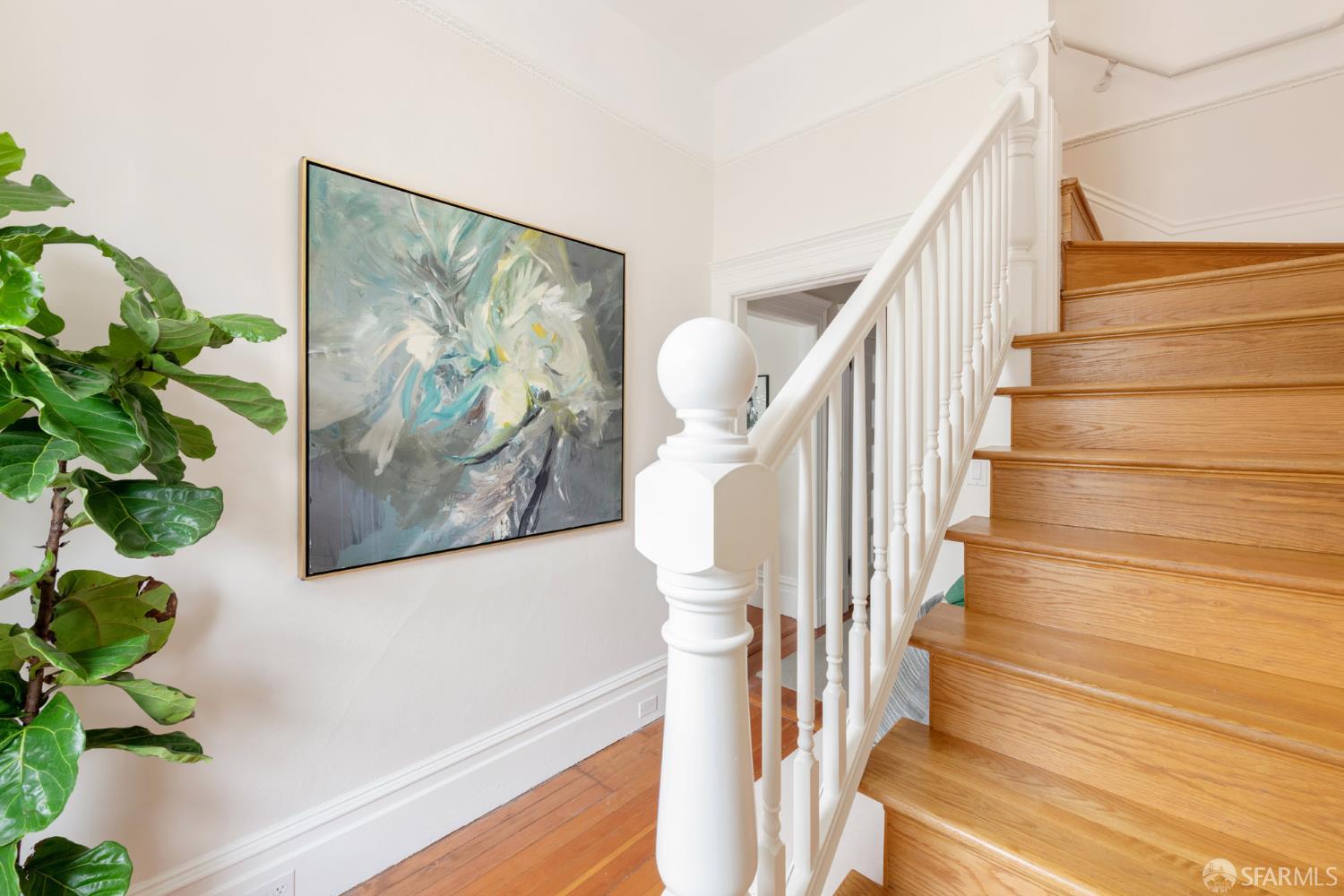 Set within a Victorian in the heart of Hayes Valley, this expansive condo lives like a single-family home, offering 2,961 square feet of light-filled living space across two full levels. Timeless architectural detail, thoughtful updates, and an exceptional sense of scale define the home throughout. Soaring 12+ foot ceilings, rich period craftsmanship, and beautifully preserved hardwood floors create a warm and elegant backdrop. A grand double parlor welcomes you with impressive proportions and abundant natural light ideal for both entertaining and everyday living. The updated kitchen features custom cabinetry and blends seamlessly with the home’s historic character. The residence offers 4 spacious bedrooms and 2 bathrooms, including a distinctive octagonal primary suite with a gas fireplace, walk-in closet, and sunny south-facing windows. At the rear of the home, a stunning glass atrium room overlooks the garden and quiet Lily Alley, offering rare privacy with unobstructed outlooks an ideal space for relaxing or working from home. The upper level is fully finished and provides exceptional flexibility, with ample space for a home office, media room, gym, or additional guest accommodations making the home feel even more expansive and versatile. Additional highlights include deeded, gated off-street parking and a well-maintained, boutique 3-unit HOA with long-term owners. Ideally located with easy access to public transportation, major commuting routes, and the vibrant shops and restaurants of Hayes Valley, this is a rare opportunity to own a truly special San Francisco home.