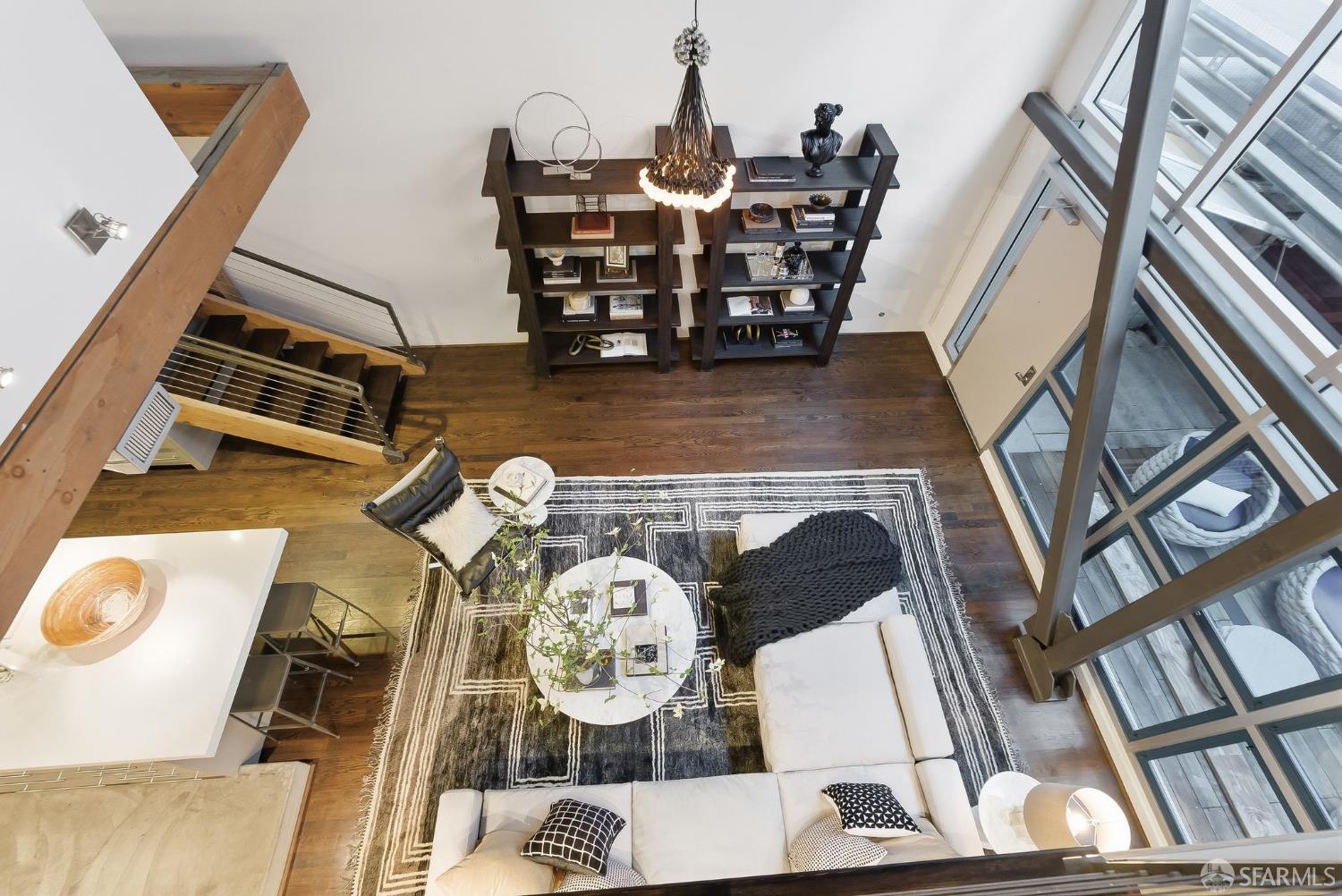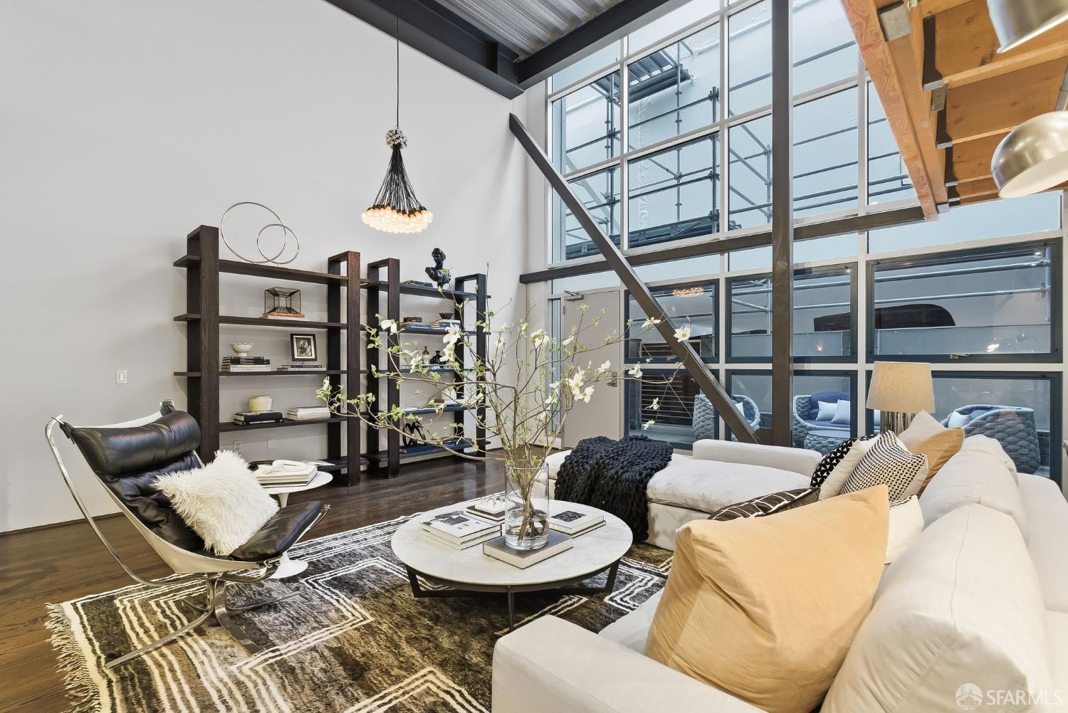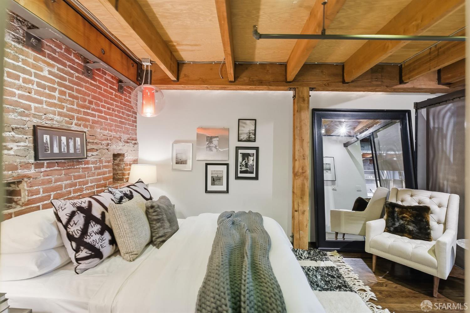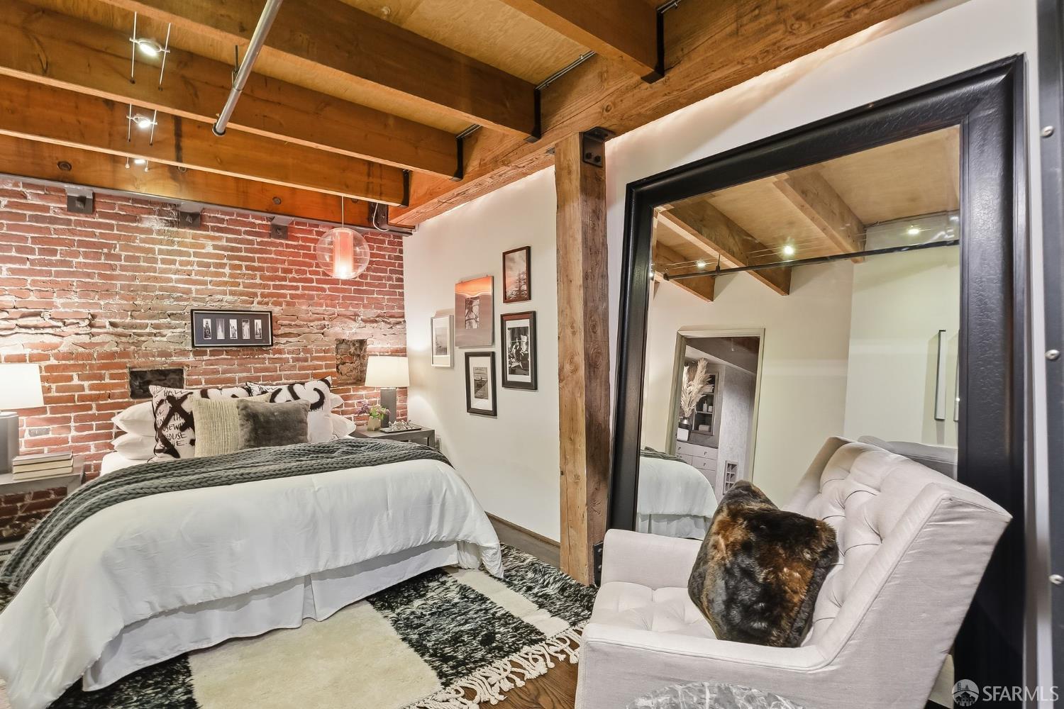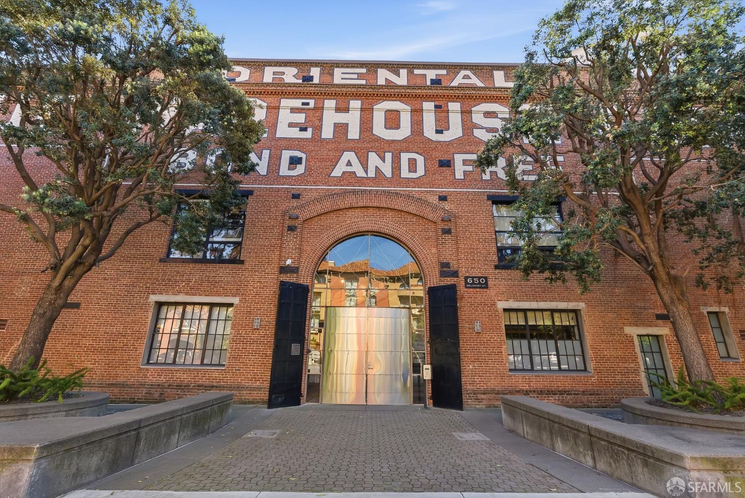 Residence #216 is a soaring 18ft double-height loft in the historic 1860s Oriental Warehouse. This voluminous space captures the intersection of San Francisco’s maritime history & modern industrial design. A massive wall of floor-to-ceiling glass illuminates timber beams, industrial steel accents, & walnut floors. The scale accommodates large-format art & sophisticated living, a footprint rarely found in South Beach. The 19th-century warehouse provides a rugged, refined backdrop for high-end finishes. The remodeled chef’s kitchen is a high-concept space built for utility & hosting. It features exposed concrete walls & heavy timber. A 9ft social island serves as the centerpiece, providing an expansive surface for culinary prep & dining. The pro-grade appliance suite includes a Viking 4-burner cooktop, matching built-in oven & microwave, & a 36-inch French door refrigerator. This unit includes a dedicated oversized pantry & in-unit laundry, providing rare hidden utility & high-capacity storage. A grand staircase leads to the primary mezzanine, where the spacious sleeping area easily fits a king-sized bed & remains connected to the home’s architectural volume. This level includes a versatile private library area which extends onto a signature steel-framed catwalk with dramatic vantage points over the living area. The primary suite features a meticulously organized walk-in closet with exposed brick & a dedicated linen closet. The stone-clad primary bath features a deep soaking tub, double sink vanity with premium hardware, & elegant stone tiling. The main-level suite offers significant scale as a second bedroom or executive office, distinguished by exposed brick walls. It is served by a dedicated wellness spa featuring a custom concrete steam shower with therapeutic massage valves & a built-in bench. This industrial-chic bathroom transforms daily routines into a high-end spa experience grounded by masonry. Outside, a private gated patio provides a tranquil urban oasis. Located in South Beach, the home is steps from tech shuttles, Caltrain, & the Ferry Building for dining & ferries to Marin. With rare side-by-side two-car parking, Residence #216 represents the pinnacle of waterfront luxury & urban convenience.