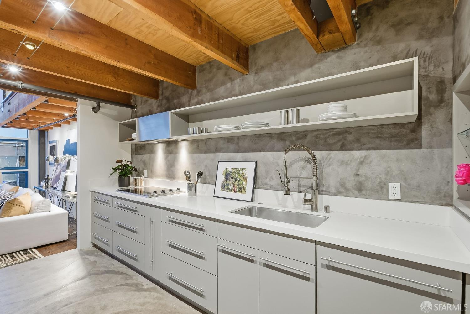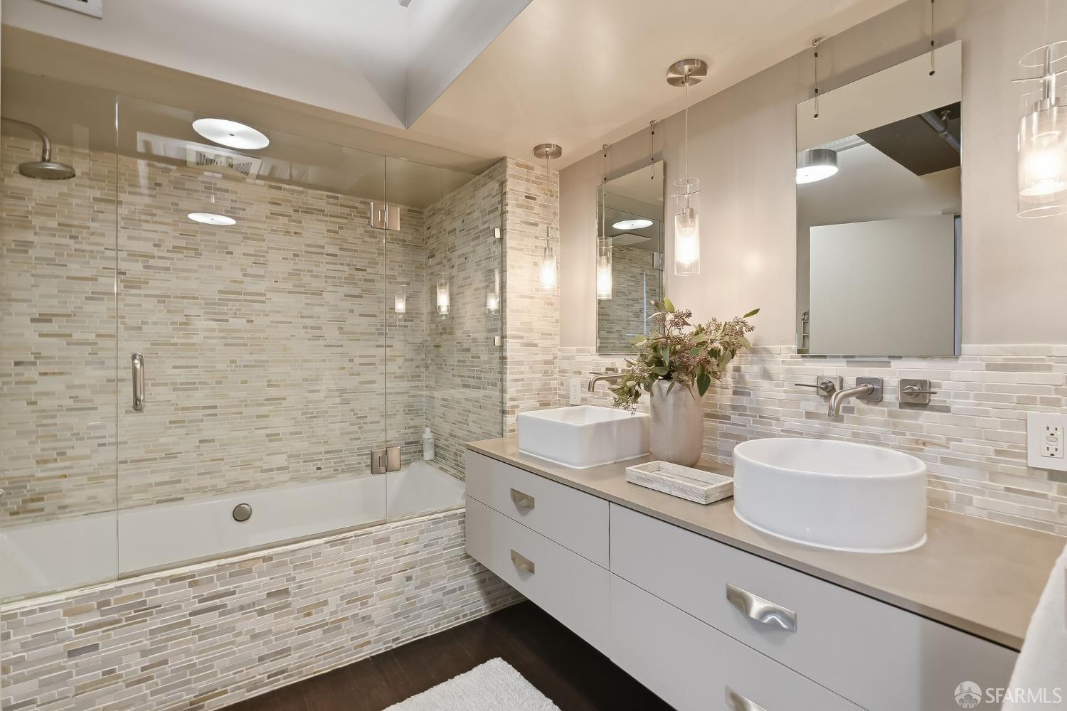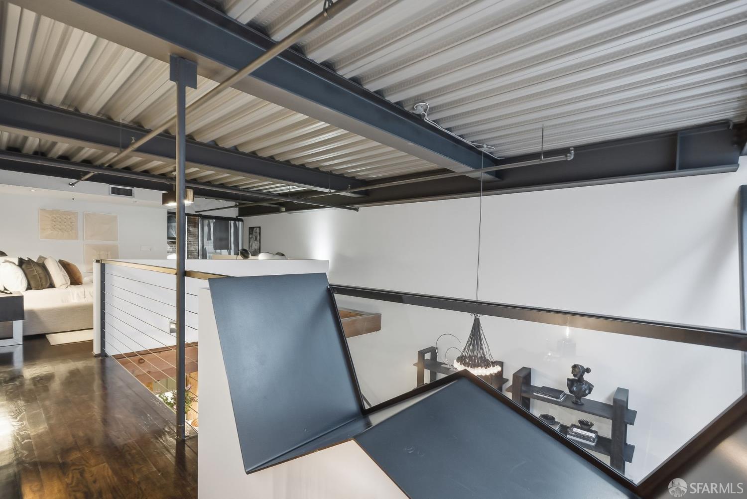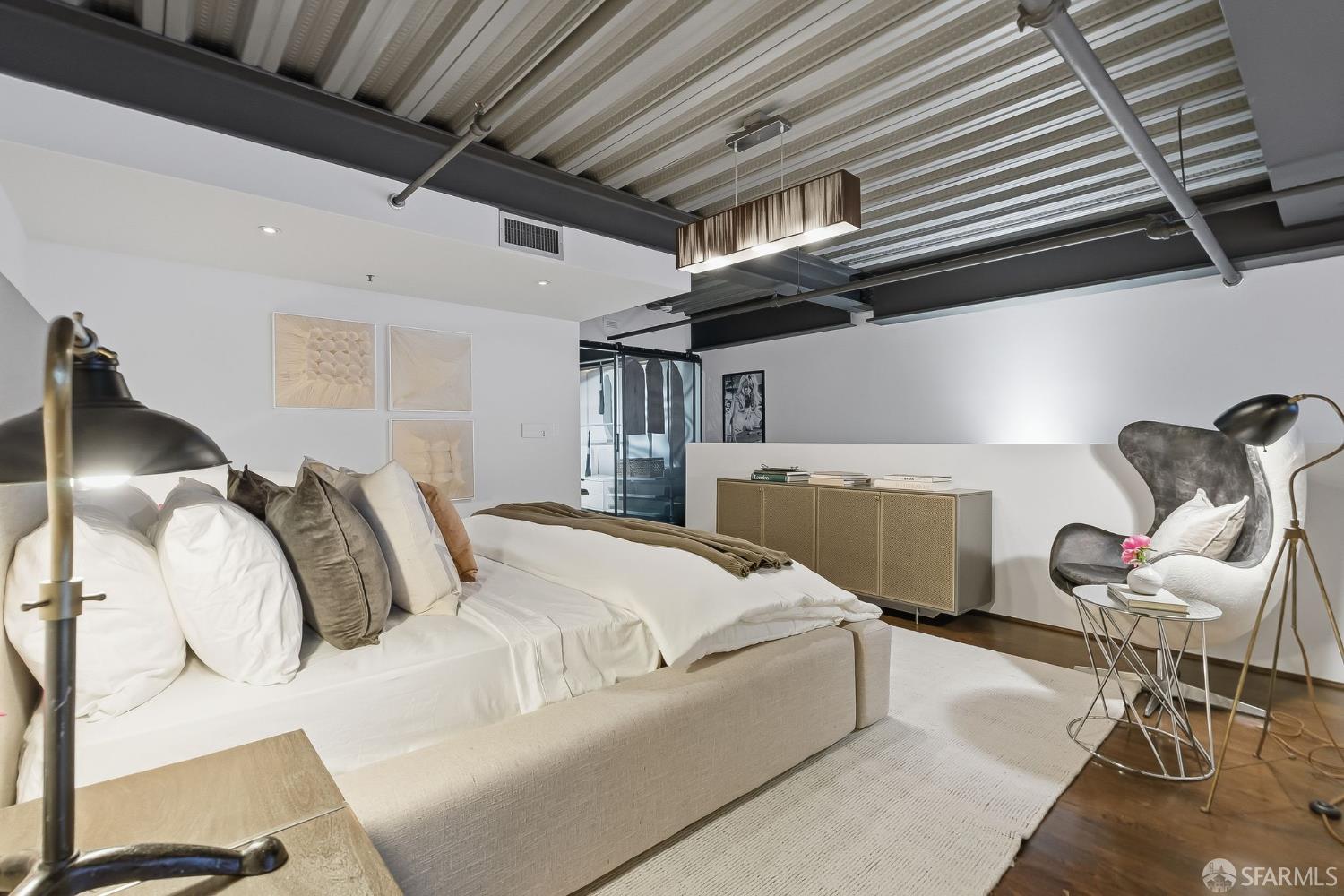 Residence #216 is a soaring 18ft double-height loft in the historic 1860s Oriental Warehouse. This voluminous space captures the intersection of San Francisco’s maritime history & modern industrial design. A massive wall of floor-to-ceiling glass illuminates timber beams, industrial steel accents, & walnut floors. The scale accommodates large-format art & sophisticated living, a footprint rarely found in South Beach. The 19th-century warehouse provides a rugged, refined backdrop for high-end finishes. The remodeled chef’s kitchen is a high-concept space built for utility & hosting. It features exposed concrete walls & heavy timber. A 9ft social island serves as the centerpiece, providing an expansive surface for culinary prep & dining. The pro-grade appliance suite includes a Viking 4-burner cooktop, matching built-in oven & microwave, & a 36-inch French door refrigerator. This unit includes a dedicated oversized pantry & in-unit laundry, providing rare hidden utility & high-capacity storage. A grand staircase leads to the primary mezzanine, where the spacious sleeping area easily fits a king-sized bed & remains connected to the home’s architectural volume. This level includes a versatile private library area which extends onto a signature steel-framed catwalk with dramatic vantage points over the living area. The primary suite features a meticulously organized walk-in closet with exposed brick & a dedicated linen closet. The stone-clad primary bath features a deep soaking tub, double sink vanity with premium hardware, & elegant stone tiling. The main-level suite offers significant scale as a second bedroom or executive office, distinguished by exposed brick walls. It is served by a dedicated wellness spa featuring a custom concrete steam shower with therapeutic massage valves & a built-in bench. This industrial-chic bathroom transforms daily routines into a high-end spa experience grounded by masonry. Outside, a private gated patio provides a tranquil urban oasis. Located in South Beach, the home is steps from tech shuttles, Caltrain, & the Ferry Building for dining & ferries to Marin. With rare side-by-side two-car parking, Residence #216 represents the pinnacle of waterfront luxury & urban convenience.