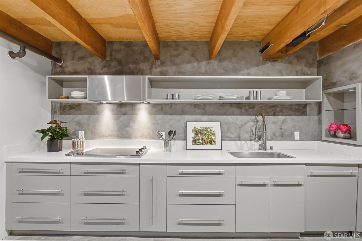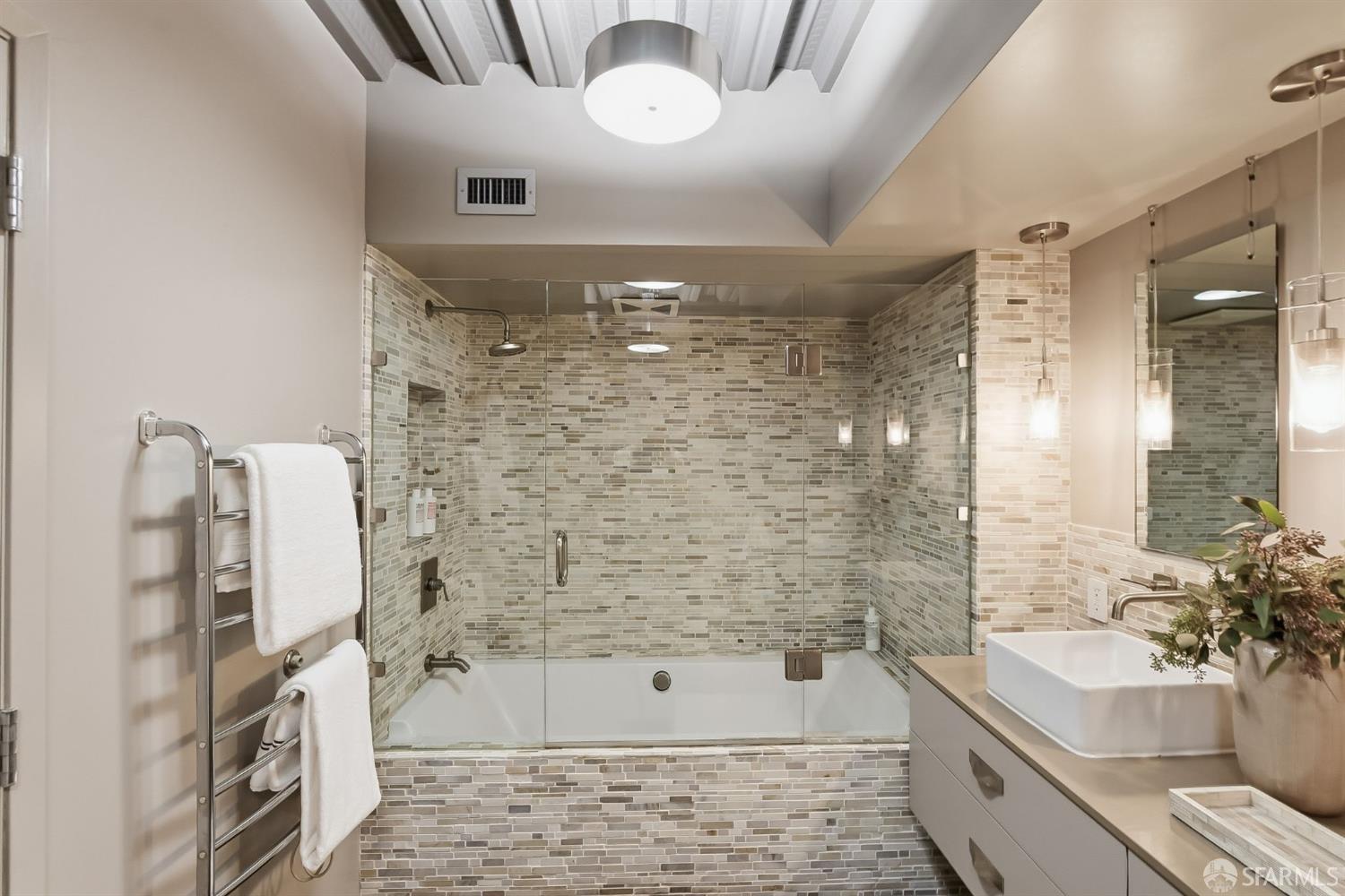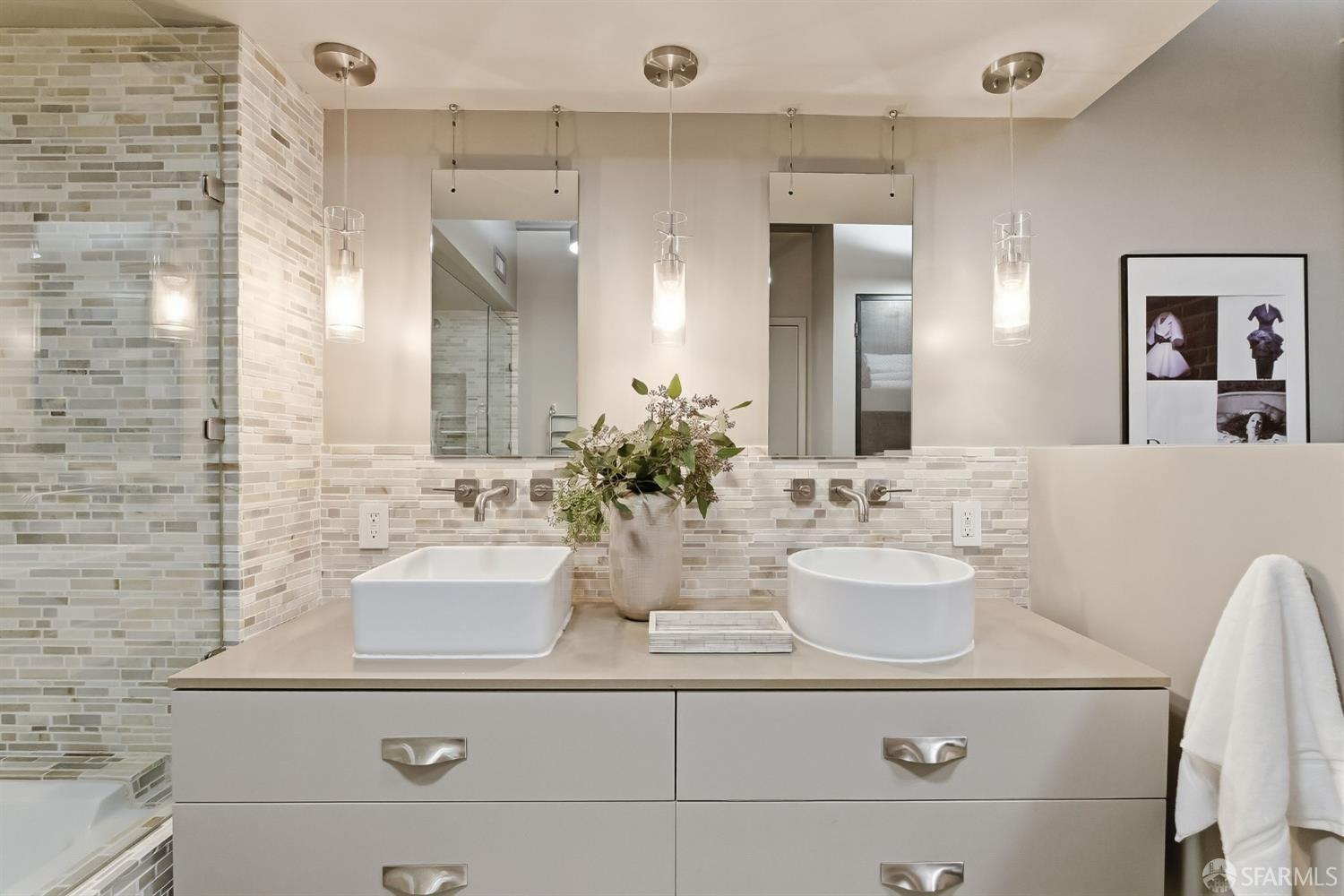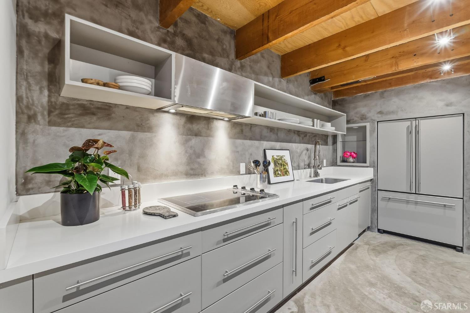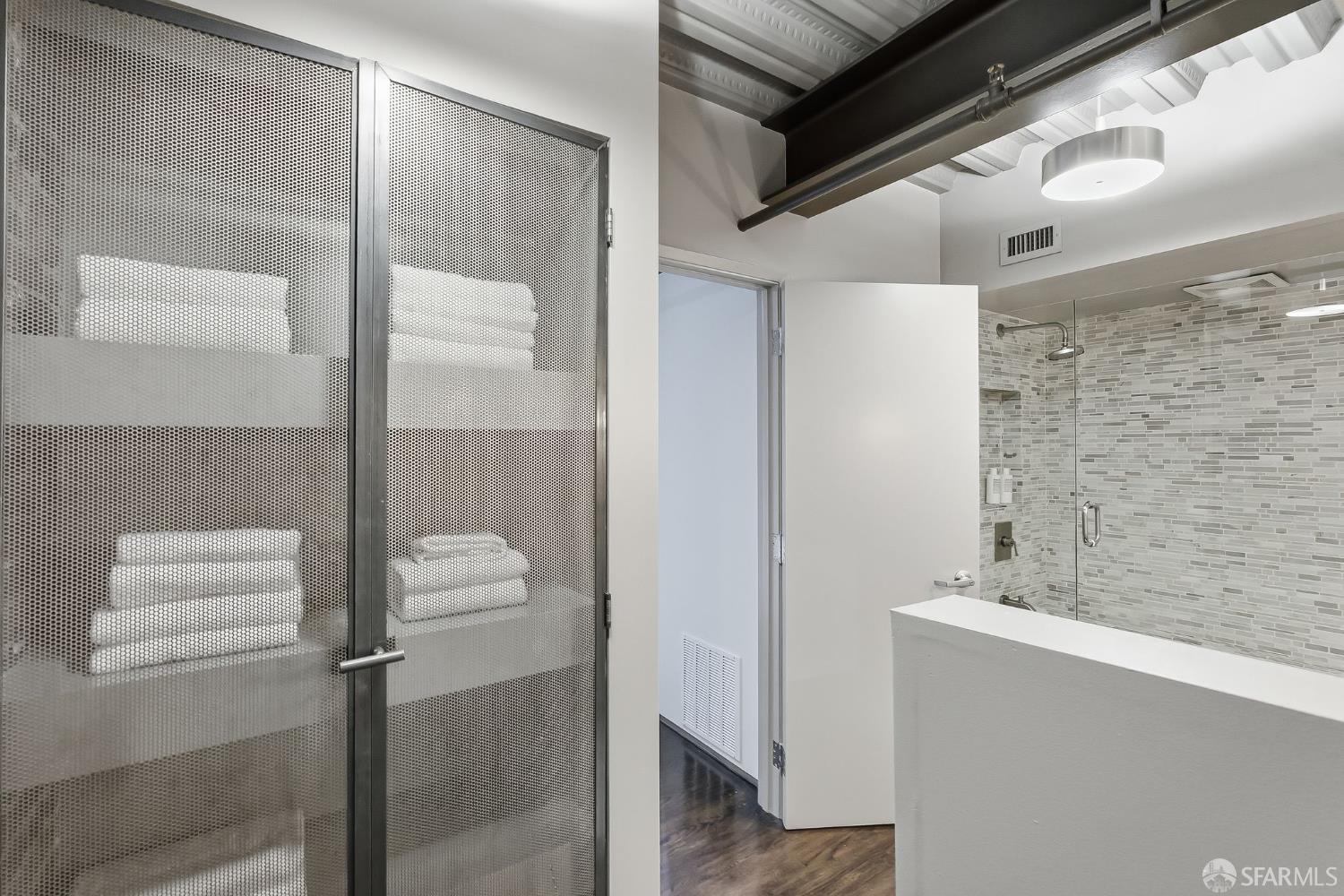 Residence #216 is a soaring 18ft double-height loft in the historic 1860s Oriental Warehouse. This voluminous space captures the intersection of San Francisco’s maritime history & modern industrial design. A massive wall of floor-to-ceiling glass illuminates timber beams, industrial steel accents, & walnut floors. The scale accommodates large-format art & sophisticated living, a footprint rarely found in South Beach. The 19th-century warehouse provides a rugged, refined backdrop for high-end finishes. The remodeled chef’s kitchen is a high-concept space built for utility & hosting. It features exposed concrete walls & heavy timber. A 9ft social island serves as the centerpiece, providing an expansive surface for culinary prep & dining. The pro-grade appliance suite includes a Viking 4-burner cooktop, matching built-in oven & microwave, & a 36-inch French door refrigerator. This unit includes a dedicated oversized pantry & in-unit laundry, providing rare hidden utility & high-capacity storage. A grand staircase leads to the primary mezzanine, where the spacious sleeping area easily fits a king-sized bed & remains connected to the home’s architectural volume. This level includes a versatile private library area which extends onto a signature steel-framed catwalk with dramatic vantage points over the living area. The primary suite features a meticulously organized walk-in closet with exposed brick & a dedicated linen closet. The stone-clad primary bath features a deep soaking tub, double sink vanity with premium hardware, & elegant stone tiling. The main-level suite offers significant scale as a second bedroom or executive office, distinguished by exposed brick walls. It is served by a dedicated wellness spa featuring a custom concrete steam shower with therapeutic massage valves & a built-in bench. This industrial-chic bathroom transforms daily routines into a high-end spa experience grounded by masonry. Outside, a private gated patio provides a tranquil urban oasis. Located in South Beach, the home is steps from tech shuttles, Caltrain, & the Ferry Building for dining & ferries to Marin. With rare side-by-side two-car parking, Residence #216 represents the pinnacle of waterfront luxury & urban convenience.