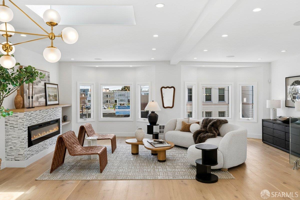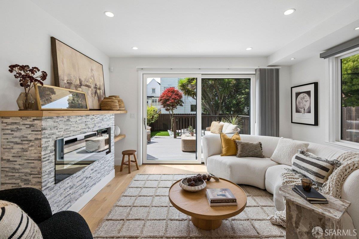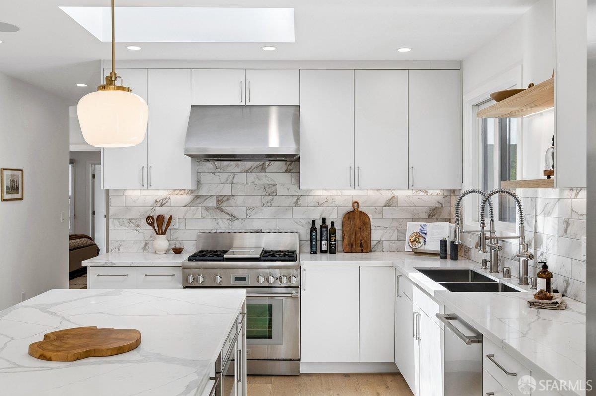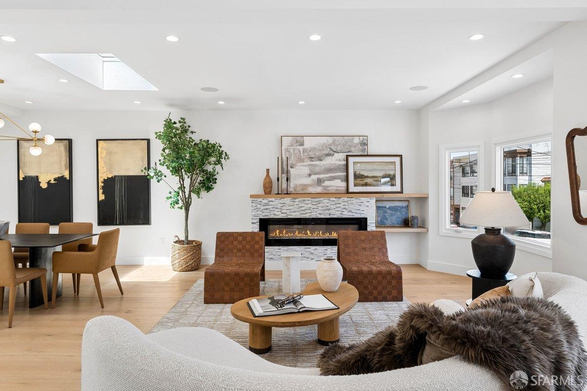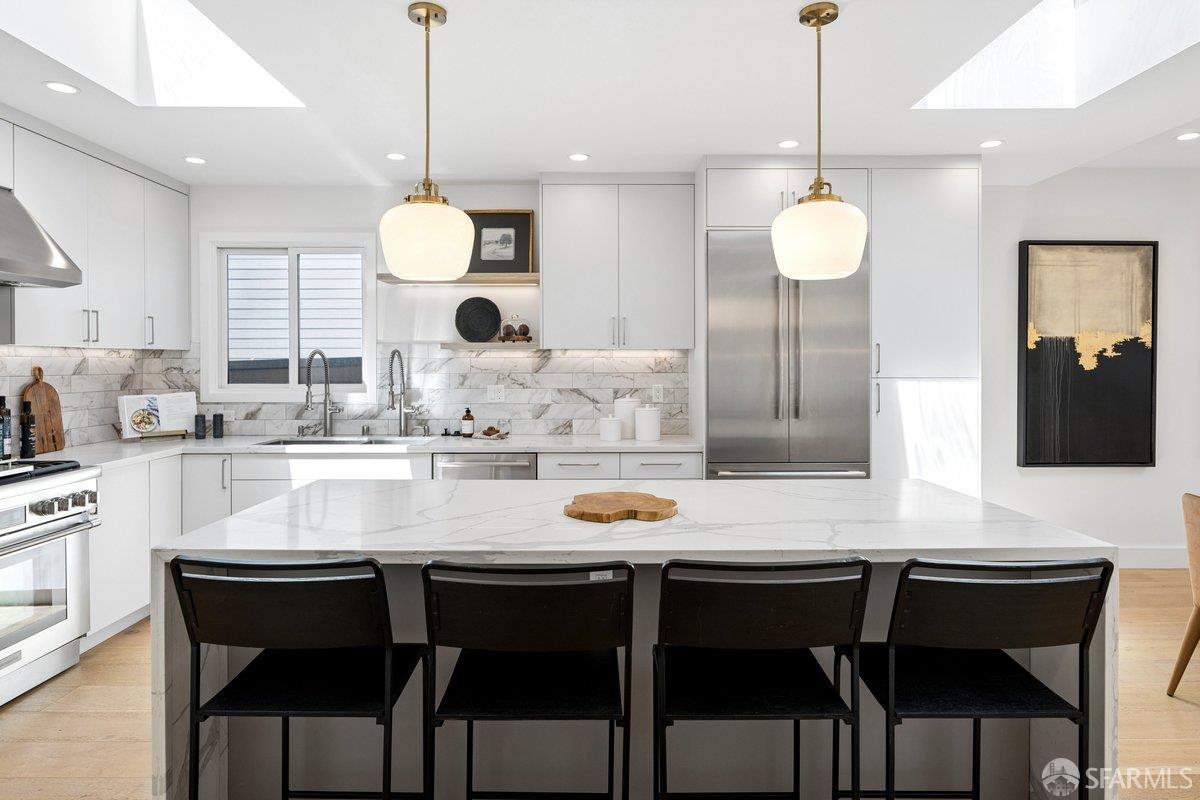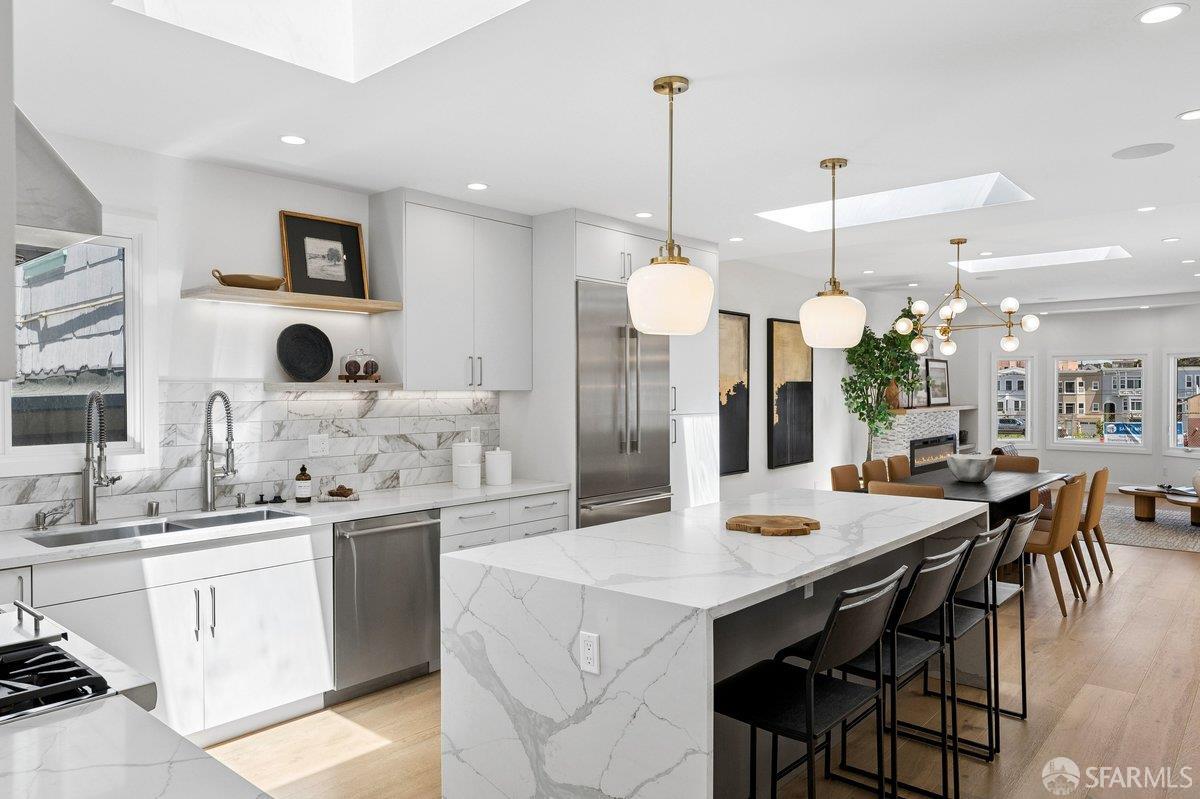 Scale, style, and remarkable convenience in San Francisco’s coveted Richmond District. This expansive single-family residence puts the city’s most desirable destinations at your doorstep: the renowned, authentic dining of Clement Street and Geary Boulevard, The Presidio, Golden Gate Park, Downtown, and the North Bay all within effortless reach. A comprehensive 2021 designer renovation delivers impeccable high-end finishes and fully updated systems, making this a true move-in showcase. The main level, bathed in natural light from 5 skylights above, features a gourmet chef’s kitchen with premium Thermador appliances, gas range, double sink, and center island, open to the sprawling dining and living areas framed by beautiful bay windows. Three bedrooms and three full baths complete the main level, including a primary suite with generous closet space and spa-like bath with double vanity and soaking tub. The lower level offers a dedicated office, fourth bedroom, two full baths, dedicated laundry, and a kitchenette with second living area that opens to the sun-drenched yard with walk-out deck and tasteful garden – ideal for entertaining. 2-car garage parking, room for storage, and EV charger outlet complete the home. This is a rare offering of great scale, quality, and convenience.