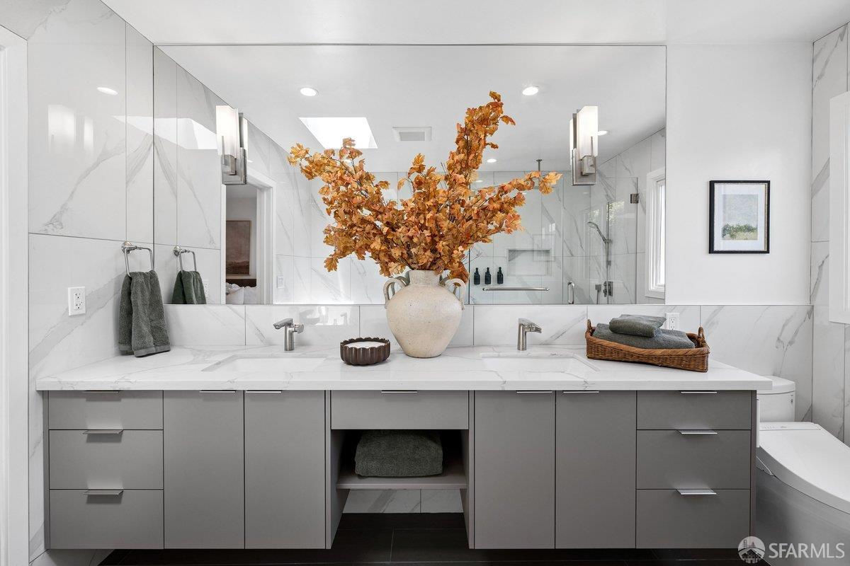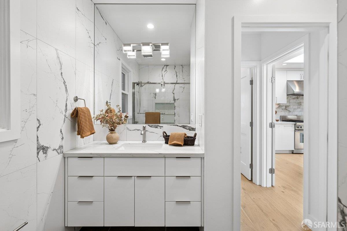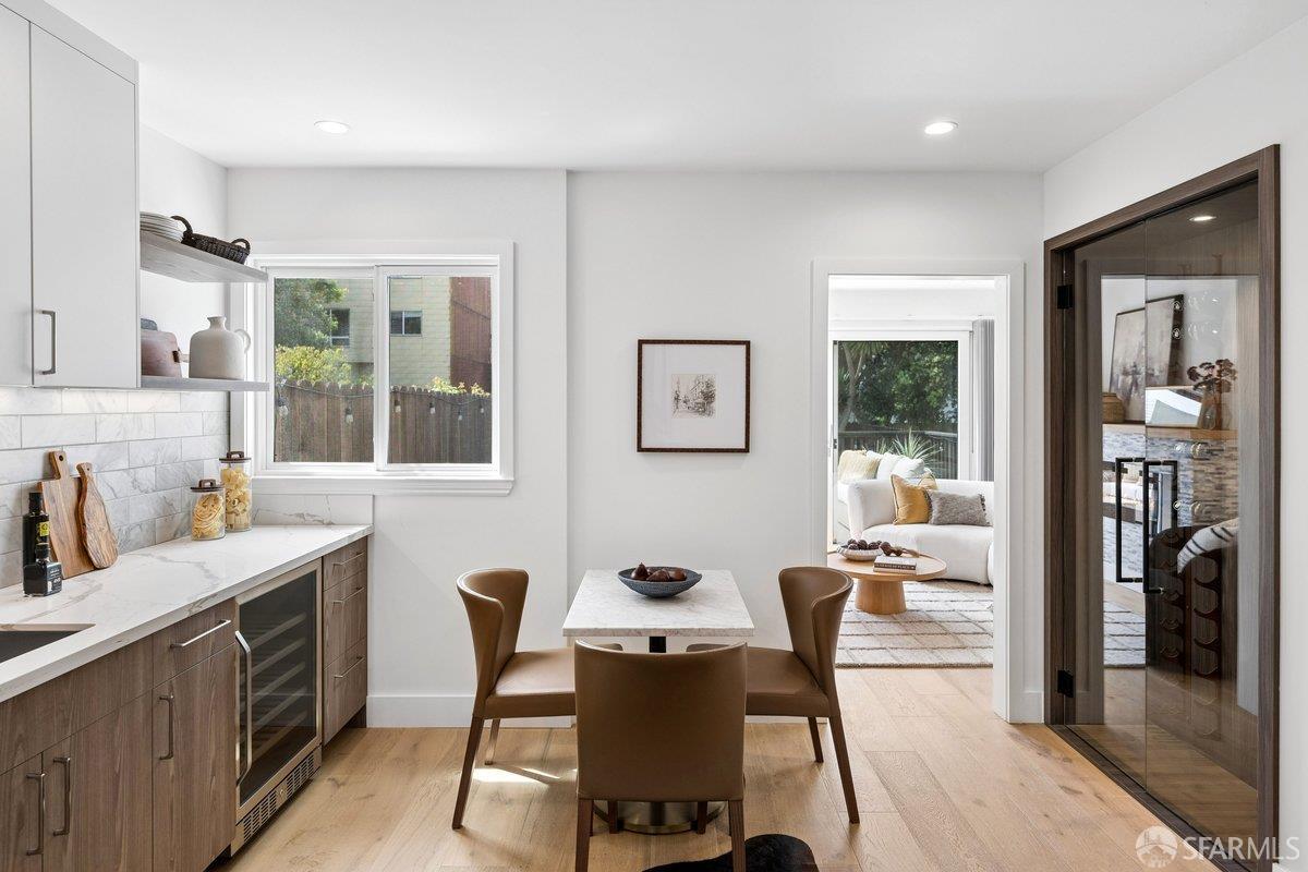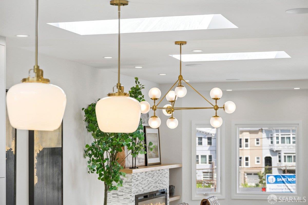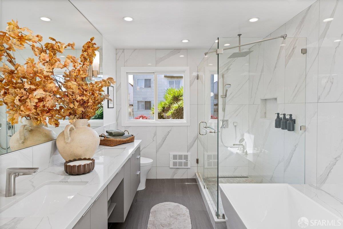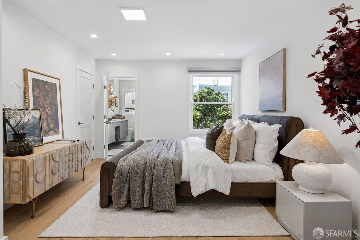 Scale, style, and remarkable convenience in San Francisco’s coveted Richmond District. This expansive single-family residence puts the city’s most desirable destinations at your doorstep: the renowned, authentic dining of Clement Street and Geary Boulevard, The Presidio, Golden Gate Park, Downtown, and the North Bay all within effortless reach. A comprehensive 2021 designer renovation delivers impeccable high-end finishes and fully updated systems, making this a true move-in showcase. The main level, bathed in natural light from 5 skylights above, features a gourmet chef’s kitchen with premium Thermador appliances, gas range, double sink, and center island, open to the sprawling dining and living areas framed by beautiful bay windows. Three bedrooms and three full baths complete the main level, including a primary suite with generous closet space and spa-like bath with double vanity and soaking tub. The lower level offers a dedicated office, fourth bedroom, two full baths, dedicated laundry, and a kitchenette with second living area that opens to the sun-drenched yard with walk-out deck and tasteful garden – ideal for entertaining. 2-car garage parking, room for storage, and EV charger outlet complete the home. This is a rare offering of great scale, quality, and convenience.