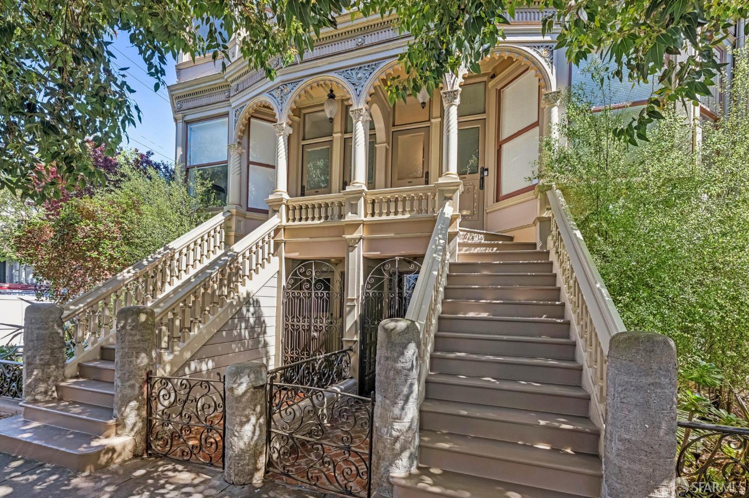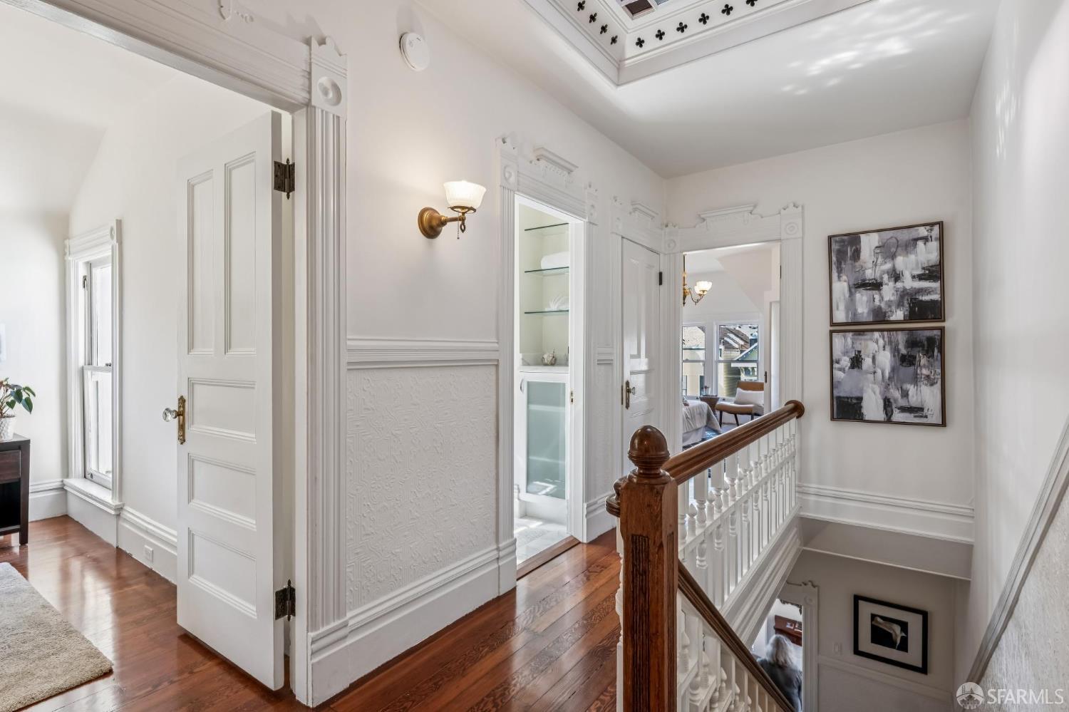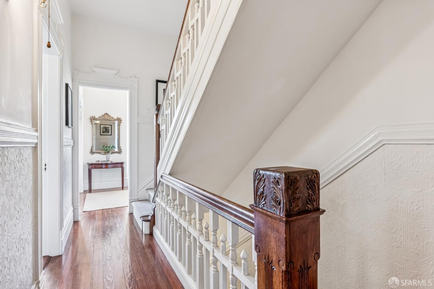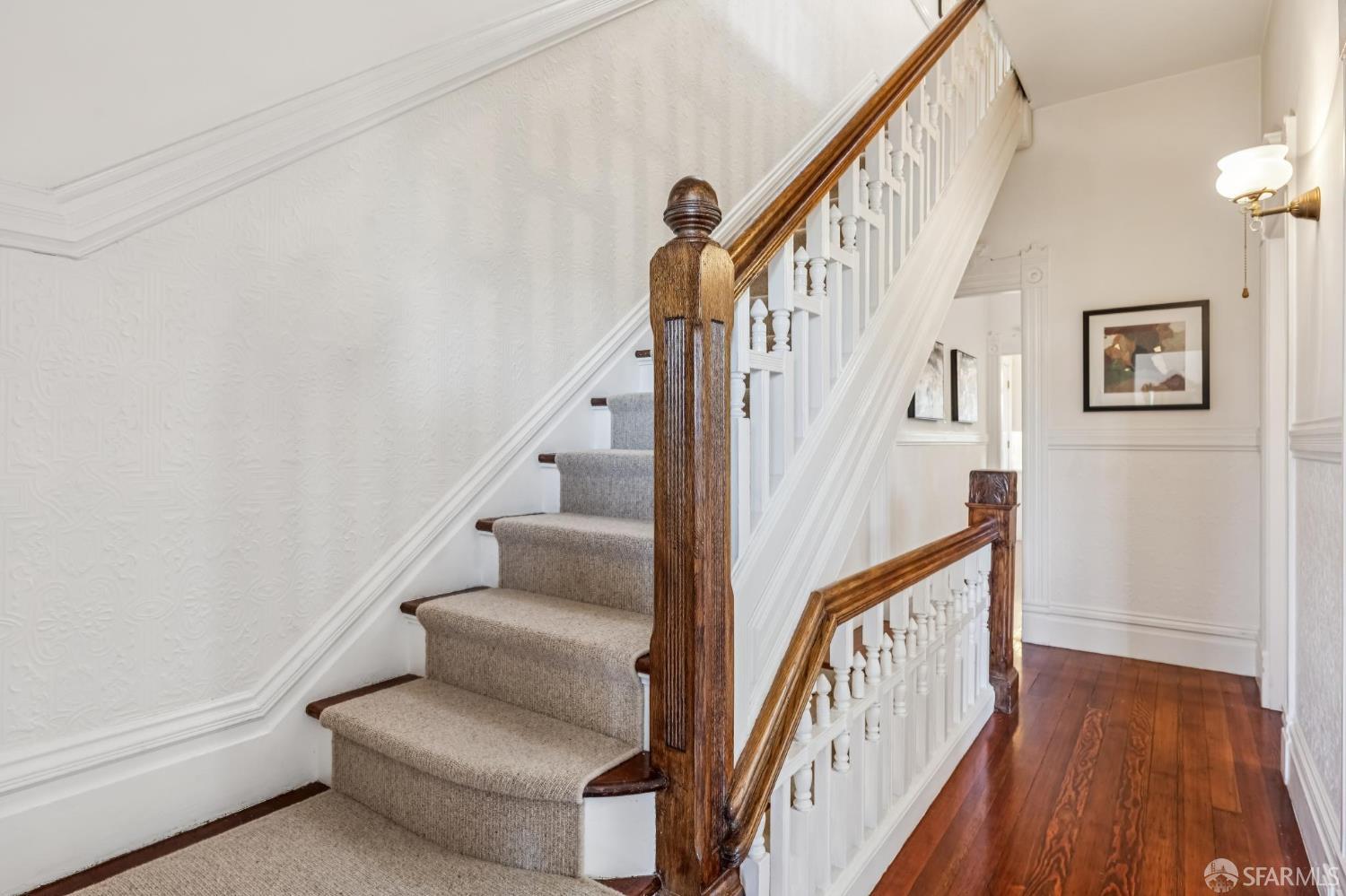 This unique, townhouse style home occupies the top two floors of a 4 unit building constructed in 1894 by Robert Dickie Cranston, a prominent builder in the Haight-Ashbury district at the time and was featured in the second edition of The Painted Ladies books. The home encompasses 1799 sq. ft. (per tax records) on two floors of living space, including 3 bedrooms and 2.5 baths. Enhanced by east and west light-filled exposures, dramatic Victorian era volumes, well-preserved period details and pristine softwood floors, the living spaces are well proportioned for daily living and for entertaining. The main living level features a gracious light-filled double parlor with gas FP, well-suited for entertaining. There is a half bath and generous FDR with second gas FP leading to the kitchen and breakfast area. The kitchen has been tastefully remodeled to complement the period architecture and has a laundry closet. A gracious stairway, graced by a beautifully restored Victorian era balustrade and colorful period skylight, provides the connection to the upper bedroom level which accommodates three bedrooms (one en-suite) and two beautifully remodeled full baths. There is a private deeded deck off the rear 3rd bedroom. The sellers currently have leased parking for this home across the street. Located on the corner of Cole and Page Street, the property is a walker’s paradise with easy access to a diversity of shops and restaurants in the Haight, Cole Valley and the exciting NOPA district. Easy access to the Panhandle, one block away, also makes this a wonderful place to enjoy world class museums and all of the other amenities of Golden Gate Park.