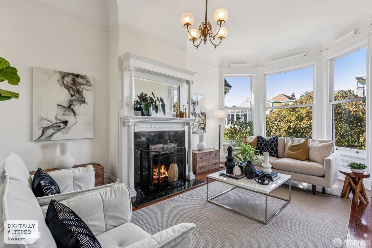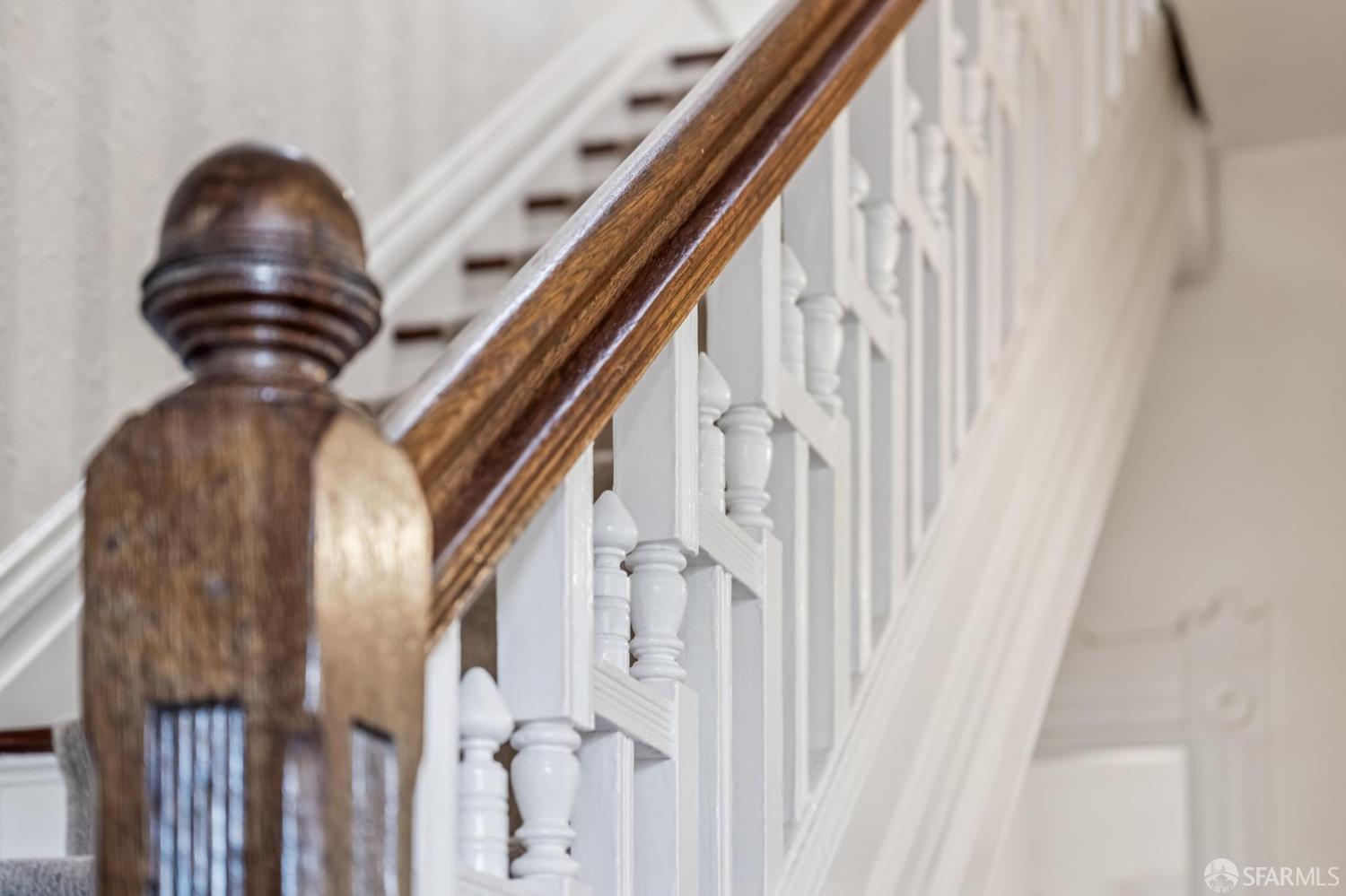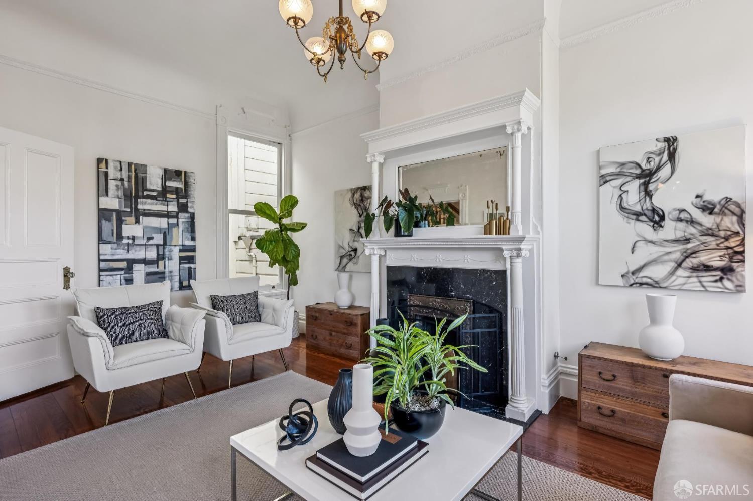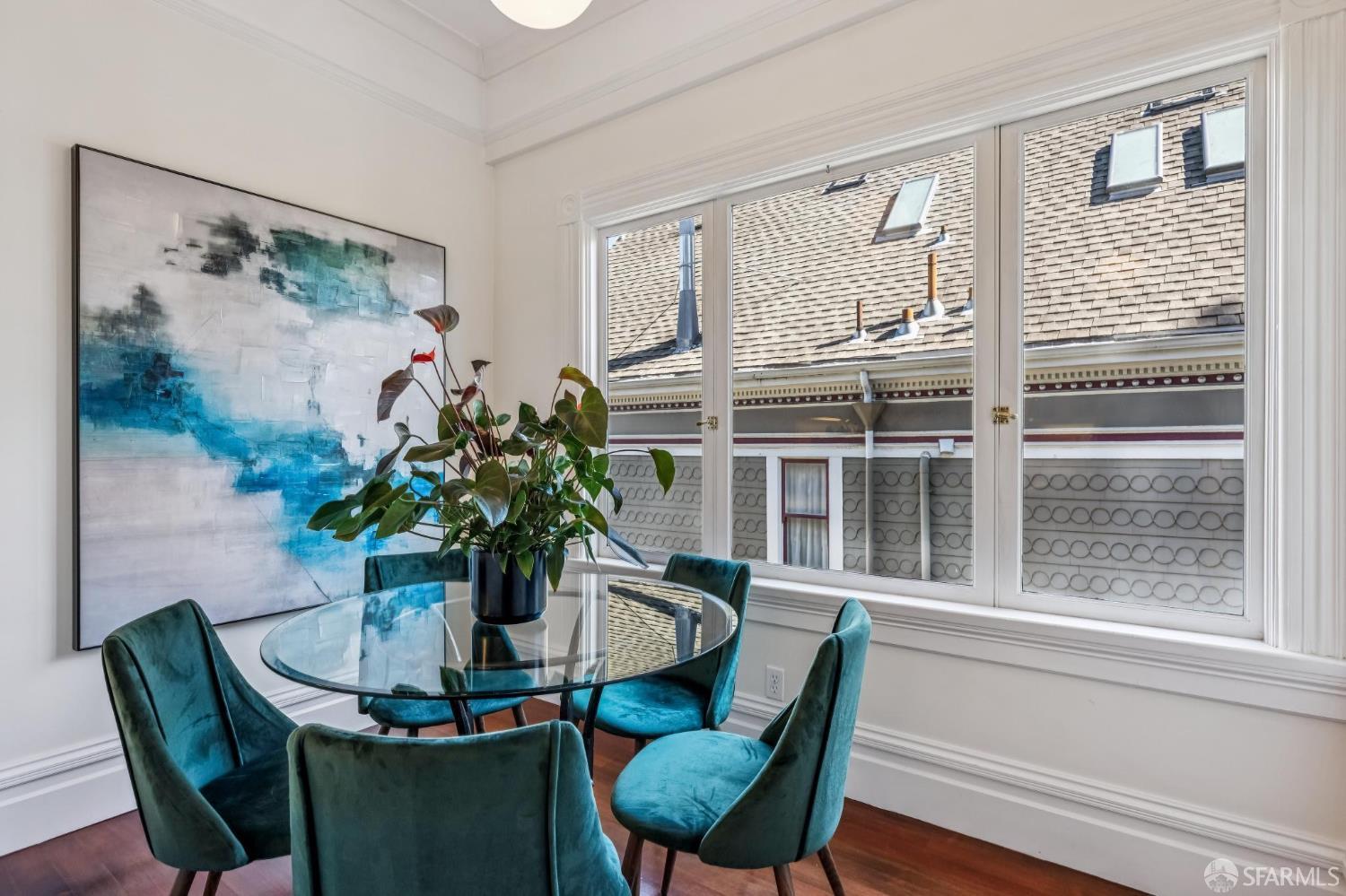 This unique, townhouse style home occupies the top two floors of a 4 unit building constructed in 1894 by Robert Dickie Cranston, a prominent builder in the Haight-Ashbury district at the time and was featured in the second edition of The Painted Ladies books. The home encompasses 1799 sq. ft. (per tax records) on two floors of living space, including 3 bedrooms and 2.5 baths. Enhanced by east and west light-filled exposures, dramatic Victorian era volumes, well-preserved period details and pristine softwood floors, the living spaces are well proportioned for daily living and for entertaining. The main living level features a gracious light-filled double parlor with gas FP, well-suited for entertaining. There is a half bath and generous FDR with second gas FP leading to the kitchen and breakfast area. The kitchen has been tastefully remodeled to complement the period architecture and has a laundry closet. A gracious stairway, graced by a beautifully restored Victorian era balustrade and colorful period skylight, provides the connection to the upper bedroom level which accommodates three bedrooms (one en-suite) and two beautifully remodeled full baths. There is a private deeded deck off the rear 3rd bedroom. The sellers currently have leased parking for this home across the street. Located on the corner of Cole and Page Street, the property is a walker’s paradise with easy access to a diversity of shops and restaurants in the Haight, Cole Valley and the exciting NOPA district. Easy access to the Panhandle, one block away, also makes this a wonderful place to enjoy world class museums and all of the other amenities of Golden Gate Park.