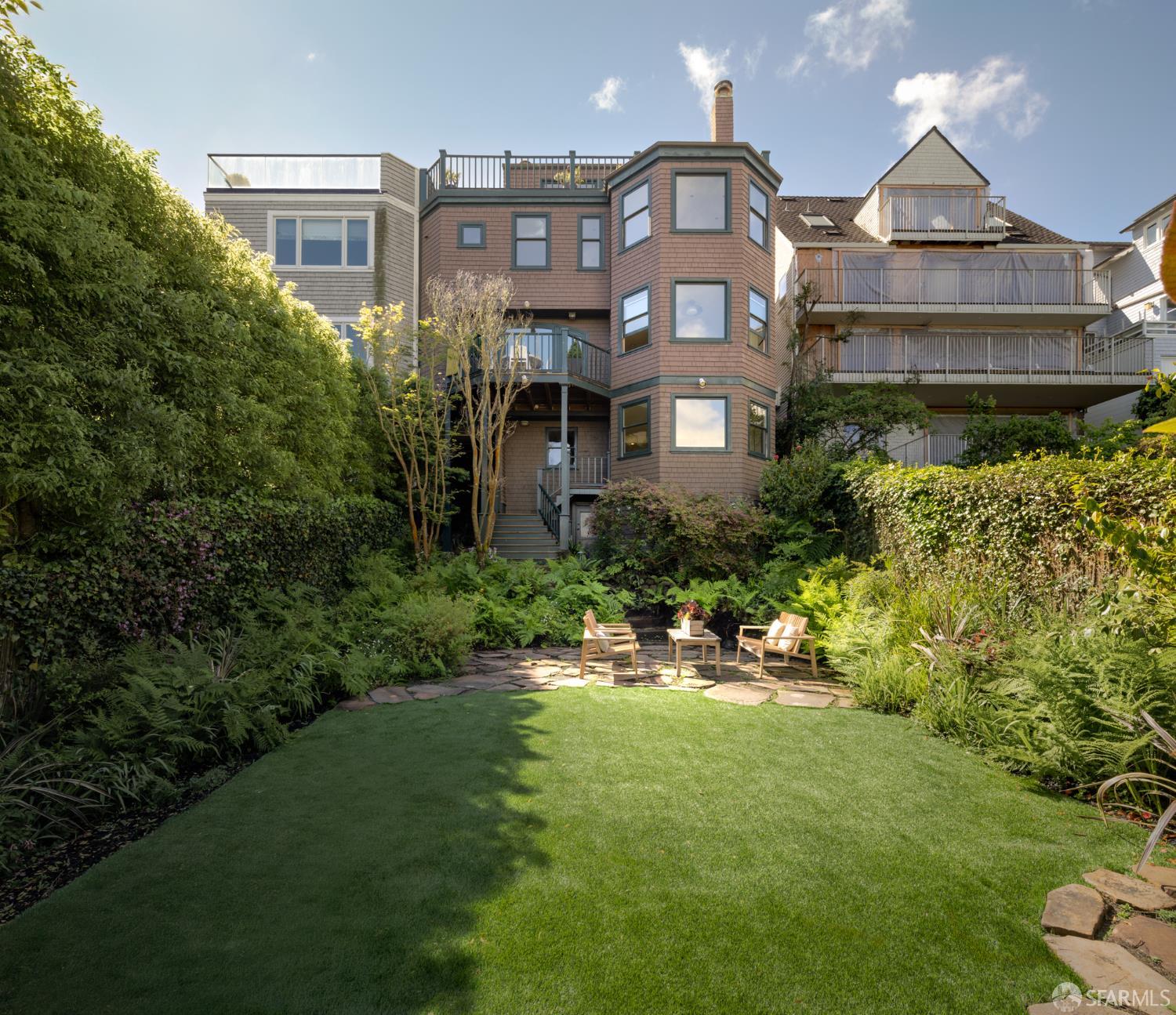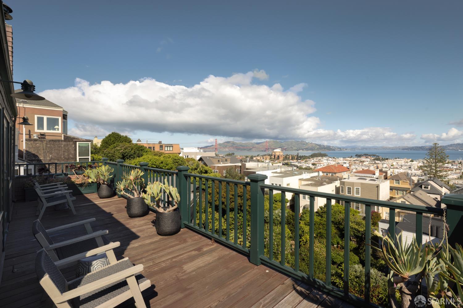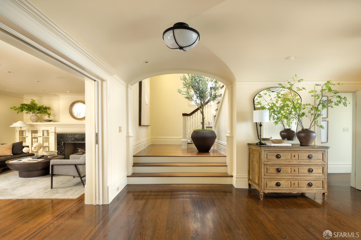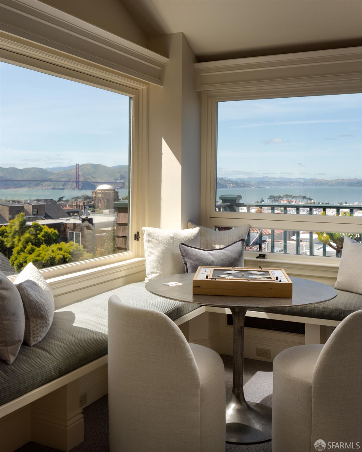 Ideally positioned on the prized north side of one of Cow Hollow’s premier blocks, 2512 Union Street is a classic San Francisco residence defined by timeless architecture and exceptional family living. Thoughtfully updated, the home offers a highly functional floor plan tailored to today’s lifestyle. The main level strikes a seamless balance between entertaining and everyday family living. Handsome millwork, coved ceilings, and custom cabinetry frame a series of well-proportioned rooms. At its center, a generous bay-view family room opens directly to the kitchen and breakfast area creating a warm, connected space for daily living. The robust kitchen is anchored by a large center island, custom cabinetry, a walk-in pantry, and professional-grade appliances. Off the entry, formal living and dining rooms are perfectly scaled for entertaining, with French doors opening to a private front courtyard. The second level presents an ideal family layout. An expansive primary suite captures iconic views of the Palace of Fine Arts and the Golden Gate Bridge, and includes built-ins, a wood-burning fireplace, a sitting area, a custom-fitted dressing room, and a spacious bath with dual sinks, soaking tub, and separate shower. Three additional bedrooms and two well-appointed baths complete the level, an uncommon and highly valuable configuration. The top floor is a natural extension of living space, anchored by a light-filled pentroom with cathedral ceilings and wall-to-wall windows framing sweeping views from the Golden Gate Bridge to Alcatraz. A view terrace opens directly off this space, while a private office, guest bedroom, and full bath complete a highly functional upper level well-suited for guests, work, or extended living. Below, the lower level is bright and inviting, offering a private guest or au pair suite, a flexible media or playroom, and direct access to a large, flat, north-facing garden with an expansive turf area. Timeless in character and thoughtfully executed, 2512 Union Street offers a rare combination of livability, light, and a floor plan that works effortlesslyset on one of Cow Hollow’s most desirable blocks.