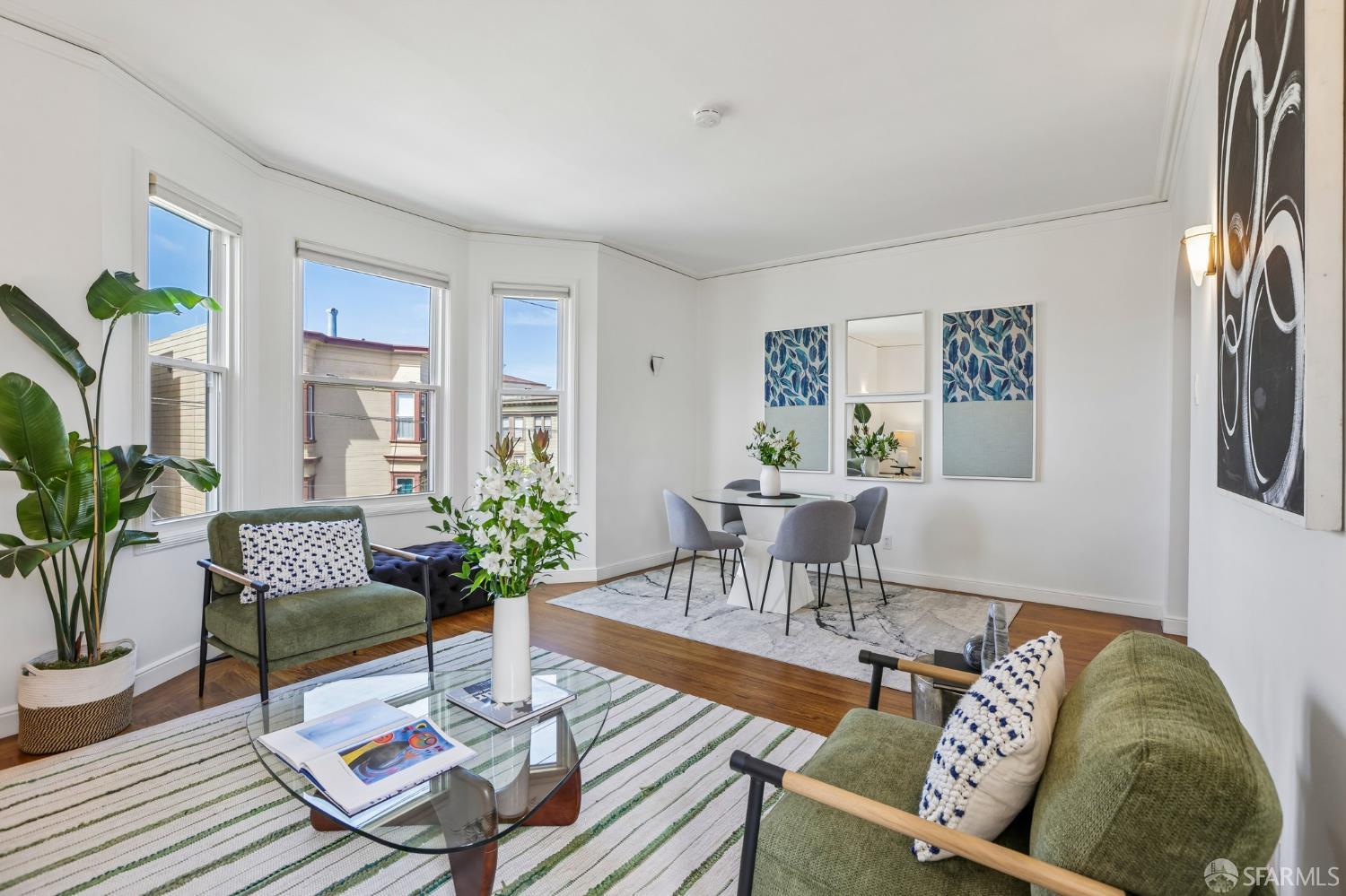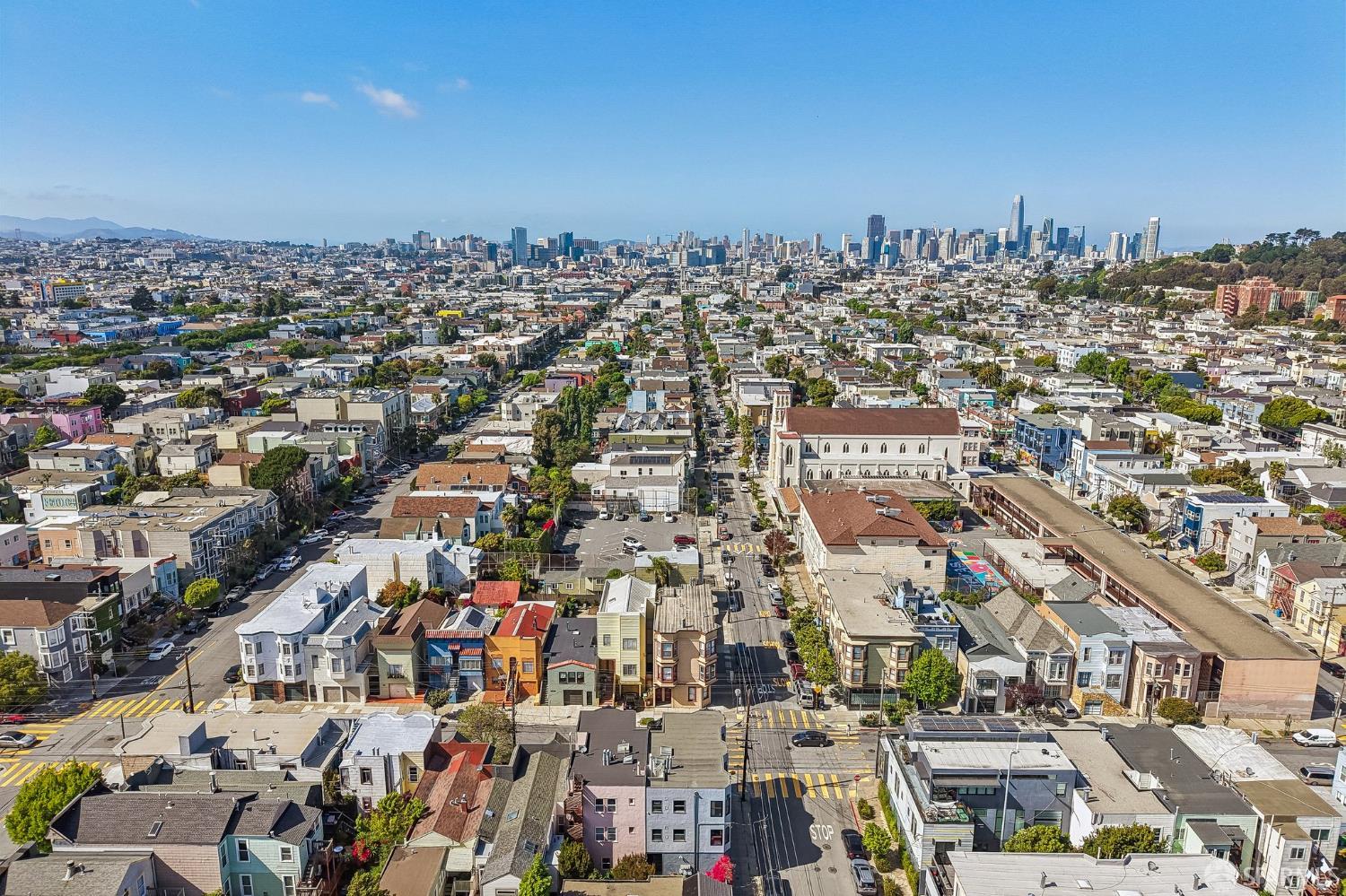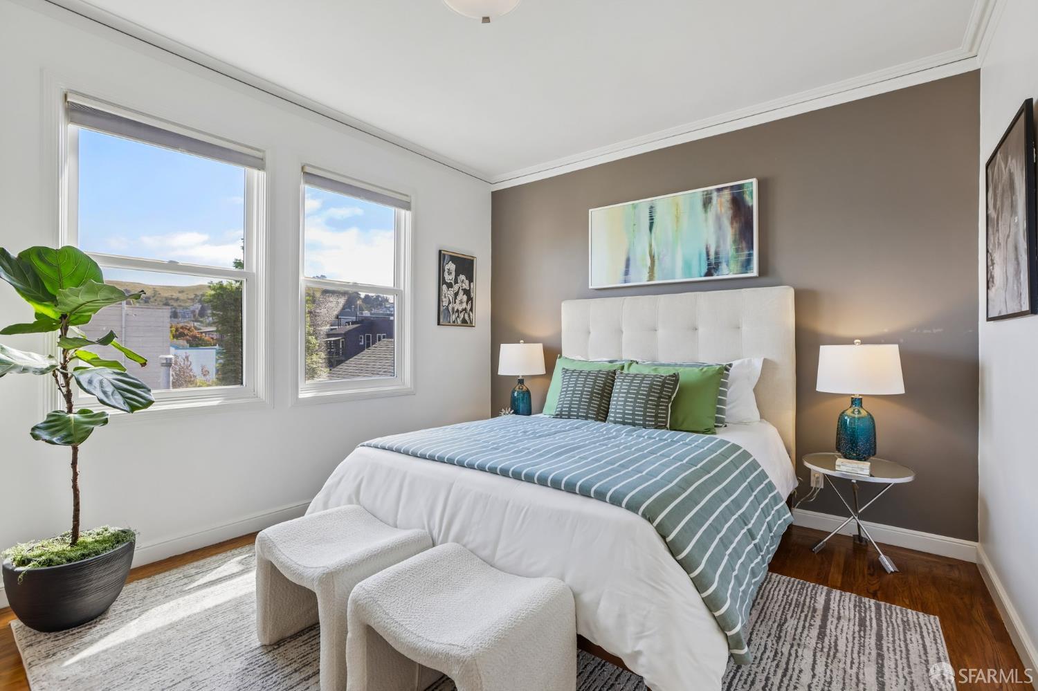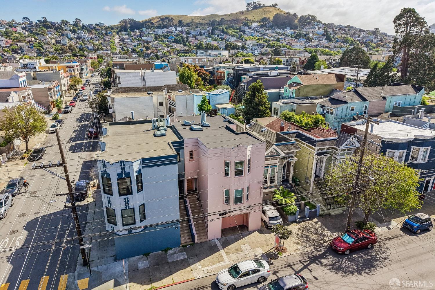 Perched atop a classic Art Deco building in the heart of the Mission, this beautifully updated top-floor 2BD/1BA condo blends timeless character with modern comfort in one of San Francisco’s most vibrant neighborhoods. Just moments from beloved cafes, acclaimed restaurants, parks, murals, and the cultural touchstones that define the Mission, the location is as dynamic as the home itself. Very close to Garfield Square Park with its recently renovated public pool and Precita Park with an excellent children’s playground. The location also offers easy access to freeways both north and south, as well as convenient public transportation including BART. Natural light pours in from every direction, enhanced by three skylights and windows on multiple exposures. Framed views of Sutro Tower and Bernal Hill create a stunning backdrop to daily life. A spacious landing with an oversized hallway closet welcomes you at the top of the stairs and opens to a generous living room featuring light on two sides, elegant bay windows, and inviting scale. Gorgeous period details including graceful arches, charming nooks, and classic Art Deco lines add warmth and personality throughout. The remodeled kitchen and bath pair clean, modern finishes with the home’s original style, creating a seamless blend of old and new. The sun-filled south-facing primary bedroom enjoys beautiful natural light and views toward Bernal Hill, while the second bedroom offers flexibility as a guest room, nursery, or home office. Part of a charming two-unit HOA, this residence offers the rare combination of low monthly dues and exceptional amenities. Enjoy a shared south-facing backyard, an oversized tandem parking space in the two-car garage, and substantial additional storage. A special Mission home filled with light, character, and convenience, this is city living at its best.