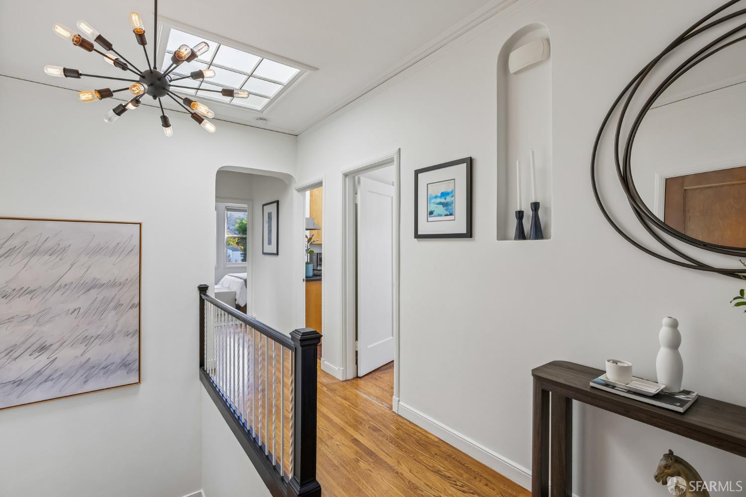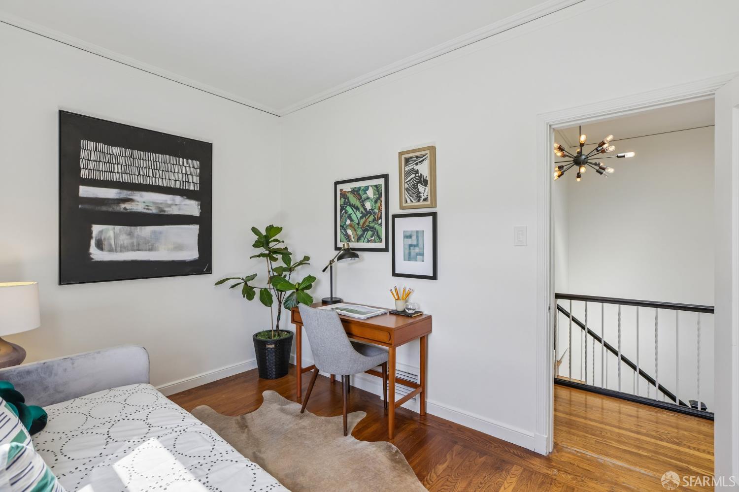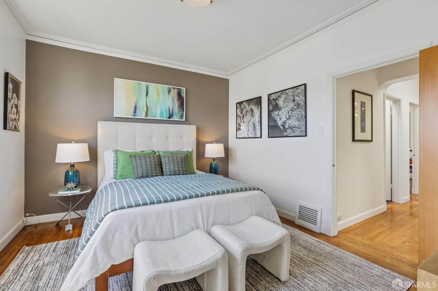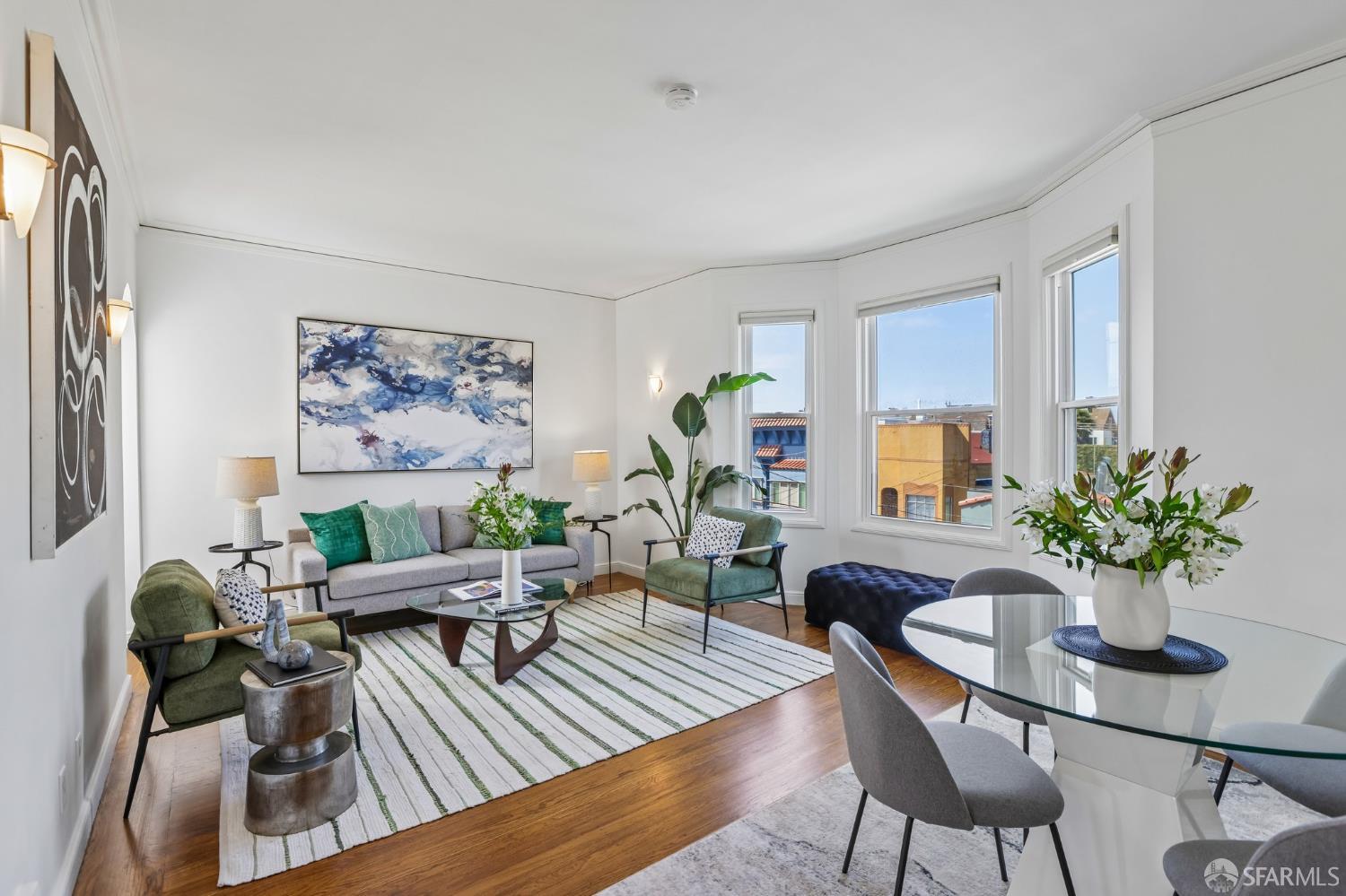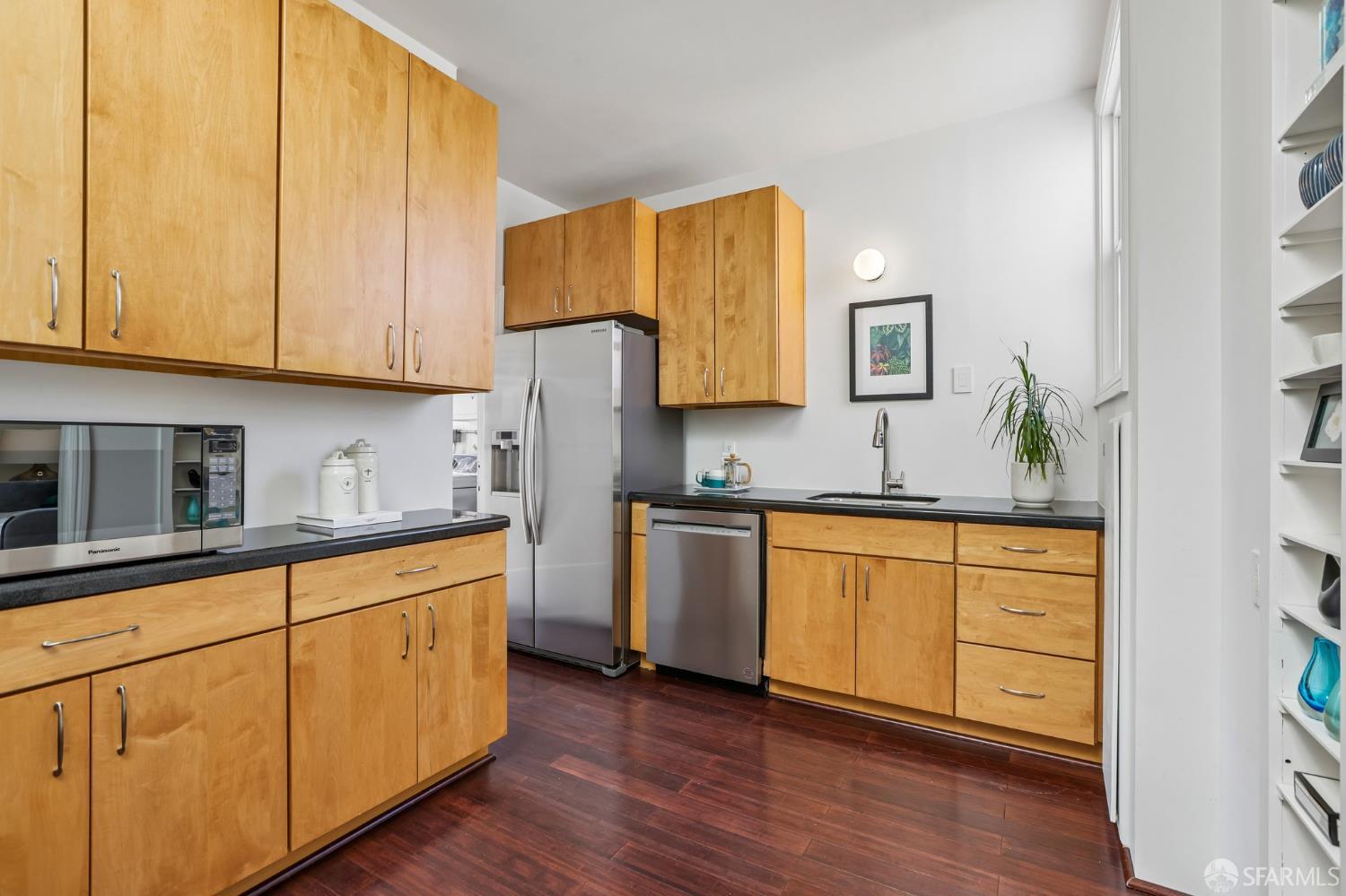 Perched atop a classic Art Deco building in the heart of the Mission, this beautifully updated top-floor 2BD/1BA condo blends timeless character with modern comfort in one of San Francisco’s most vibrant neighborhoods. Just moments from beloved cafes, acclaimed restaurants, parks, murals, and the cultural touchstones that define the Mission, the location is as dynamic as the home itself. Very close to Garfield Square Park with its recently renovated public pool and Precita Park with an excellent children’s playground. The location also offers easy access to freeways both north and south, as well as convenient public transportation including BART. Natural light pours in from every direction, enhanced by three skylights and windows on multiple exposures. Framed views of Sutro Tower and Bernal Hill create a stunning backdrop to daily life. A spacious landing with an oversized hallway closet welcomes you at the top of the stairs and opens to a generous living room featuring light on two sides, elegant bay windows, and inviting scale. Gorgeous period details including graceful arches, charming nooks, and classic Art Deco lines add warmth and personality throughout. The remodeled kitchen and bath pair clean, modern finishes with the home’s original style, creating a seamless blend of old and new. The sun-filled south-facing primary bedroom enjoys beautiful natural light and views toward Bernal Hill, while the second bedroom offers flexibility as a guest room, nursery, or home office. Part of a charming two-unit HOA, this residence offers the rare combination of low monthly dues and exceptional amenities. Enjoy a shared south-facing backyard, an oversized tandem parking space in the two-car garage, and substantial additional storage. A special Mission home filled with light, character, and convenience, this is city living at its best.