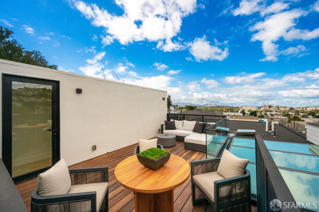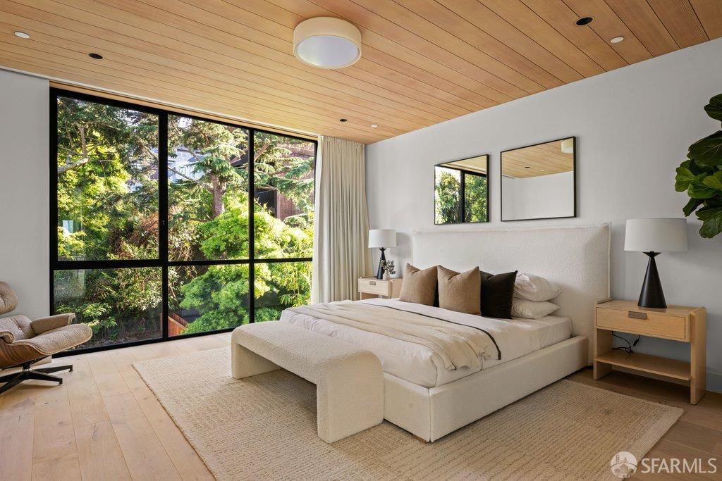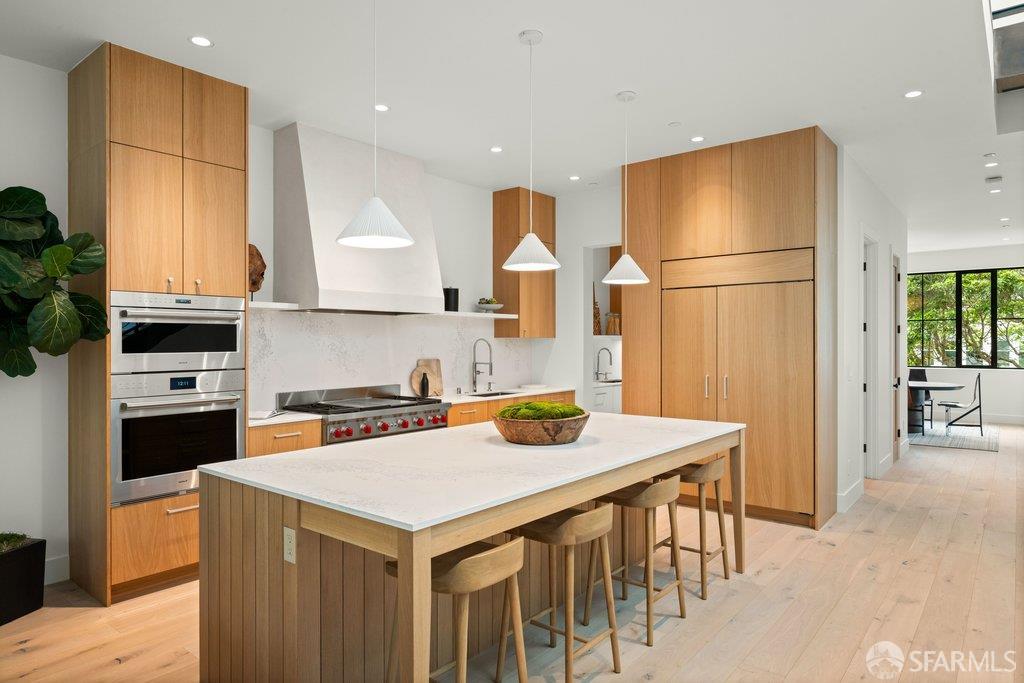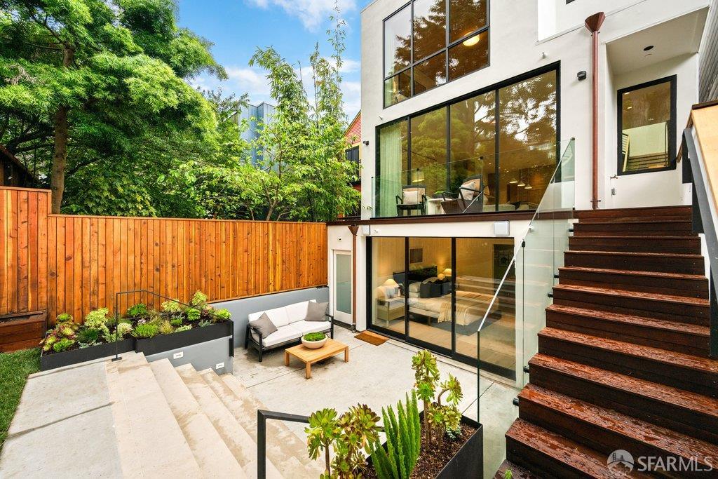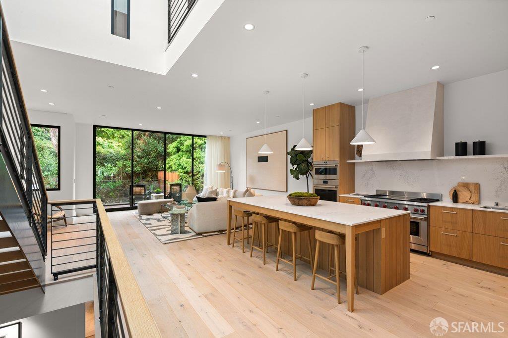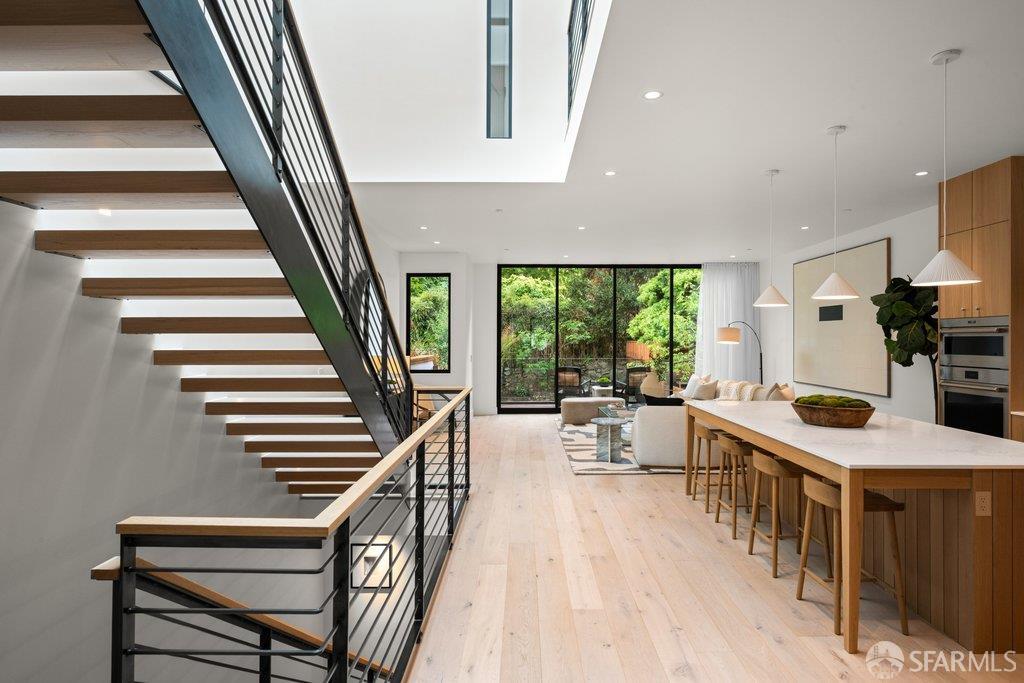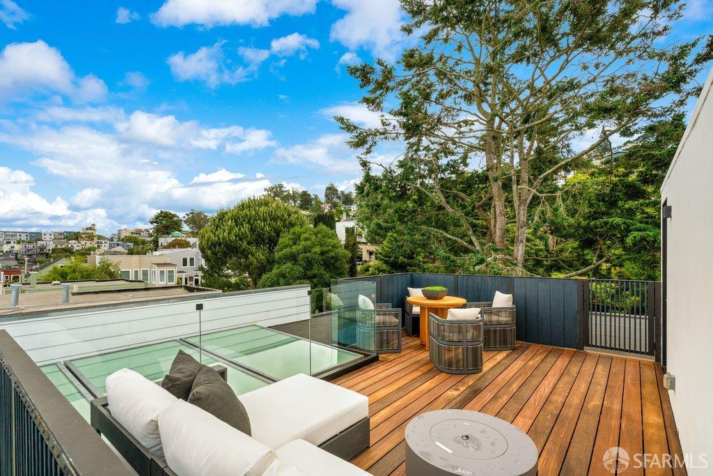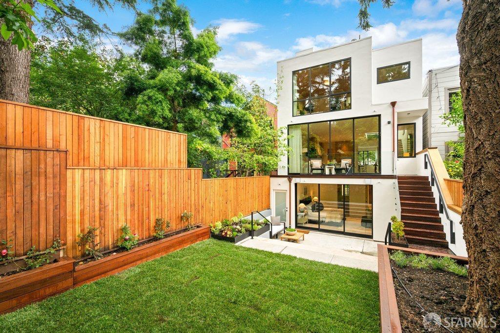 A Striking Nearly New Single Family Residence, gorgeously rebuilt by the current owner, under the creative eye of McElroy Architecture. The home features all of the elements of luxurious urban living: beautiful open concept floor plan with exceptional volume, custom floor to ceiling retractable door system with brilliant natural light, exquisite fit and finish throughout, and phenomenal indoor/outdoor components including a panoramic view roof deck, and an intimate connection to the lush, verdant garden. Sophisticated, organic warmth comes through in every space of this newly rebuilt residence, driven by a refined palette of Henrybuilt rift-sawn white oak cabinetry and European oak floors. The welcoming tone is balanced by a crisp architectural aesthetic that feels sleek and modern with ceiling heights reaching 11 feet. Finishes have been thoughtfully curated throughout, including herringbone-patterned marble floors in the baths, and a custom, floating center stairway under an over-sized skylight, and handsome natural wood ceiling accents in the primary bedroom and entry. The layout offers both flexibility and scale with four bedrooms, a dedicated office, and expansive living spaces suited to both daily living and entertaining. A striking kitchen anchors the main level, complemented by a dining room with built-in wine bar and a ground-level wine cellar. The retractable Fleetwood glass door system opens wide to a generous deck with stairs leading to the rear garden, where a vintage stone wall adds a sense of history and character. The new owner will love the upper bedroom level, highlighted by a luxurious primary suite with spacious walk in closet, two bedrooms down the hall that share a hall bath, an office with desk built-in, and a fourth bedroom with en suite bath that is privately positioned on the ground level. A rooftop deck sits above with views that extend beyond the neighborhood to St. Ignatius Cathedral, Angel Island, and the Downtown San Francisco Skyline. Just moments from the museums and gardens of Golden Gate Park, and the cafes/shopping on Cole Street, this home offers a compelling combination of state of the art design, excessive comfort, and central convenient location.
