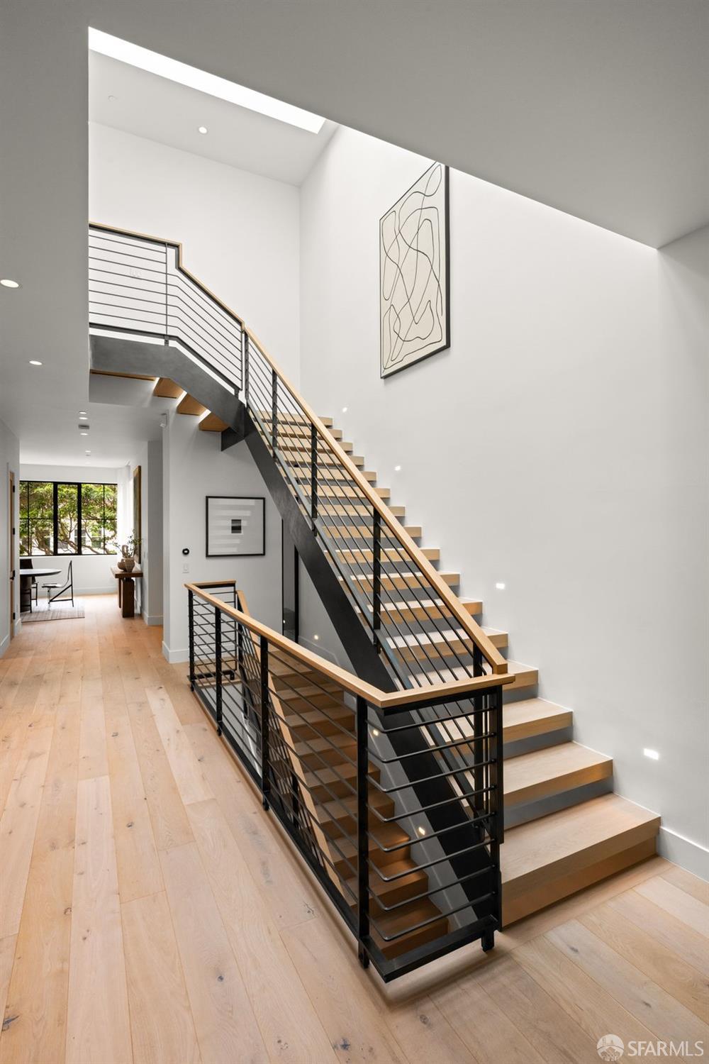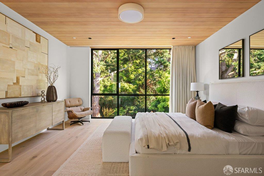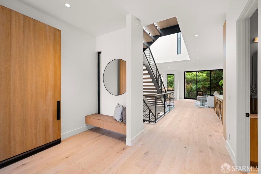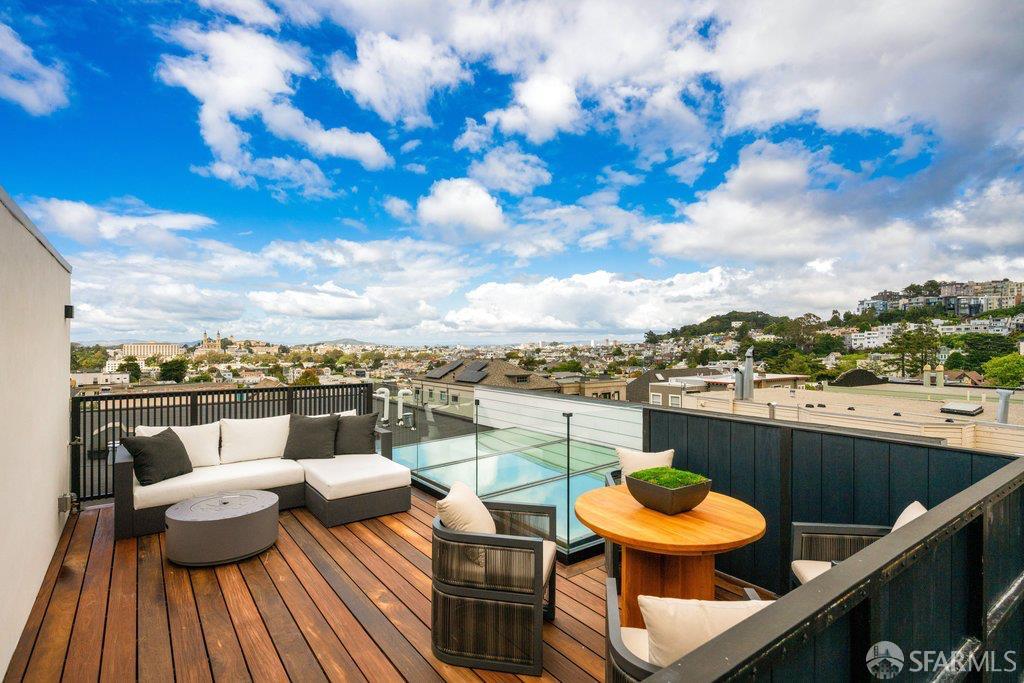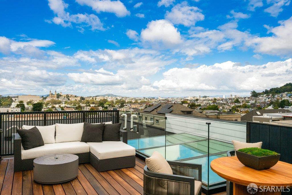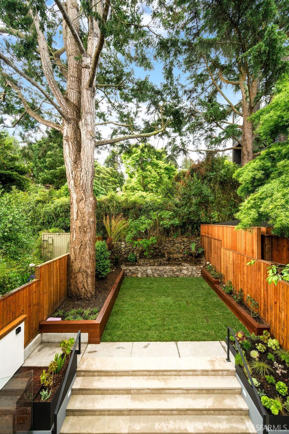 A Striking Nearly New Single Family Residence, gorgeously rebuilt by the current owner, under the creative eye of McElroy Architecture. The home features all of the elements of luxurious urban living: beautiful open concept floor plan with exceptional volume, custom floor to ceiling retractable door system with brilliant natural light, exquisite fit and finish throughout, and phenomenal indoor/outdoor components including a panoramic view roof deck, and an intimate connection to the lush, verdant garden. Sophisticated, organic warmth comes through in every space of this newly rebuilt residence, driven by a refined palette of Henrybuilt rift-sawn white oak cabinetry and European oak floors. The welcoming tone is balanced by a crisp architectural aesthetic that feels sleek and modern with ceiling heights reaching 11 feet. Finishes have been thoughtfully curated throughout, including herringbone-patterned marble floors in the baths, and a custom, floating center stairway under an over-sized skylight, and handsome natural wood ceiling accents in the primary bedroom and entry. The layout offers both flexibility and scale with four bedrooms, a dedicated office, and expansive living spaces suited to both daily living and entertaining. A striking kitchen anchors the main level, complemented by a dining room with built-in wine bar and a ground-level wine cellar. The retractable Fleetwood glass door system opens wide to a generous deck with stairs leading to the rear garden, where a vintage stone wall adds a sense of history and character. The new owner will love the upper bedroom level, highlighted by a luxurious primary suite with spacious walk in closet, two bedrooms down the hall that share a hall bath, an office with desk built-in, and a fourth bedroom with en suite bath that is privately positioned on the ground level. A rooftop deck sits above with views that extend beyond the neighborhood to St. Ignatius Cathedral, Angel Island, and the Downtown San Francisco Skyline. Just moments from the museums and gardens of Golden Gate Park, and the cafes/shopping on Cole Street, this home offers a compelling combination of state of the art design, excessive comfort, and central convenient location.