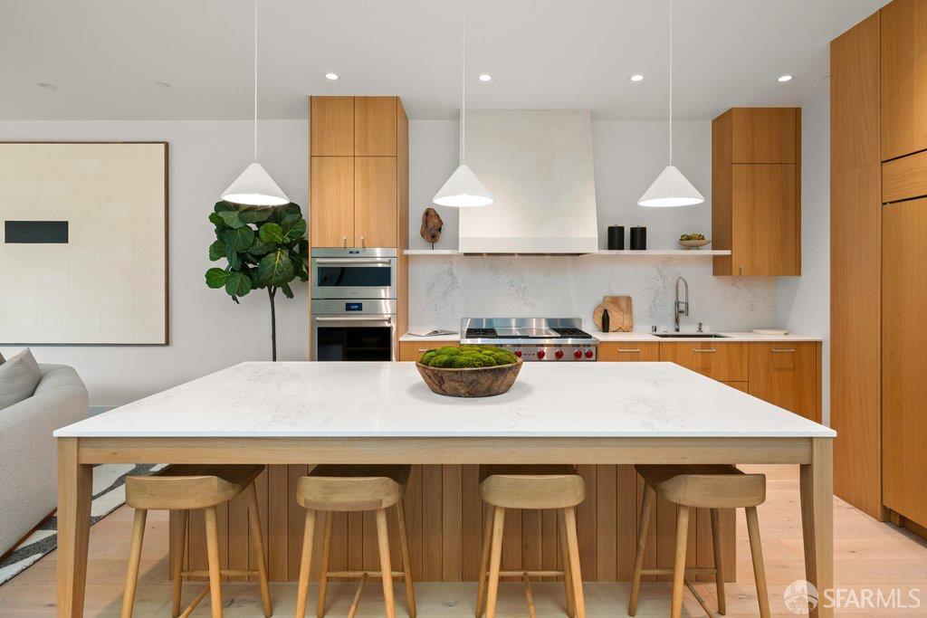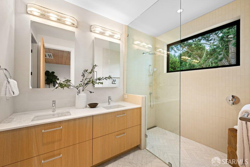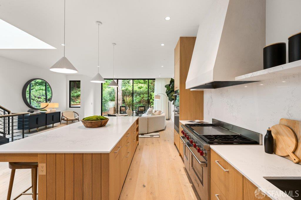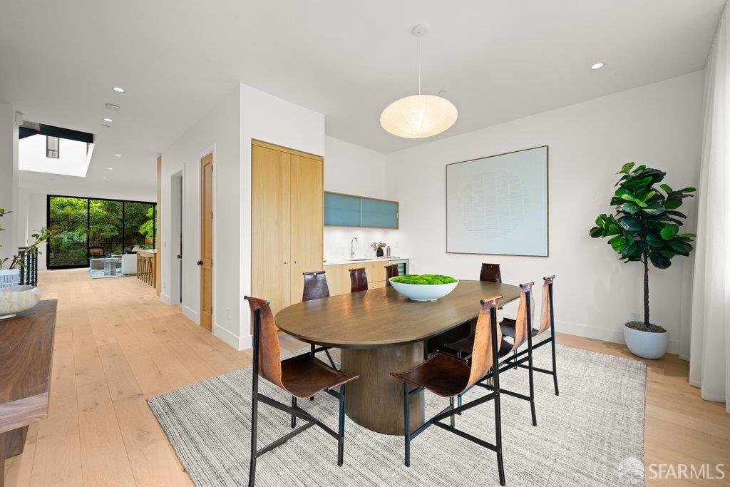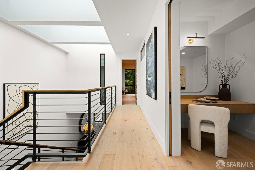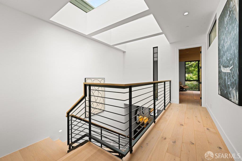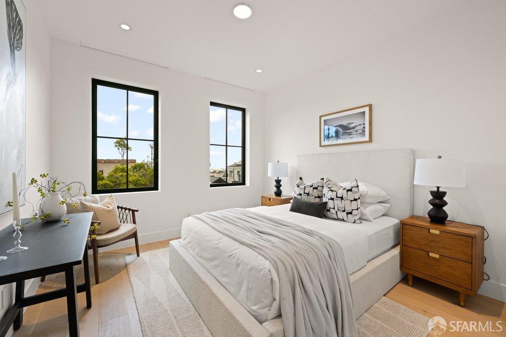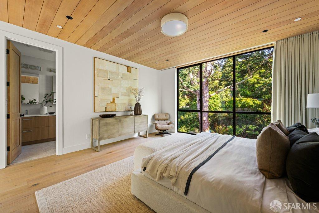 A Striking Nearly New Single Family Residence, gorgeously rebuilt by the current owner, under the creative eye of McElroy Architecture. The home features all of the elements of luxurious urban living: beautiful open concept floor plan with exceptional volume, custom floor to ceiling retractable door system with brilliant natural light, exquisite fit and finish throughout, and phenomenal indoor/outdoor components including a panoramic view roof deck, and an intimate connection to the lush, verdant garden. Sophisticated, organic warmth comes through in every space of this newly rebuilt residence, driven by a refined palette of Henrybuilt rift-sawn white oak cabinetry and European oak floors. The welcoming tone is balanced by a crisp architectural aesthetic that feels sleek and modern with ceiling heights reaching 11 feet. Finishes have been thoughtfully curated throughout, including herringbone-patterned marble floors in the baths, and a custom, floating center stairway under an over-sized skylight, and handsome natural wood ceiling accents in the primary bedroom and entry. The layout offers both flexibility and scale with four bedrooms, a dedicated office, and expansive living spaces suited to both daily living and entertaining. A striking kitchen anchors the main level, complemented by a dining room with built-in wine bar and a ground-level wine cellar. The retractable Fleetwood glass door system opens wide to a generous deck with stairs leading to the rear garden, where a vintage stone wall adds a sense of history and character. The new owner will love the upper bedroom level, highlighted by a luxurious primary suite with spacious walk in closet, two bedrooms down the hall that share a hall bath, an office with desk built-in, and a fourth bedroom with en suite bath that is privately positioned on the ground level. A rooftop deck sits above with views that extend beyond the neighborhood to St. Ignatius Cathedral, Angel Island, and the Downtown San Francisco Skyline. Just moments from the museums and gardens of Golden Gate Park, and the cafes/shopping on Cole Street, this home offers a compelling combination of state of the art design, excessive comfort, and central convenient location.