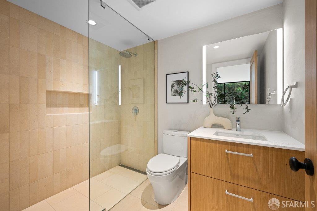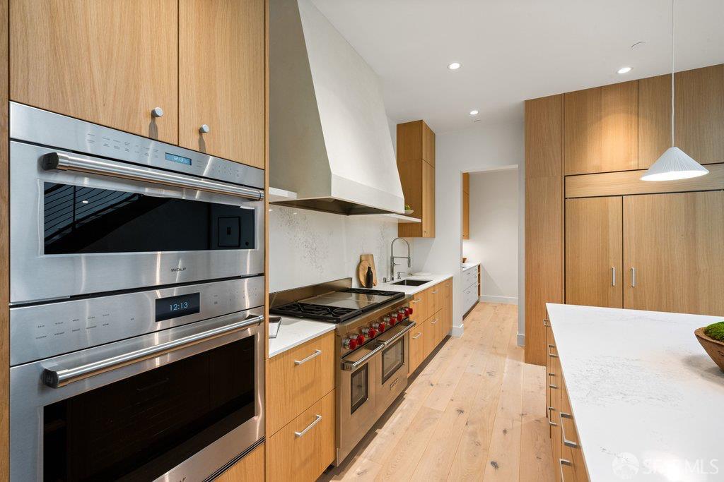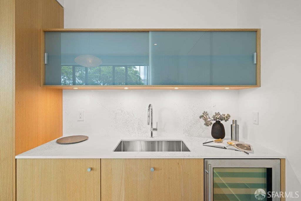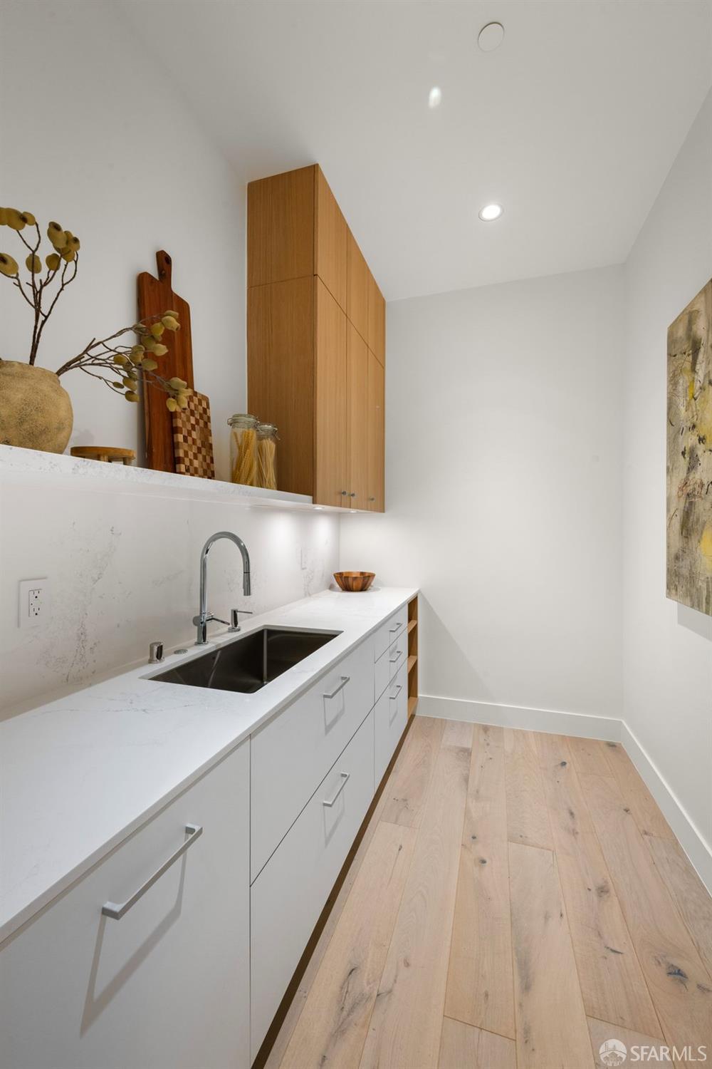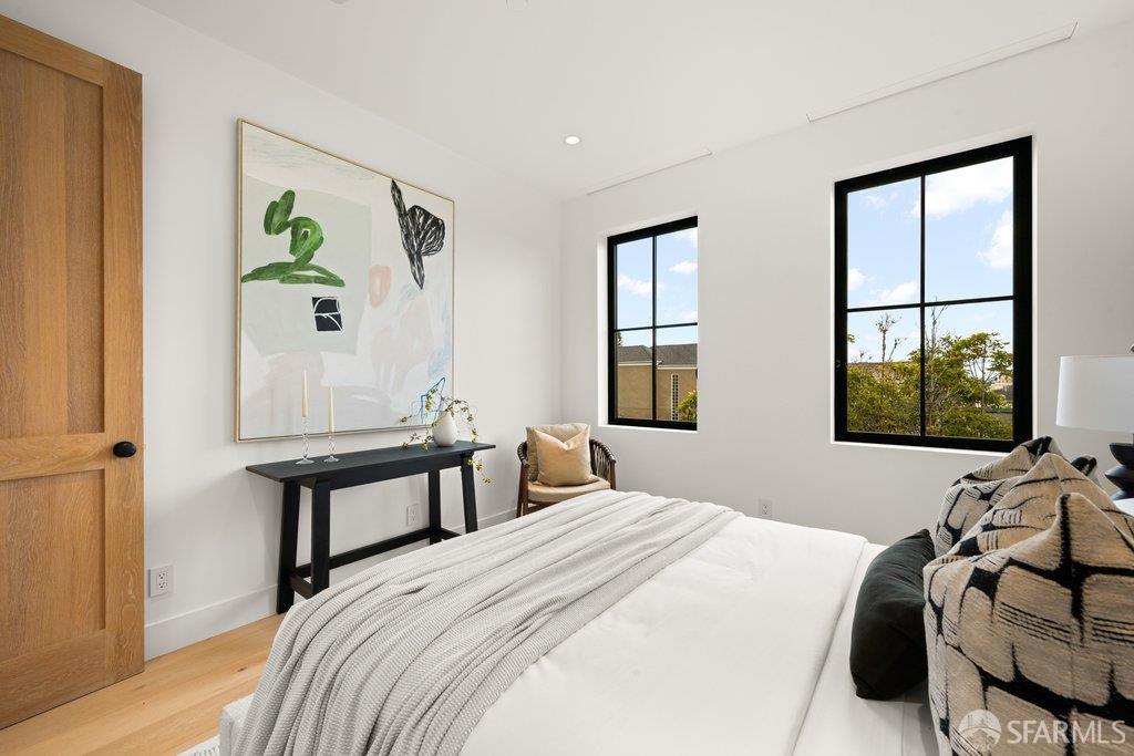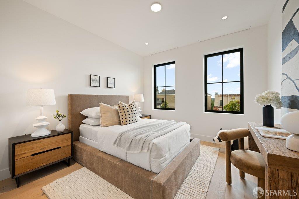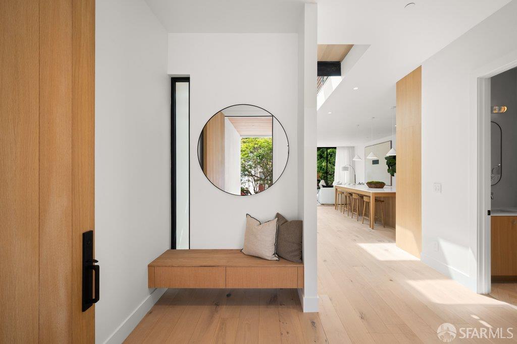 A Striking Nearly New Single Family Residence, gorgeously rebuilt by the current owner, under the creative eye of McElroy Architecture. The home features all of the elements of luxurious urban living: beautiful open concept floor plan with exceptional volume, custom floor to ceiling retractable door system with brilliant natural light, exquisite fit and finish throughout, and phenomenal indoor/outdoor components including a panoramic view roof deck, and an intimate connection to the lush, verdant garden. Sophisticated, organic warmth comes through in every space of this newly rebuilt residence, driven by a refined palette of Henrybuilt rift-sawn white oak cabinetry and European oak floors. The welcoming tone is balanced by a crisp architectural aesthetic that feels sleek and modern with ceiling heights reaching 11 feet. Finishes have been thoughtfully curated throughout, including herringbone-patterned marble floors in the baths, and a custom, floating center stairway under an over-sized skylight, and handsome natural wood ceiling accents in the primary bedroom and entry. The layout offers both flexibility and scale with four bedrooms, a dedicated office, and expansive living spaces suited to both daily living and entertaining. A striking kitchen anchors the main level, complemented by a dining room with built-in wine bar and a ground-level wine cellar. The retractable Fleetwood glass door system opens wide to a generous deck with stairs leading to the rear garden, where a vintage stone wall adds a sense of history and character. The new owner will love the upper bedroom level, highlighted by a luxurious primary suite with spacious walk in closet, two bedrooms down the hall that share a hall bath, an office with desk built-in, and a fourth bedroom with en suite bath that is privately positioned on the ground level. A rooftop deck sits above with views that extend beyond the neighborhood to St. Ignatius Cathedral, Angel Island, and the Downtown San Francisco Skyline. Just moments from the museums and gardens of Golden Gate Park, and the cafes/shopping on Cole Street, this home offers a compelling combination of state of the art design, excessive comfort, and central convenient location.