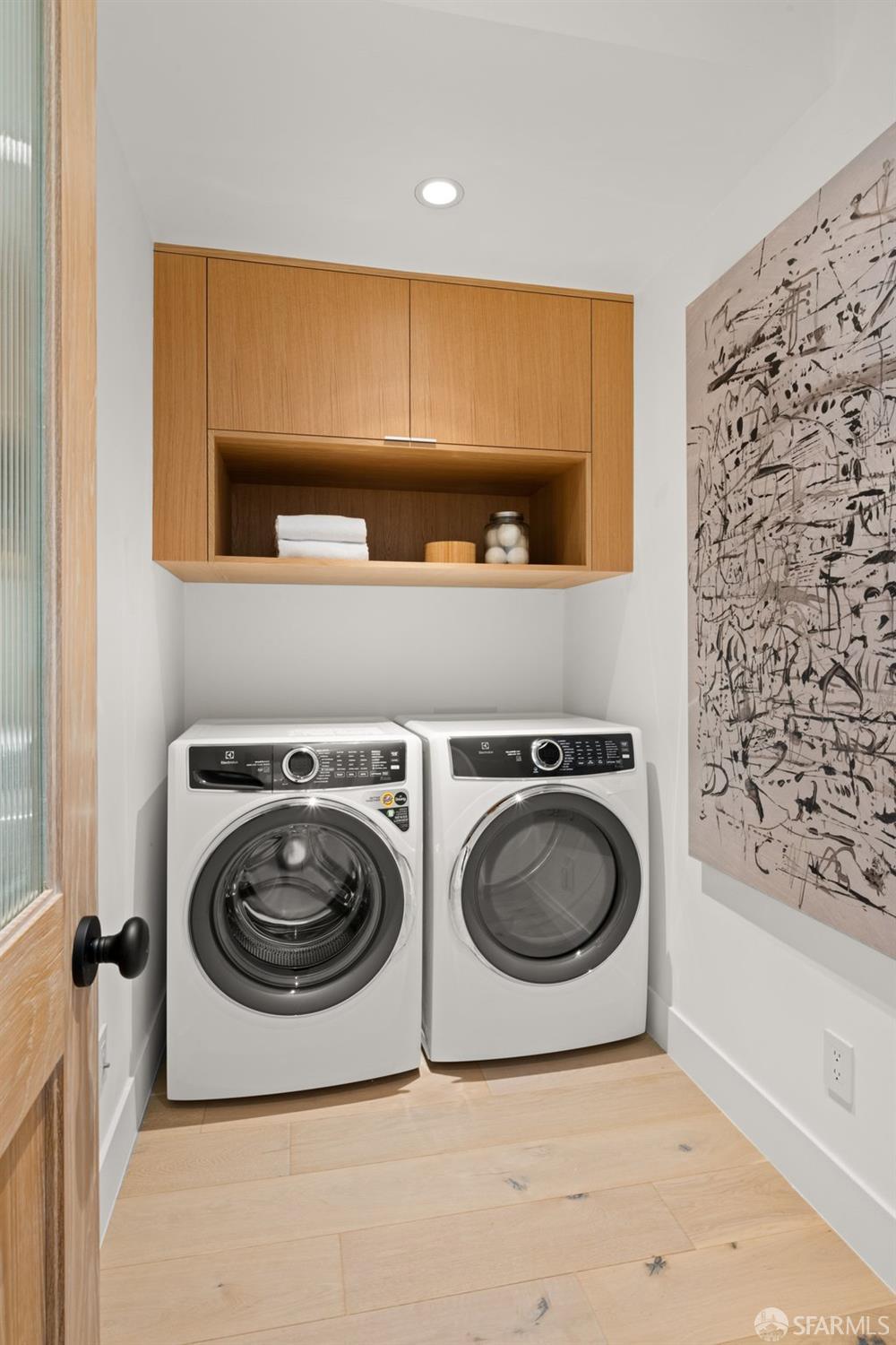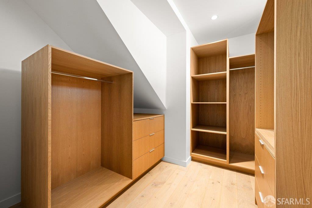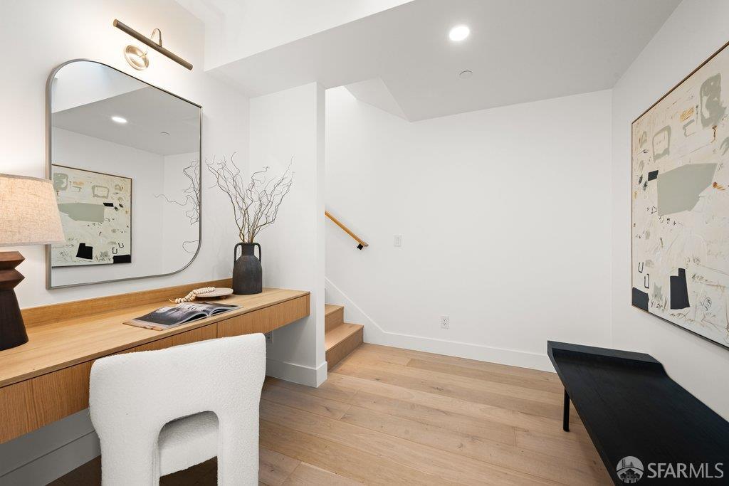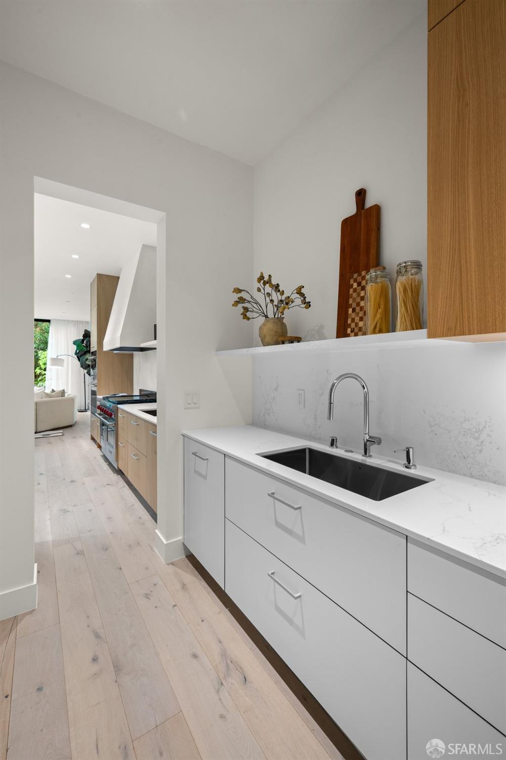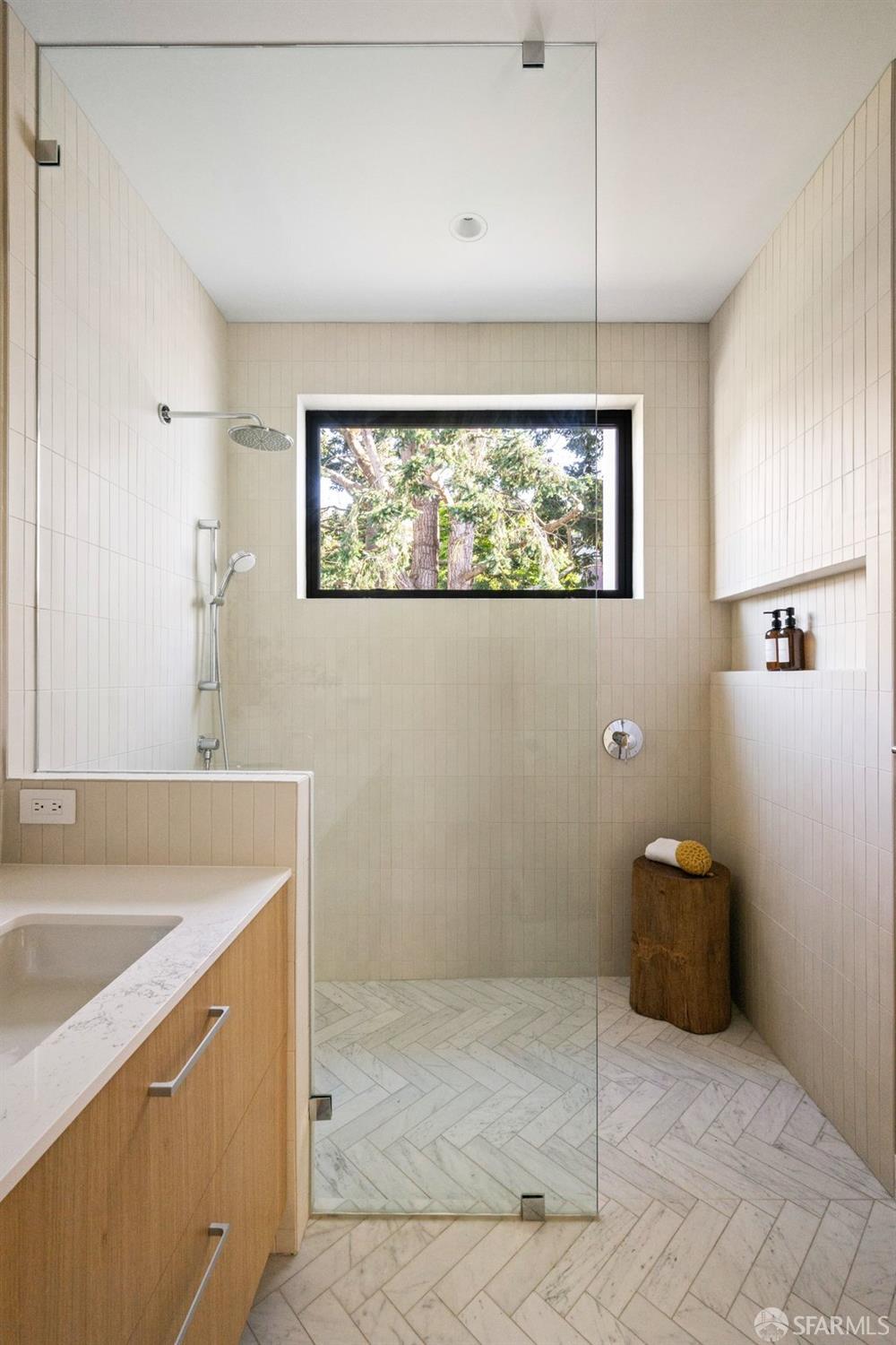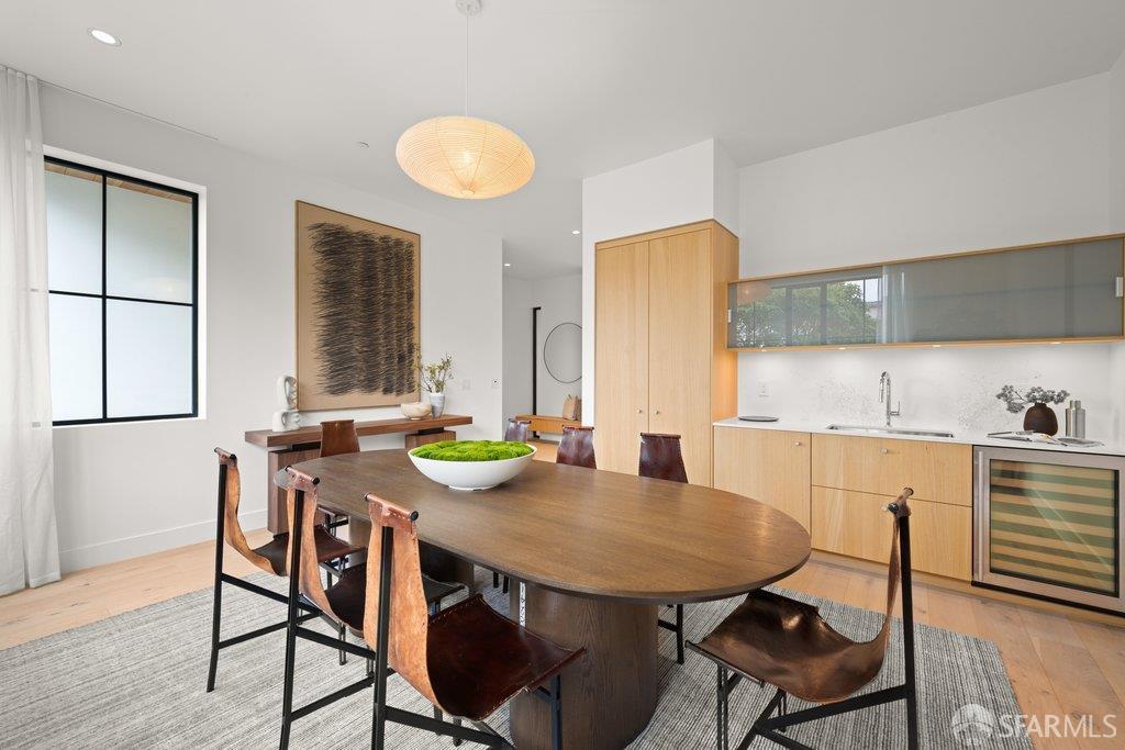 A Striking Nearly New Single Family Residence, gorgeously rebuilt by the current owner, under the creative eye of McElroy Architecture. The home features all of the elements of luxurious urban living: beautiful open concept floor plan with exceptional volume, custom floor to ceiling retractable door system with brilliant natural light, exquisite fit and finish throughout, and phenomenal indoor/outdoor components including a panoramic view roof deck, and an intimate connection to the lush, verdant garden. Sophisticated, organic warmth comes through in every space of this newly rebuilt residence, driven by a refined palette of Henrybuilt rift-sawn white oak cabinetry and European oak floors. The welcoming tone is balanced by a crisp architectural aesthetic that feels sleek and modern with ceiling heights reaching 11 feet. Finishes have been thoughtfully curated throughout, including herringbone-patterned marble floors in the baths, and a custom, floating center stairway under an over-sized skylight, and handsome natural wood ceiling accents in the primary bedroom and entry. The layout offers both flexibility and scale with four bedrooms, a dedicated office, and expansive living spaces suited to both daily living and entertaining. A striking kitchen anchors the main level, complemented by a dining room with built-in wine bar and a ground-level wine cellar. The retractable Fleetwood glass door system opens wide to a generous deck with stairs leading to the rear garden, where a vintage stone wall adds a sense of history and character. The new owner will love the upper bedroom level, highlighted by a luxurious primary suite with spacious walk in closet, two bedrooms down the hall that share a hall bath, an office with desk built-in, and a fourth bedroom with en suite bath that is privately positioned on the ground level. A rooftop deck sits above with views that extend beyond the neighborhood to St. Ignatius Cathedral, Angel Island, and the Downtown San Francisco Skyline. Just moments from the museums and gardens of Golden Gate Park, and the cafes/shopping on Cole Street, this home offers a compelling combination of state of the art design, excessive comfort, and central convenient location.