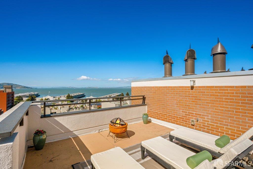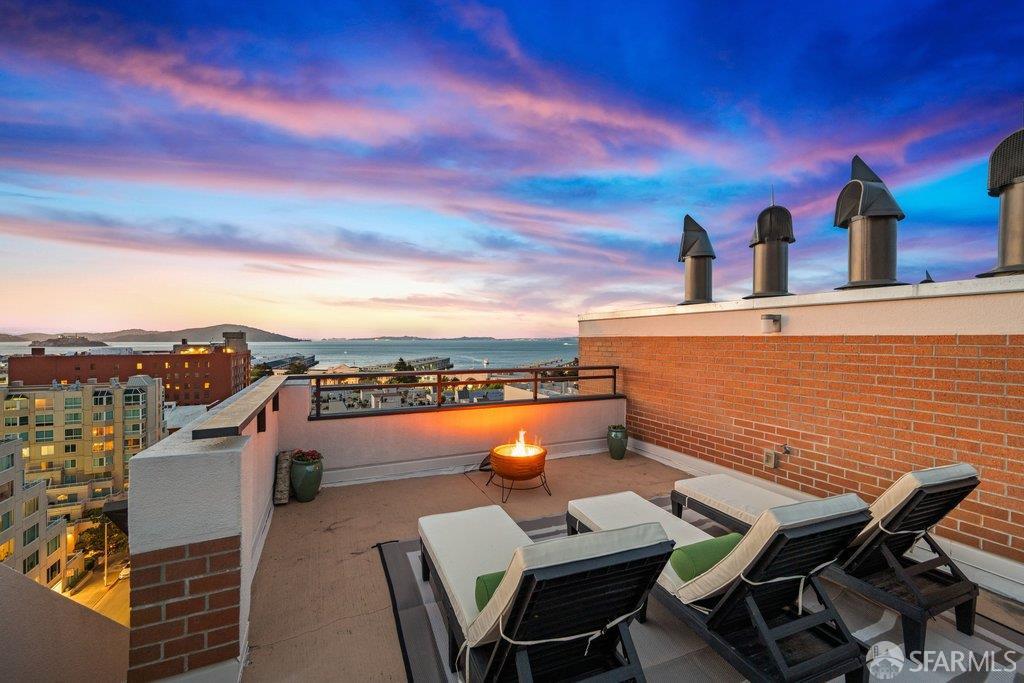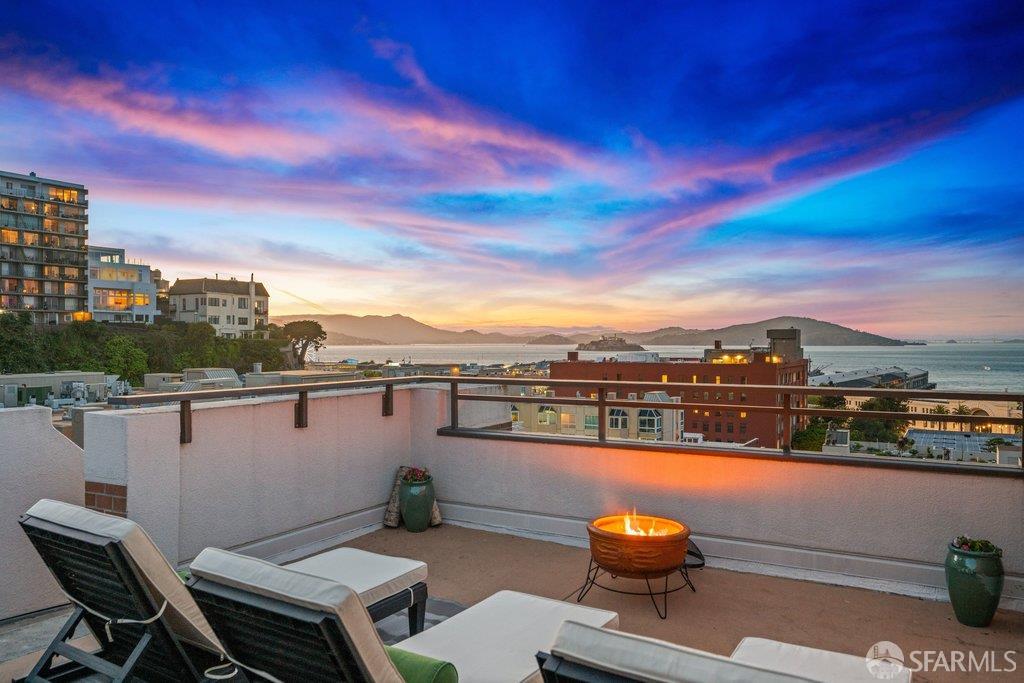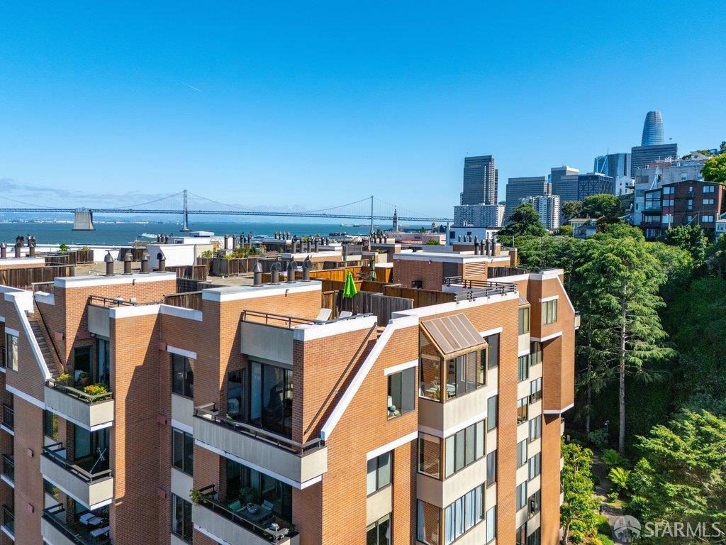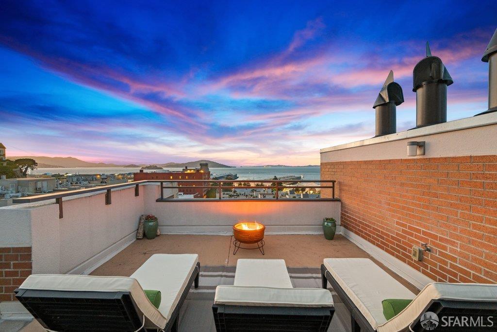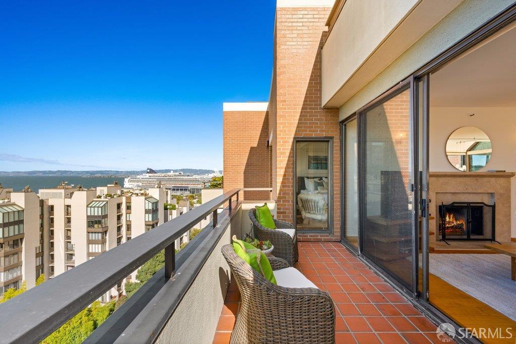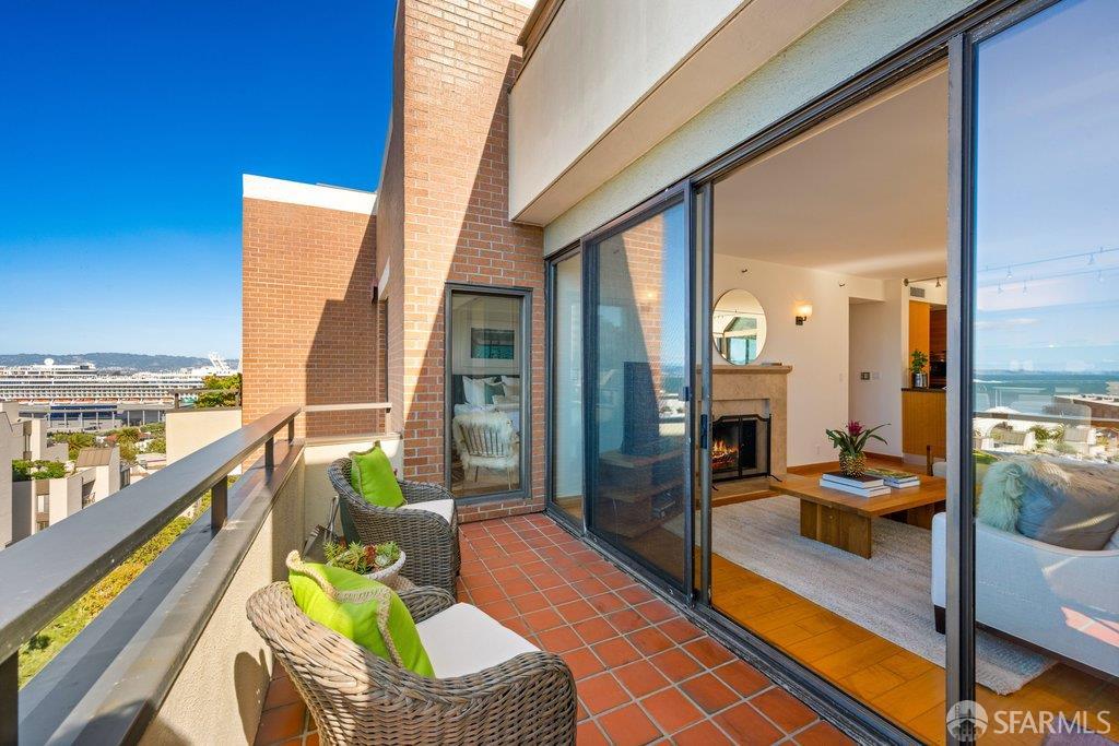 Perched under Telegraph Hill, right under Julius Castle in a beautifully renovated penthouse, this sophisticated residence offers truly spectacular views of the Bay, Alcatraz Island, and Telegraph Hill. Tucked into a hidden enclave along Lower Lombard, this light-filled corner condo combines privacy with iconic scenery. The open-concept kitchen, dining, and living areas are designed to showcase the sweeping vistas, featuring a cozy wood-burning fireplace and seamless access to a spacious deck, perfect for alfresco dining. A washer and dryer are also conveniently included, adding ease to everyday living. Upstairs, another large private roof deck delivers panoramic views that capture the essence of San Francisco living. Both bedrooms are thoughtfully positioned on opposite corners for maximum privacy, each with its own en-suite bath. Residents of 101 Lombard enjoy an exceptional collection of amenities, including a stunning heated pool, Chacuzzi, 24-hour doorman and security, onsite property management, a private library, and an inviting community room, all set amidst the lush, serene surroundings of Telegraph Hill. Life at 101 Lombard feels effortlessly luxurious. Imagine lounging poolside with a great book, soaking in the calm, spa-like atmosphere, or unwinding on your own private deck, an exclusive retreat where you can take in breathtaking views of the city skyline and the sparkling bay. Don’t miss the beautiful garden walk with beautiful Redwood trees that belongs to 101 Lombard hidden in the back of the property. This is elevated living at its finest. Ideally located in one of the city’s sunniest pockets, this home boasts a Walk Score of 99, placing the best of San Francisco right at your doorstep. Self managed by 101 Lombard Condo assoc Hoa Dues are 1750 a month they include Water, Cable, 24 hour front door Service, Janitorial, Window Washing twice a year, ON site management and staff, including janitorial and Chief building Engineer, upkeep of gardens, landscape, pool and spa