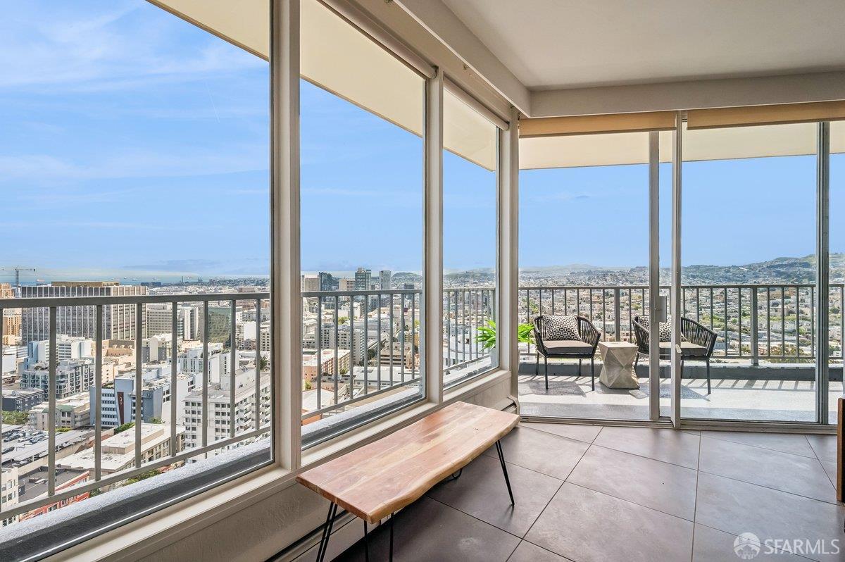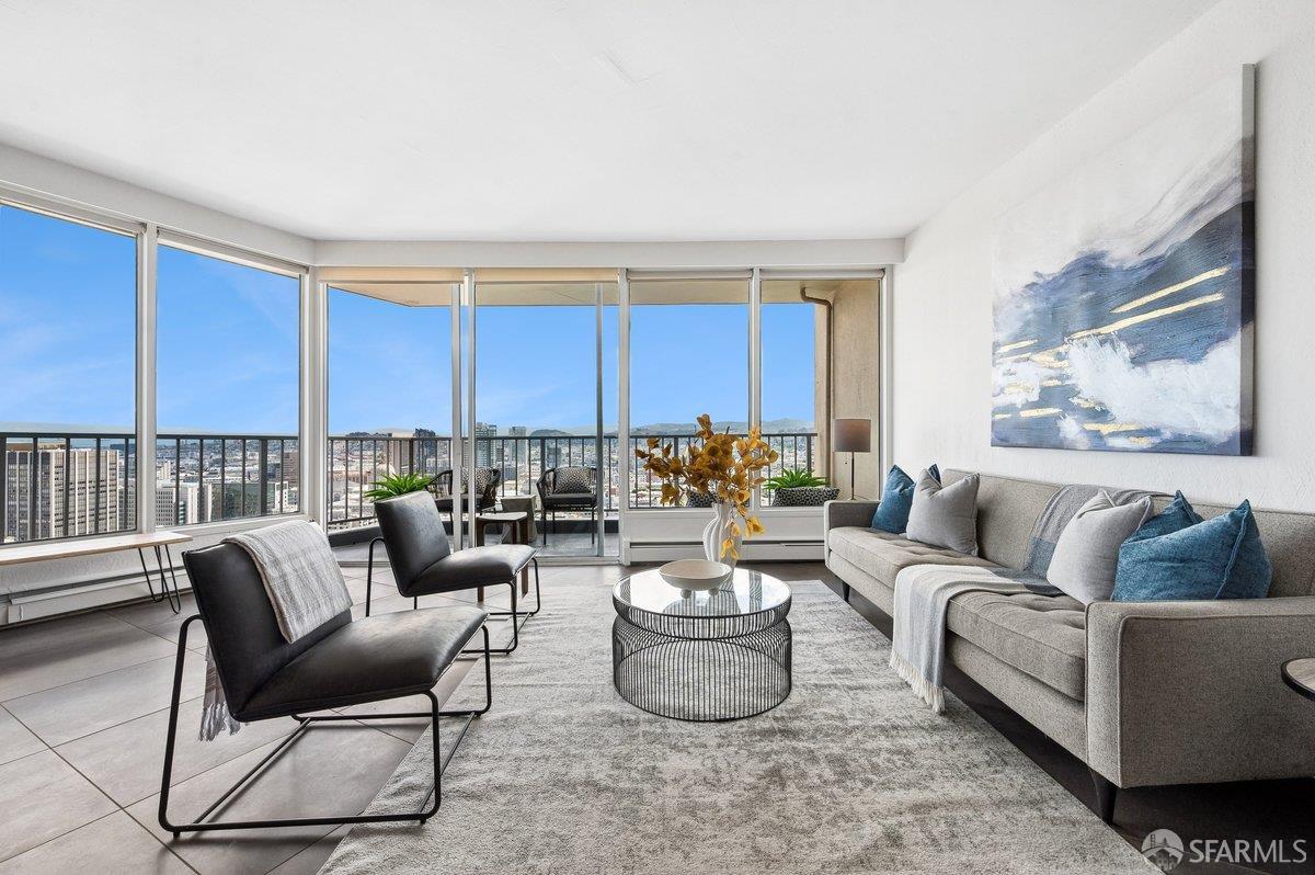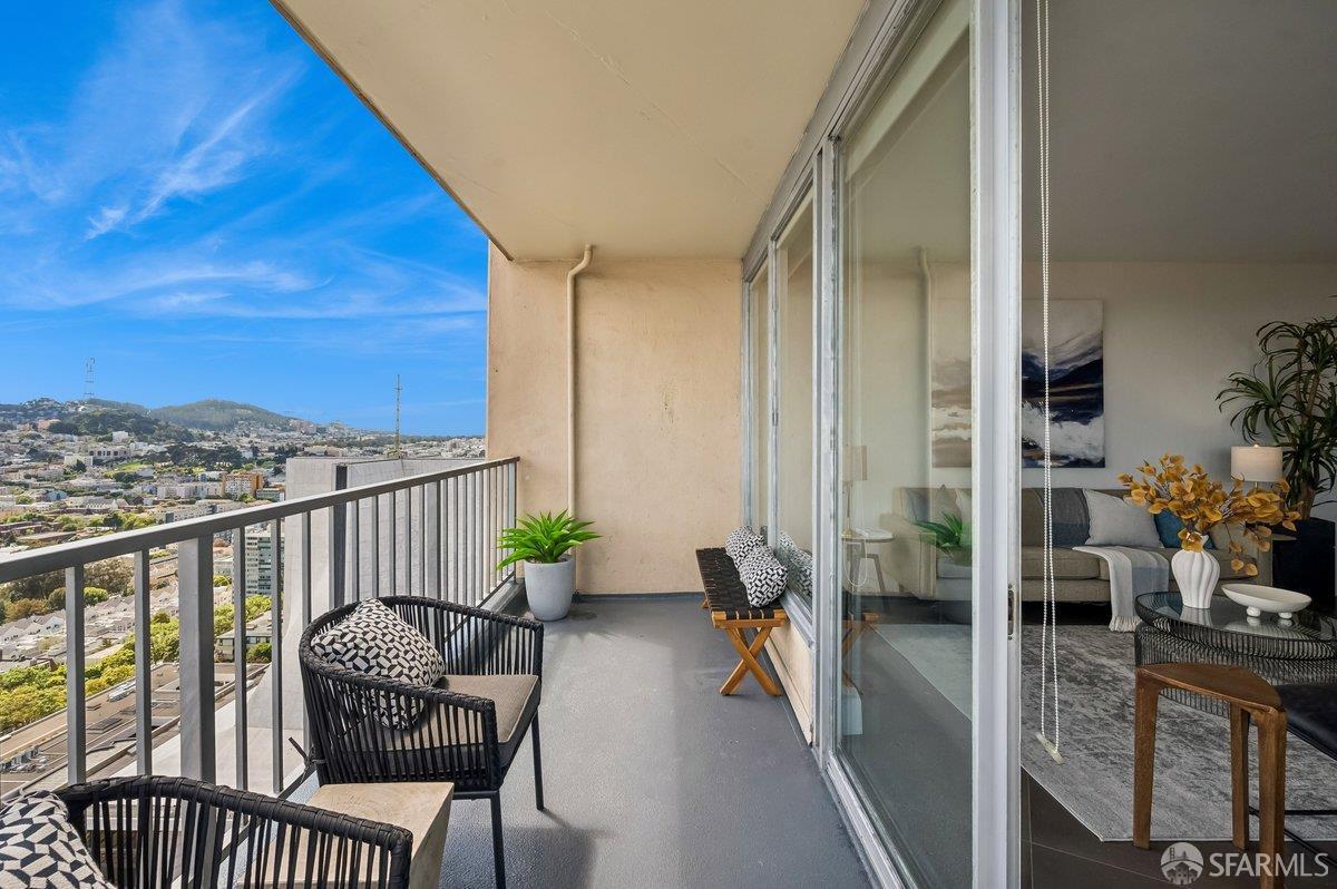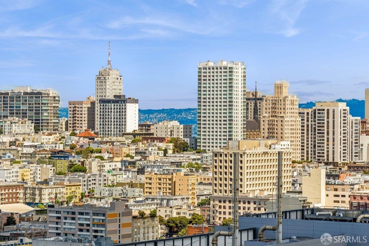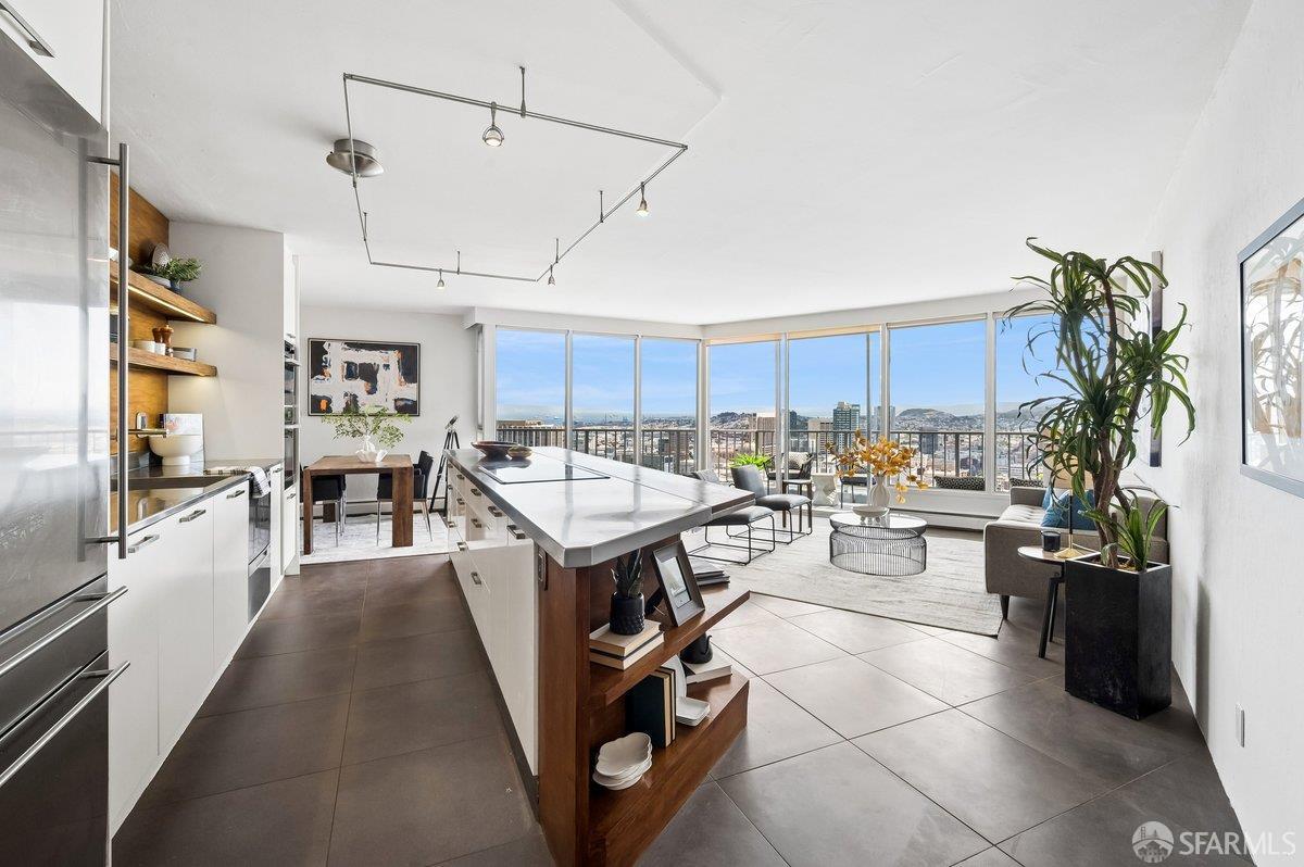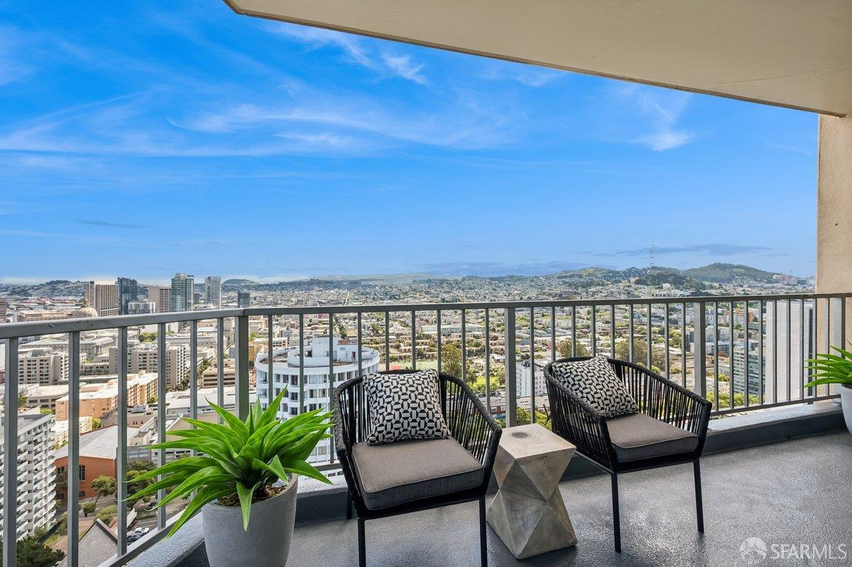Residence 23D at Cathedral Hill Tower offers sweeping views of the Bay and the downtown skyline, from City Hall to Twin Peaks. Floor-to-ceiling windows fill the home with natural light, while a wraparound balcony provides a seamless indoor-outdoor experience with dramatic city vistas. This spacious one-bedroom, one-bath condo spans approximately 900 square feet- larger than most one-bedroom layouts- featuring an open living and dining area designed for both comfort and entertaining. The updated kitchen showcases a sleek, modern design with stainless steel appliances, a large island with a custom wood-and-steel countertop, and a warm wood-accented backsplash. The generously sized bedroom accommodates a king bed, additional furniture, and workspace, and features multiple closets for ample storage. The updated bathroom includes a modern vanity and a shower over a tub with sliding glass doors. Additional highlights include one-car parking, storage, 24-hour security and concierge, guest parking, and EV charging. Ideally located with a Walk Score of 98 near Hayes Valley, Japantown, and Lower Pacific Heights, with convenient access to transit and major routes.
