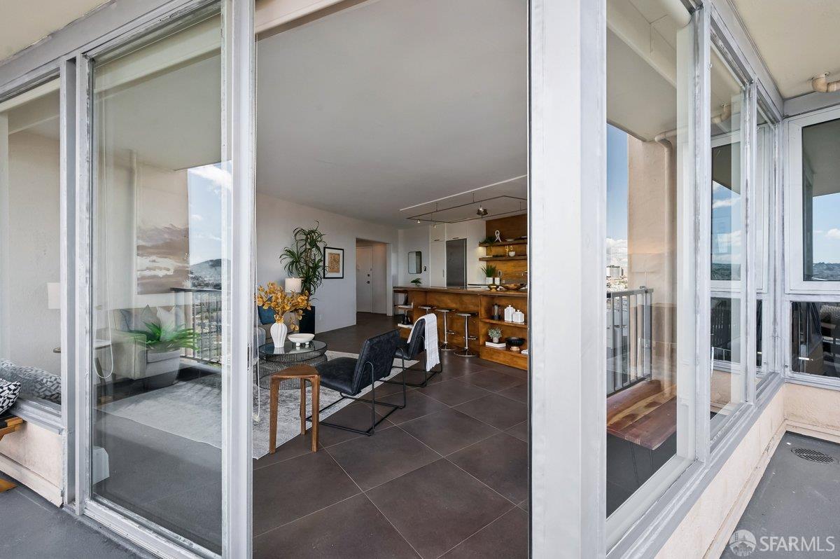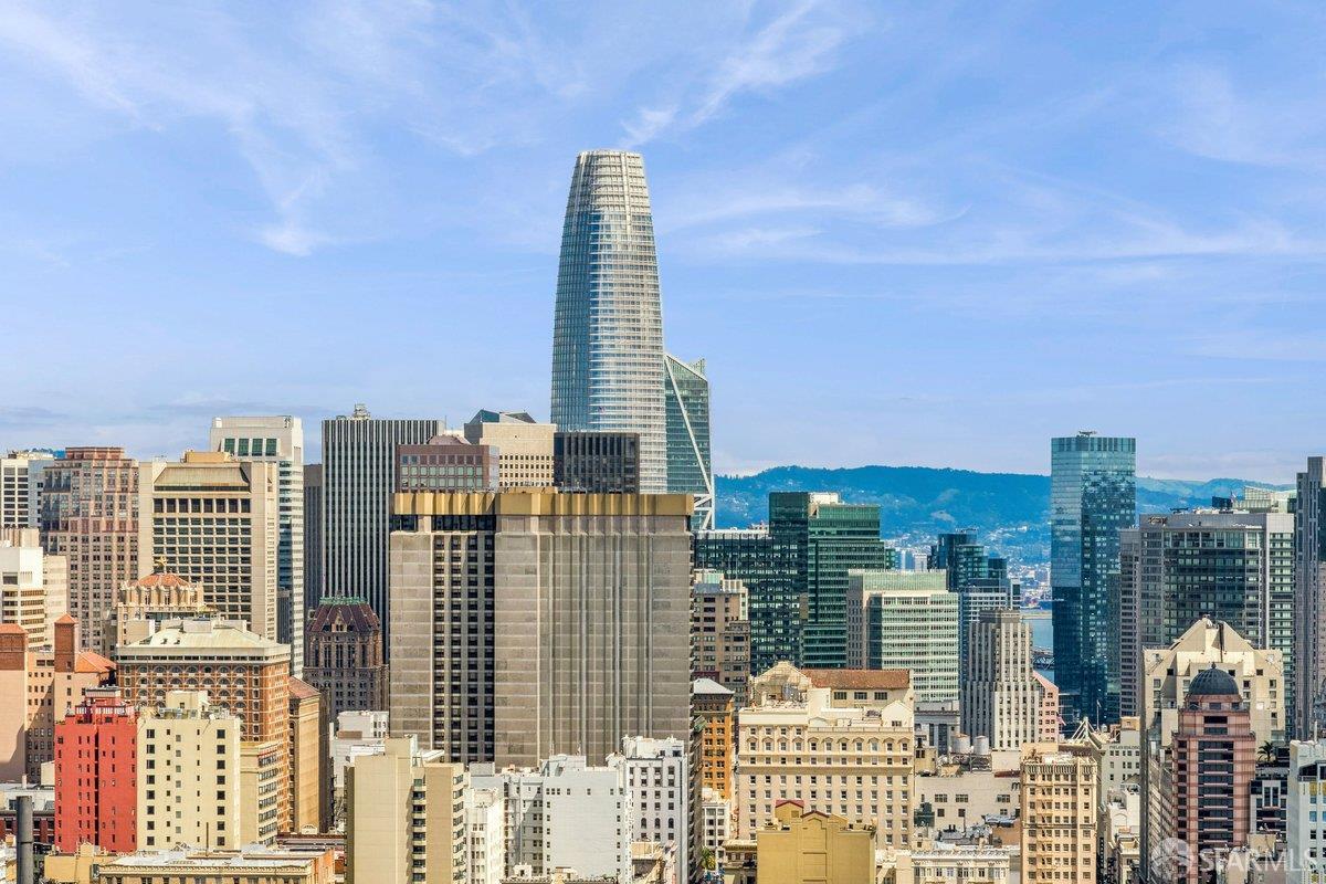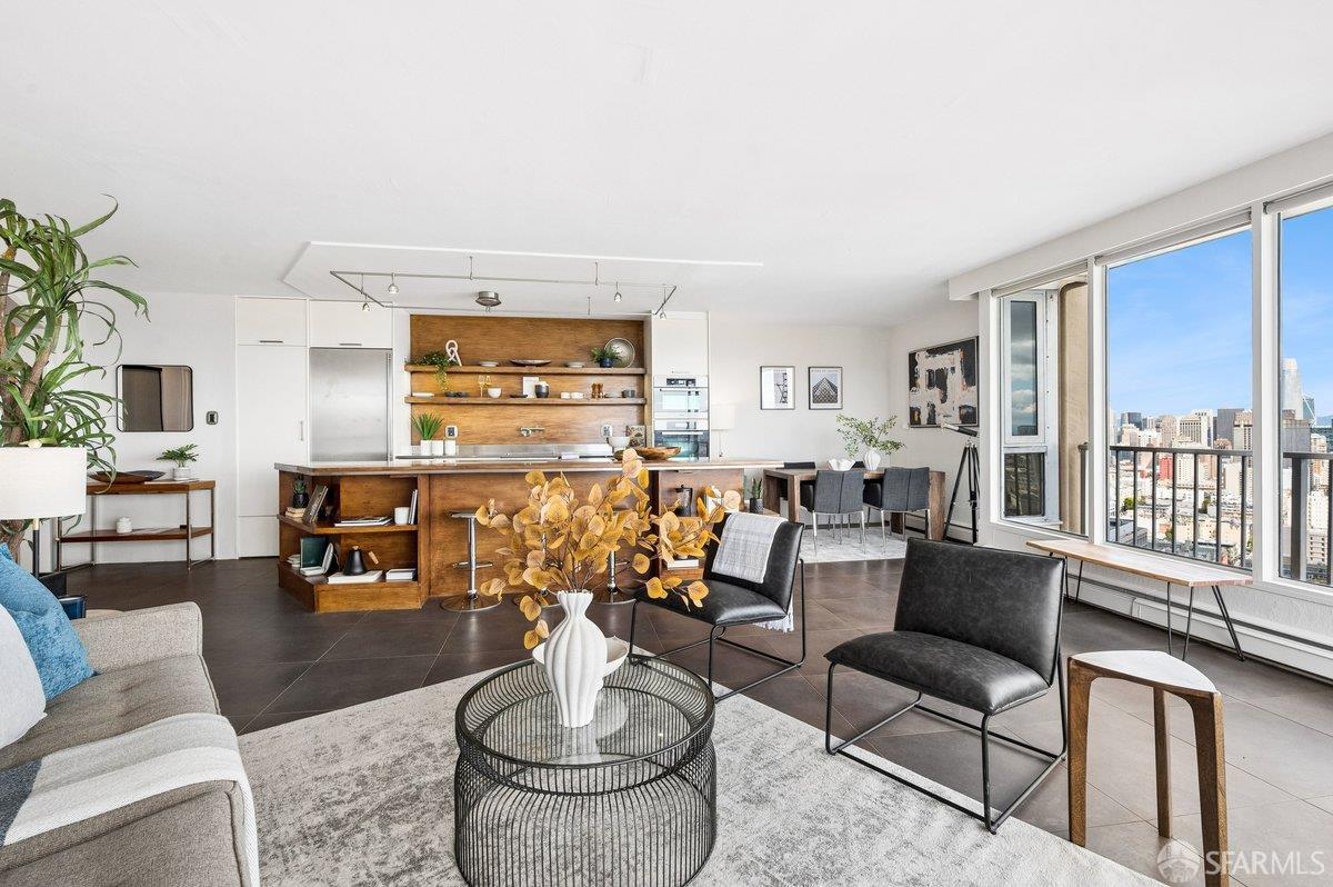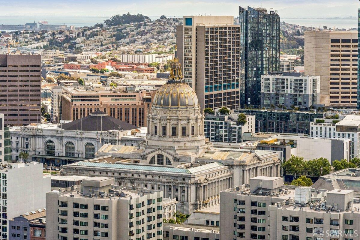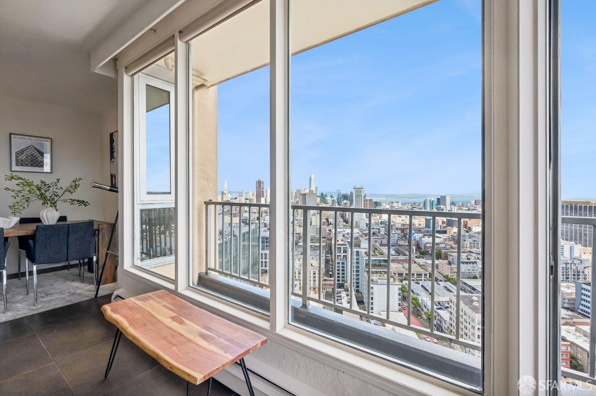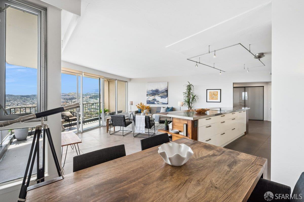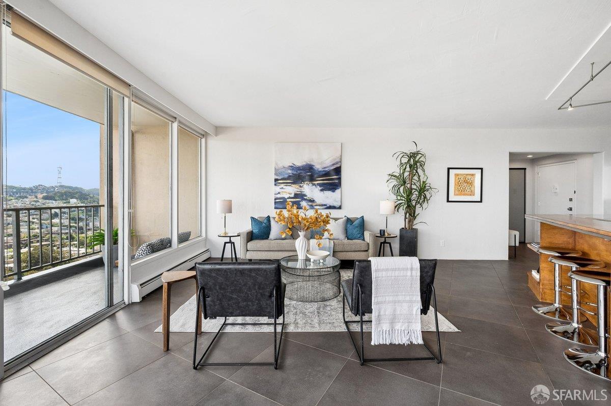 Residence 23D at Cathedral Hill Tower offers sweeping views of the Bay and the downtown skyline, from City Hall to Twin Peaks. Floor-to-ceiling windows fill the home with natural light, while a wraparound balcony provides a seamless indoor-outdoor experience with dramatic city vistas. This spacious one-bedroom, one-bath condo spans approximately 900 square feet- larger than most one-bedroom layouts- featuring an open living and dining area designed for both comfort and entertaining. The updated kitchen showcases a sleek, modern design with stainless steel appliances, a large island with a custom wood-and-steel countertop, and a warm wood-accented backsplash. The generously sized bedroom accommodates a king bed, additional furniture, and workspace, and features multiple closets for ample storage. The updated bathroom includes a modern vanity and a shower over a tub with sliding glass doors. Additional highlights include one-car parking, storage, 24-hour security and concierge, guest parking, and EV charging. Ideally located with a Walk Score of 98 near Hayes Valley, Japantown, and Lower Pacific Heights, with convenient access to transit and major routes.