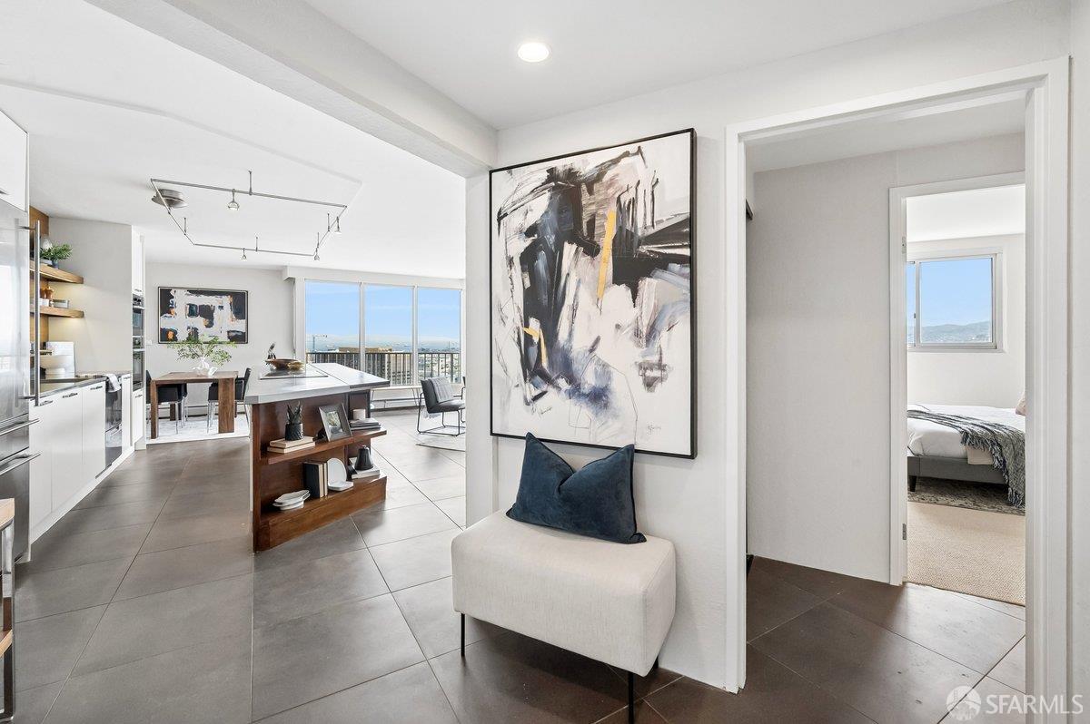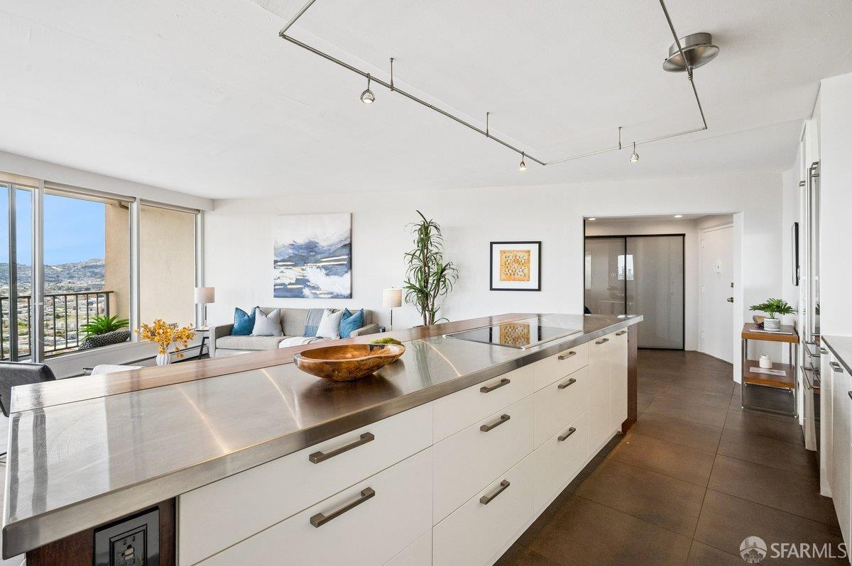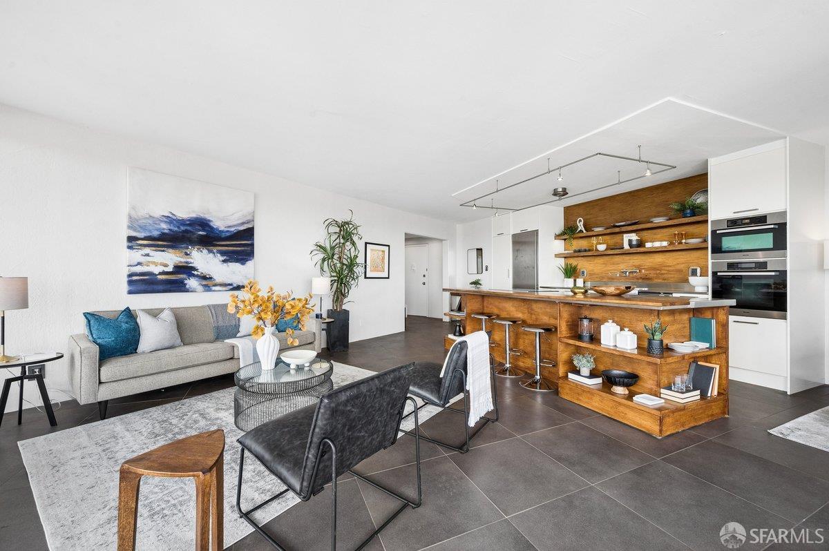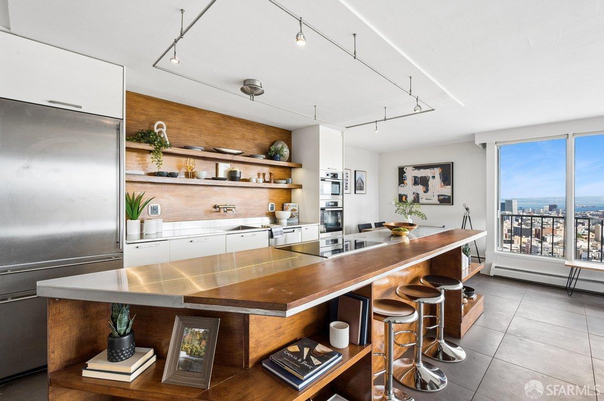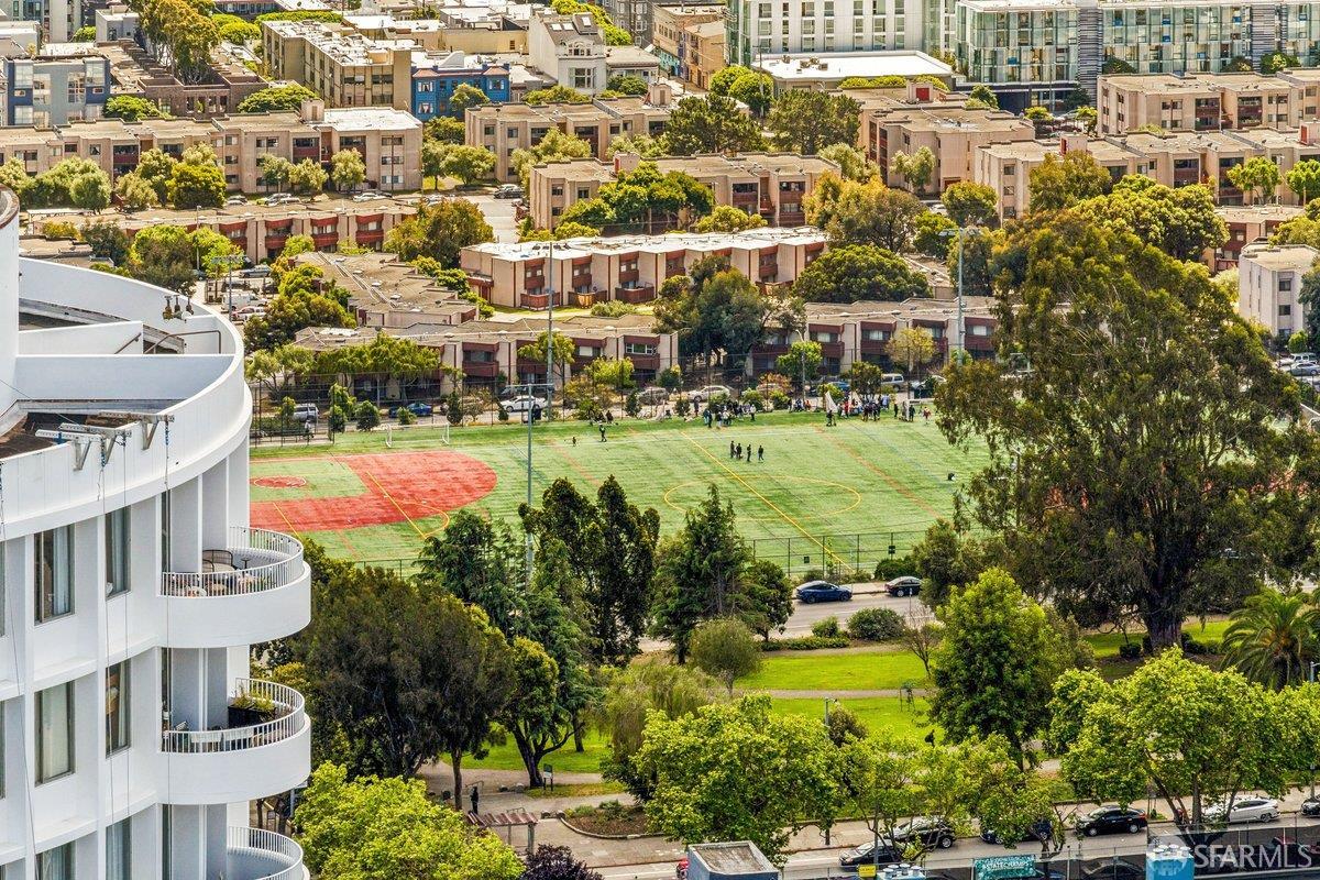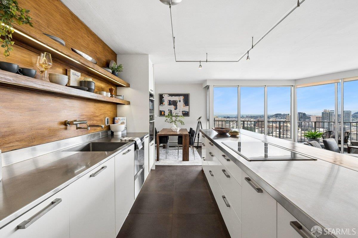 Residence 23D at Cathedral Hill Tower offers sweeping views of the Bay and the downtown skyline, from City Hall to Twin Peaks. Floor-to-ceiling windows fill the home with natural light, while a wraparound balcony provides a seamless indoor-outdoor experience with dramatic city vistas. This spacious one-bedroom, one-bath condo spans approximately 900 square feet- larger than most one-bedroom layouts- featuring an open living and dining area designed for both comfort and entertaining. The updated kitchen showcases a sleek, modern design with stainless steel appliances, a large island with a custom wood-and-steel countertop, and a warm wood-accented backsplash. The generously sized bedroom accommodates a king bed, additional furniture, and workspace, and features multiple closets for ample storage. The updated bathroom includes a modern vanity and a shower over a tub with sliding glass doors. Additional highlights include one-car parking, storage, 24-hour security and concierge, guest parking, and EV charging. Ideally located with a Walk Score of 98 near Hayes Valley, Japantown, and Lower Pacific Heights, with convenient access to transit and major routes.