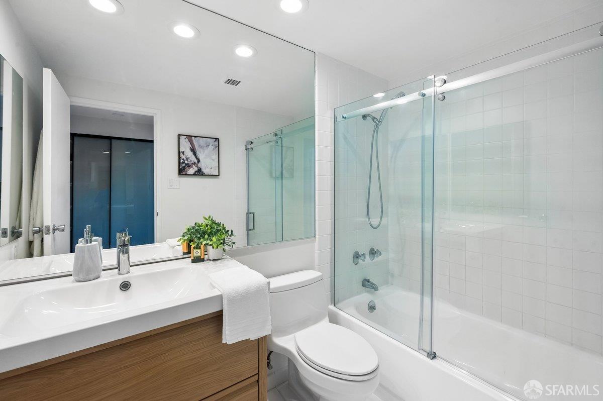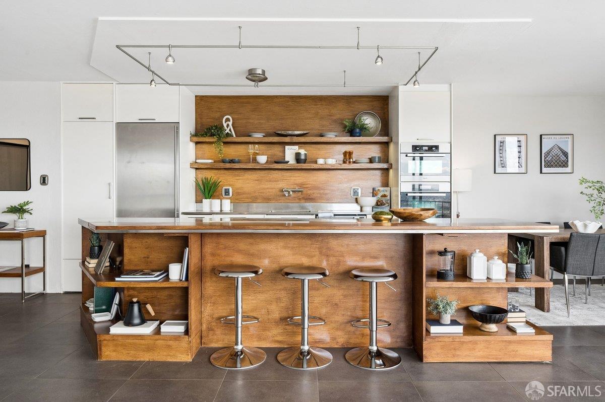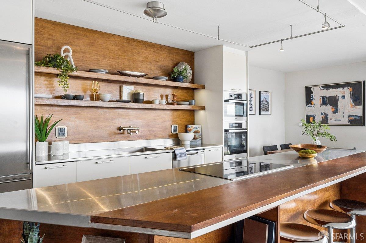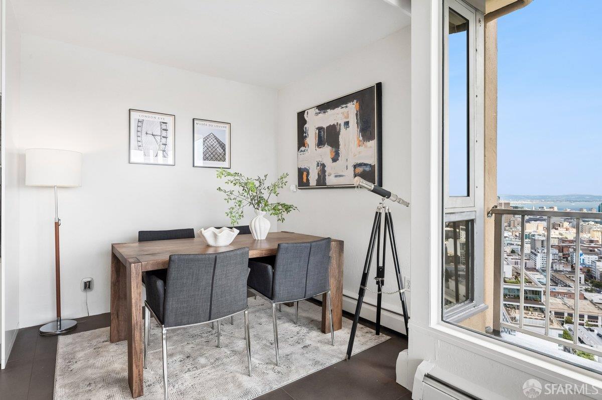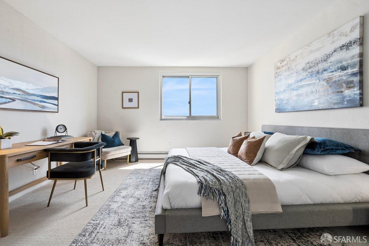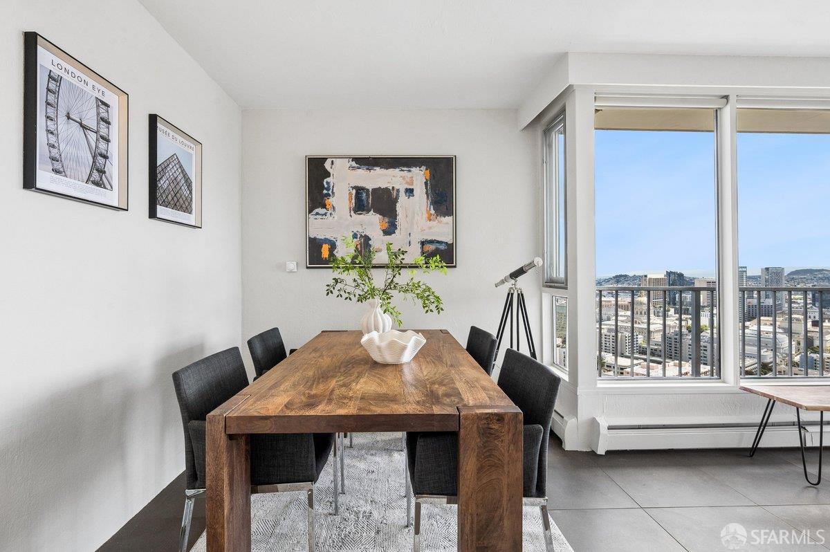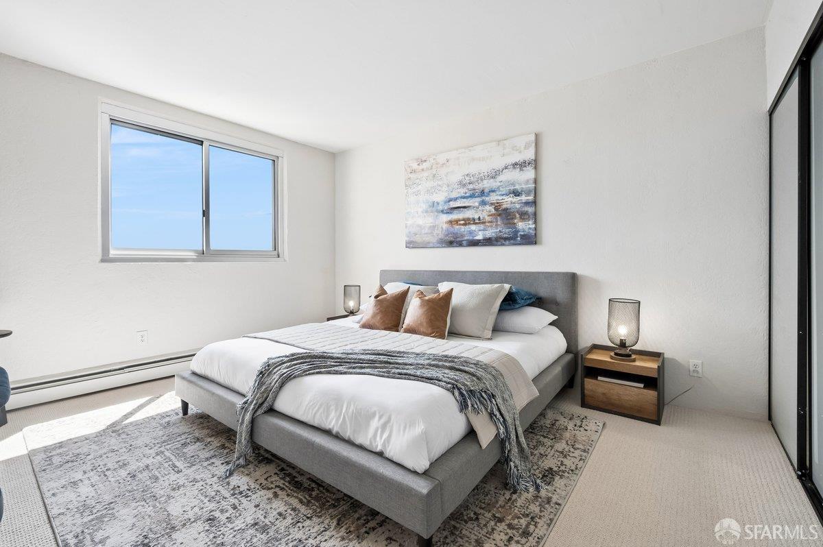 Residence 23D at Cathedral Hill Tower offers sweeping views of the Bay and the downtown skyline, from City Hall to Twin Peaks. Floor-to-ceiling windows fill the home with natural light, while a wraparound balcony provides a seamless indoor-outdoor experience with dramatic city vistas. This spacious one-bedroom, one-bath condo spans approximately 900 square feet- larger than most one-bedroom layouts- featuring an open living and dining area designed for both comfort and entertaining. The updated kitchen showcases a sleek, modern design with stainless steel appliances, a large island with a custom wood-and-steel countertop, and a warm wood-accented backsplash. The generously sized bedroom accommodates a king bed, additional furniture, and workspace, and features multiple closets for ample storage. The updated bathroom includes a modern vanity and a shower over a tub with sliding glass doors. Additional highlights include one-car parking, storage, 24-hour security and concierge, guest parking, and EV charging. Ideally located with a Walk Score of 98 near Hayes Valley, Japantown, and Lower Pacific Heights, with convenient access to transit and major routes.