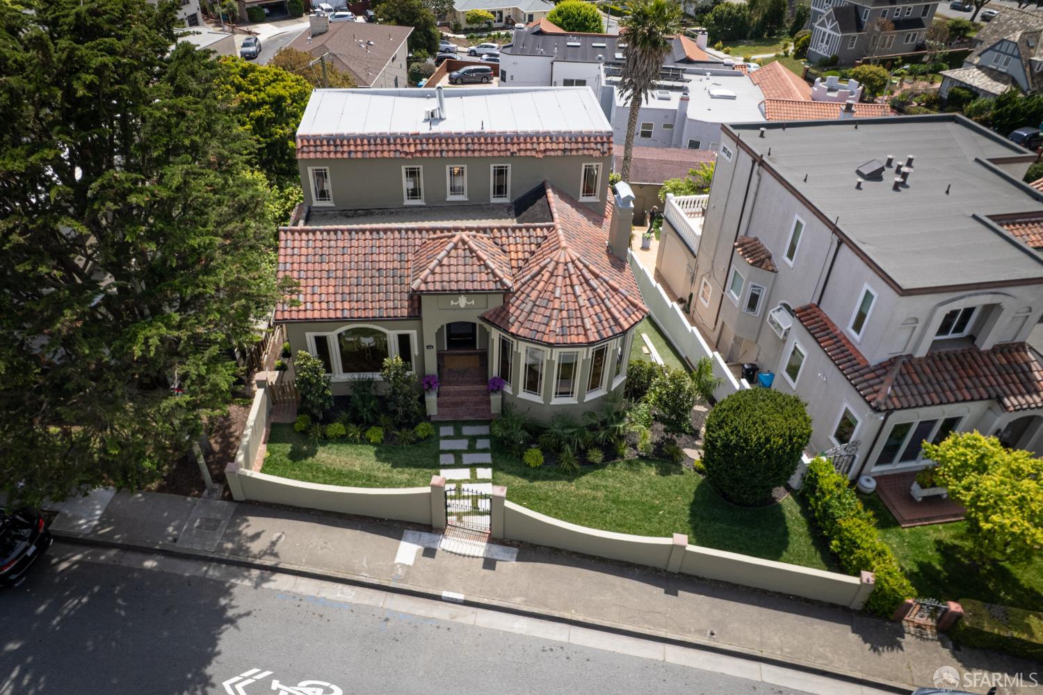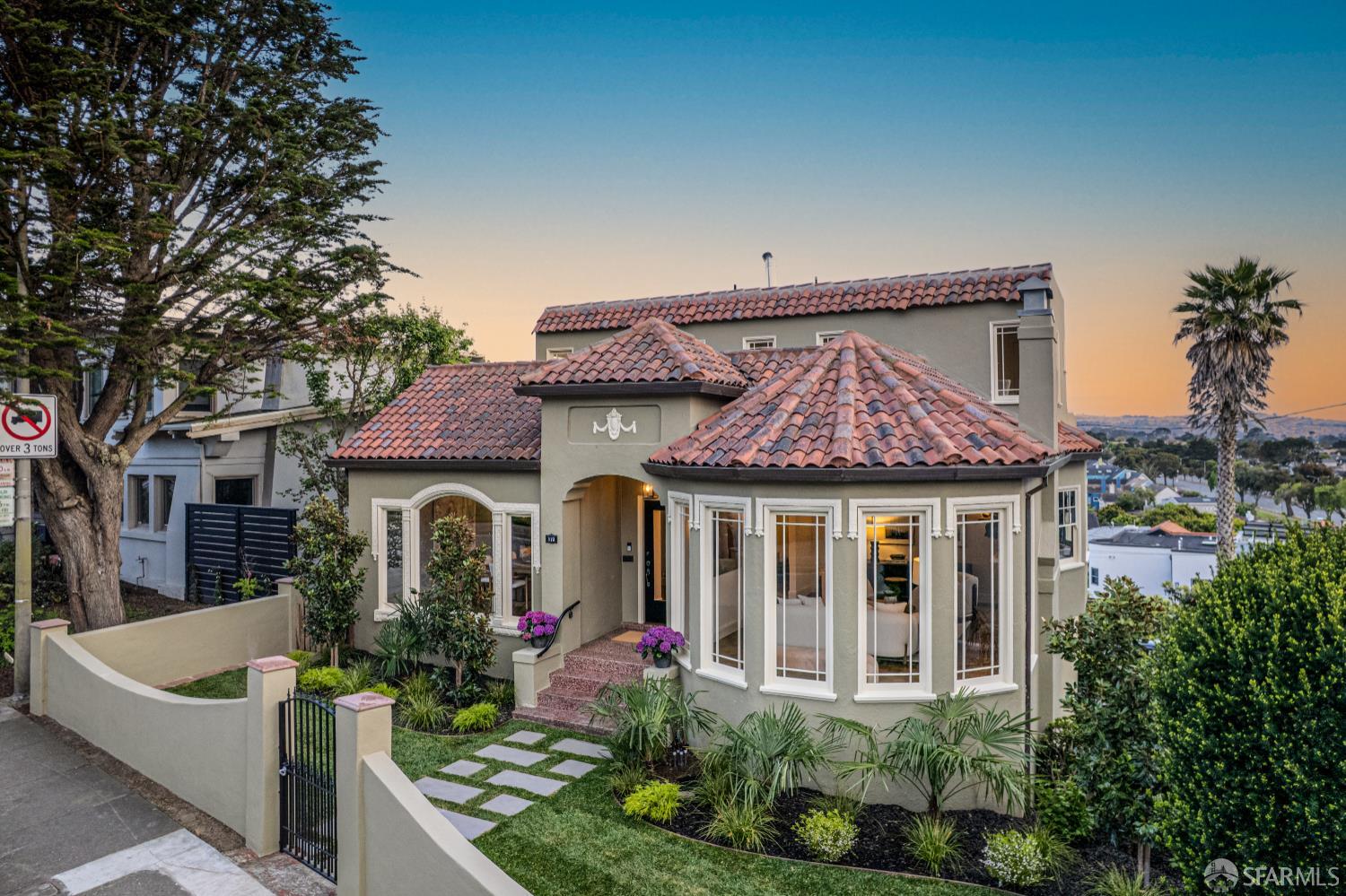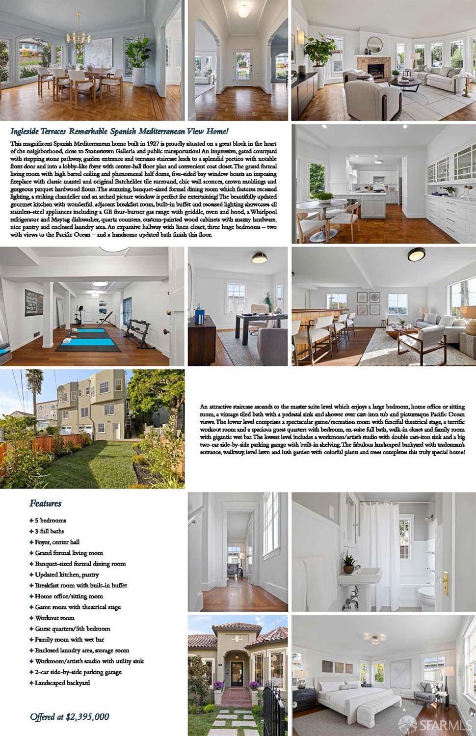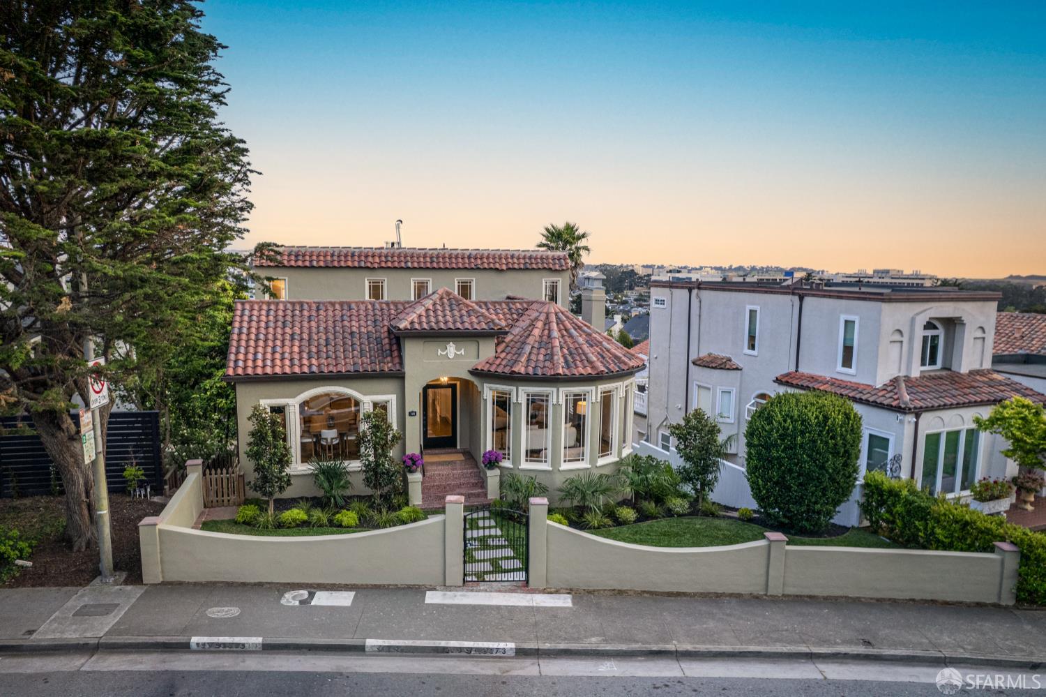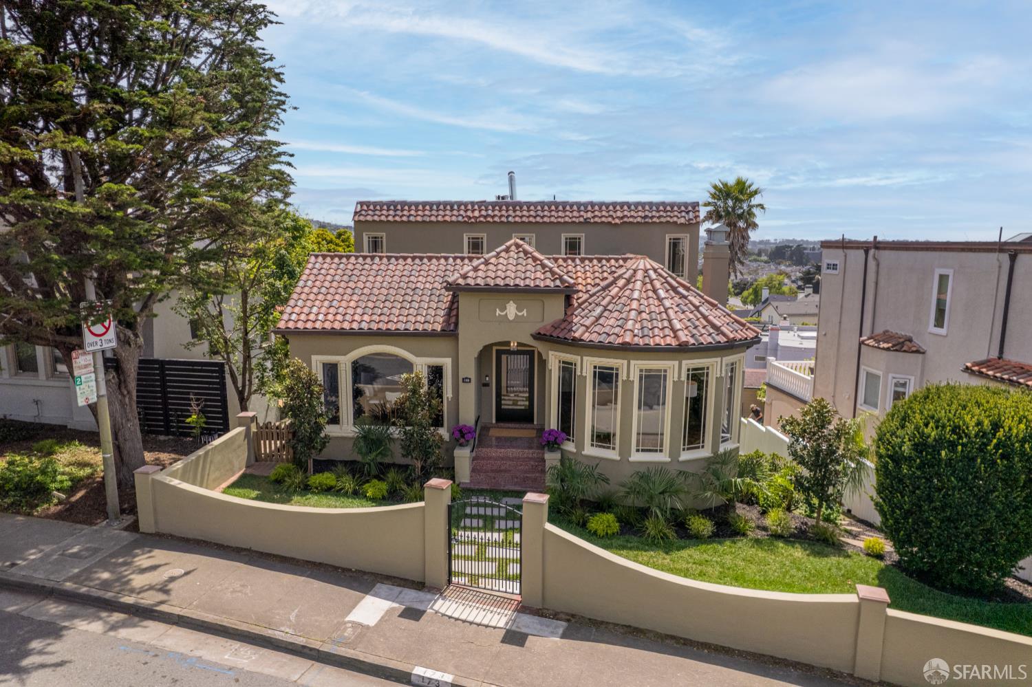 Remarkable Spanish Mediterranean view home proudly situated on a great block in the heart of the neighborhood, close to Stonestown Galleria and public transportation! An impressive, gated courtyard w/garden entrance & terrazzo staircase leads to a splendid portico w/notable front door & into a lobby-like foyer w/center-hall floor plan & convenient coat closet. Grand formal living rm w/high barrel ceiling & phenomenal half dome, five-sided bay window boasts an imposing fireplace w/classic mantel & original Batchelder tile surround, chic wall sconces, crown moldings & gorgeous parquet hardwood floors. Stunning, banquet-sized formal dining rm features recessed lighting, a striking chandelierand an arched picture window. The beautifully updated gourmet kitchen w/wonderful, adjacent breakfast rm, built-in buffet & recessed lighting showcases all stainless-steel appliances incl a four-burner gas range w/griddle, oven & hood, quartz counters, custom-painted wood cabinets w/snazzy hardware, nice pantry & enclosed laundry area. An expansive hallway with linen closet, three huge bedrooms – two w/views to the PacificOcean – & a handsome updated bath finish this floor. An attractive staircase ascends to the master suite level which enjoys a large bedroom, home office or sitting rm, a vintage tiled bath w/pedestal sink & shower over cast-iron tub & picturesque Pacific Ocean views. The lower level comprises a spectacular game rm w/fanciful theatrical stage, a terrific workout rm & a spacious guest quarters w/bedroom, en-suite full bath, walk-in closet & family rm w/gigantic wet bar. The lowest level includes a workroom/artist’s studio w/double cast-iron sink & a big two-car s/s parking garage w/built-in shelving. Fabulous landscaped backyard w/tradesman’s entrance, walkway, level lawn & lush garden w/colorful plants & trees!