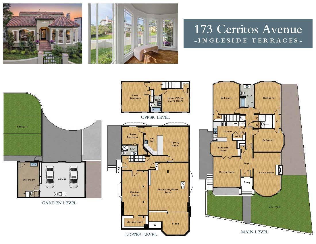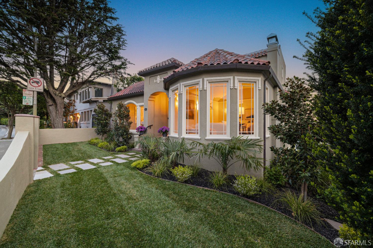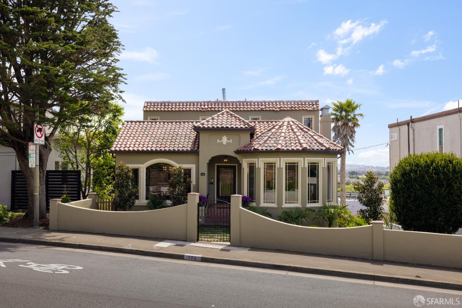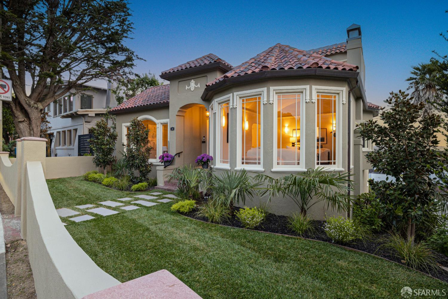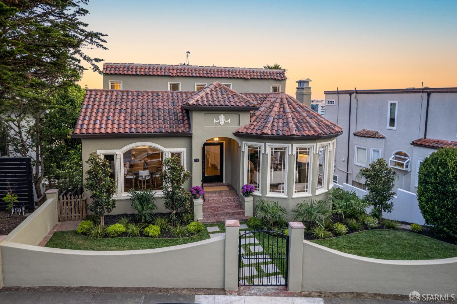 Remarkable Spanish Mediterranean view home proudly situated on a great block in the heart of the neighborhood, close to Stonestown Galleria and public transportation! An impressive, gated courtyard w/garden entrance & terrazzo staircase leads to a splendid portico w/notable front door & into a lobby-like foyer w/center-hall floor plan & convenient coat closet. Grand formal living rm w/high barrel ceiling & phenomenal half dome, five-sided bay window boasts an imposing fireplace w/classic mantel & original Batchelder tile surround, chic wall sconces, crown moldings & gorgeous parquet hardwood floors. Stunning, banquet-sized formal dining rm features recessed lighting, a striking chandelierand an arched picture window. The beautifully updated gourmet kitchen w/wonderful, adjacent breakfast rm, built-in buffet & recessed lighting showcases all stainless-steel appliances incl a four-burner gas range w/griddle, oven & hood, quartz counters, custom-painted wood cabinets w/snazzy hardware, nice pantry & enclosed laundry area. An expansive hallway with linen closet, three huge bedrooms – two w/views to the PacificOcean – & a handsome updated bath finish this floor. An attractive staircase ascends to the master suite level which enjoys a large bedroom, home office or sitting rm, a vintage tiled bath w/pedestal sink & shower over cast-iron tub & picturesque Pacific Ocean views. The lower level comprises a spectacular game rm w/fanciful theatrical stage, a terrific workout rm & a spacious guest quarters w/bedroom, en-suite full bath, walk-in closet & family rm w/gigantic wet bar. The lowest level includes a workroom/artist’s studio w/double cast-iron sink & a big two-car s/s parking garage w/built-in shelving. Fabulous landscaped backyard w/tradesman’s entrance, walkway, level lawn & lush garden w/colorful plants & trees!