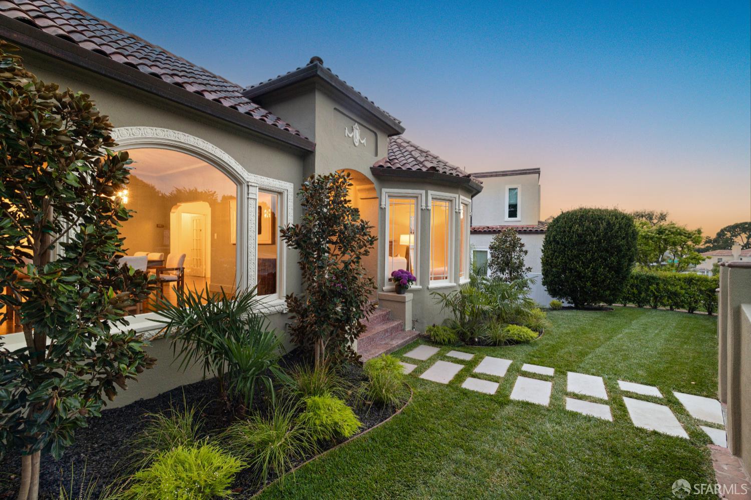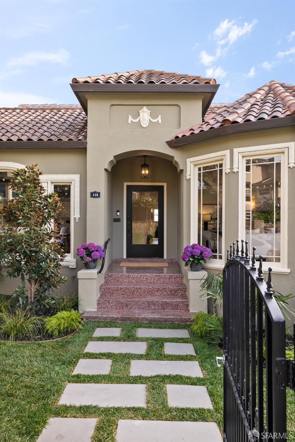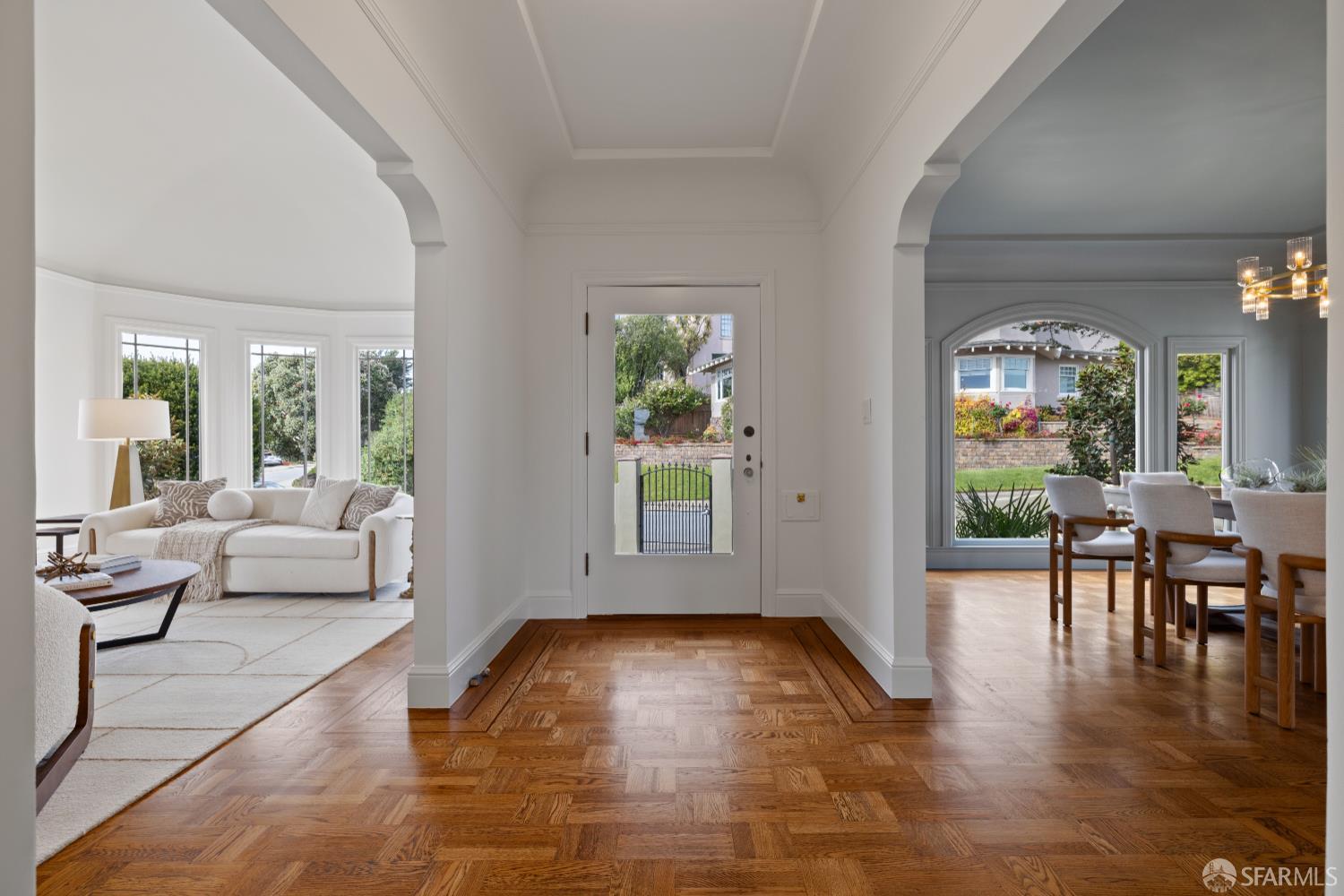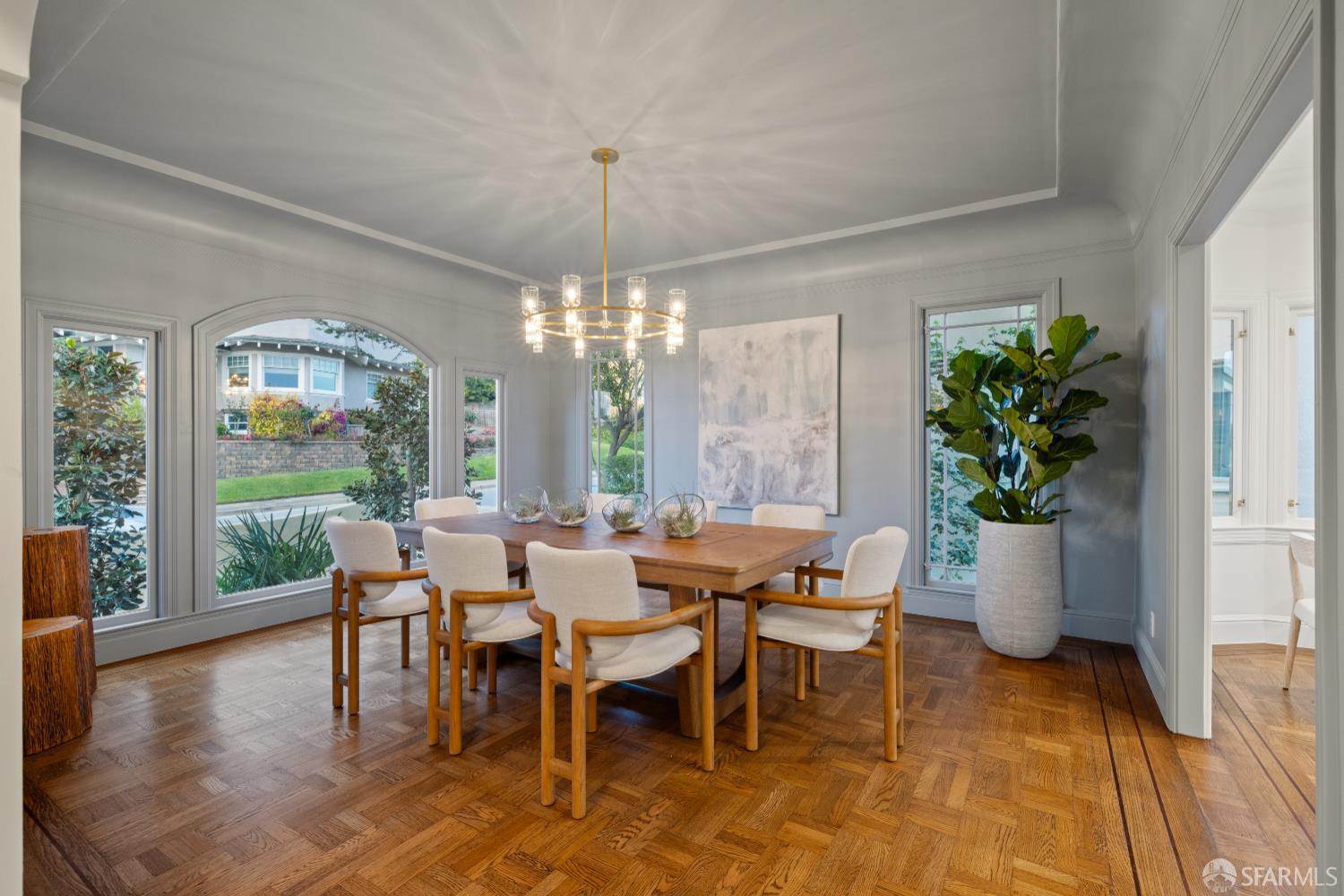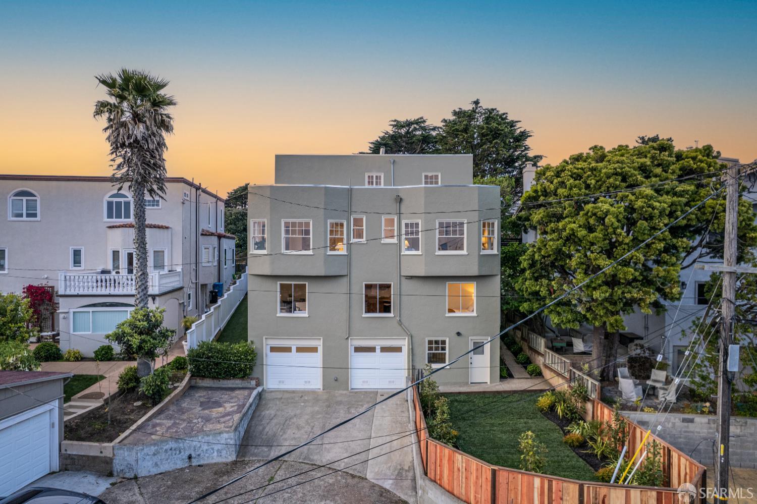 Remarkable Spanish Mediterranean view home proudly situated on a great block in the heart of the neighborhood, close to Stonestown Galleria and public transportation! An impressive, gated courtyard w/garden entrance & terrazzo staircase leads to a splendid portico w/notable front door & into a lobby-like foyer w/center-hall floor plan & convenient coat closet. Grand formal living rm w/high barrel ceiling & phenomenal half dome, five-sided bay window boasts an imposing fireplace w/classic mantel & original Batchelder tile surround, chic wall sconces, crown moldings & gorgeous parquet hardwood floors. Stunning, banquet-sized formal dining rm features recessed lighting, a striking chandelierand an arched picture window. The beautifully updated gourmet kitchen w/wonderful, adjacent breakfast rm, built-in buffet & recessed lighting showcases all stainless-steel appliances incl a four-burner gas range w/griddle, oven & hood, quartz counters, custom-painted wood cabinets w/snazzy hardware, nice pantry & enclosed laundry area. An expansive hallway with linen closet, three huge bedrooms – two w/views to the PacificOcean – & a handsome updated bath finish this floor. An attractive staircase ascends to the master suite level which enjoys a large bedroom, home office or sitting rm, a vintage tiled bath w/pedestal sink & shower over cast-iron tub & picturesque Pacific Ocean views. The lower level comprises a spectacular game rm w/fanciful theatrical stage, a terrific workout rm & a spacious guest quarters w/bedroom, en-suite full bath, walk-in closet & family rm w/gigantic wet bar. The lowest level includes a workroom/artist’s studio w/double cast-iron sink & a big two-car s/s parking garage w/built-in shelving. Fabulous landscaped backyard w/tradesman’s entrance, walkway, level lawn & lush garden w/colorful plants & trees!