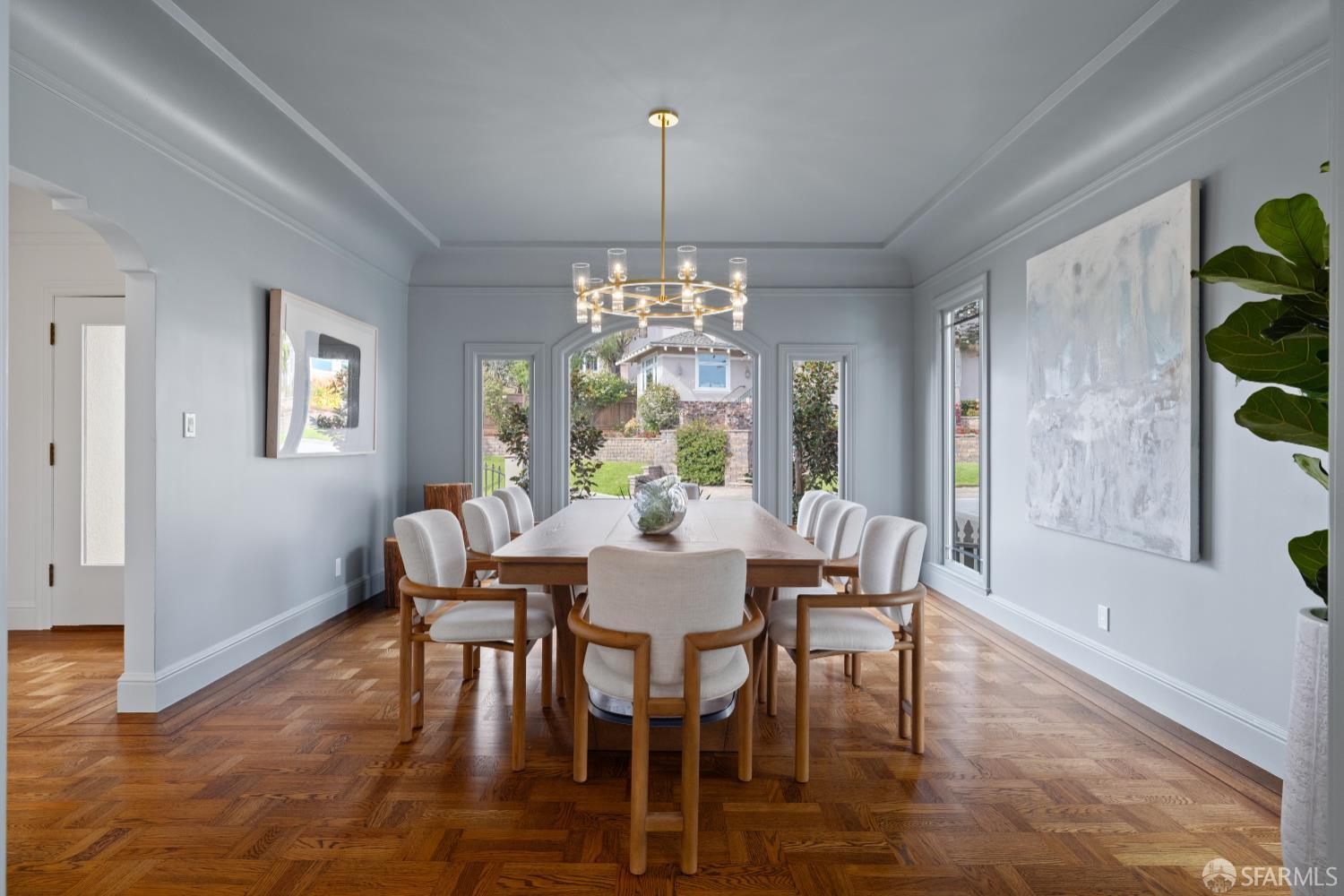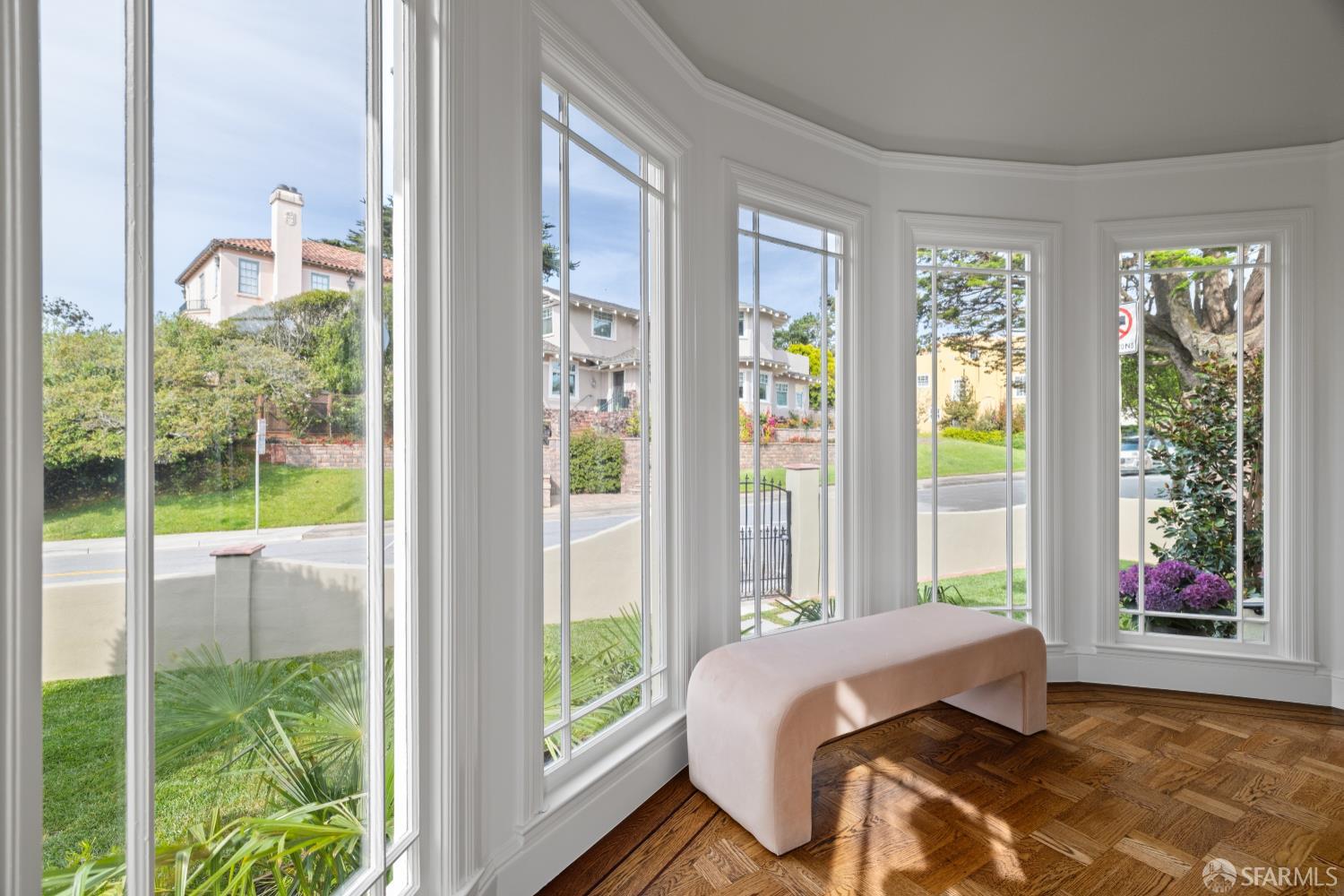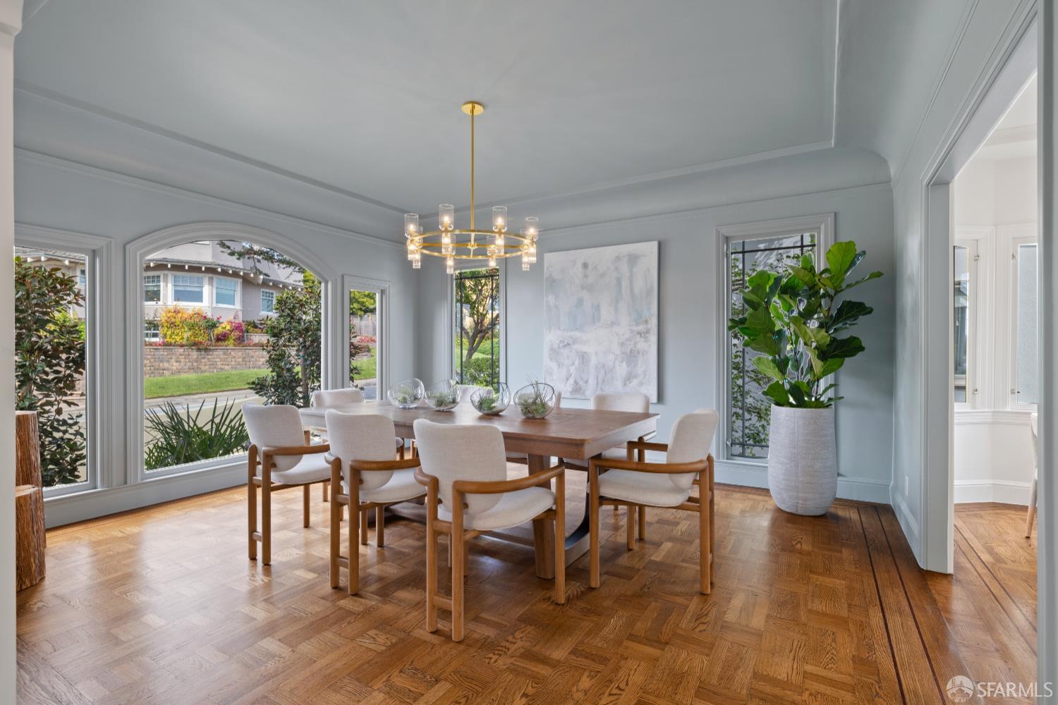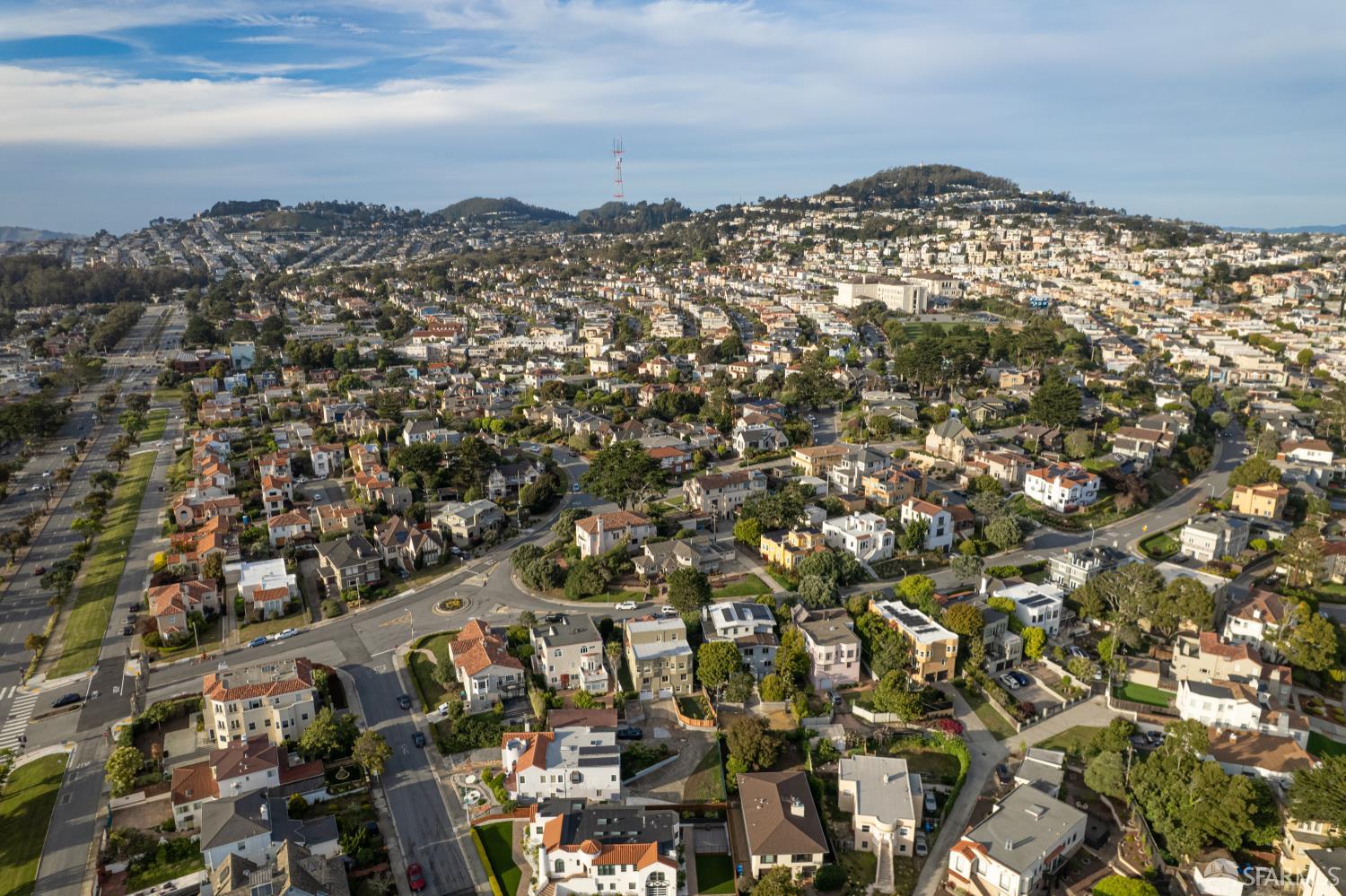 Remarkable Spanish Mediterranean view home proudly situated on a great block in the heart of the neighborhood, close to Stonestown Galleria and public transportation! An impressive, gated courtyard w/garden entrance & terrazzo staircase leads to a splendid portico w/notable front door & into a lobby-like foyer w/center-hall floor plan & convenient coat closet. Grand formal living rm w/high barrel ceiling & phenomenal half dome, five-sided bay window boasts an imposing fireplace w/classic mantel & original Batchelder tile surround, chic wall sconces, crown moldings & gorgeous parquet hardwood floors. Stunning, banquet-sized formal dining rm features recessed lighting, a striking chandelierand an arched picture window. The beautifully updated gourmet kitchen w/wonderful, adjacent breakfast rm, built-in buffet & recessed lighting showcases all stainless-steel appliances incl a four-burner gas range w/griddle, oven & hood, quartz counters, custom-painted wood cabinets w/snazzy hardware, nice pantry & enclosed laundry area. An expansive hallway with linen closet, three huge bedrooms – two w/views to the PacificOcean – & a handsome updated bath finish this floor. An attractive staircase ascends to the master suite level which enjoys a large bedroom, home office or sitting rm, a vintage tiled bath w/pedestal sink & shower over cast-iron tub & picturesque Pacific Ocean views. The lower level comprises a spectacular game rm w/fanciful theatrical stage, a terrific workout rm & a spacious guest quarters w/bedroom, en-suite full bath, walk-in closet & family rm w/gigantic wet bar. The lowest level includes a workroom/artist’s studio w/double cast-iron sink & a big two-car s/s parking garage w/built-in shelving. Fabulous landscaped backyard w/tradesman’s entrance, walkway, level lawn & lush garden w/colorful plants & trees!