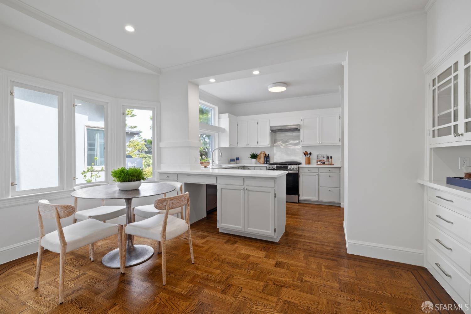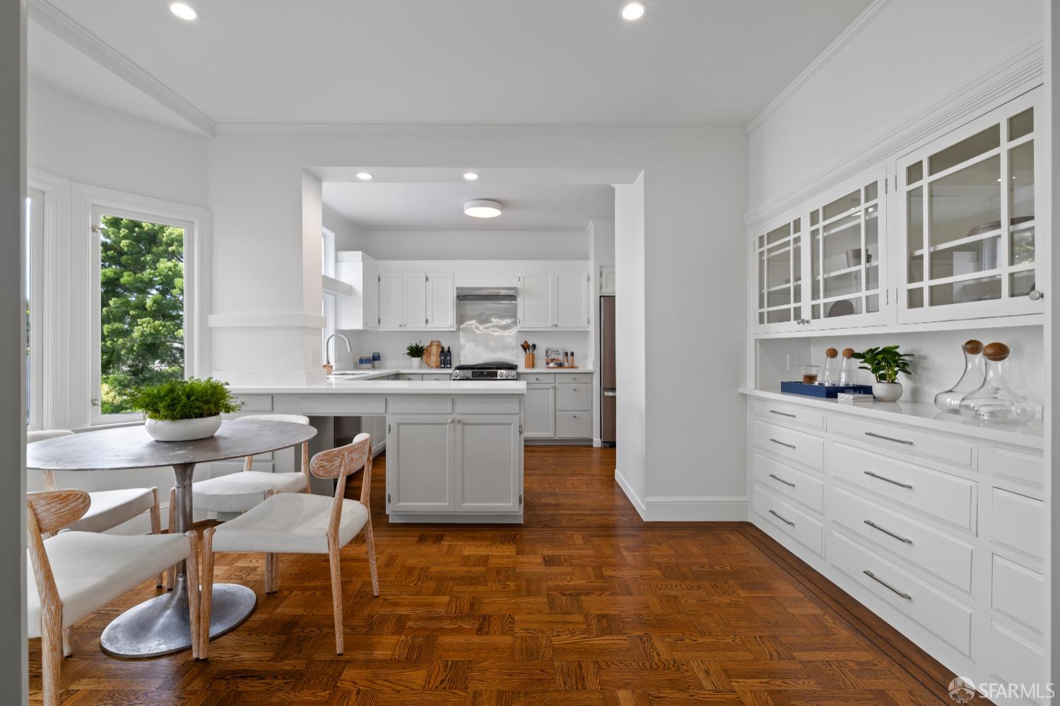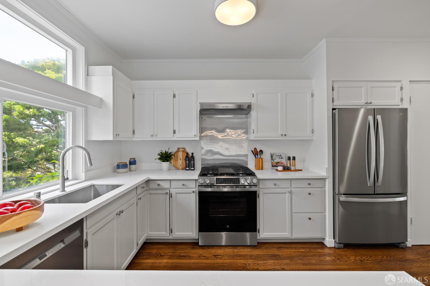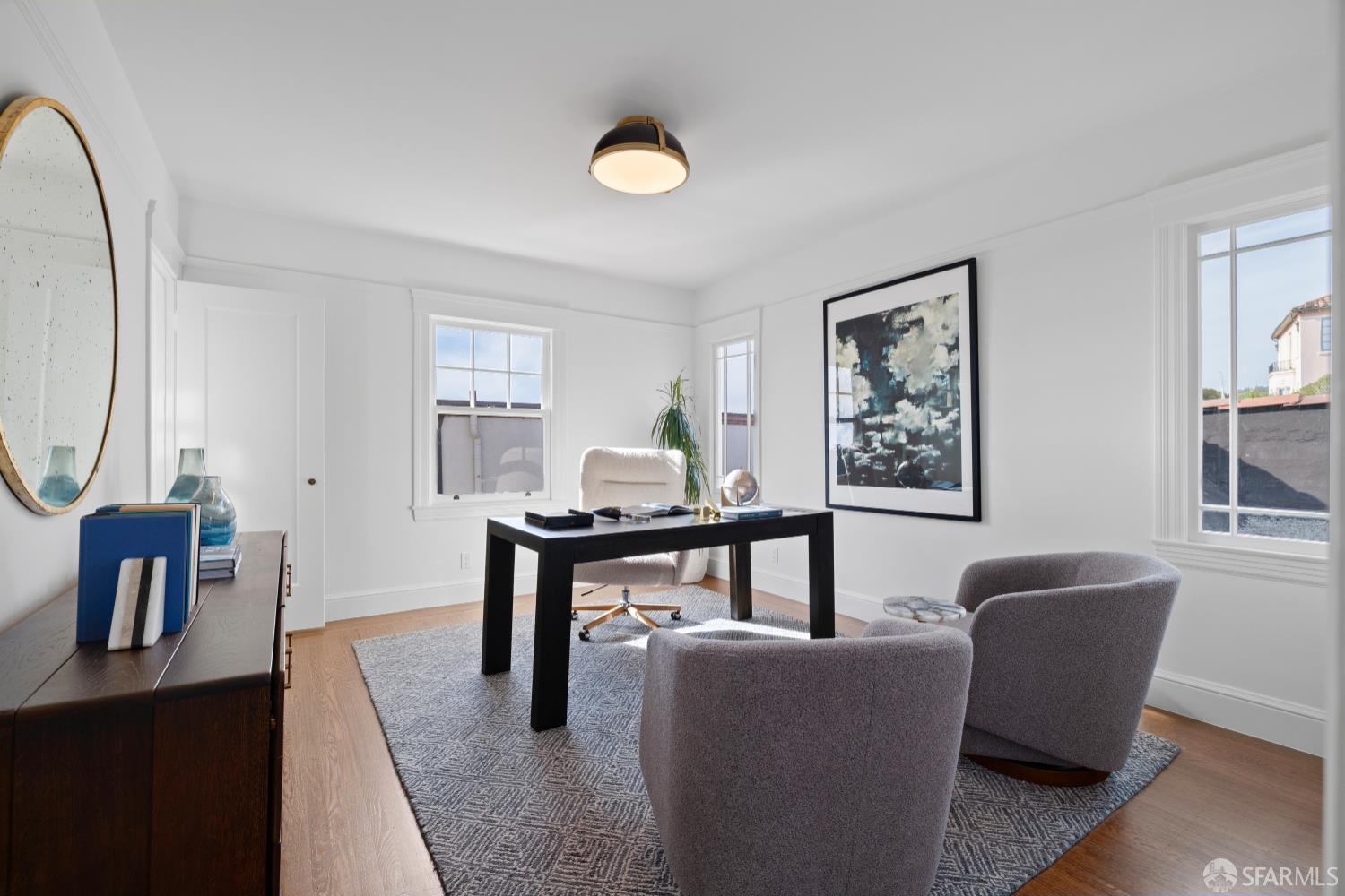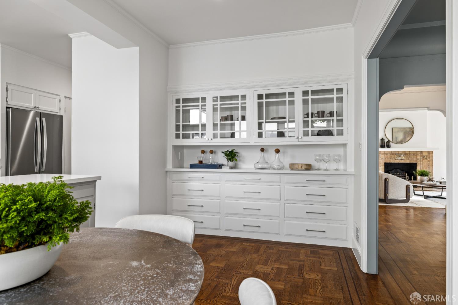 Remarkable Spanish Mediterranean view home proudly situated on a great block in the heart of the neighborhood, close to Stonestown Galleria and public transportation! An impressive, gated courtyard w/garden entrance & terrazzo staircase leads to a splendid portico w/notable front door & into a lobby-like foyer w/center-hall floor plan & convenient coat closet. Grand formal living rm w/high barrel ceiling & phenomenal half dome, five-sided bay window boasts an imposing fireplace w/classic mantel & original Batchelder tile surround, chic wall sconces, crown moldings & gorgeous parquet hardwood floors. Stunning, banquet-sized formal dining rm features recessed lighting, a striking chandelierand an arched picture window. The beautifully updated gourmet kitchen w/wonderful, adjacent breakfast rm, built-in buffet & recessed lighting showcases all stainless-steel appliances incl a four-burner gas range w/griddle, oven & hood, quartz counters, custom-painted wood cabinets w/snazzy hardware, nice pantry & enclosed laundry area. An expansive hallway with linen closet, three huge bedrooms – two w/views to the PacificOcean – & a handsome updated bath finish this floor. An attractive staircase ascends to the master suite level which enjoys a large bedroom, home office or sitting rm, a vintage tiled bath w/pedestal sink & shower over cast-iron tub & picturesque Pacific Ocean views. The lower level comprises a spectacular game rm w/fanciful theatrical stage, a terrific workout rm & a spacious guest quarters w/bedroom, en-suite full bath, walk-in closet & family rm w/gigantic wet bar. The lowest level includes a workroom/artist’s studio w/double cast-iron sink & a big two-car s/s parking garage w/built-in shelving. Fabulous landscaped backyard w/tradesman’s entrance, walkway, level lawn & lush garden w/colorful plants & trees!