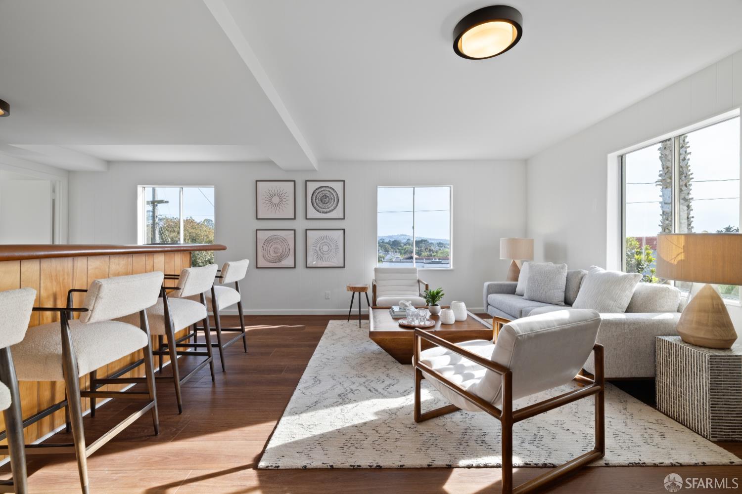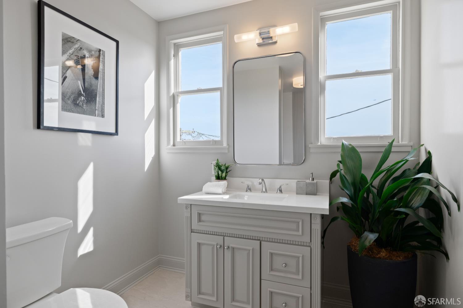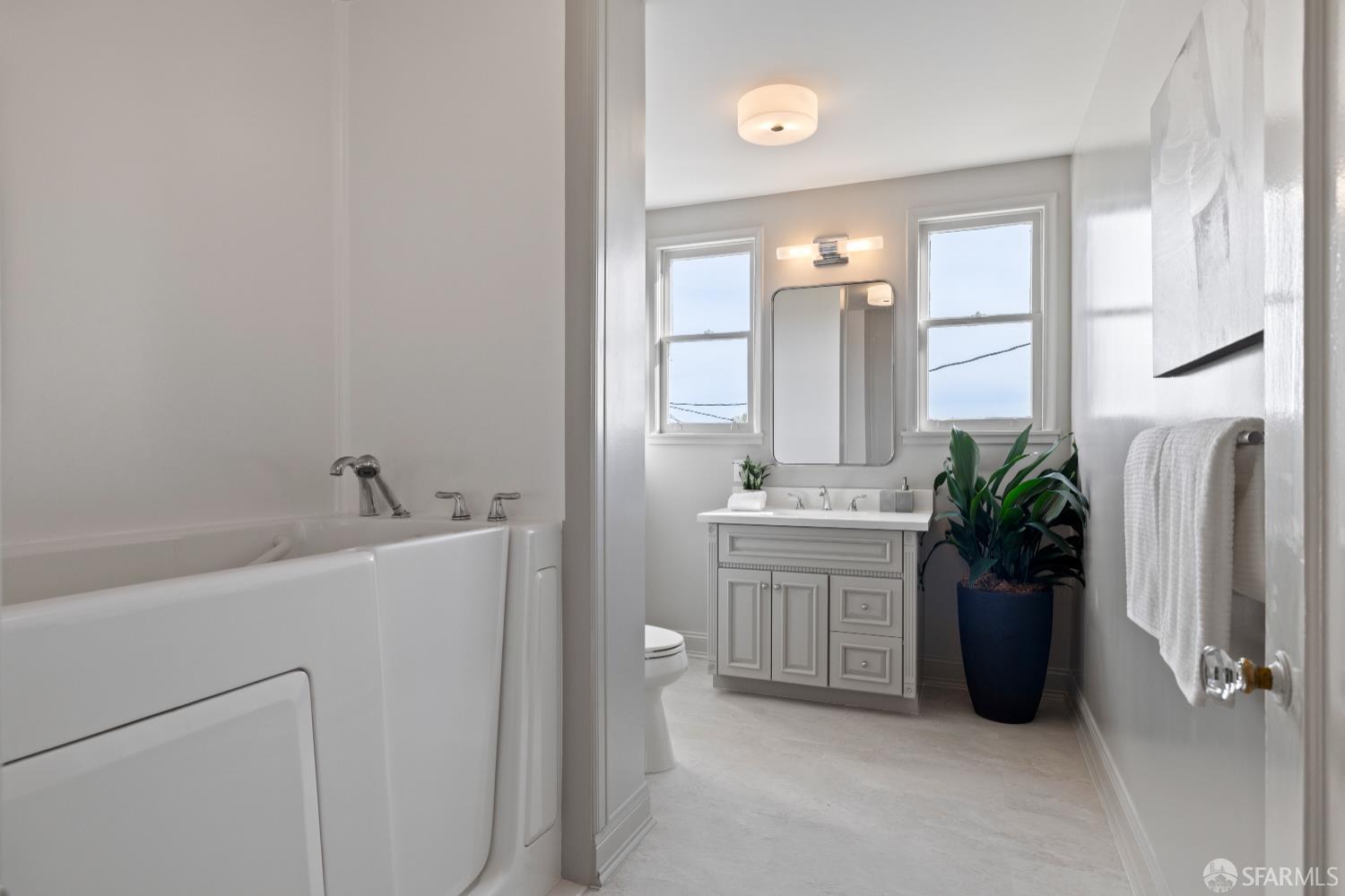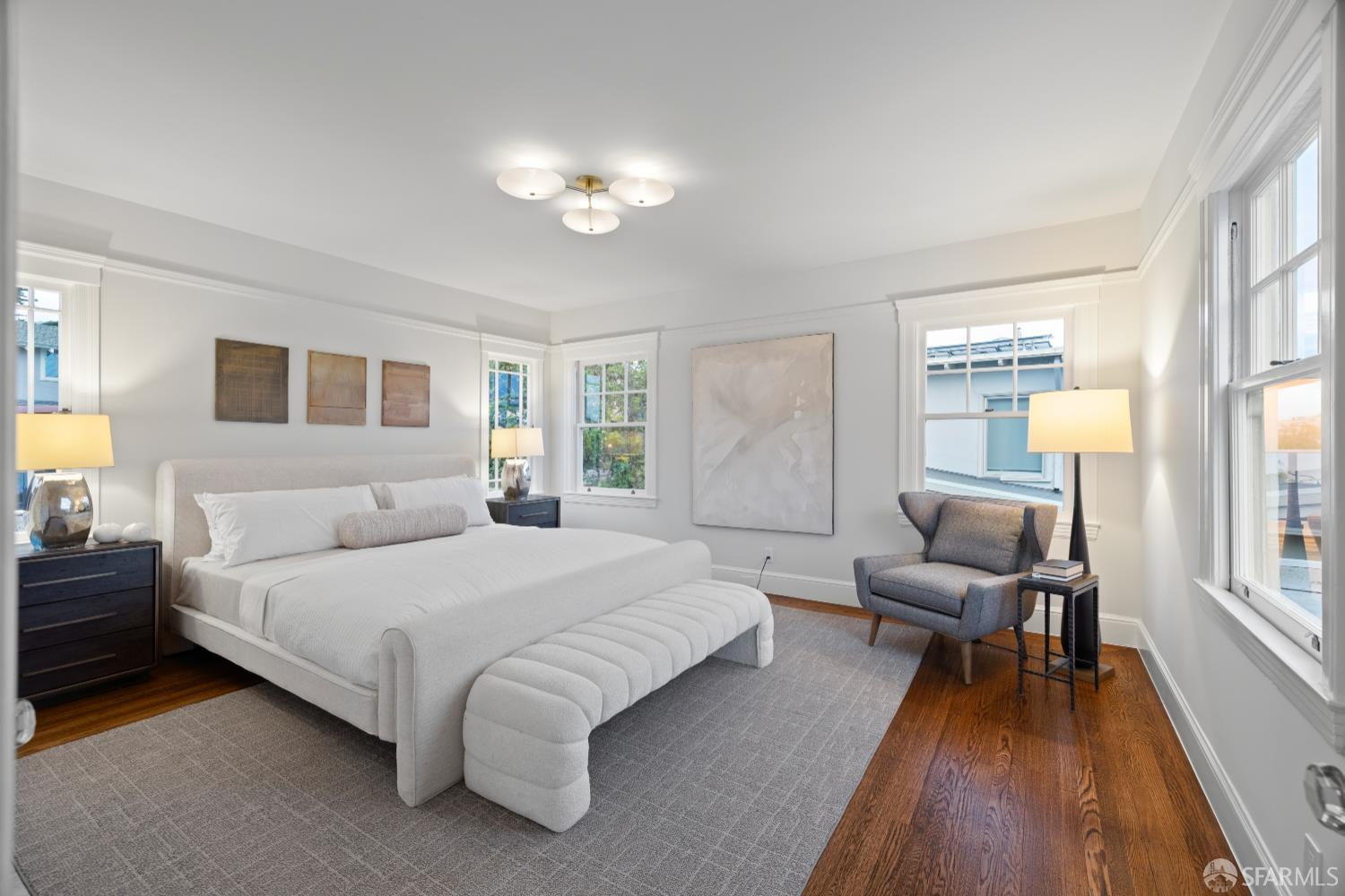 Remarkable Spanish Mediterranean view home proudly situated on a great block in the heart of the neighborhood, close to Stonestown Galleria and public transportation! An impressive, gated courtyard w/garden entrance & terrazzo staircase leads to a splendid portico w/notable front door & into a lobby-like foyer w/center-hall floor plan & convenient coat closet. Grand formal living rm w/high barrel ceiling & phenomenal half dome, five-sided bay window boasts an imposing fireplace w/classic mantel & original Batchelder tile surround, chic wall sconces, crown moldings & gorgeous parquet hardwood floors. Stunning, banquet-sized formal dining rm features recessed lighting, a striking chandelierand an arched picture window. The beautifully updated gourmet kitchen w/wonderful, adjacent breakfast rm, built-in buffet & recessed lighting showcases all stainless-steel appliances incl a four-burner gas range w/griddle, oven & hood, quartz counters, custom-painted wood cabinets w/snazzy hardware, nice pantry & enclosed laundry area. An expansive hallway with linen closet, three huge bedrooms – two w/views to the PacificOcean – & a handsome updated bath finish this floor. An attractive staircase ascends to the master suite level which enjoys a large bedroom, home office or sitting rm, a vintage tiled bath w/pedestal sink & shower over cast-iron tub & picturesque Pacific Ocean views. The lower level comprises a spectacular game rm w/fanciful theatrical stage, a terrific workout rm & a spacious guest quarters w/bedroom, en-suite full bath, walk-in closet & family rm w/gigantic wet bar. The lowest level includes a workroom/artist’s studio w/double cast-iron sink & a big two-car s/s parking garage w/built-in shelving. Fabulous landscaped backyard w/tradesman’s entrance, walkway, level lawn & lush garden w/colorful plants & trees!