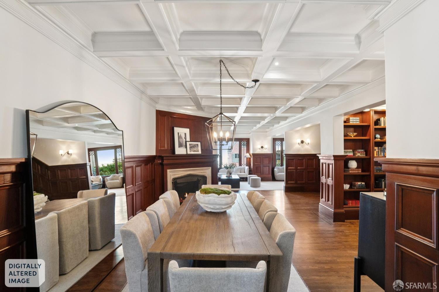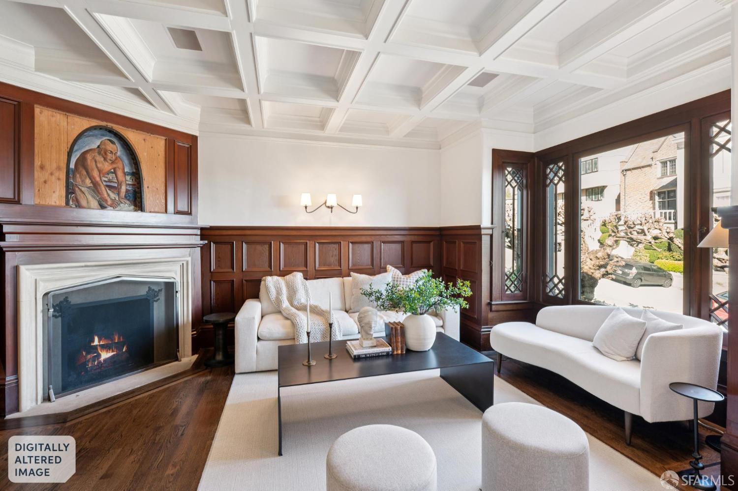 Step into this stately home originally designed by Oliver Everett and you are welcomed by elegant wood paneling that exudes timeless sophistication. Within the walls of this distinguished residence, lies a remarkable 1930s hidden fresco, concealed for decades, believed to be attributed to Bolivian-born artist Antonio Sotomayor. His esteemed murals adorn notable landmarks such as The Palace Hotel, Grace Cathedral, and The Bohemian Club. This exquisite fresco may have been completed in collaboration with his assistant Mona Hofmann, renowned for her association with Diego Rivera. The social rooms are thoughtfully curated with a view of the Bay and offers the perfect setting for both refined entertaining and serene moments of quiet relaxation. The gracious dining room, complemented by a nearby den lined with bookshelves, adds a layer of warmth and interest that enhances the overall ambiance. The heart of the home is a classic chef’s kitchen lined with ample cabinetry, marble counters and a central island with a convenient sink. The impressive six-burner Thermador stove plus grill and double ovens will support the preparation of large meals, while the adjacent sitting and breakfast area in the light filled atrium with glass ceiling invites outlooks of the surrounding trees.The opulent primary suite features a private den, fireplace, generous closets, and a serene bath with both soaking tub and steam shower. This level is complimented by a second bedroom and full bathroom and also boasts an light-filled bonus space with French doors leading to the terrace. The top level features a third bedroom, a full bathroom, and an additional room with sweeping views of the Bay ideal for a home office.This residence includes one car parking in the garage and space for a second car in the driveway. There is an elevator that travels from the garage to the third floor. A must see home in an idyllic Pacific Heights location near parks, schools, dining and shopping.