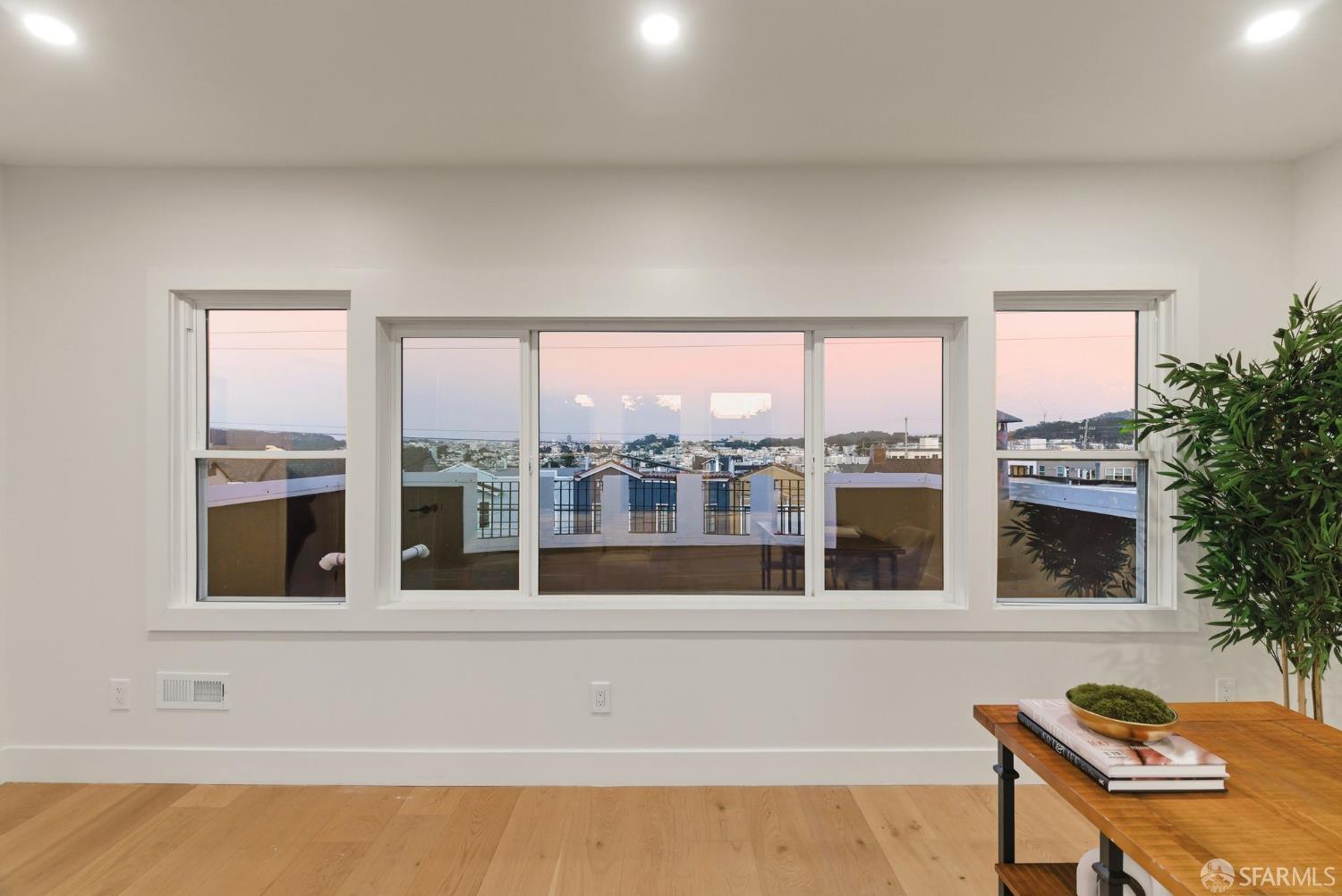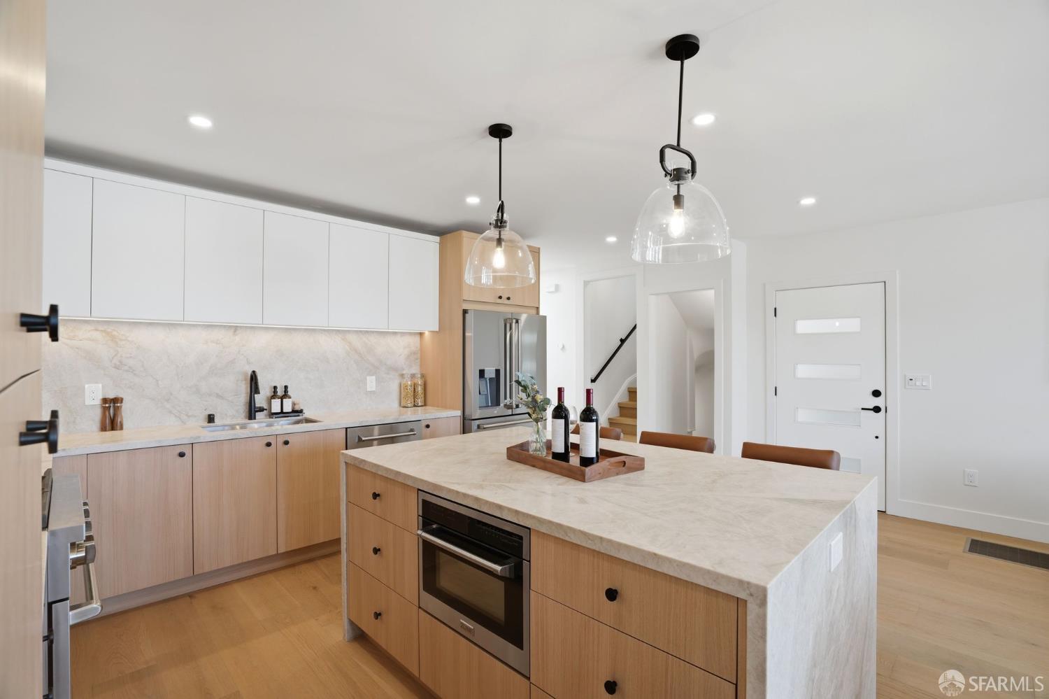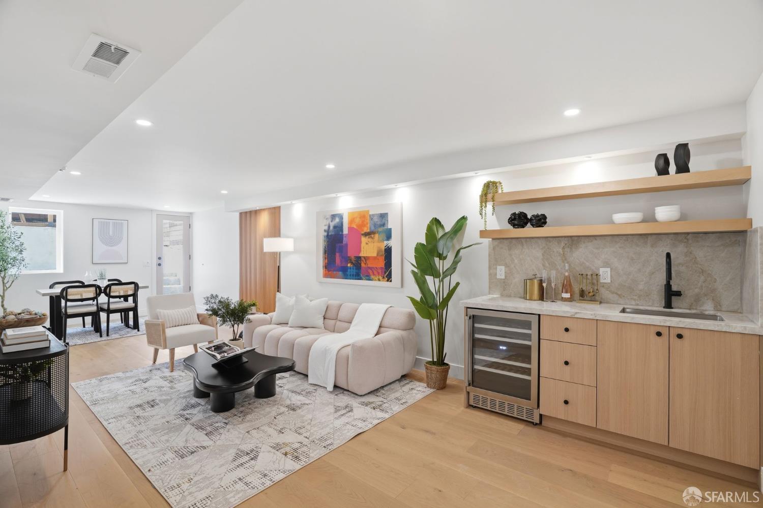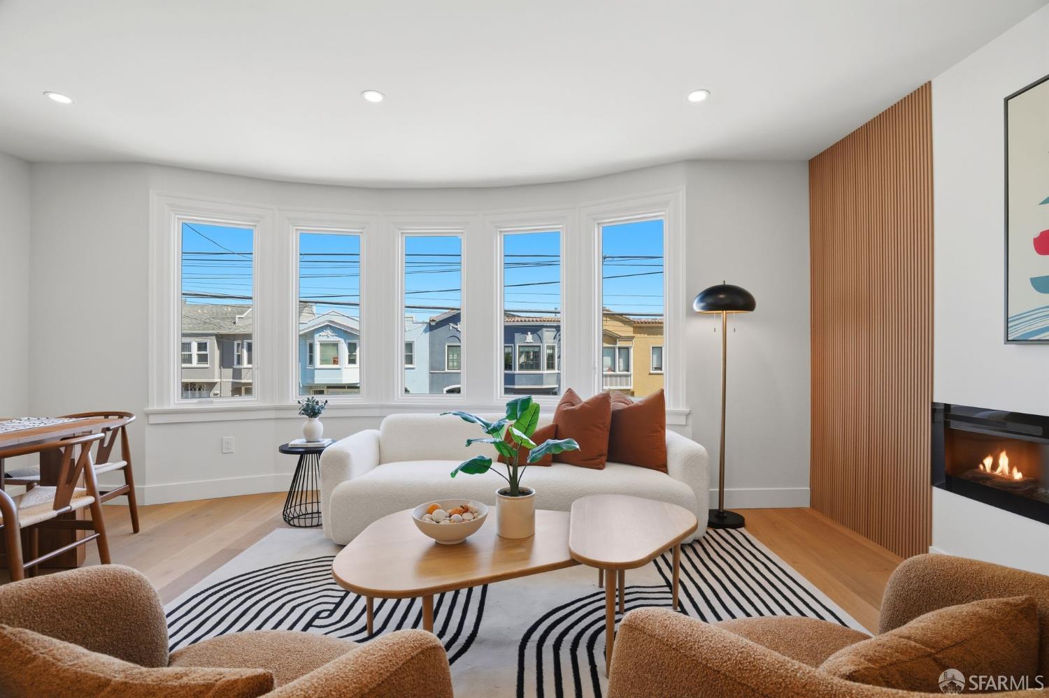 Extensively renovated Central Richmond District residence offering a highly functional, flexible floor plan and curated finishes throughout. The main level features three spacious bedrooms and three bathrooms, ideal for families and modern living. The open living and dining areas are anchored by a custom fireplace and flow seamlessly into a chef’s kitchen with custom cabinetry, Taj Mahal quartzite countertops, ZLINE appliances, and wide-plank engineered wood flooring. The lower level features a private owner’s suite with walk-in closet, wet bar, family room, and direct yard access, along with a powder room and dedicated laundry area, offering flexibility for guests or additional living space. The upper level offers a versatile room suitable as a bedroom, office, or media space, enjoying open city skyline views from Downtown SF to Sutro Tower. Additional highlights include designer finishes, porcelain tile baths, a beautifully landscaped backyard, and a spacious one-car garage with ample storage. Conveniently located near the Balboa Village corridor, neighborhood schools, parks, dining, and transit, this home blends thoughtful renovation, modern luxury, and classic San Francisco architecture.