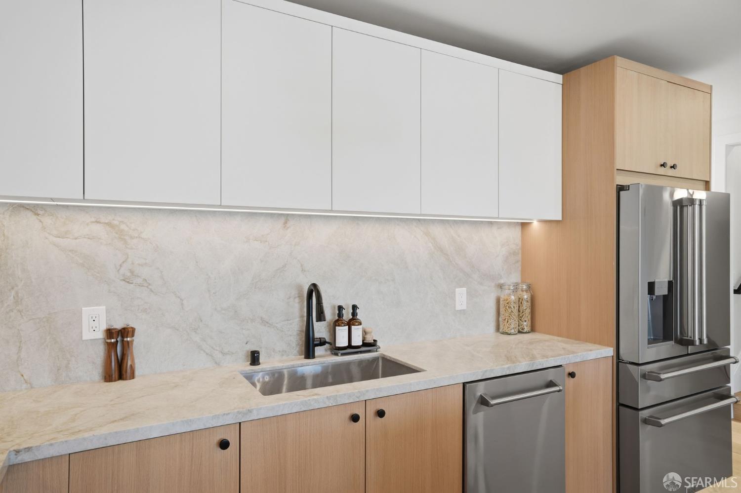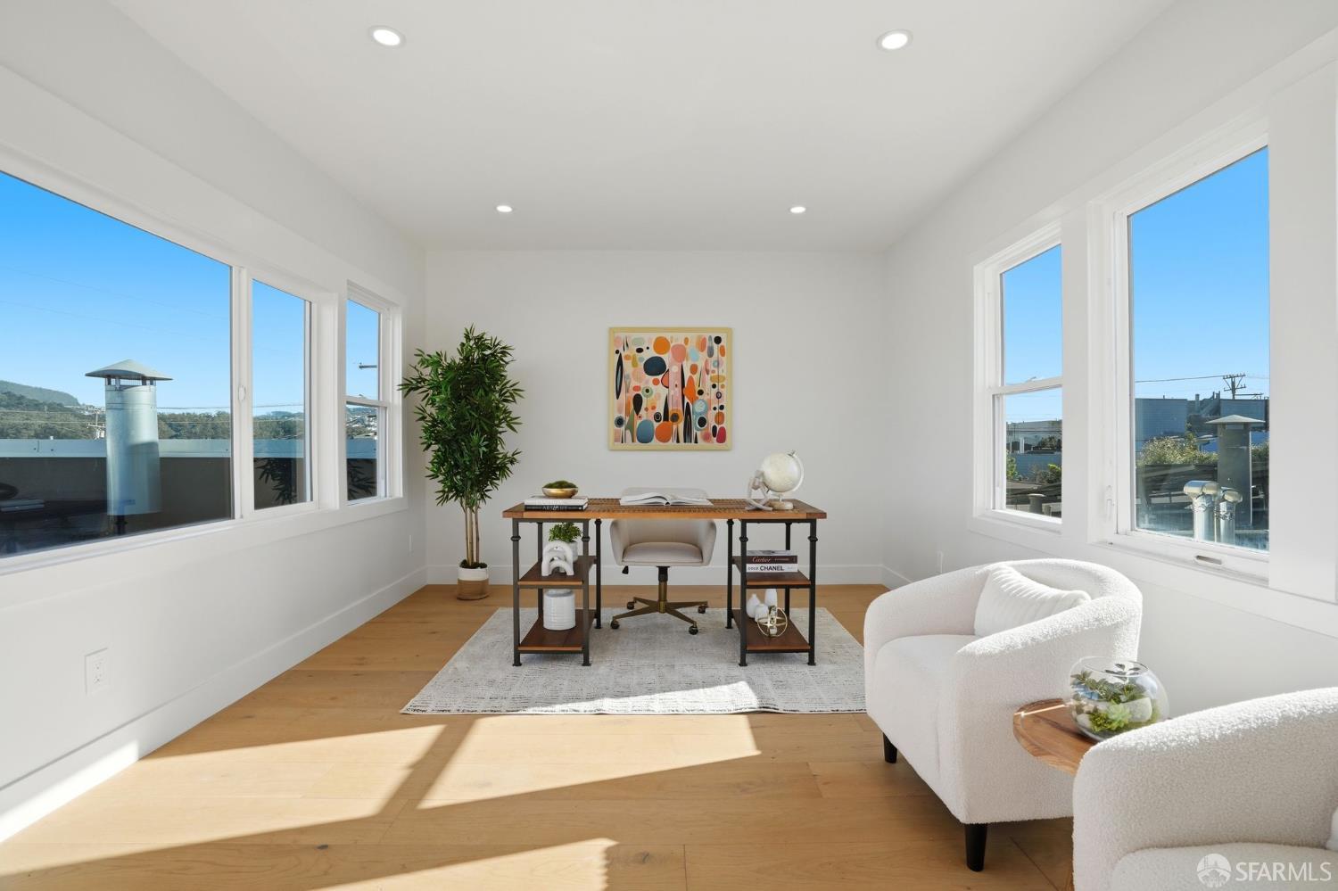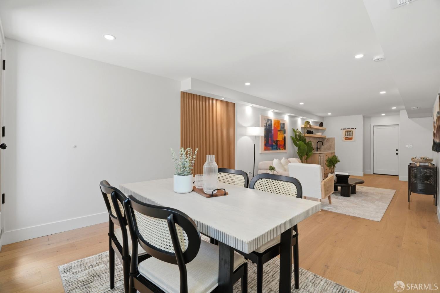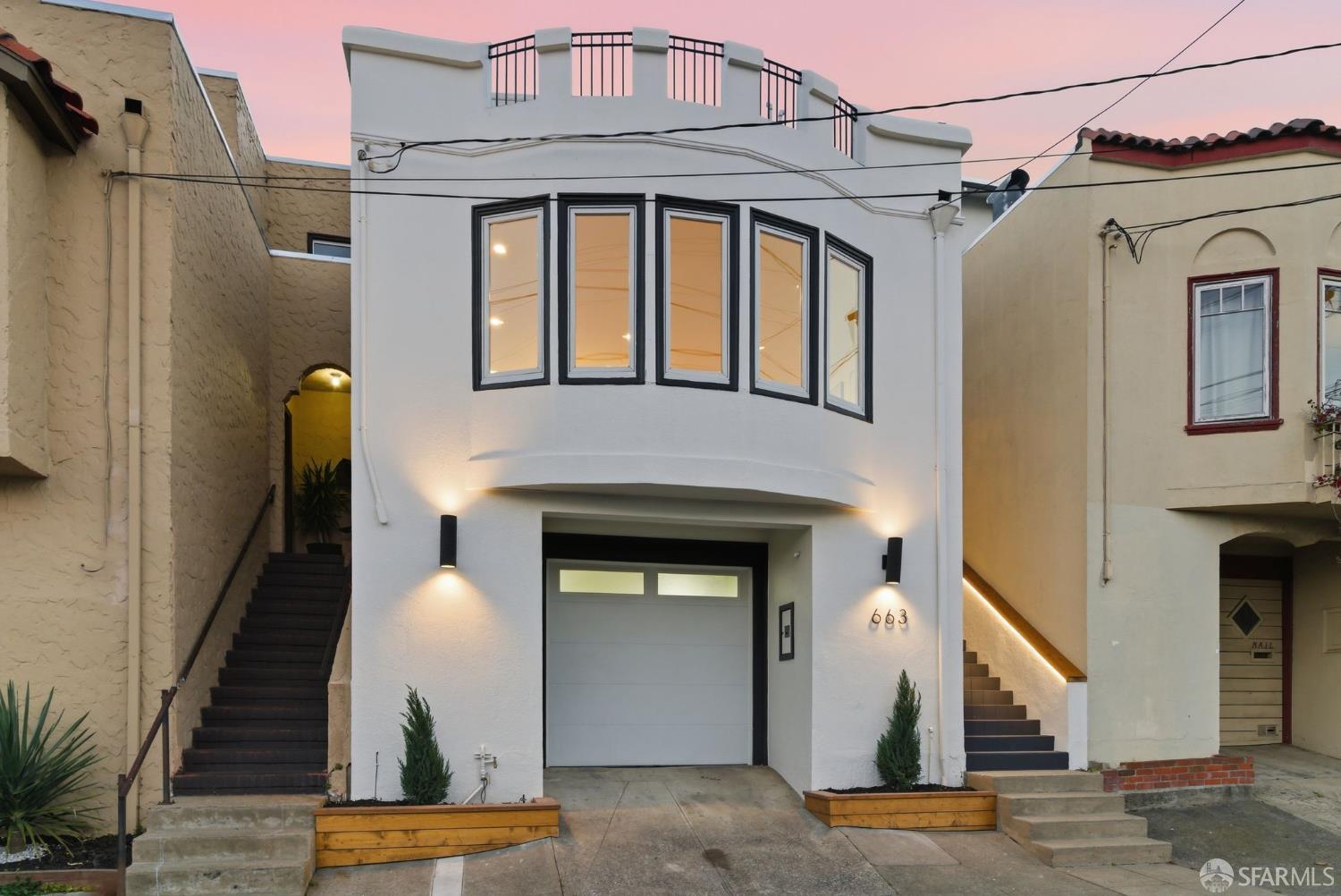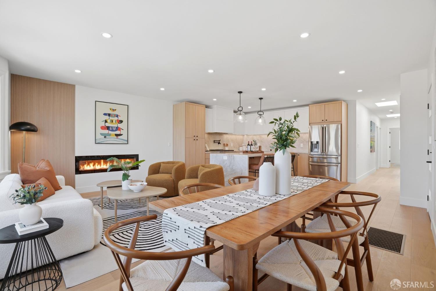 Extensively renovated Central Richmond District residence offering a highly functional, flexible floor plan and curated finishes throughout. The main level features three spacious bedrooms and three bathrooms, ideal for families and modern living. The open living and dining areas are anchored by a custom fireplace and flow seamlessly into a chef’s kitchen with custom cabinetry, Taj Mahal quartzite countertops, ZLINE appliances, and wide-plank engineered wood flooring. The lower level features a private owner’s suite with walk-in closet, wet bar, family room, and direct yard access, along with a powder room and dedicated laundry area, offering flexibility for guests or additional living space. The upper level offers a versatile room suitable as a bedroom, office, or media space, enjoying open city skyline views from Downtown SF to Sutro Tower. Additional highlights include designer finishes, porcelain tile baths, a beautifully landscaped backyard, and a spacious one-car garage with ample storage. Conveniently located near the Balboa Village corridor, neighborhood schools, parks, dining, and transit, this home blends thoughtful renovation, modern luxury, and classic San Francisco architecture.