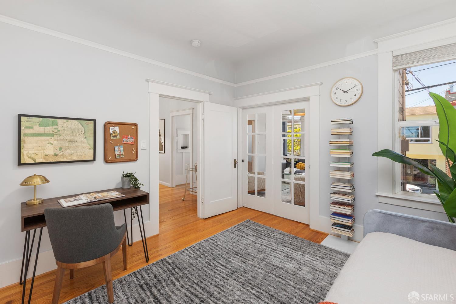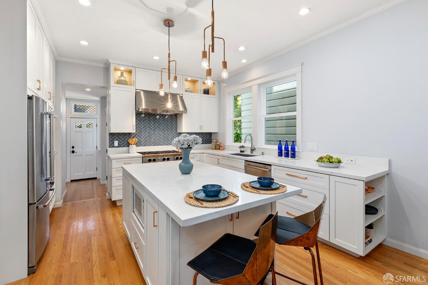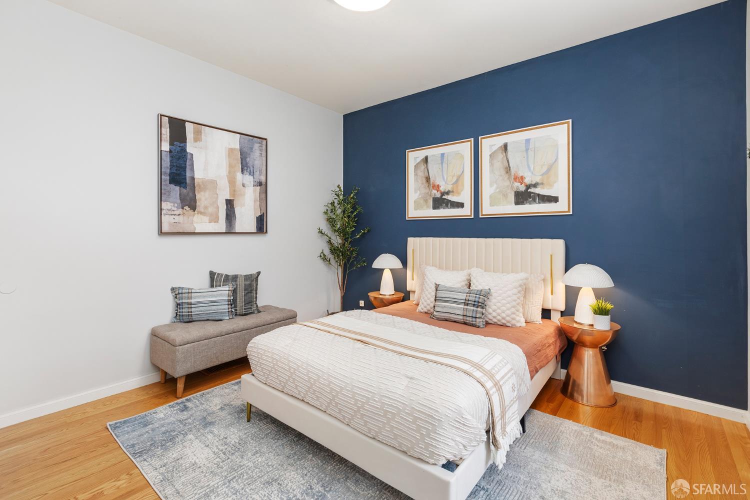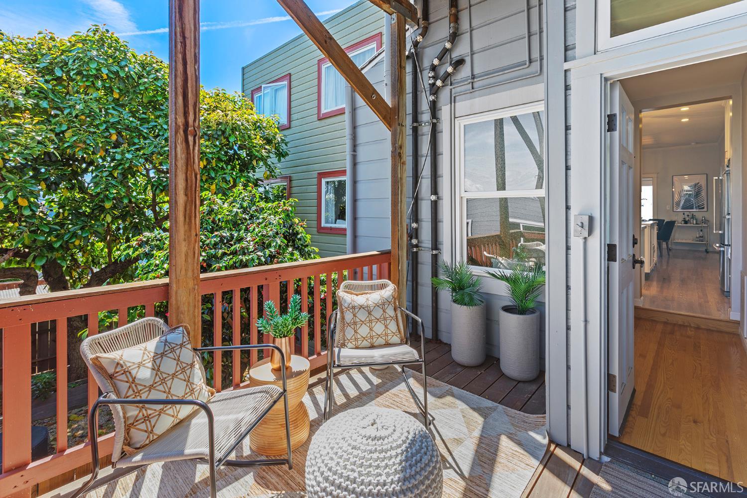 Move right into this well-appointed condo in a smaller, two-unit building on Bernal’s coveted North Slope, just steps from the heart of Cortland Avenue. An entry hall leads to a bright living room with gas fireplace, while pocket doors open to a spacious bedroom that’s a perfect spot for those work-from-home days. Classic architectural details like high ceilings, built-ins and hardwood floors create an authentic San Francisco vibe. The dining area is open to the remodeled kitchen. The centerpiece is the large island with ample storage, microwave nook and wine refrigerator. Premium appliances include a BlueStar six-burner range, Best hood, Miele double oven and Bosch dishwasher. Extensive soft-close cabinetry, clever storage and utility features, stone countertops, Fireclay Tile backsplash and a deep stainless-steel sink round out this exceptional space. At the rear of the home, the primary suite has a large closet with organizer system. The en suite bath has a marble shower with a built-in bench and heated floors. A versatile third bedroom provides additional flexibility for guests or workspace needs. The second, remodeled full bathroom features a shower over tub, eye-catching hexagonal tile flooring and a stone-top vanity. There’s direct access from the hall to a private deck where you can dine al fresco in Bernal’s sunny microclimate, or just take a break with some coffee in the afternoon. Additional amenities include two generous storage areas, independent parking and exclusive-use laundry in the garage. This phenomenal neighborhood location is few doors up from Cortland and its indie shops, restaurants, public library, markets and cafes. Excellent proximity to parks, playgrounds, Alemany Farmer’s Market and freeway access.