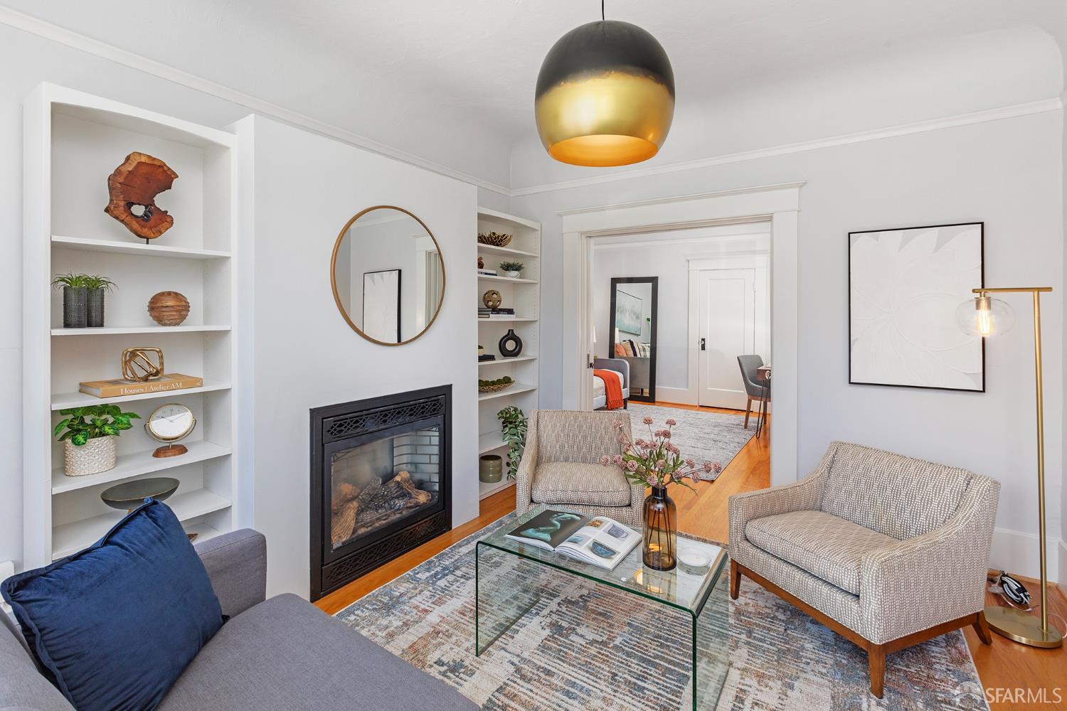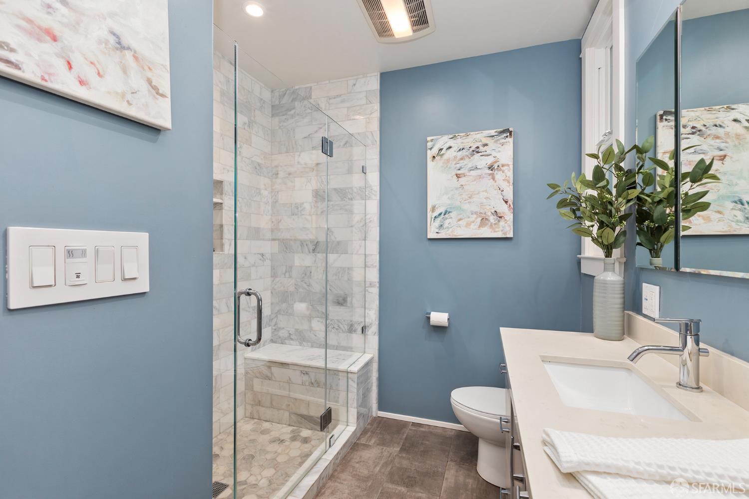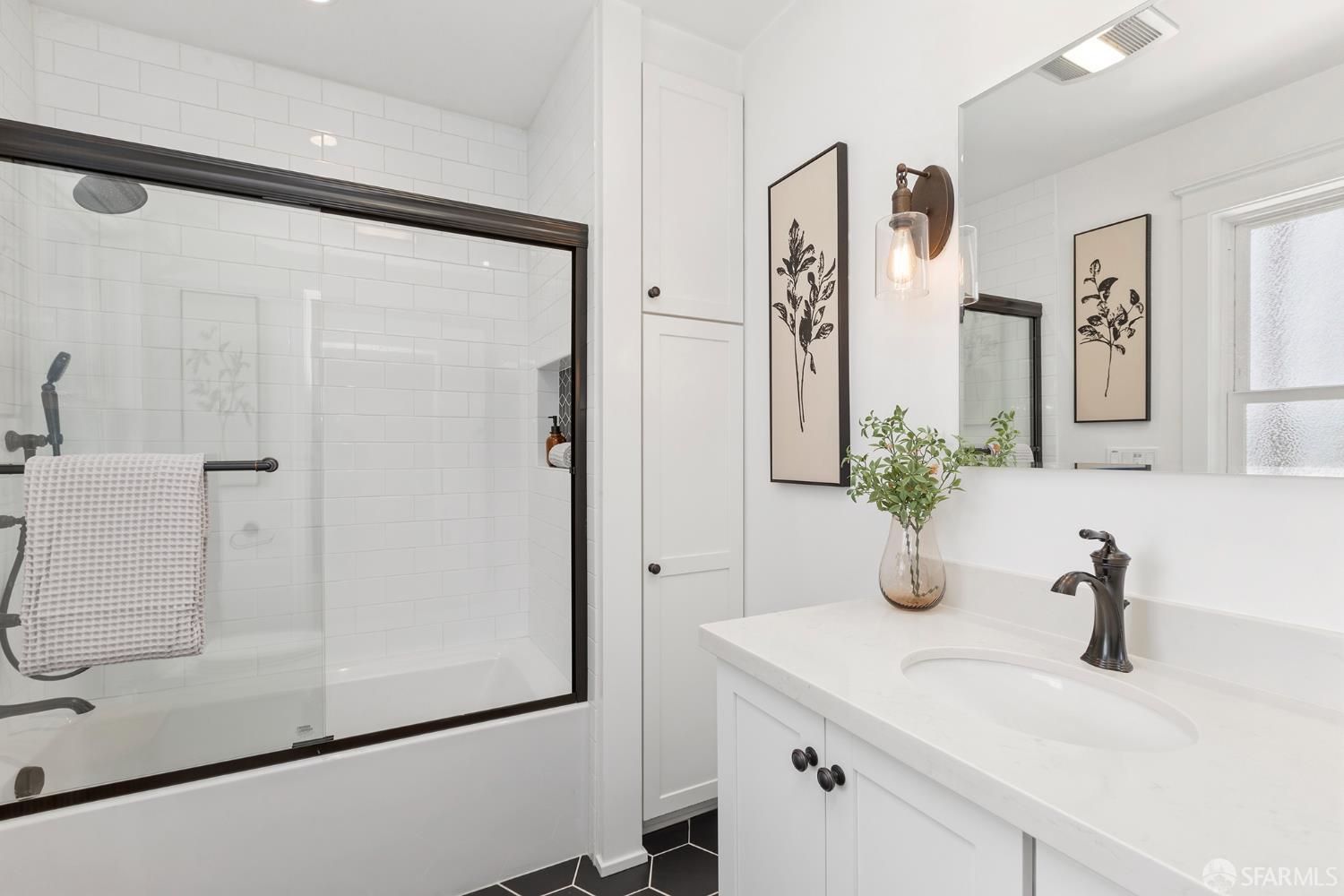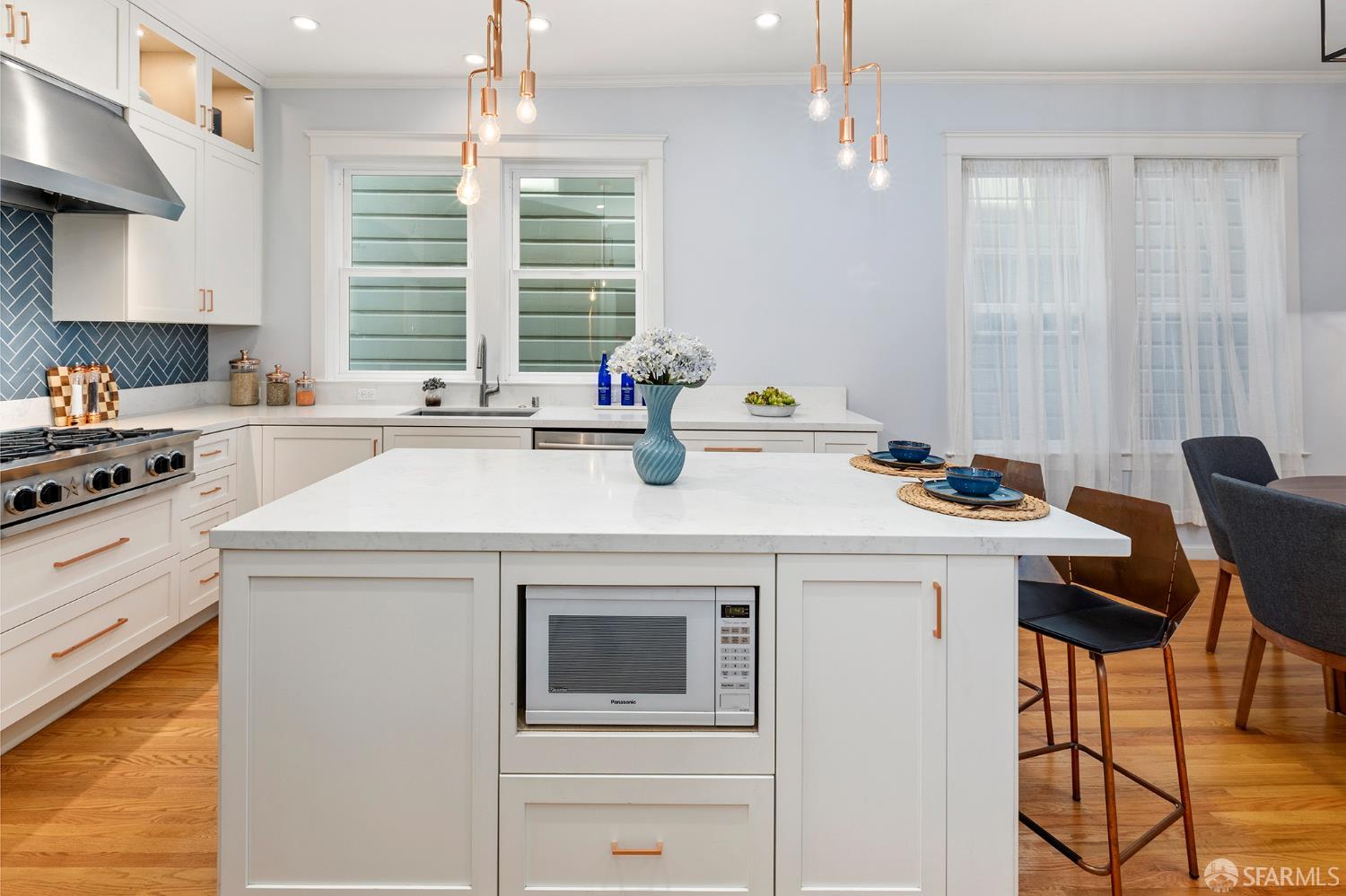 Move right into this well-appointed condo in a smaller, two-unit building on Bernal’s coveted North Slope, just steps from the heart of Cortland Avenue. An entry hall leads to a bright living room with gas fireplace, while pocket doors open to a spacious bedroom that’s a perfect spot for those work-from-home days. Classic architectural details like high ceilings, built-ins and hardwood floors create an authentic San Francisco vibe. The dining area is open to the remodeled kitchen. The centerpiece is the large island with ample storage, microwave nook and wine refrigerator. Premium appliances include a BlueStar six-burner range, Best hood, Miele double oven and Bosch dishwasher. Extensive soft-close cabinetry, clever storage and utility features, stone countertops, Fireclay Tile backsplash and a deep stainless-steel sink round out this exceptional space. At the rear of the home, the primary suite has a large closet with organizer system. The en suite bath has a marble shower with a built-in bench and heated floors. A versatile third bedroom provides additional flexibility for guests or workspace needs. The second, remodeled full bathroom features a shower over tub, eye-catching hexagonal tile flooring and a stone-top vanity. There’s direct access from the hall to a private deck where you can dine al fresco in Bernal’s sunny microclimate, or just take a break with some coffee in the afternoon. Additional amenities include two generous storage areas, independent parking and exclusive-use laundry in the garage. This phenomenal neighborhood location is few doors up from Cortland and its indie shops, restaurants, public library, markets and cafes. Excellent proximity to parks, playgrounds, Alemany Farmer’s Market and freeway access.