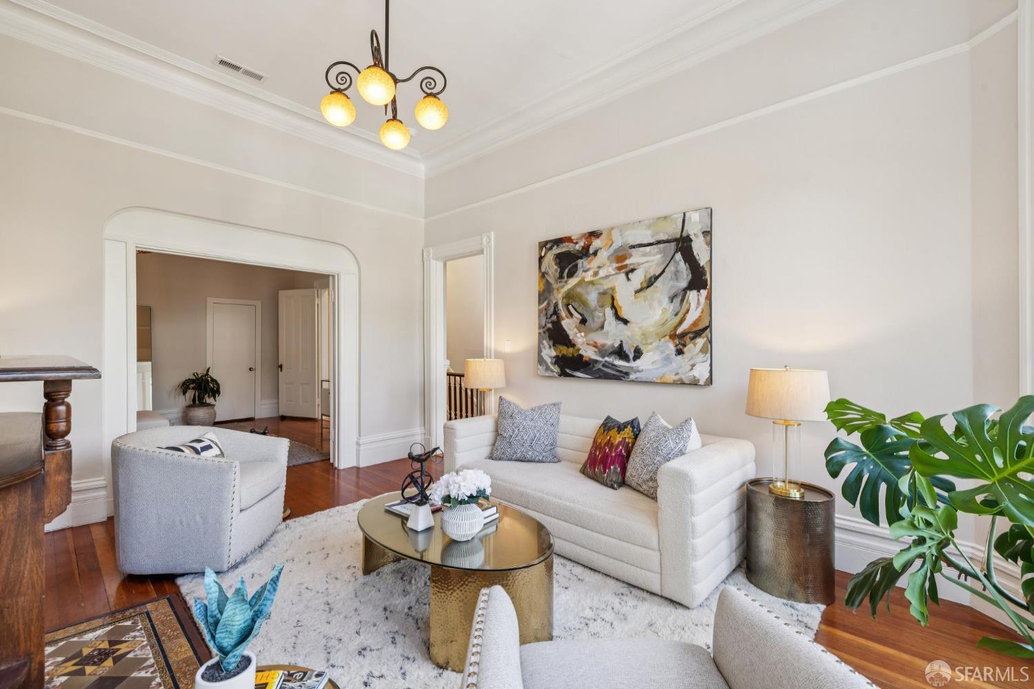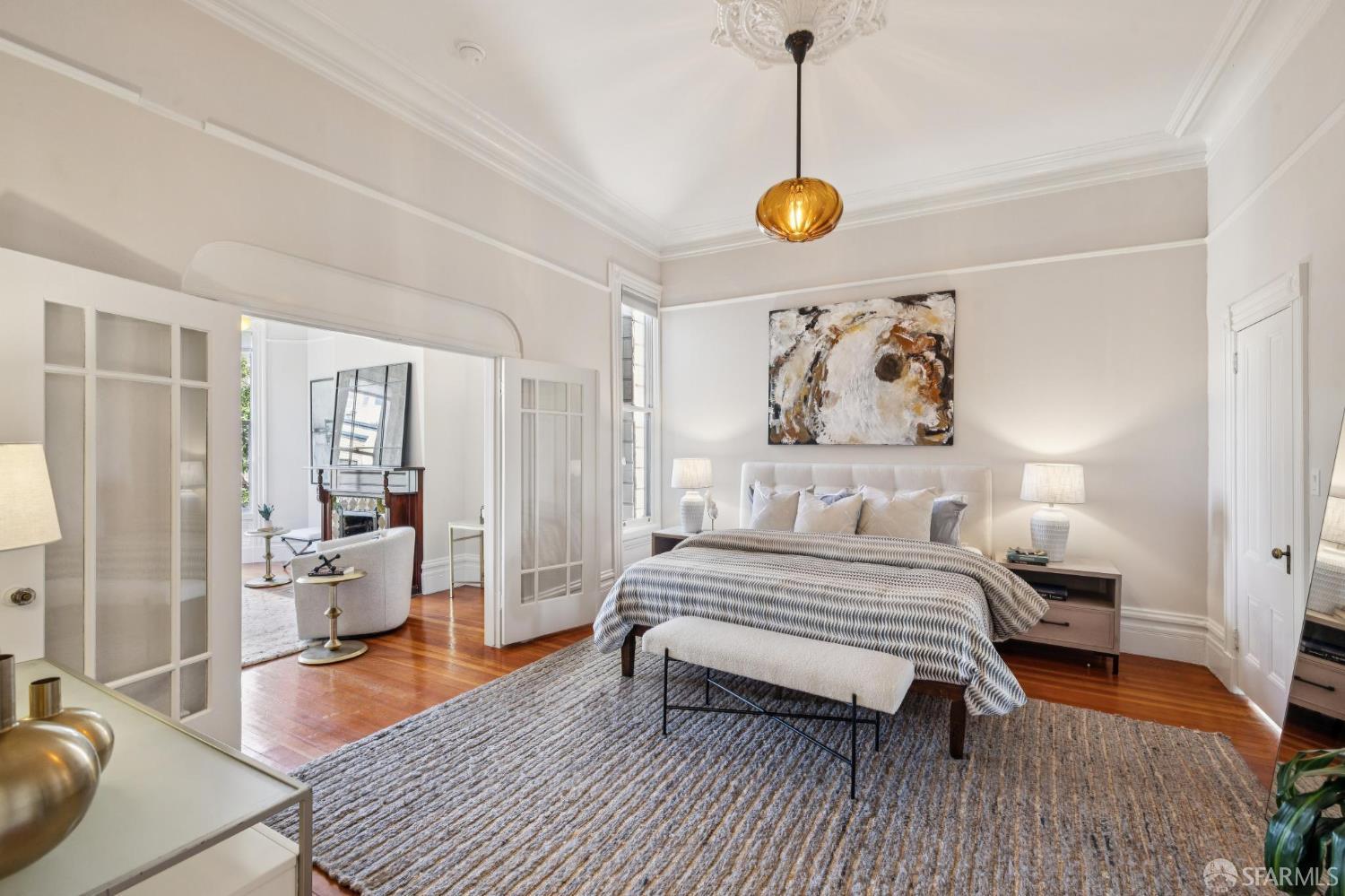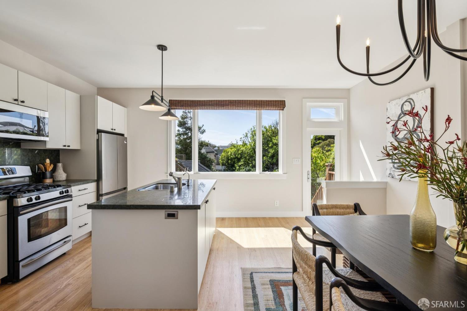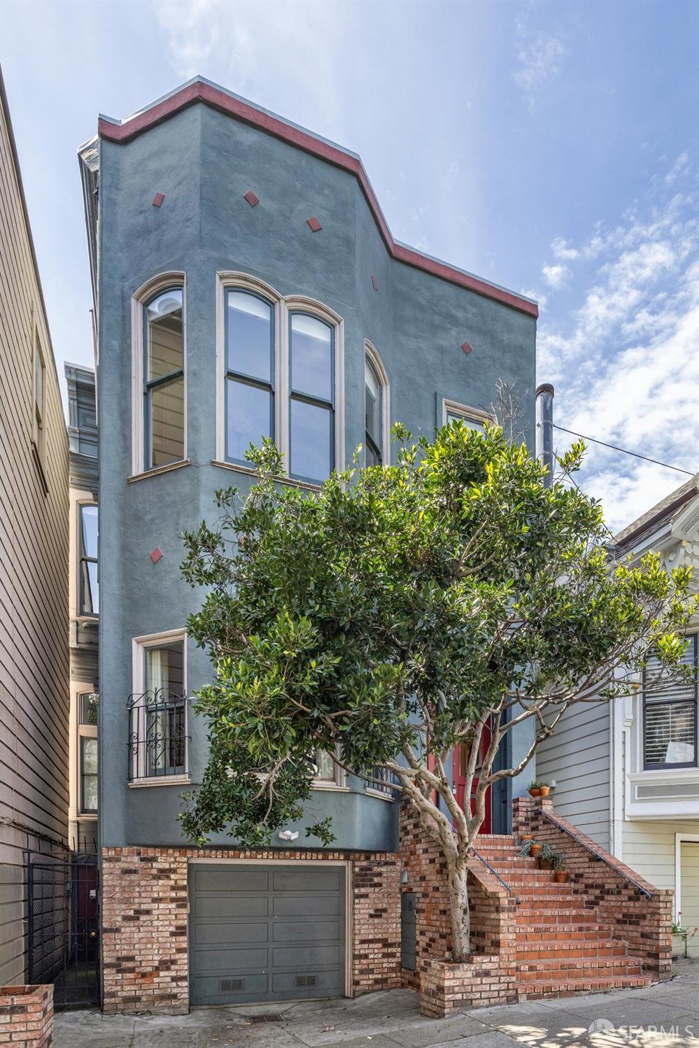 Charming top-floor, full-floor Victorian condominium in a boutique 2-unit building just a half a block from Alamo Square Park. Rich in period detail and scale, this home blends timeless character with modern living. A gracious stair ascent, lined with classic wainscoting and illuminated by a stained-glass skylight, sets the tone. Inside, soaring ceilings, oak and fir floors, and elegant moldings create a warm and elegant backdrop. The expansive front living room features a fireplace with a whimsical tile surround and wood mantle, and east-facing bay windows. An inviting family room with a fireplace connects to a spacious eat-in kitchen equipped with a large dining area, center island, stone countertops, stainless appliances, pantry cabinet, and treetop outlooks. Down the hall, a primary suite has a chic ensuite bath with shower over clawfoot tub, a 2nd bedroom has an ensuite bath with shower and French doors, and the 3rd bedroom is ideal as an office/nursery. 1-car garage parking (side-by-side), a deeded storage area/home gym, shared laundry, and a beautifully landscaped shared yard with firepit complete the amenities. Live the ultimate SF lifestyle just moments from the greenery of Alamo Square Park and Golden Gate Park Panhandle and neighborhood favorites like Lucinda’s Deli, Bi-Rite Market, NOPA, and Bar Crudo, with easy access to the Panhandle, Muni, and the Wiggle.