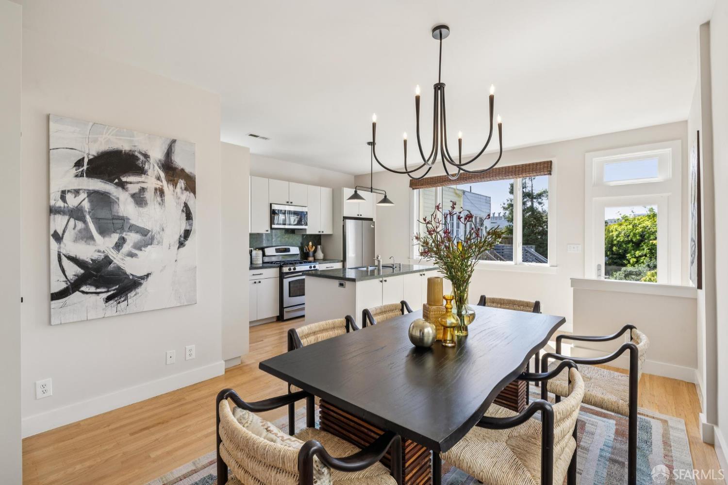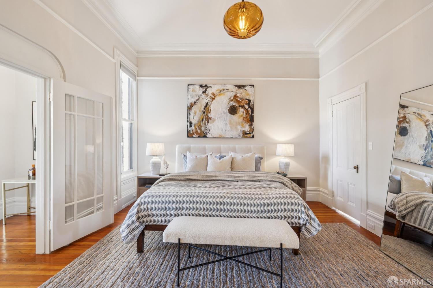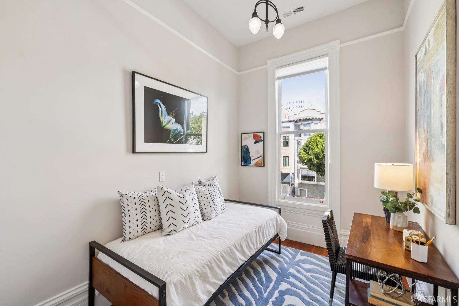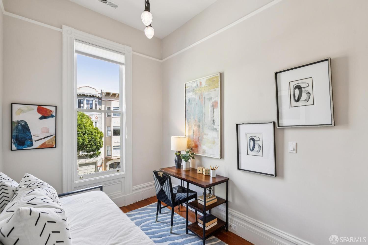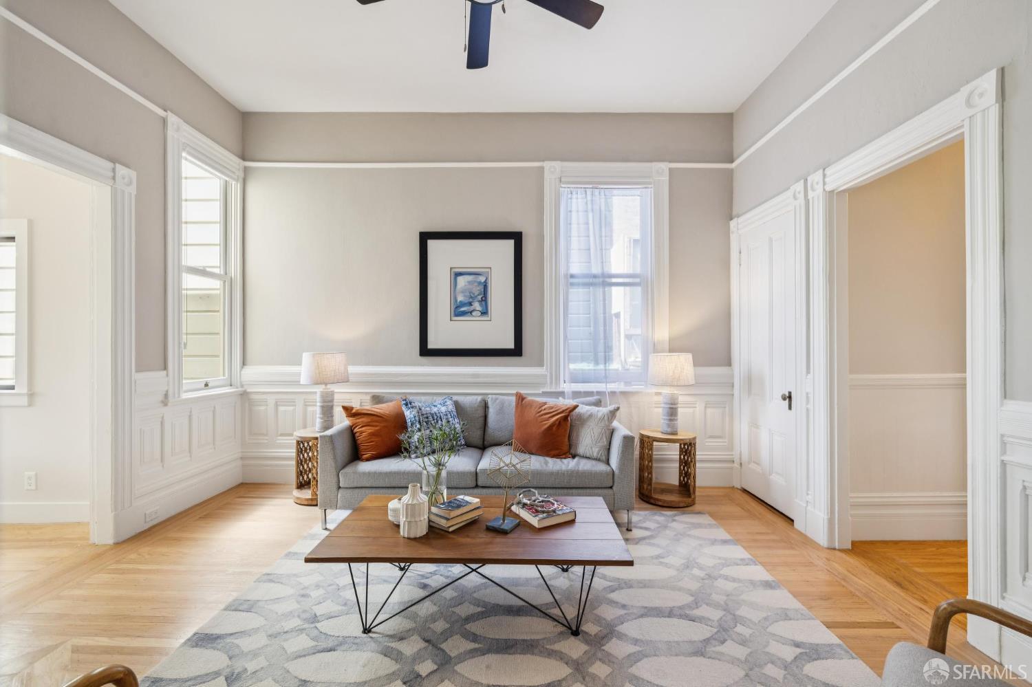 Charming top-floor, full-floor Victorian condominium in a boutique 2-unit building just a half a block from Alamo Square Park. Rich in period detail and scale, this home blends timeless character with modern living. A gracious stair ascent, lined with classic wainscoting and illuminated by a stained-glass skylight, sets the tone. Inside, soaring ceilings, oak and fir floors, and elegant moldings create a warm and elegant backdrop. The expansive front living room features a fireplace with a whimsical tile surround and wood mantle, and east-facing bay windows. An inviting family room with a fireplace connects to a spacious eat-in kitchen equipped with a large dining area, center island, stone countertops, stainless appliances, pantry cabinet, and treetop outlooks. Down the hall, a primary suite has a chic ensuite bath with shower over clawfoot tub, a 2nd bedroom has an ensuite bath with shower and French doors, and the 3rd bedroom is ideal as an office/nursery. 1-car garage parking (side-by-side), a deeded storage area/home gym, shared laundry, and a beautifully landscaped shared yard with firepit complete the amenities. Live the ultimate SF lifestyle just moments from the greenery of Alamo Square Park and Golden Gate Park Panhandle and neighborhood favorites like Lucinda’s Deli, Bi-Rite Market, NOPA, and Bar Crudo, with easy access to the Panhandle, Muni, and the Wiggle.