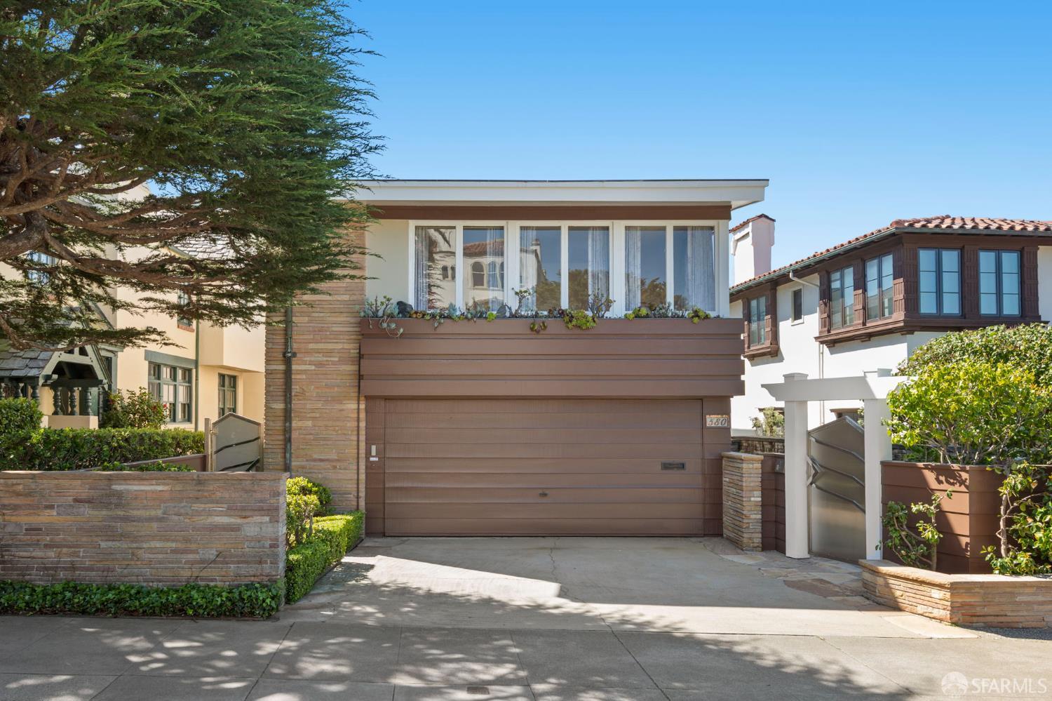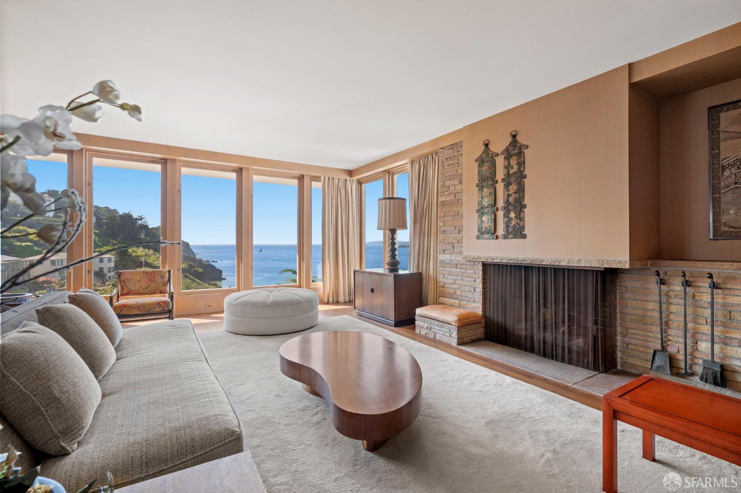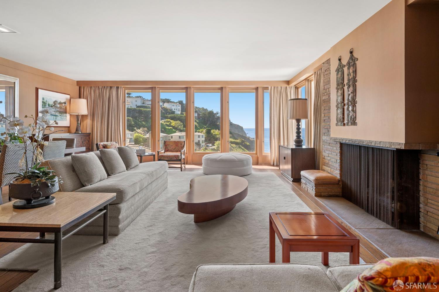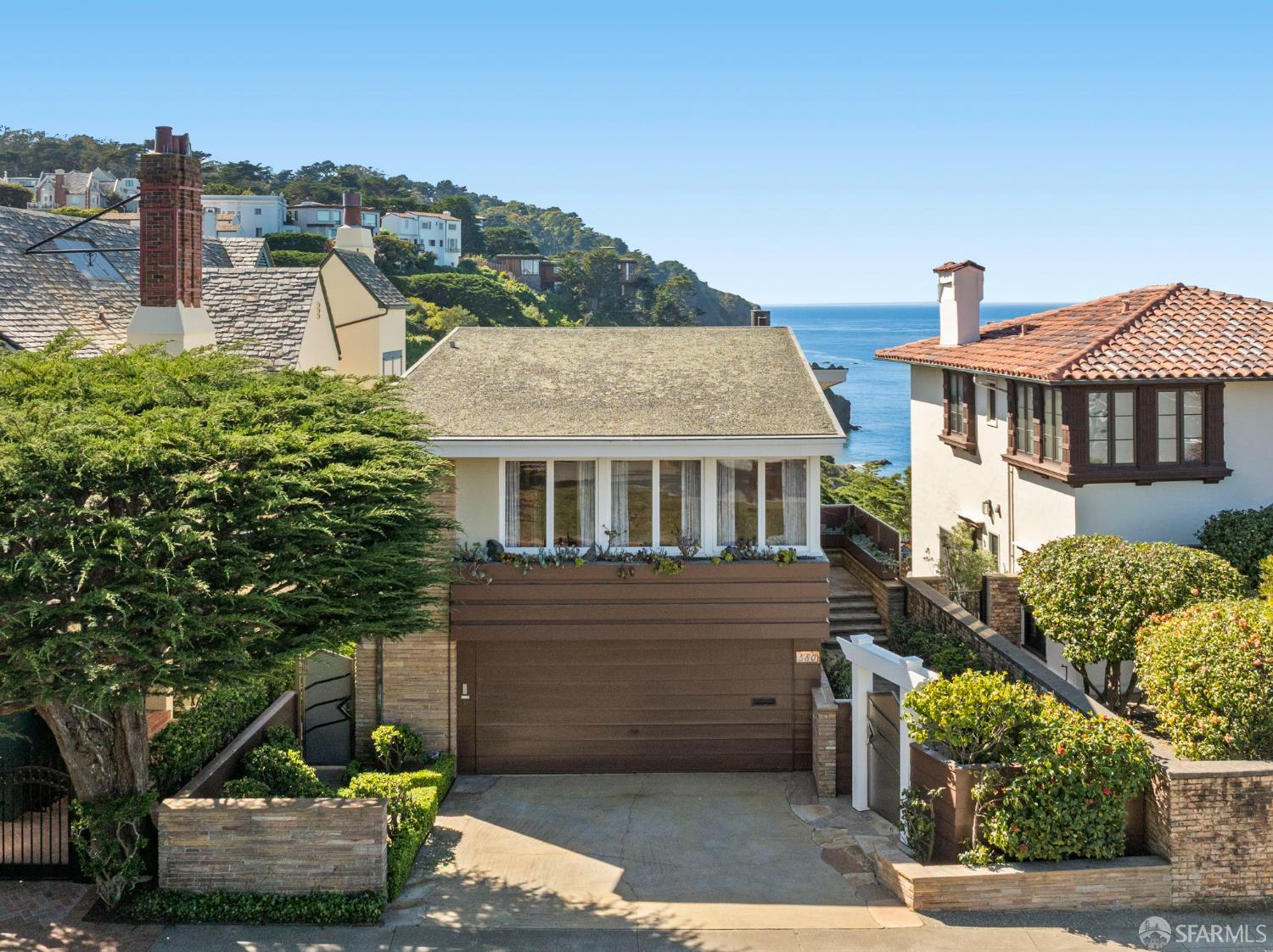 Perched above the Pacific Ocean in the prestigious Sea Cliff neighborhood, this architectural gem is a rare offering for connoisseurs of Mid-Century Modern design. Originally crafted in 1949 by prominent mid-century architect Clarence Peterson as his personal residence, this home is a triumph of timeless elegance, blending iconic design and engineering elements with unparalleled views of the ocean, Marin Headlands, and Golden Gate Bridge. The home welcomes you with a formal flagstone path and broad stone porch, offering a sense of exclusivity from the very first step. Inside, the main level is a showcase of sophisticated living and entertaining spaces. The elegant living room, bathed in natural light, features a striking flagstone fireplace, wood paneling, and expansive windows that frame breathtaking ocean vistas. This main living space includes the formal dining room so you and your guests can admire the views while you dine, this level is as functional as it is visually inspiring. Spanning three meticulously designed levels, the home’s split-level layout highlights its modernist pedigree while optimizing every inch of space. The upper level hosts an inviting office/library which is open to the lower living level and a serene and private primary suite, where you can enjoy views of the Golden Gate Bridge. On the lower level, is a versatile space, currently used as a second bedroom, complete with ocean views, a gas fireplace, and a full bathoffering endless possibilities, whether used as a private guest retreat, media room, or fitness space. Beyond its architectural pedigree, this property has been exquisitely preserved, with original details intact, including bespoke furniture designed by Peterson himself. The home’s design captures the essence of mid-century modernity while accommodating contemporary lifestyles with ease. An attached two-car garage provides additional convenience. The location is simply unmatched, enjoy tranquil walks to China Beach, or take advantage of easy access to San Francisco’s vibrant cultural and culinary sceneall while savoring the privacy and serenity that only Sea Cliff can offer. This is more than a home; it’s a statement. A rare opportunity to own a piece of architectural history in one of San Francisco’s most coveted enclaves.