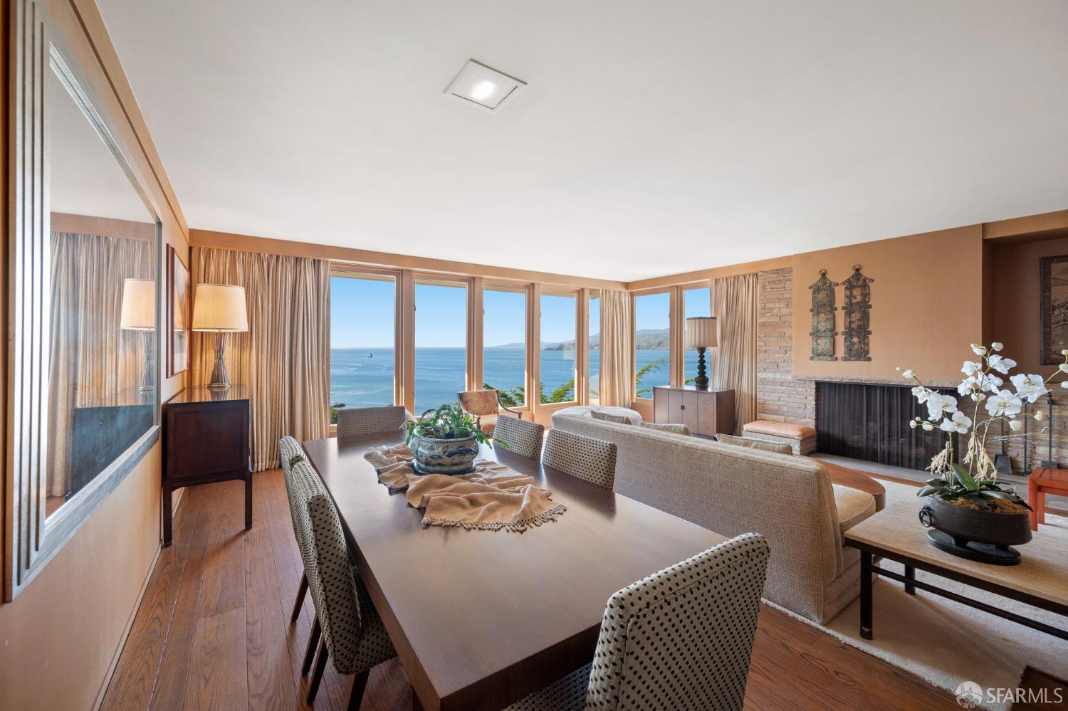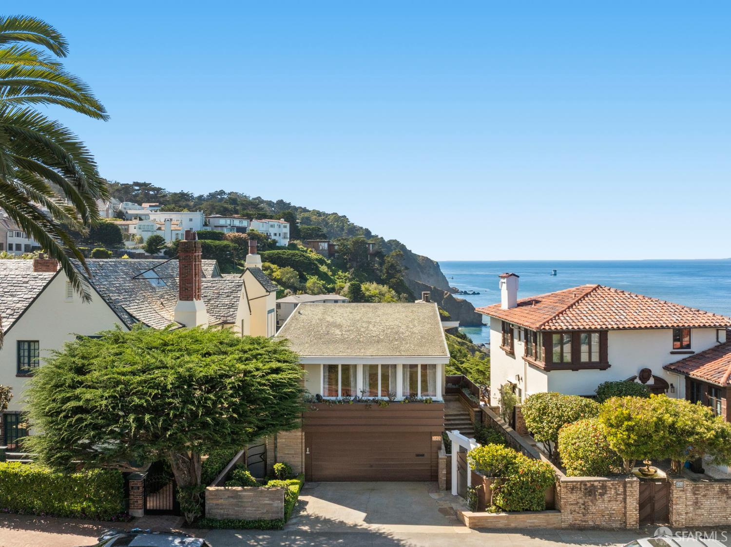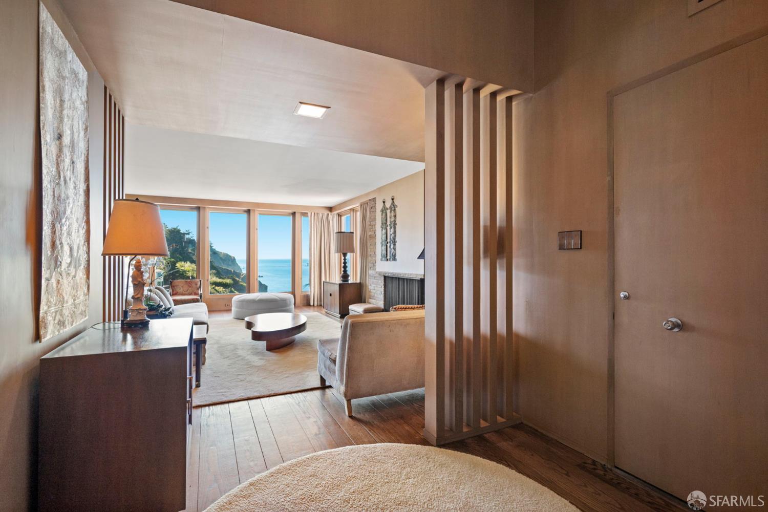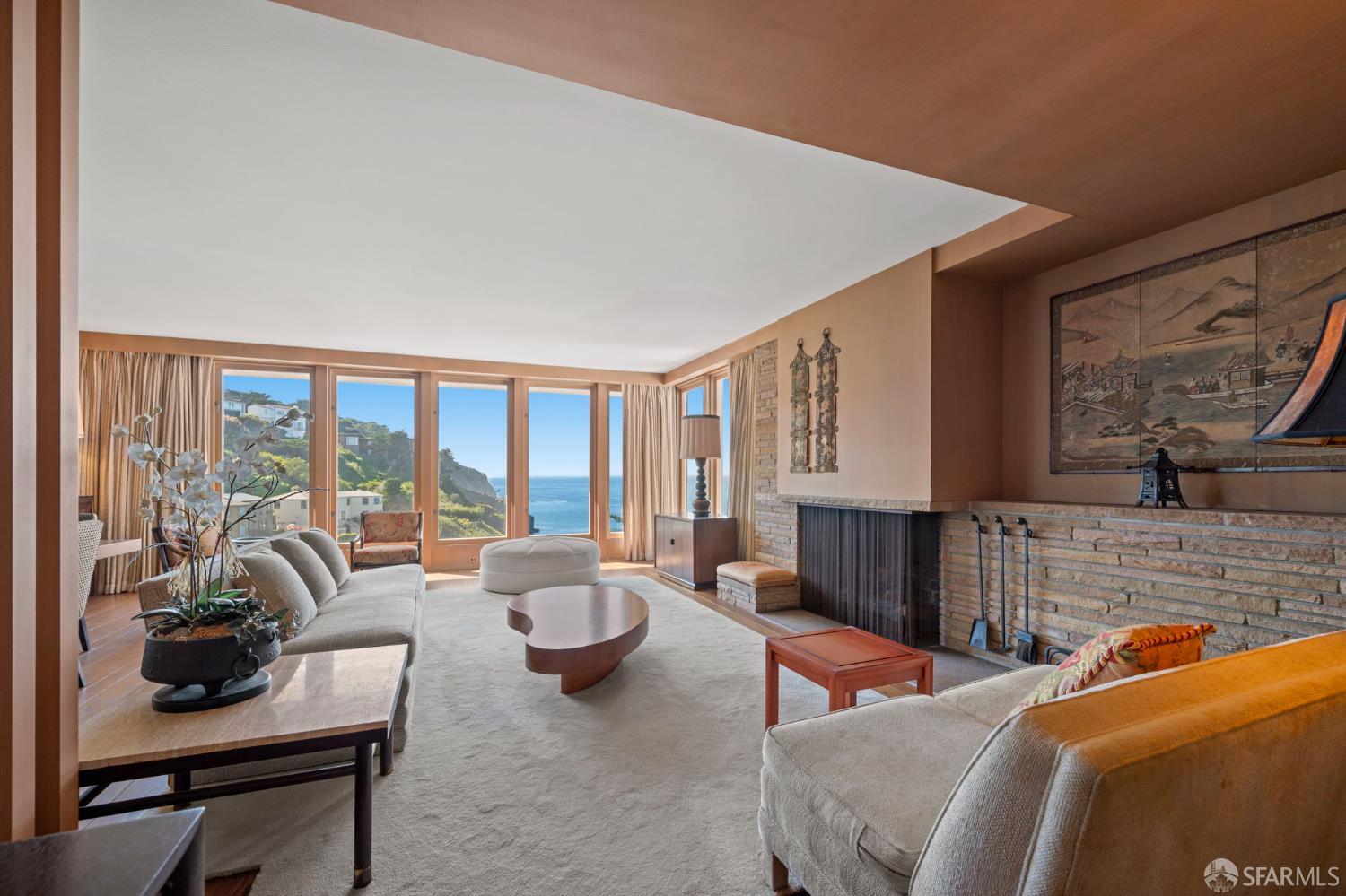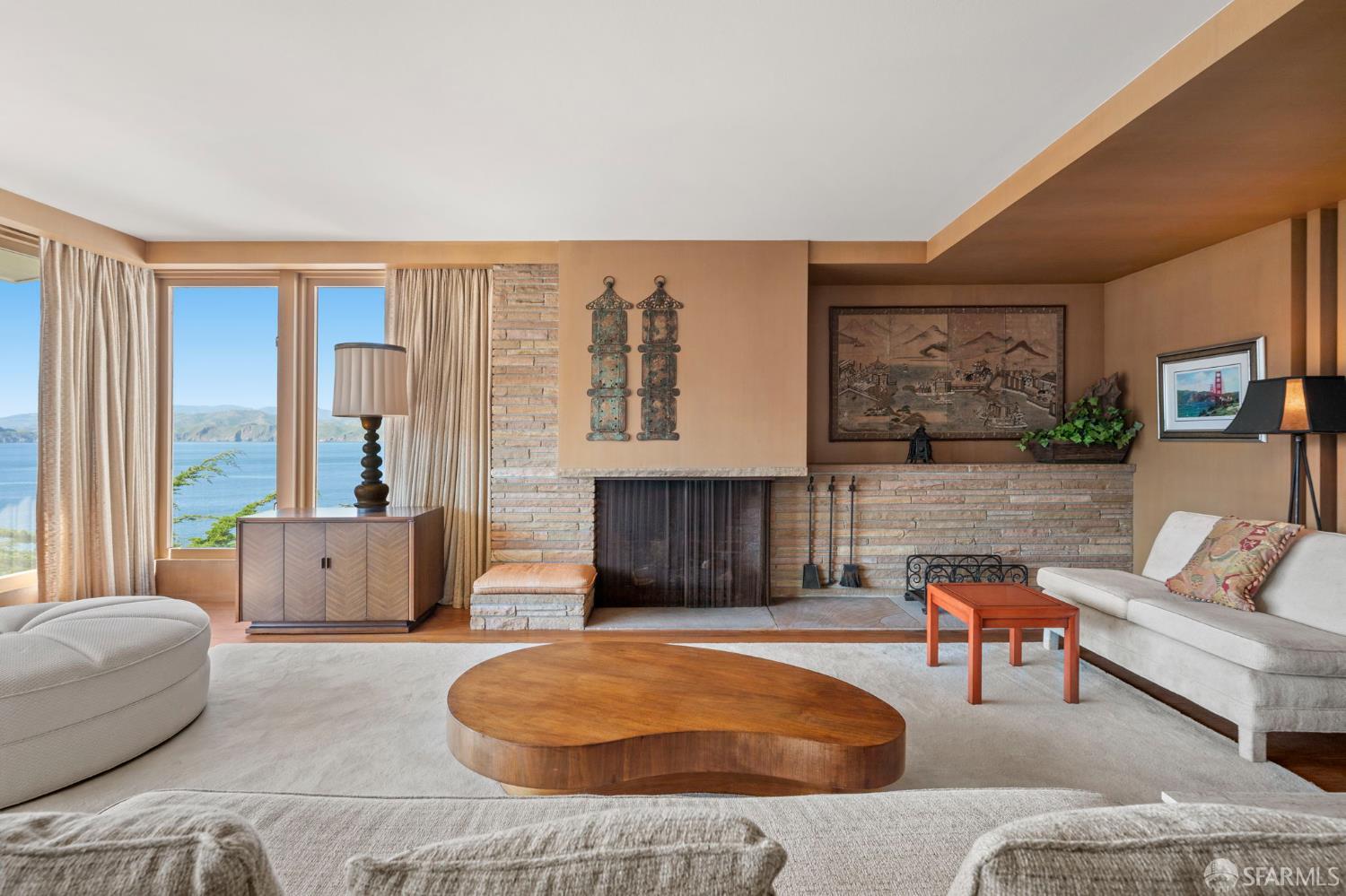 Perched above the Pacific Ocean in the prestigious Sea Cliff neighborhood, this architectural gem is a rare offering for connoisseurs of Mid-Century Modern design. Originally crafted in 1949 by prominent mid-century architect Clarence Peterson as his personal residence, this home is a triumph of timeless elegance, blending iconic design and engineering elements with unparalleled views of the ocean, Marin Headlands, and Golden Gate Bridge. The home welcomes you with a formal flagstone path and broad stone porch, offering a sense of exclusivity from the very first step. Inside, the main level is a showcase of sophisticated living and entertaining spaces. The elegant living room, bathed in natural light, features a striking flagstone fireplace, wood paneling, and expansive windows that frame breathtaking ocean vistas. This main living space includes the formal dining room so you and your guests can admire the views while you dine, this level is as functional as it is visually inspiring. Spanning three meticulously designed levels, the home’s split-level layout highlights its modernist pedigree while optimizing every inch of space. The upper level hosts an inviting office/library which is open to the lower living level and a serene and private primary suite, where you can enjoy views of the Golden Gate Bridge. On the lower level, is a versatile space, currently used as a second bedroom, complete with ocean views, a gas fireplace, and a full bathoffering endless possibilities, whether used as a private guest retreat, media room, or fitness space. Beyond its architectural pedigree, this property has been exquisitely preserved, with original details intact, including bespoke furniture designed by Peterson himself. The home’s design captures the essence of mid-century modernity while accommodating contemporary lifestyles with ease. An attached two-car garage provides additional convenience. The location is simply unmatched, enjoy tranquil walks to China Beach, or take advantage of easy access to San Francisco’s vibrant cultural and culinary sceneall while savoring the privacy and serenity that only Sea Cliff can offer. This is more than a home; it’s a statement. A rare opportunity to own a piece of architectural history in one of San Francisco’s most coveted enclaves.