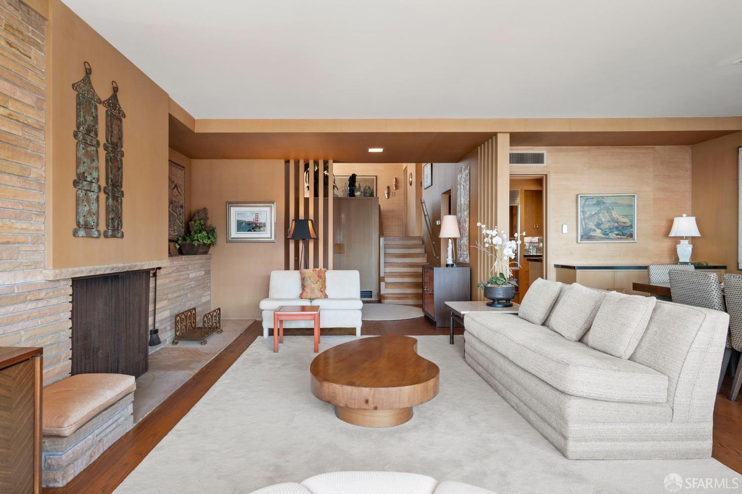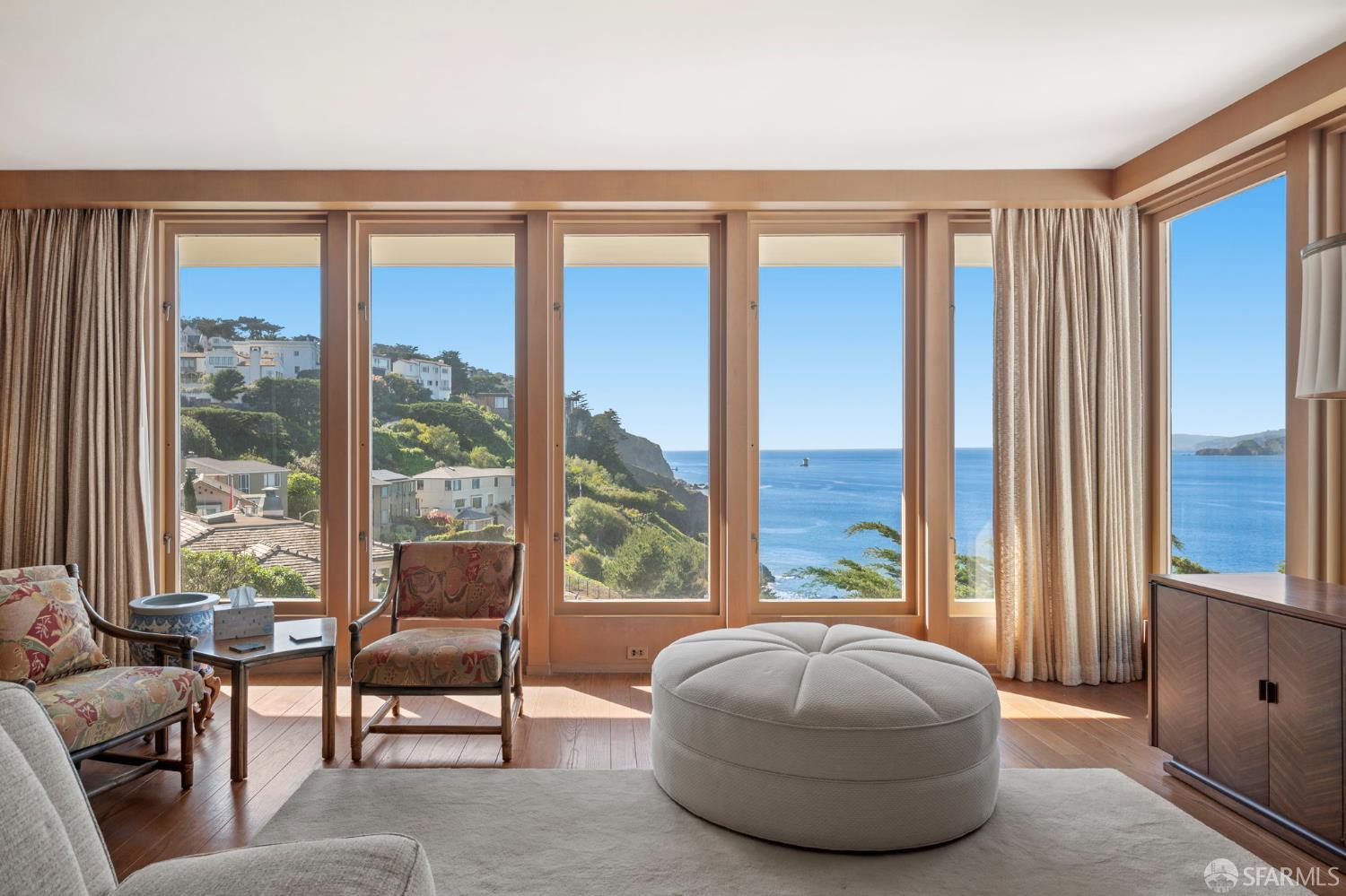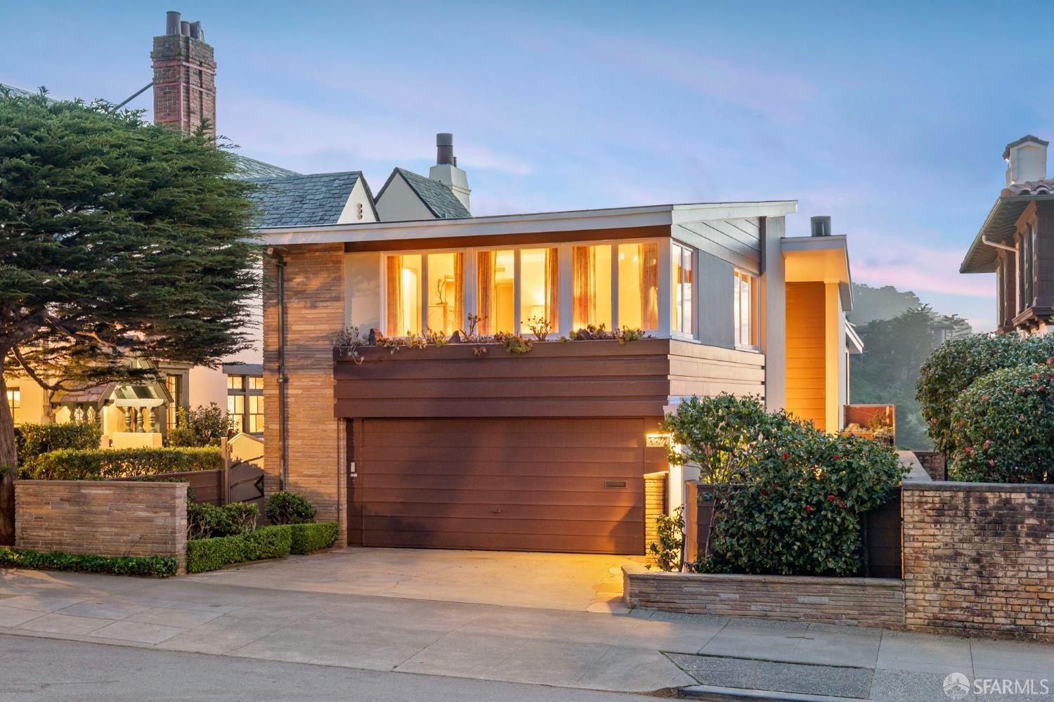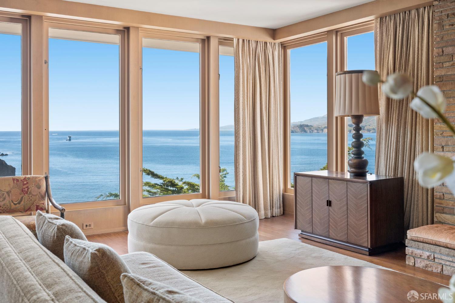 Perched above the Pacific Ocean in the prestigious Sea Cliff neighborhood, this architectural gem is a rare offering for connoisseurs of Mid-Century Modern design. Originally crafted in 1949 by prominent mid-century architect Clarence Peterson as his personal residence, this home is a triumph of timeless elegance, blending iconic design and engineering elements with unparalleled views of the ocean, Marin Headlands, and Golden Gate Bridge. The home welcomes you with a formal flagstone path and broad stone porch, offering a sense of exclusivity from the very first step. Inside, the main level is a showcase of sophisticated living and entertaining spaces. The elegant living room, bathed in natural light, features a striking flagstone fireplace, wood paneling, and expansive windows that frame breathtaking ocean vistas. This main living space includes the formal dining room so you and your guests can admire the views while you dine, this level is as functional as it is visually inspiring. Spanning three meticulously designed levels, the home’s split-level layout highlights its modernist pedigree while optimizing every inch of space. The upper level hosts an inviting office/library which is open to the lower living level and a serene and private primary suite, where you can enjoy views of the Golden Gate Bridge. On the lower level, is a versatile space, currently used as a second bedroom, complete with ocean views, a gas fireplace, and a full bathoffering endless possibilities, whether used as a private guest retreat, media room, or fitness space. Beyond its architectural pedigree, this property has been exquisitely preserved, with original details intact, including bespoke furniture designed by Peterson himself. The home’s design captures the essence of mid-century modernity while accommodating contemporary lifestyles with ease. An attached two-car garage provides additional convenience. The location is simply unmatched, enjoy tranquil walks to China Beach, or take advantage of easy access to San Francisco’s vibrant cultural and culinary sceneall while savoring the privacy and serenity that only Sea Cliff can offer. This is more than a home; it’s a statement. A rare opportunity to own a piece of architectural history in one of San Francisco’s most coveted enclaves.