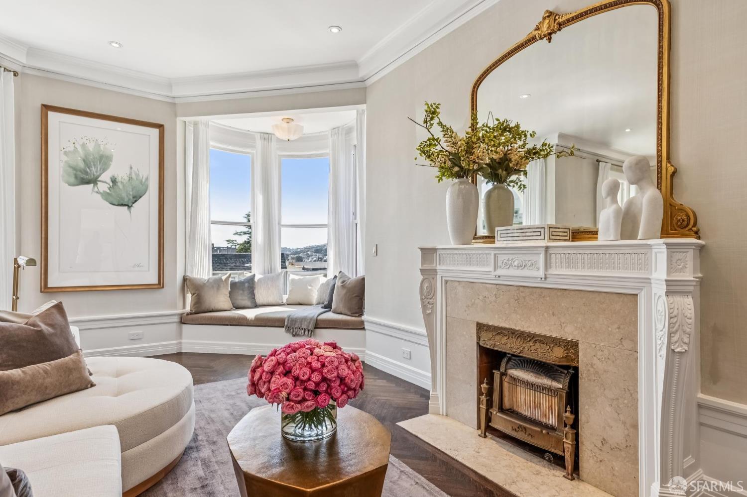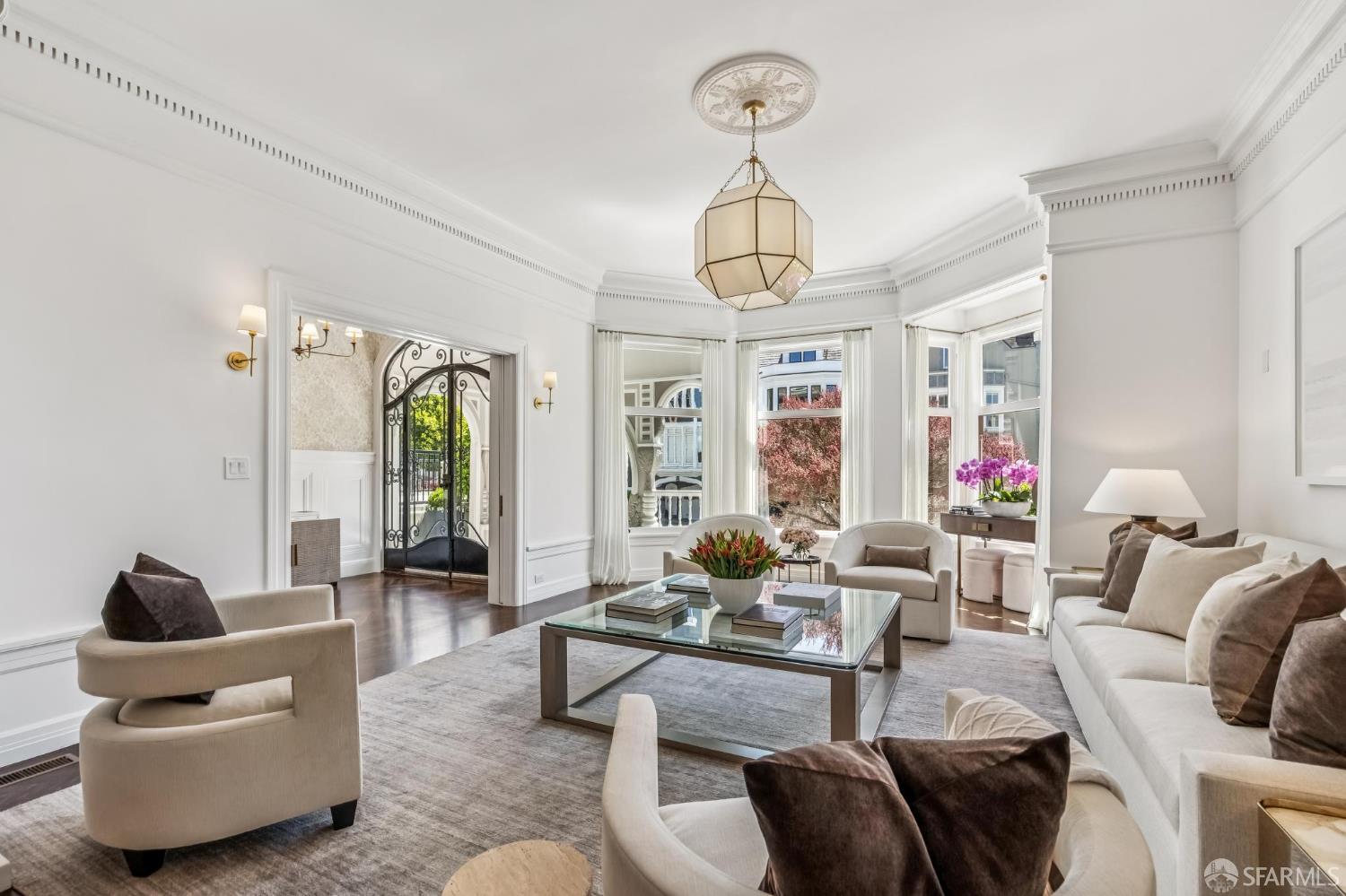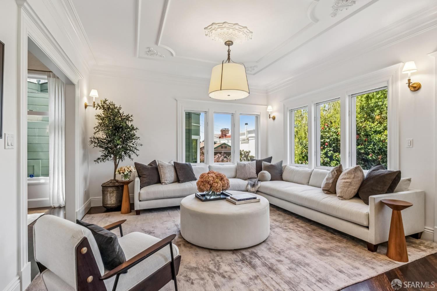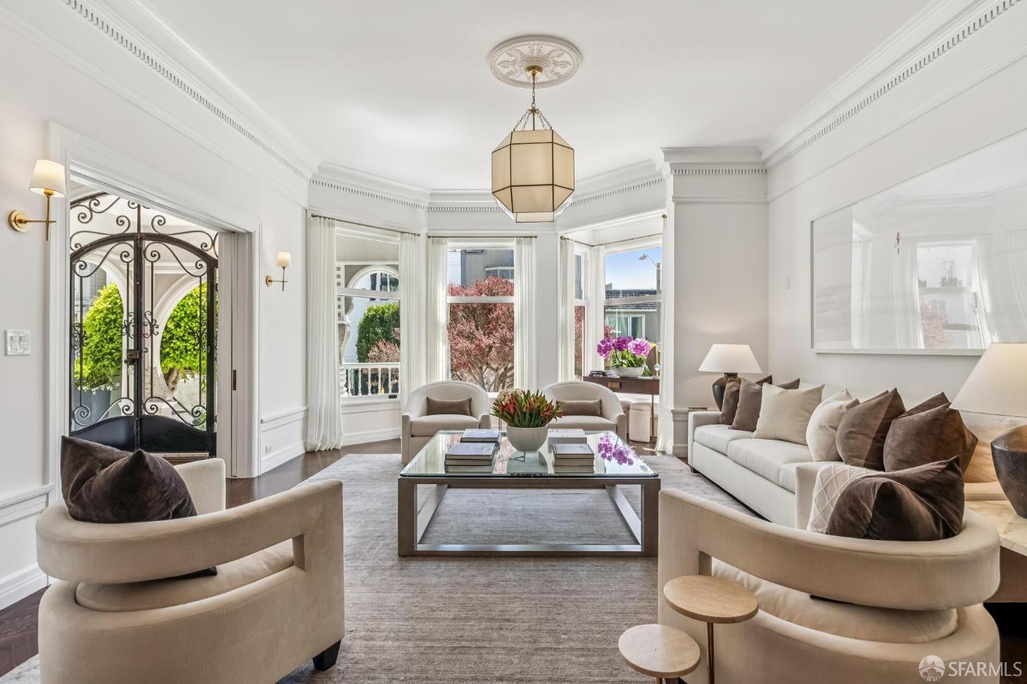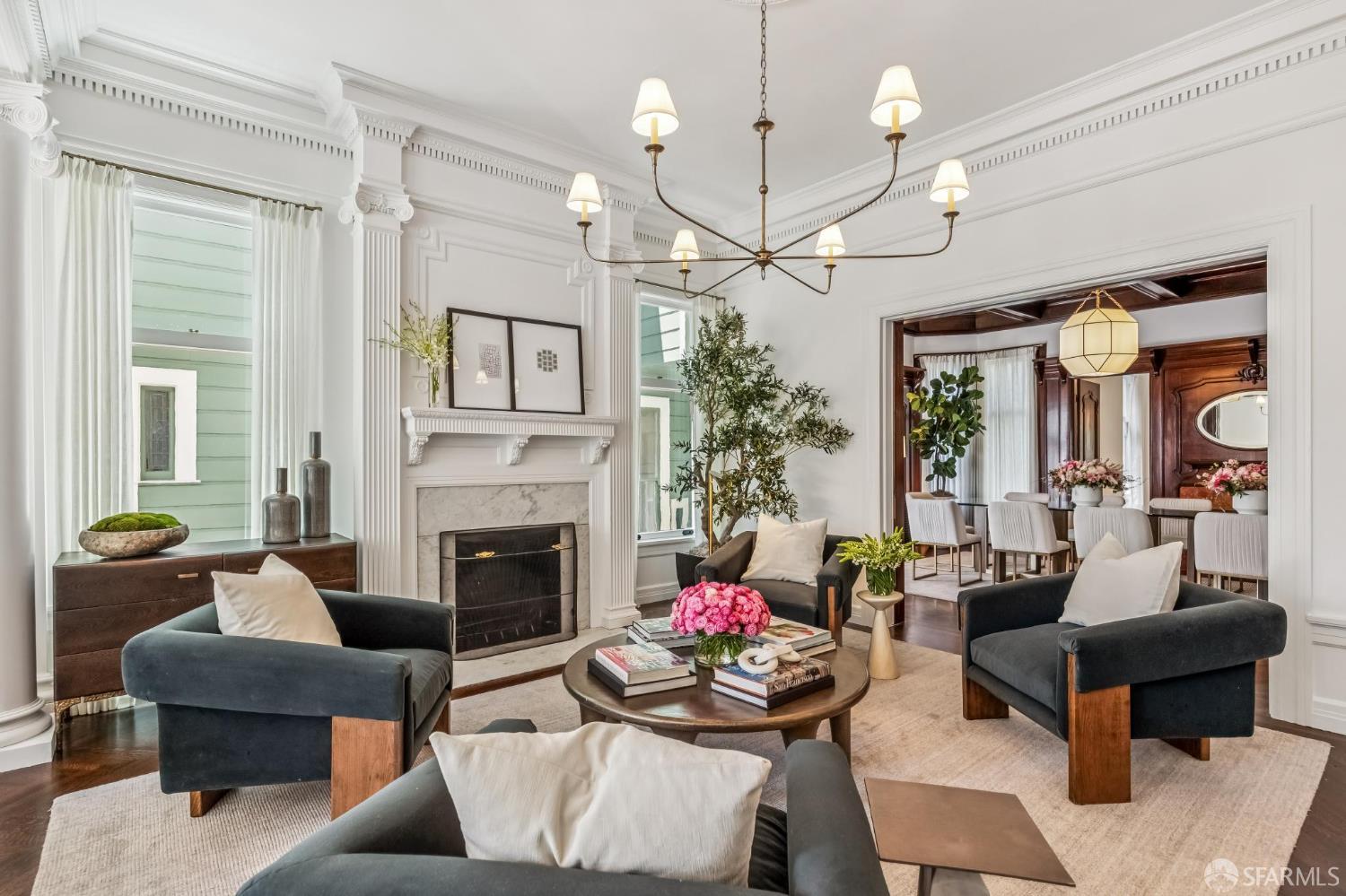 Set in the heart of Pacific Heights, this extraordinary fully detached Queen Anne Victorian offers a rare blend of historic grandeur, modern livability, and iconic San Francisco outlooks. Encompassing six bedrooms, five and a half baths, and positioned on an unusually expansive 34 by 127 lot, this exceptional residence is a true legacy property, rich in character, meticulously maintained, and thoughtfully updated for contemporary living.Built in 1891 by Newsom and Newsom, their vision is displayed today with a home filled with natural light on all sides. Its whimsical fade features a turret with porthole windows, a keyhole arch, and a fabulous ornate glass and iron entry door.Inside, a grand foyer opens to a rare triple parlor layout with formal living, sitting, and dining rooms, showcasing high ceilings, intricate moldings, and marble fireplaces. The renovated kitchen features Calacatta d’Oro marble, premium appliances, and a large island, flowing seamlessly into a breakfast area and family room with direct access to a landscaped garden. A powder room completes the level. The home perfectly balances San Francisco Victorian charm with modern the conveniences and floorplan of today. Upstairs, the full-width primary suite offers a turreted sitting area with city views, a massive dressing room+closet, and a bathroom with a stall shower and clawfoot soaking tub. The 3 additional bedrooms on this level are bright and spacious with the northern bedrooms offering views of theGolden Gate Bridge. The topfloor, which is a legal 2nd unit, includes a large family room with a walkout view deck, huge bedroom suite with bathroom, a 2nd bedroom used as an office, a full bath in the hall, and a second kitchen/ laundry room.The home’s lower level is the perfect place for family, adult or children hangouts. The Media/lounge area is great for social gatherings of all ages. This level also includes a bathroom and tons of storage. Interior access from the garage and a landscaped garden complete this grand residence. When you combine this wonderful home with it’s incredible location, steps to Lafayette Park, North Side schools and a short walk to Fillmore St and all its shops and restaurants you truly have a one of a kind home.